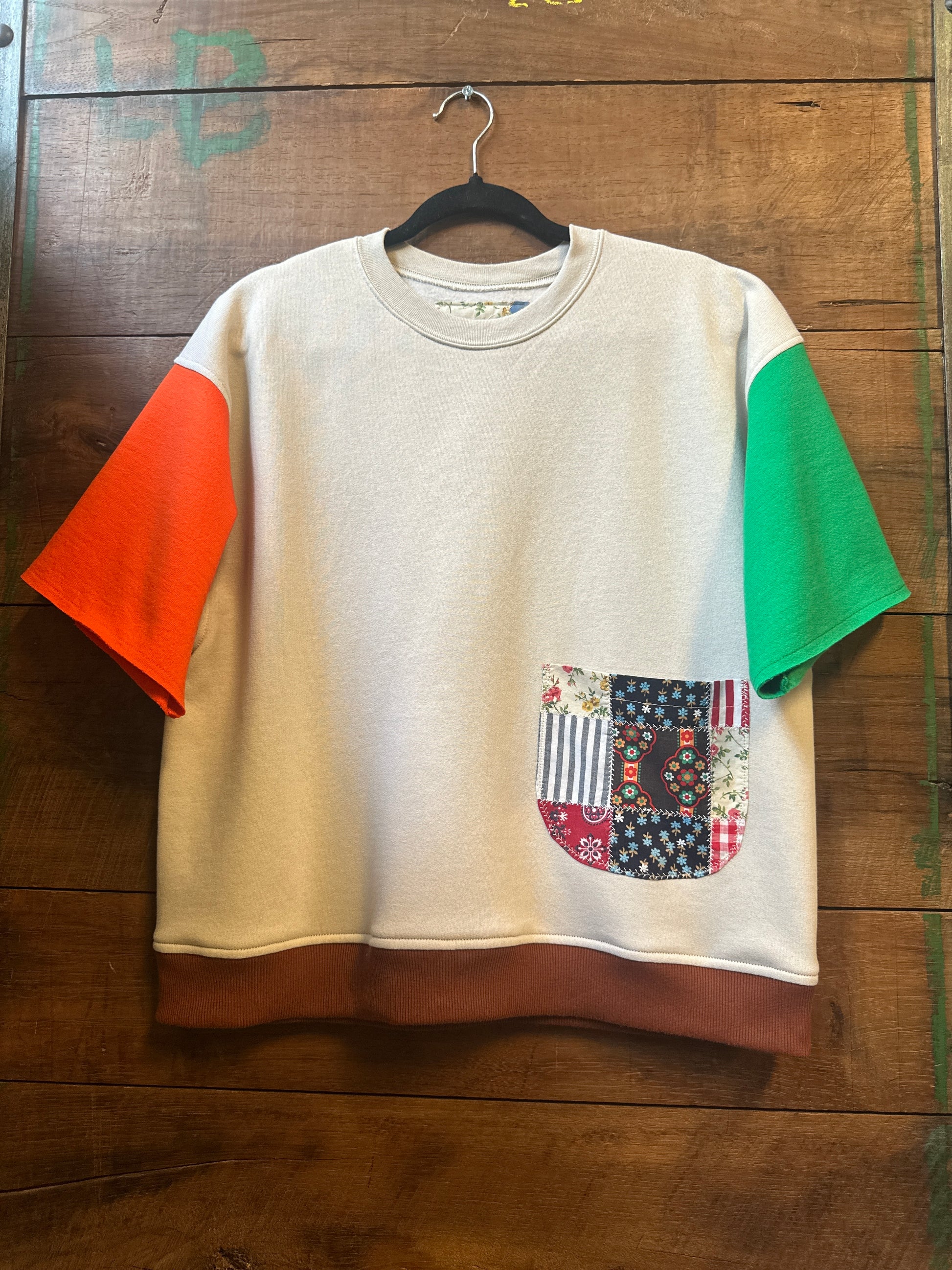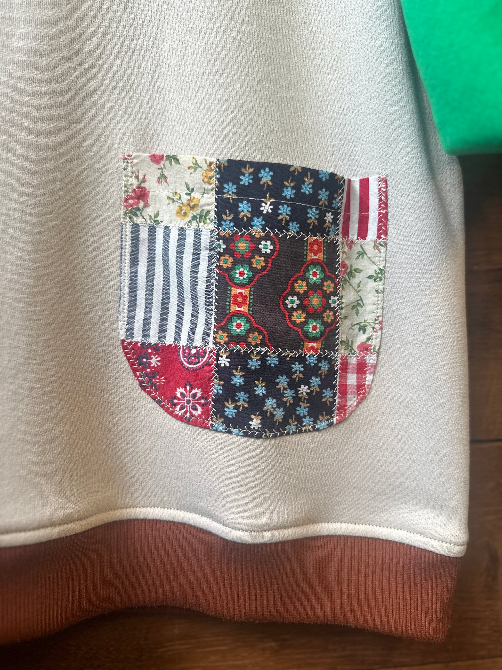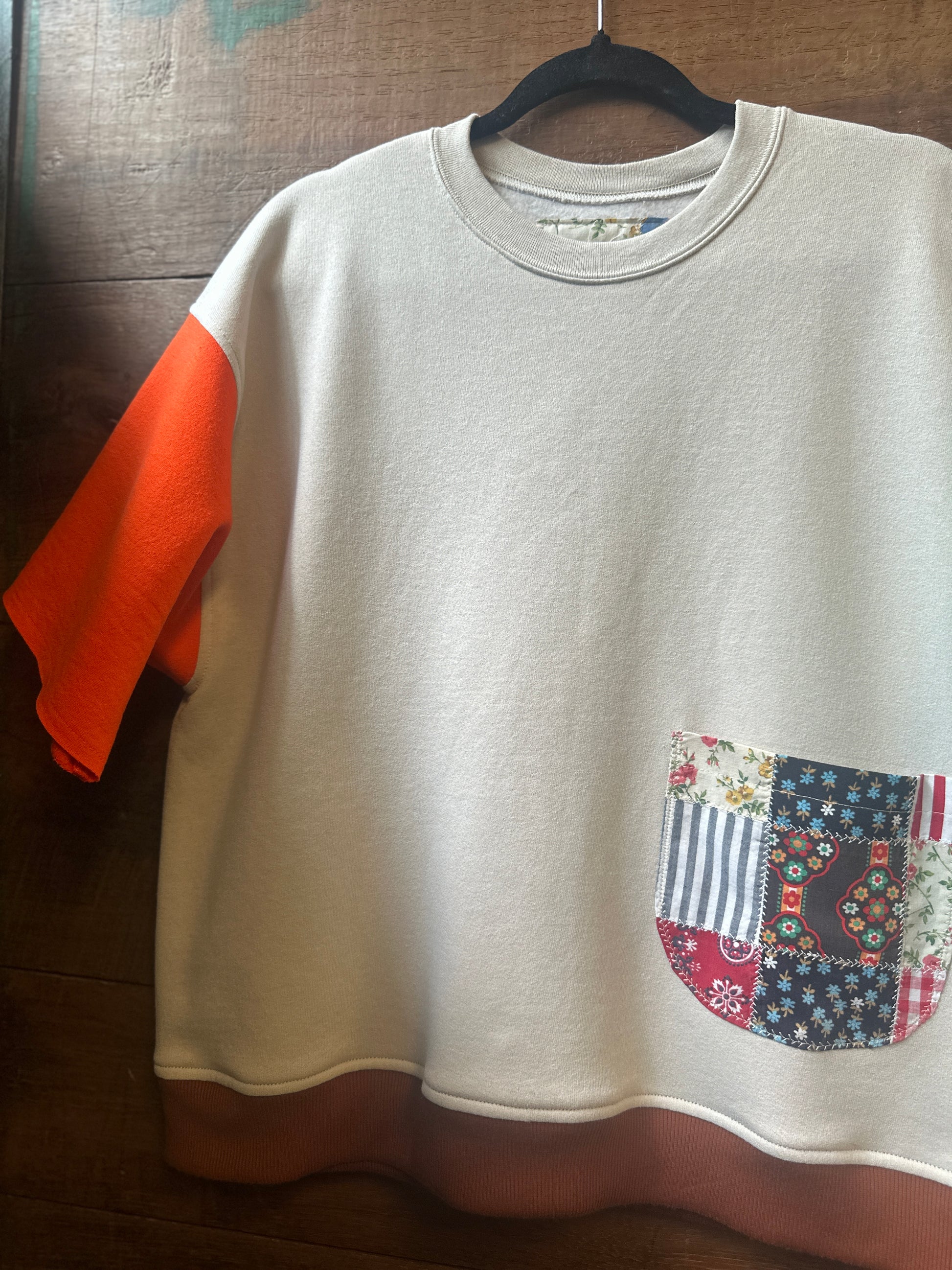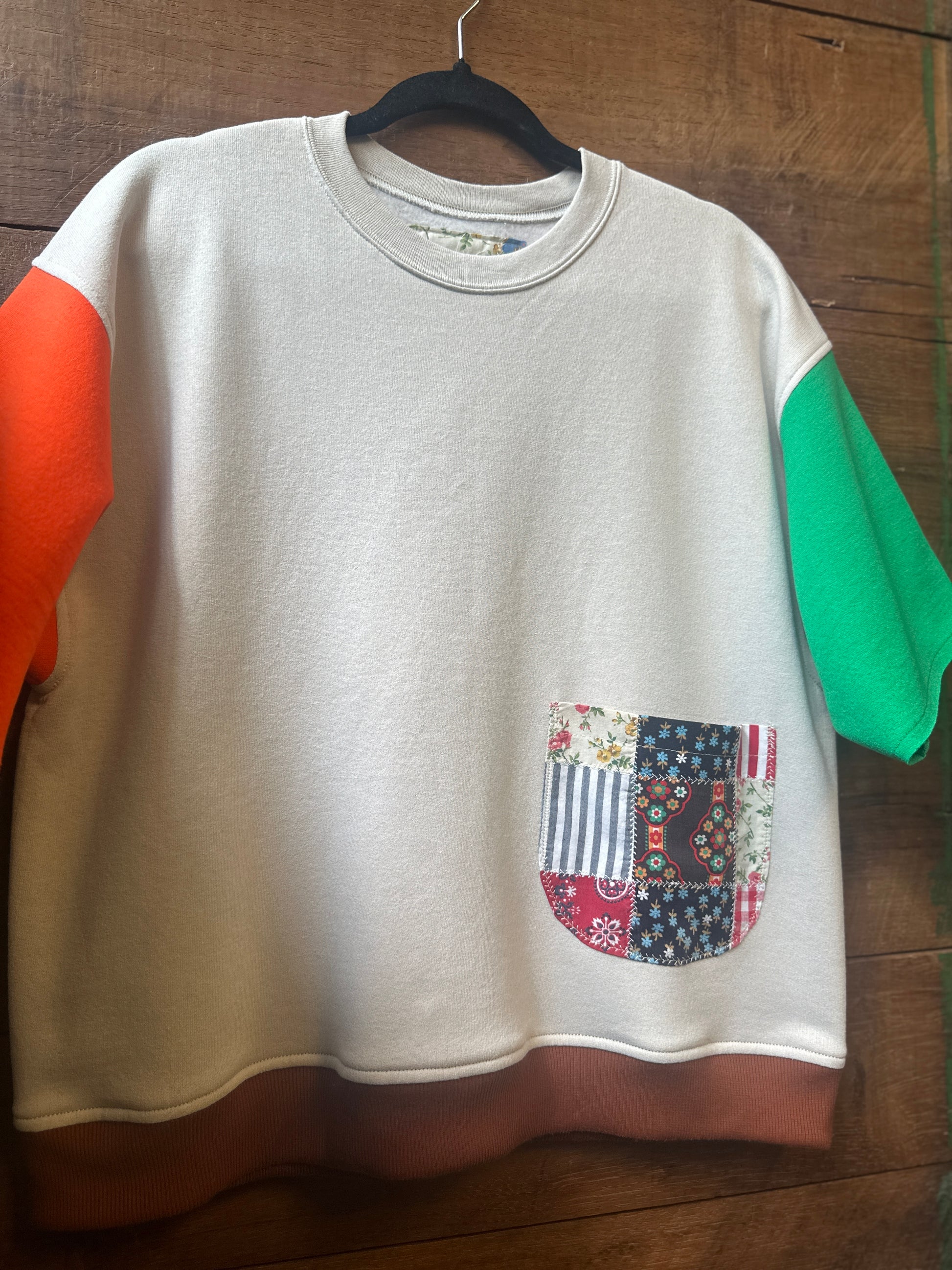 Add a pop of personality to your wardrobe with The Alice! This quirky sweatshirt features an oversized fit, colorblocked short sleeves, and a patch quilt pocket on the front. Made from upcycled materials, you can look stylish while also being sustainable. The Alice, because fashion should be fun!