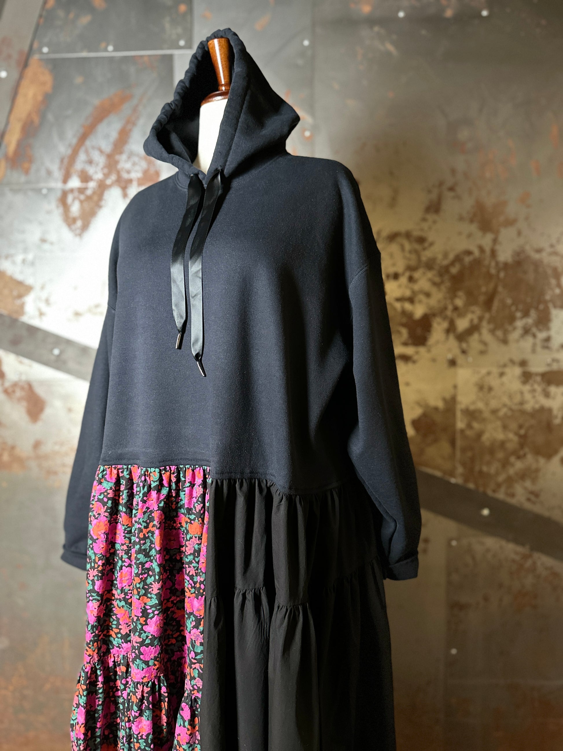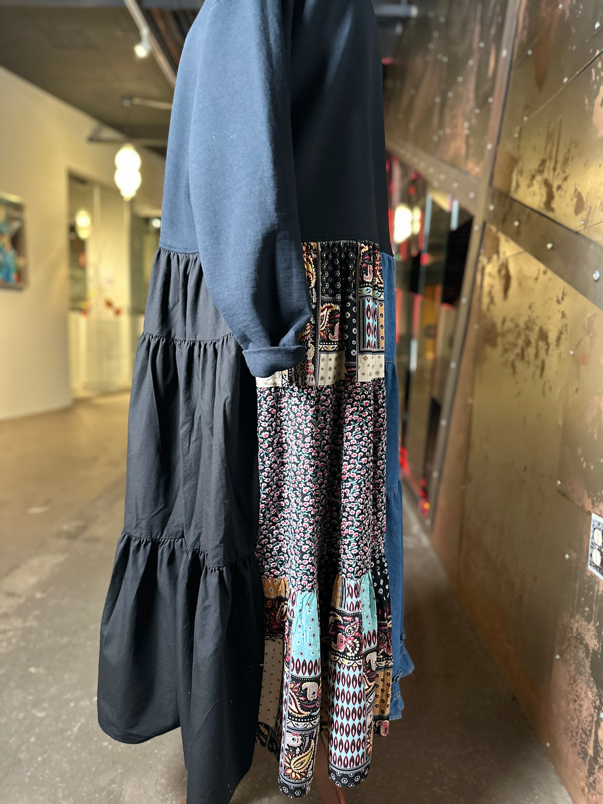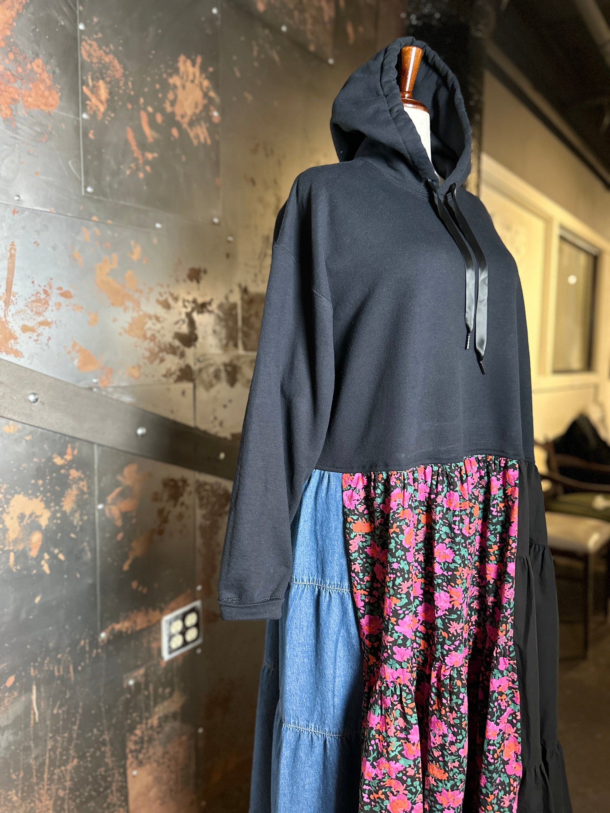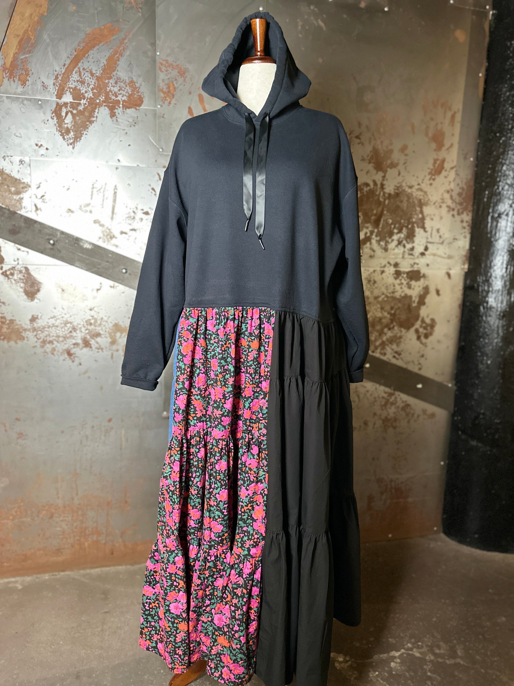 Upgrade your style game with The Allegra: an upcycled hoodie with a pieced maxi skirt made from contrasting fabrics, attached for a super oversized fit. This style will fit so many different sizes...designed to be a flowy and generous silhouette. Stay cool, comfy, and eco-friendly in this unique and playful statement piece.