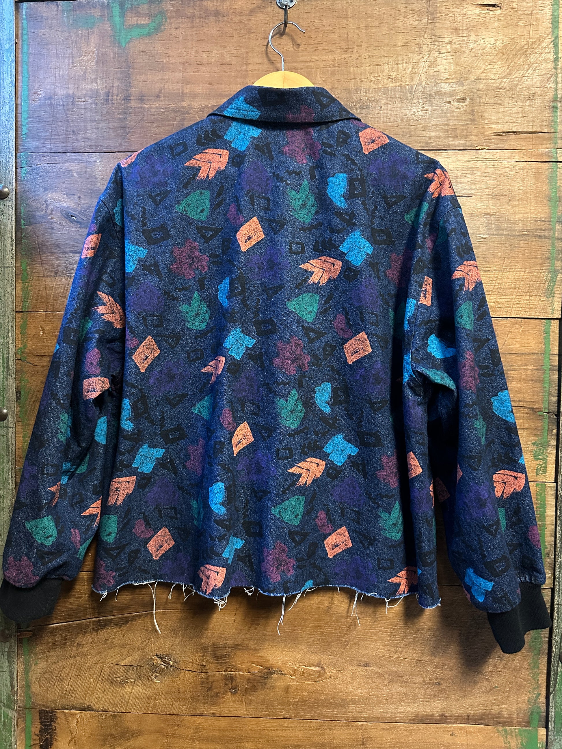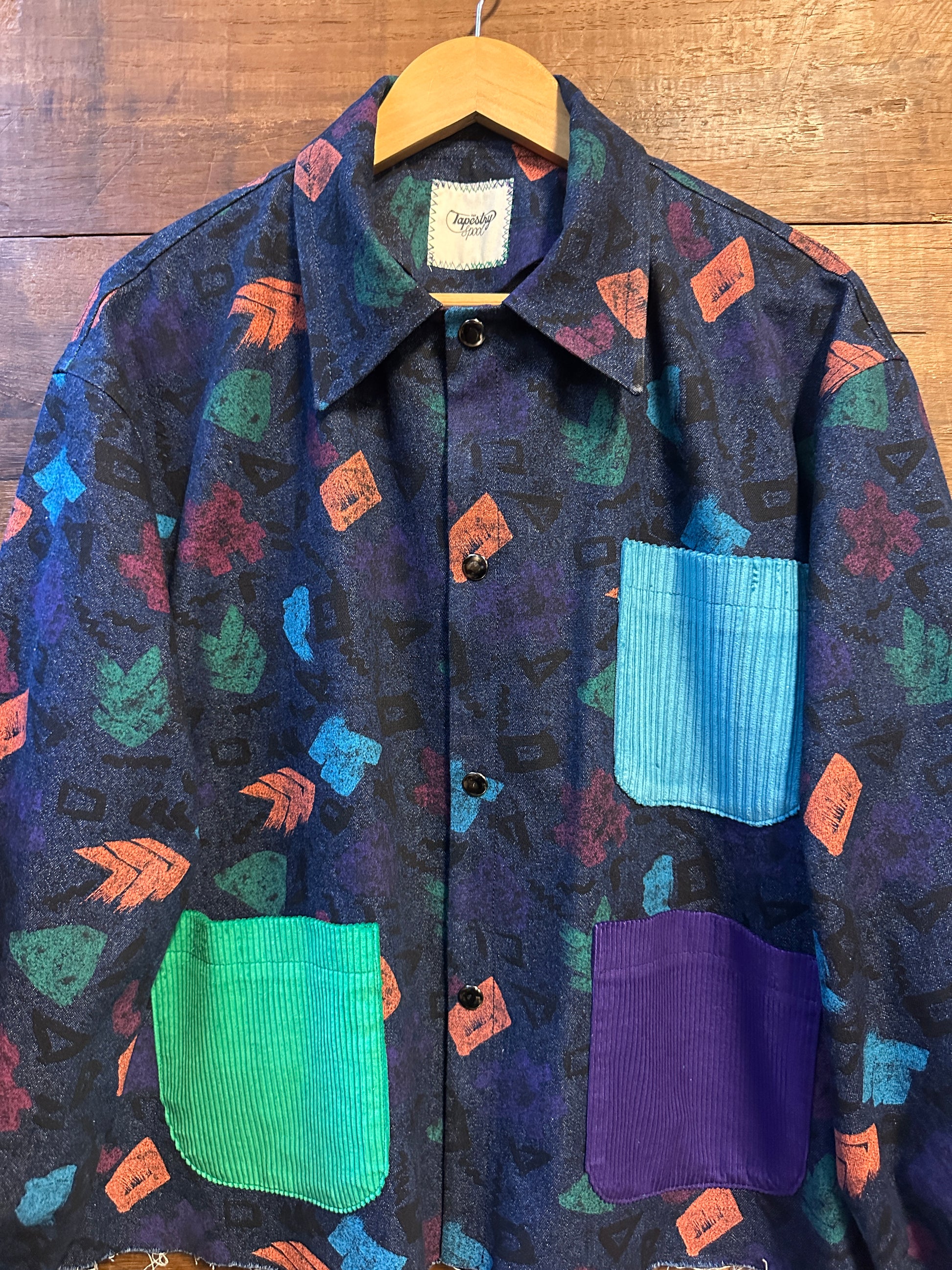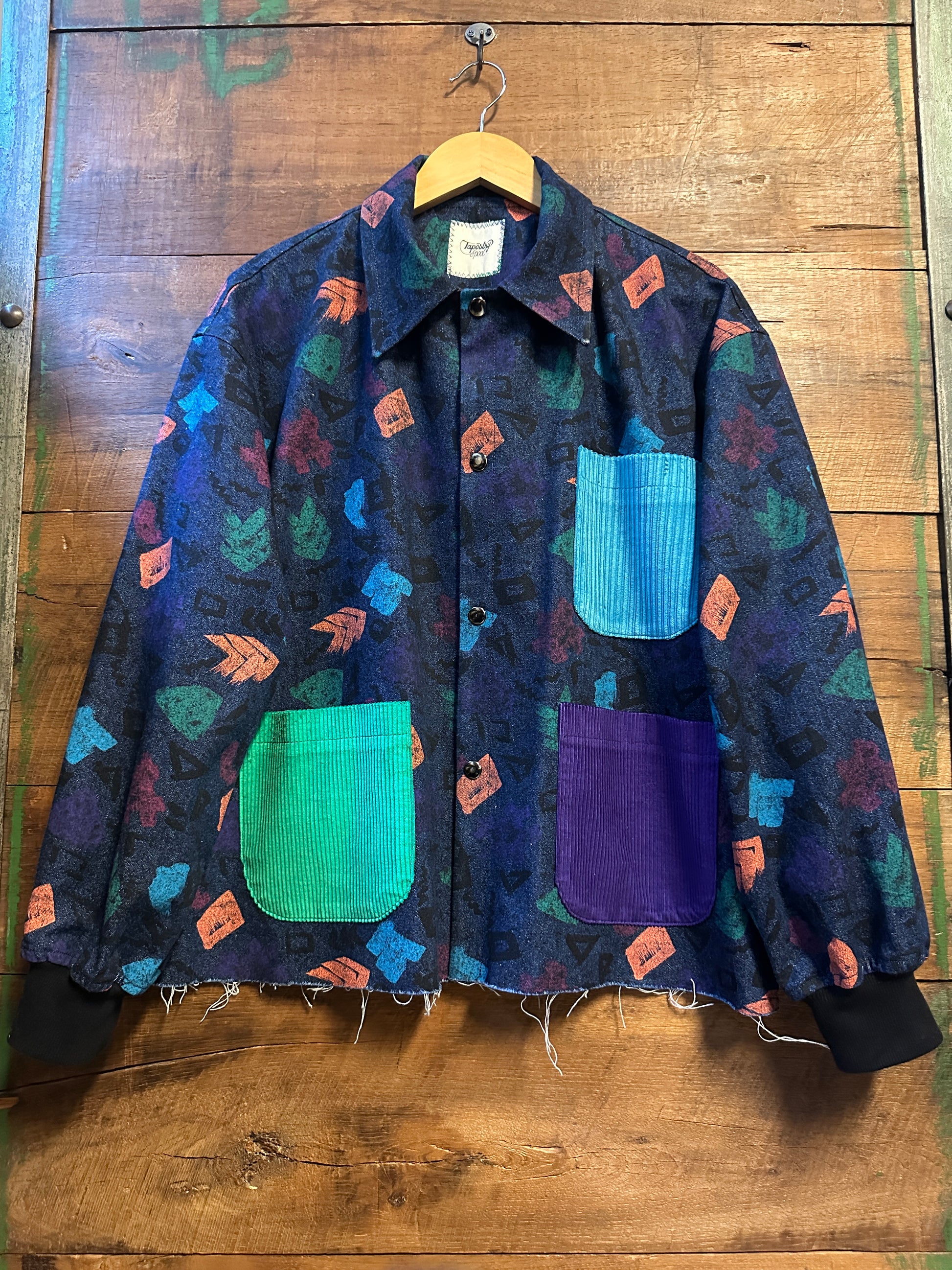 Get ready to turn heads with The Andy, a medium weight jacket crafted from vintage denim adorned with playful colorful geometric shapes. Brightly colored vintage corduroy pockets add a fun twist while the snap front closure keeps things easy and breezy. This jacket combines retro charm with vibrant personality for a look that’s uniquely yours.