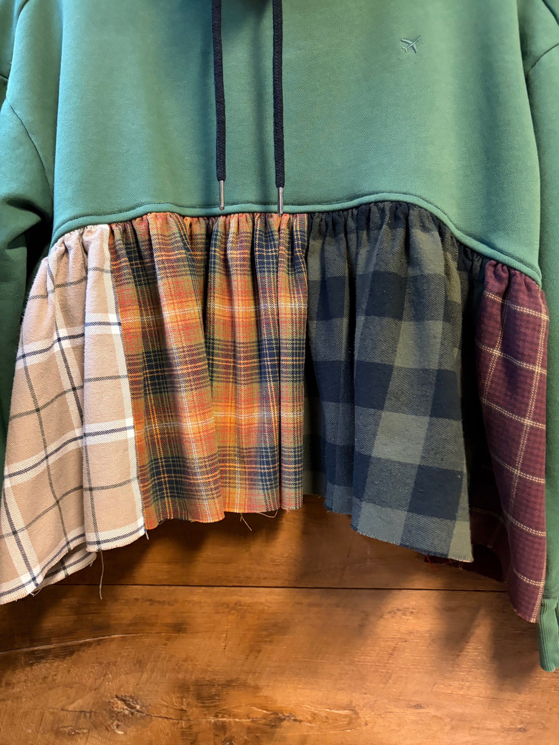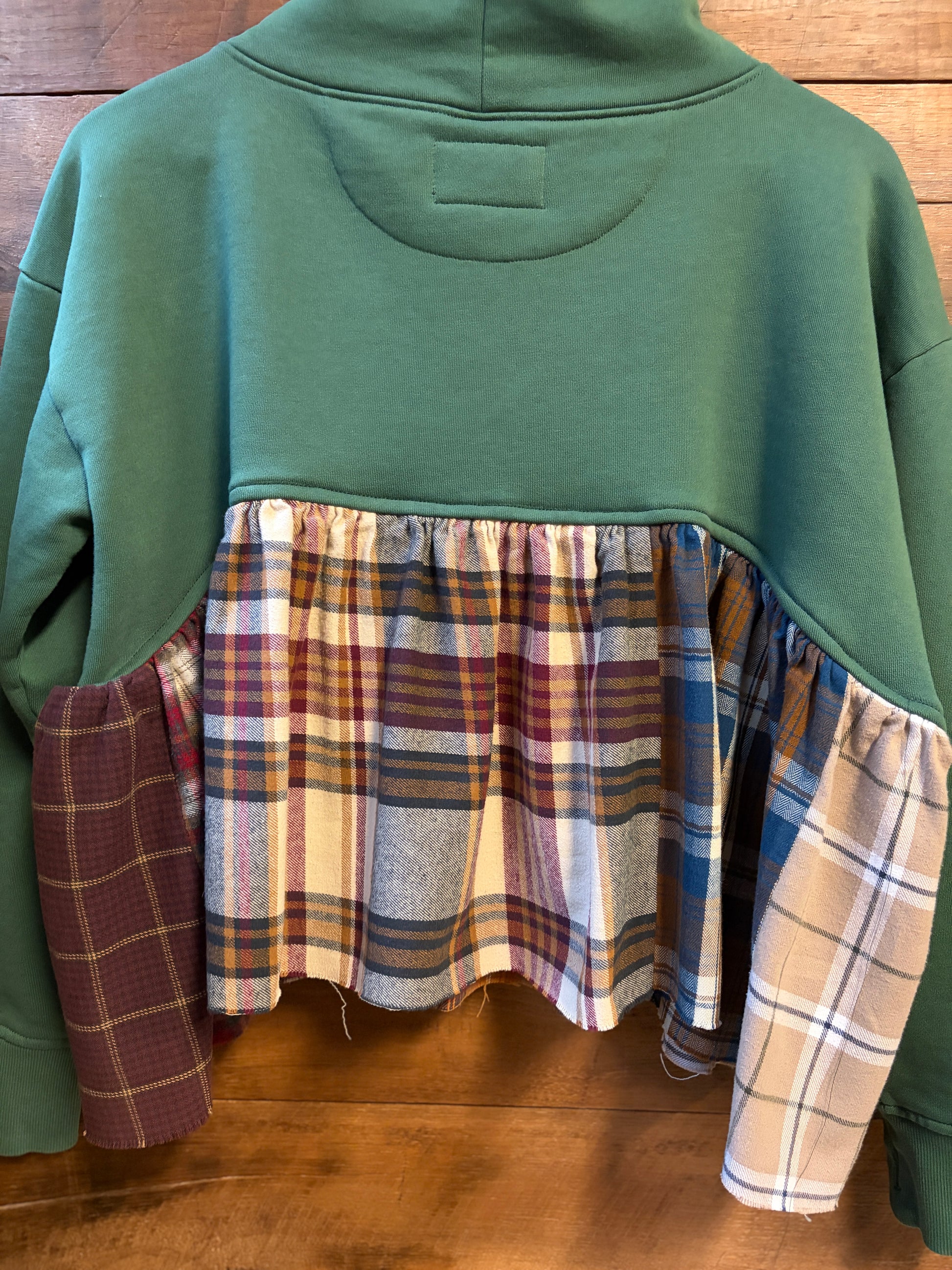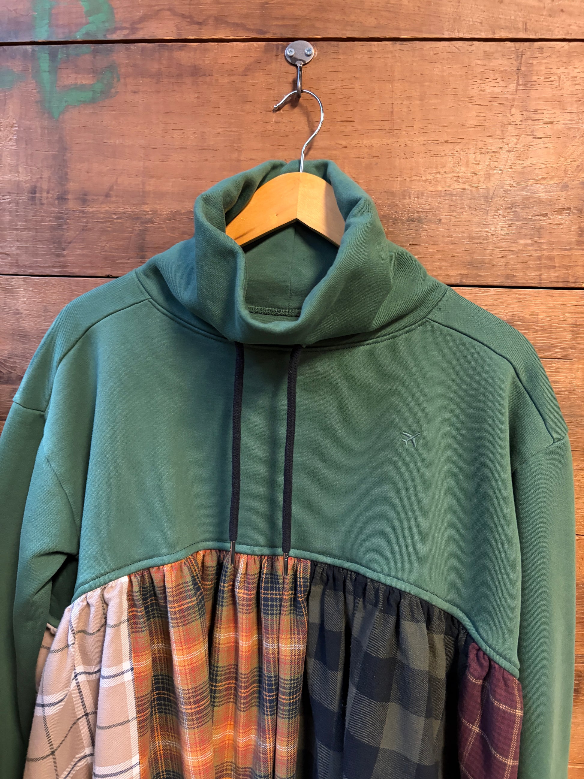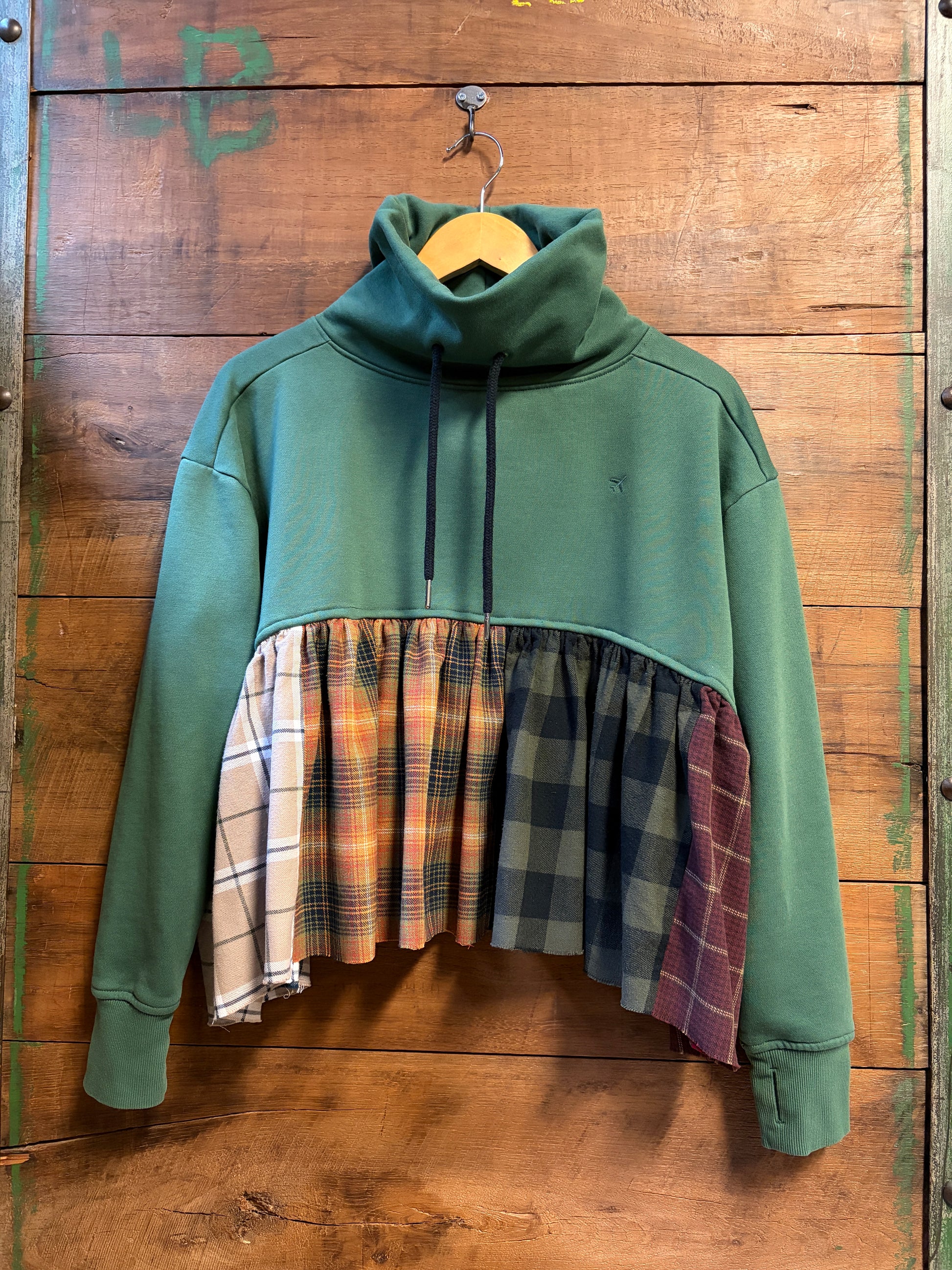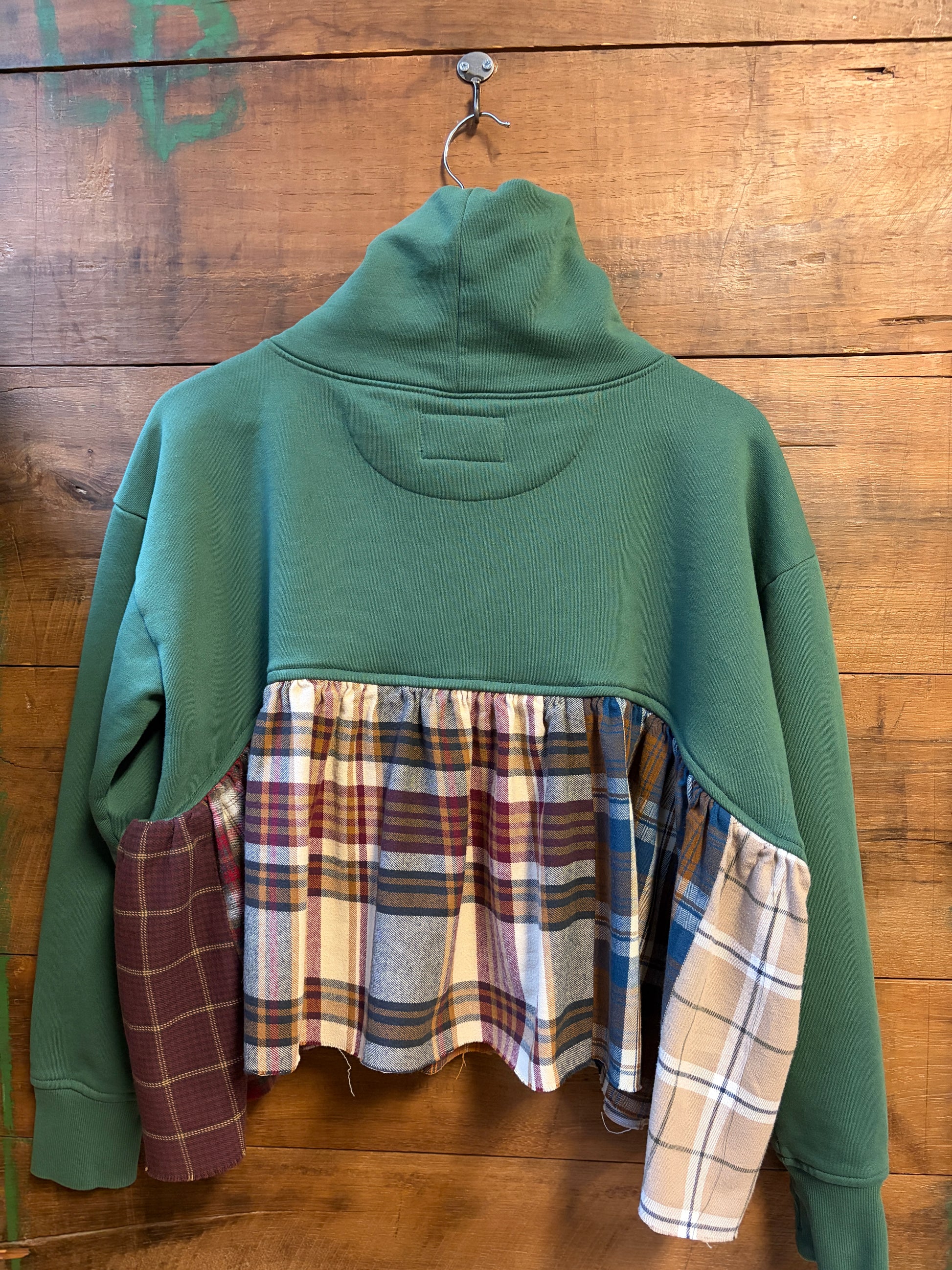 The Aspen is a one-of-a-kind upcycled mockneck sweatshirt that brings together cozy comfort and quirky charm. Featuring a flattering empire waist with a gathered bottom detail created from the softest upcycled flannels patched together. Perfect for anyone who loves sustainable fashion with a fun twist, The Aspen proves that thrifted treasures make the best wardrobe staples. Mix vintage vibes with modern style in this conversation-starting essential.
