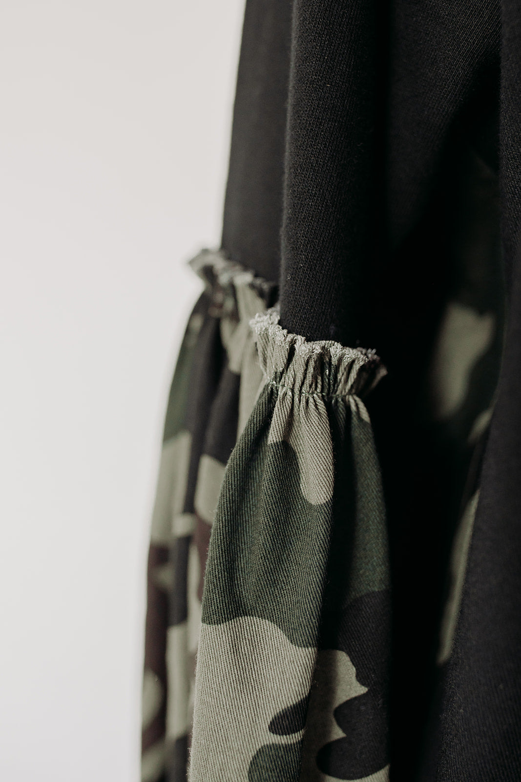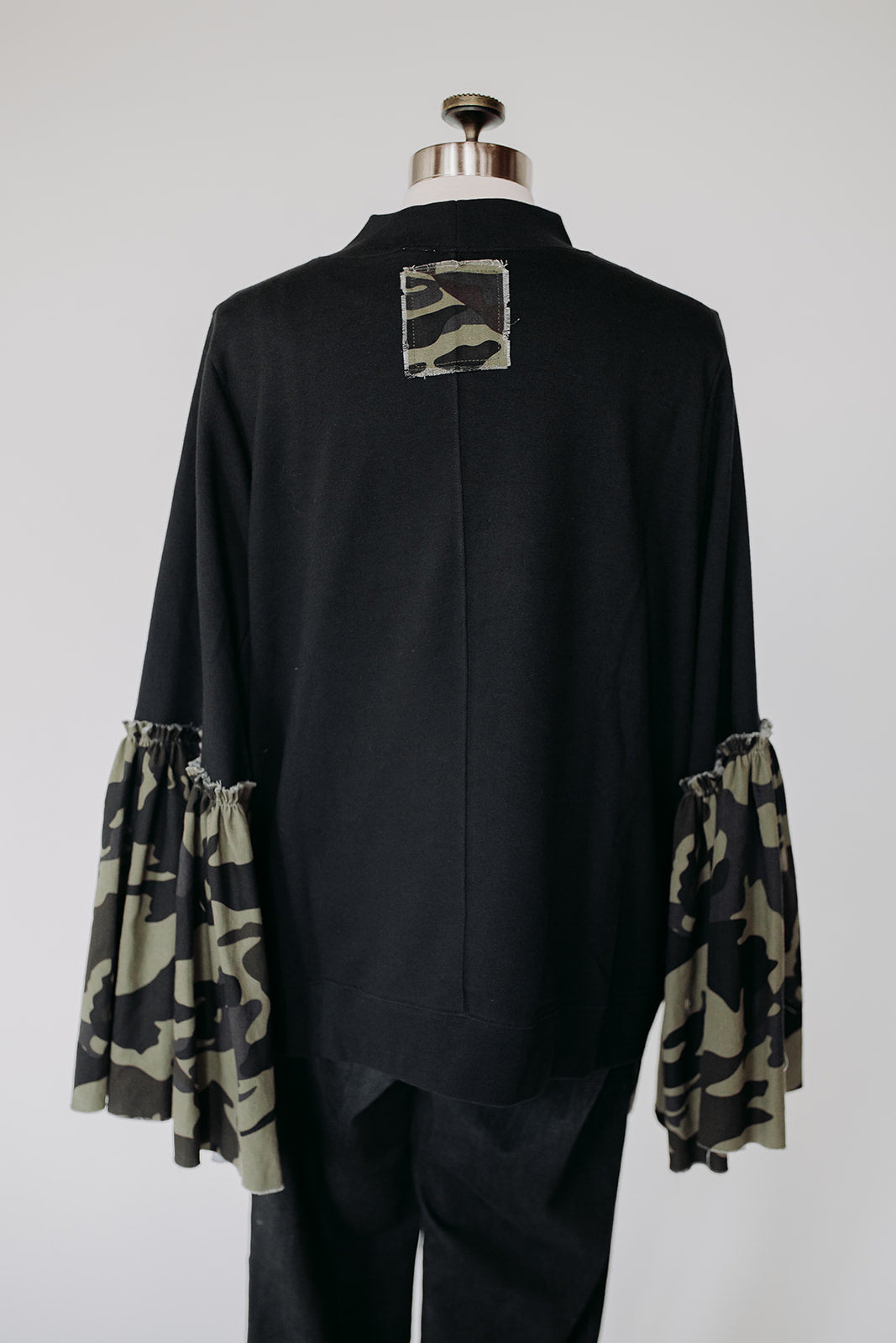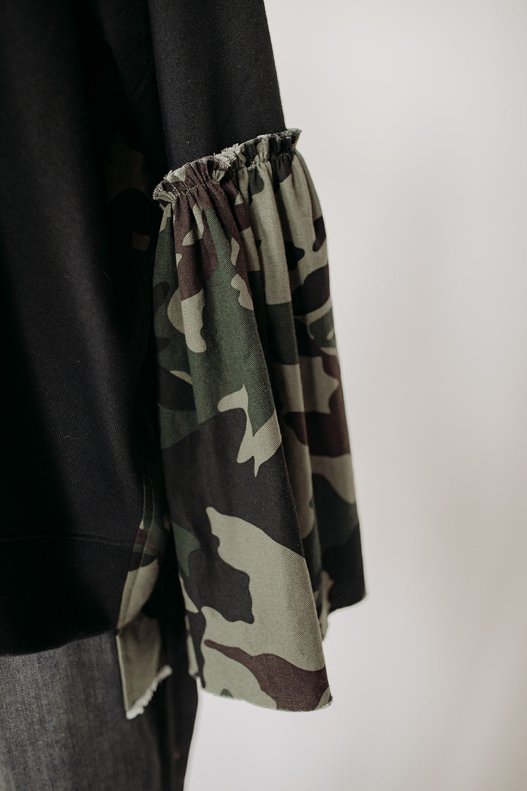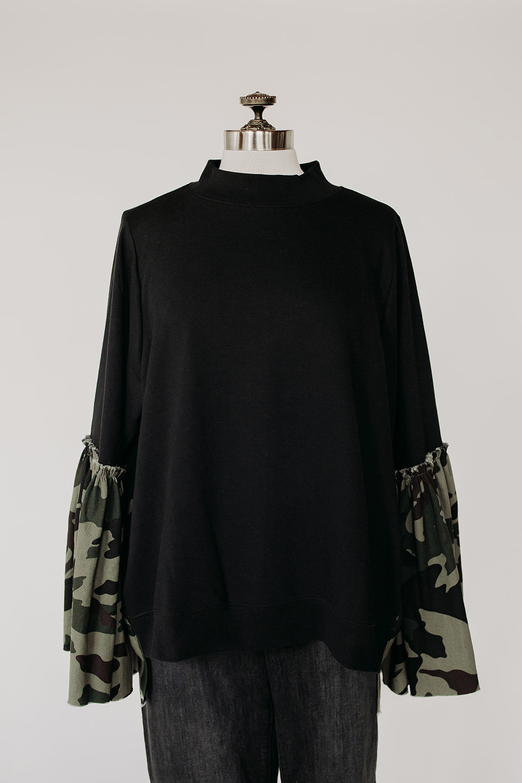 This oversized mock neck sweatshirt features a camo stripe down each side and a gathered sleeve that makes it oh so flowy. Great paired with jeans or sweats for a more casual look.