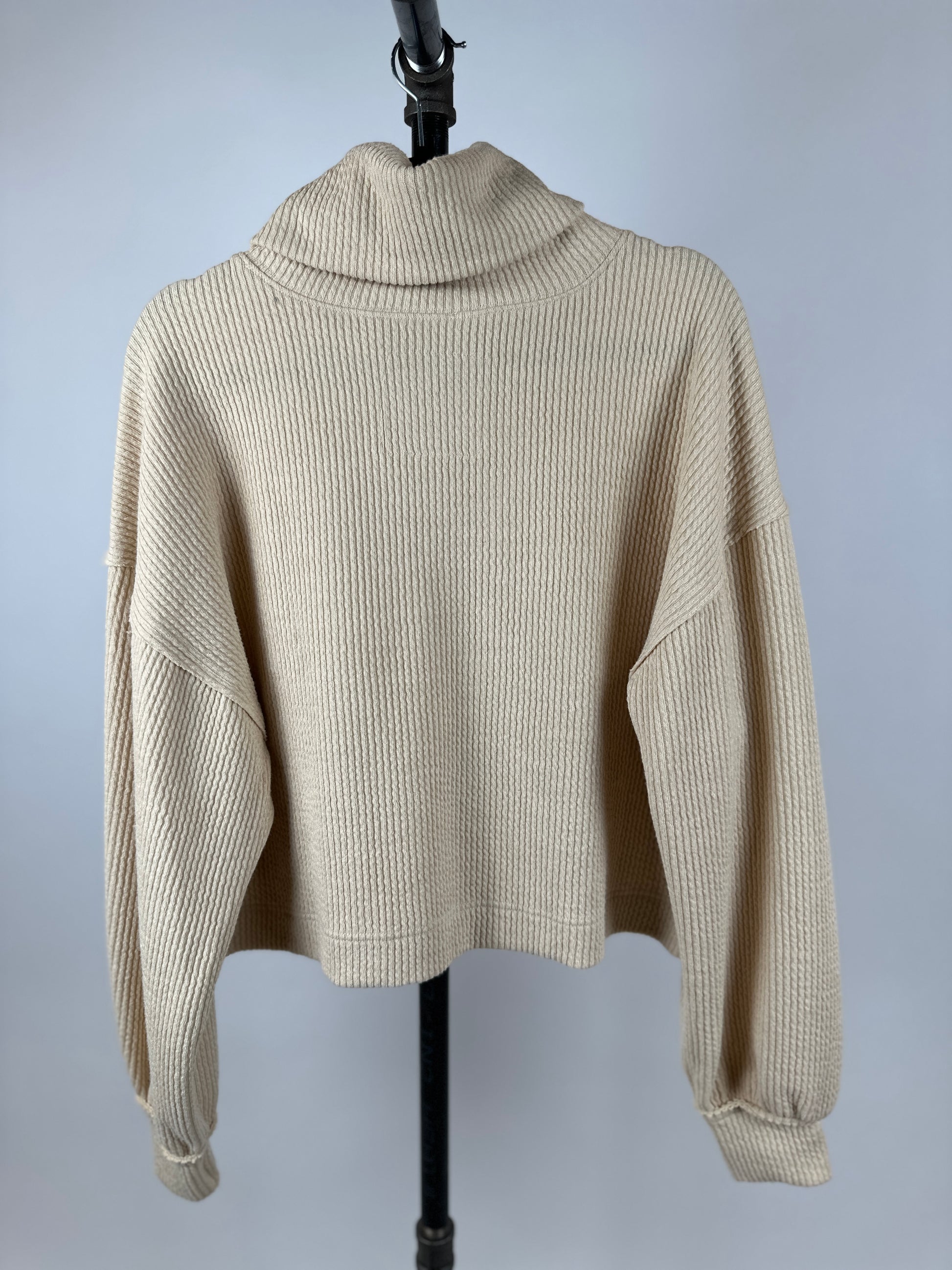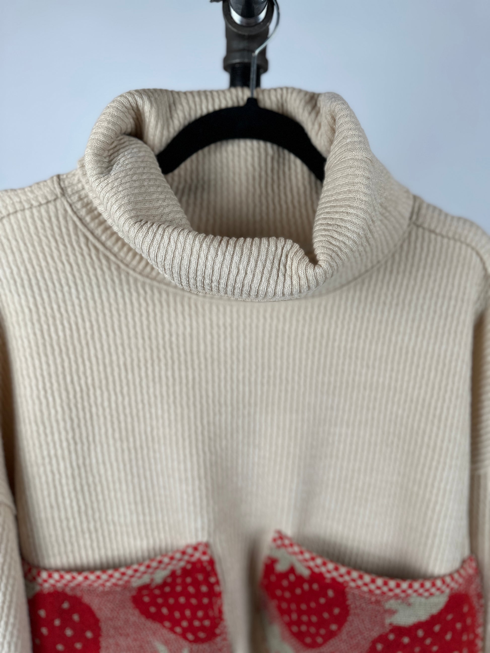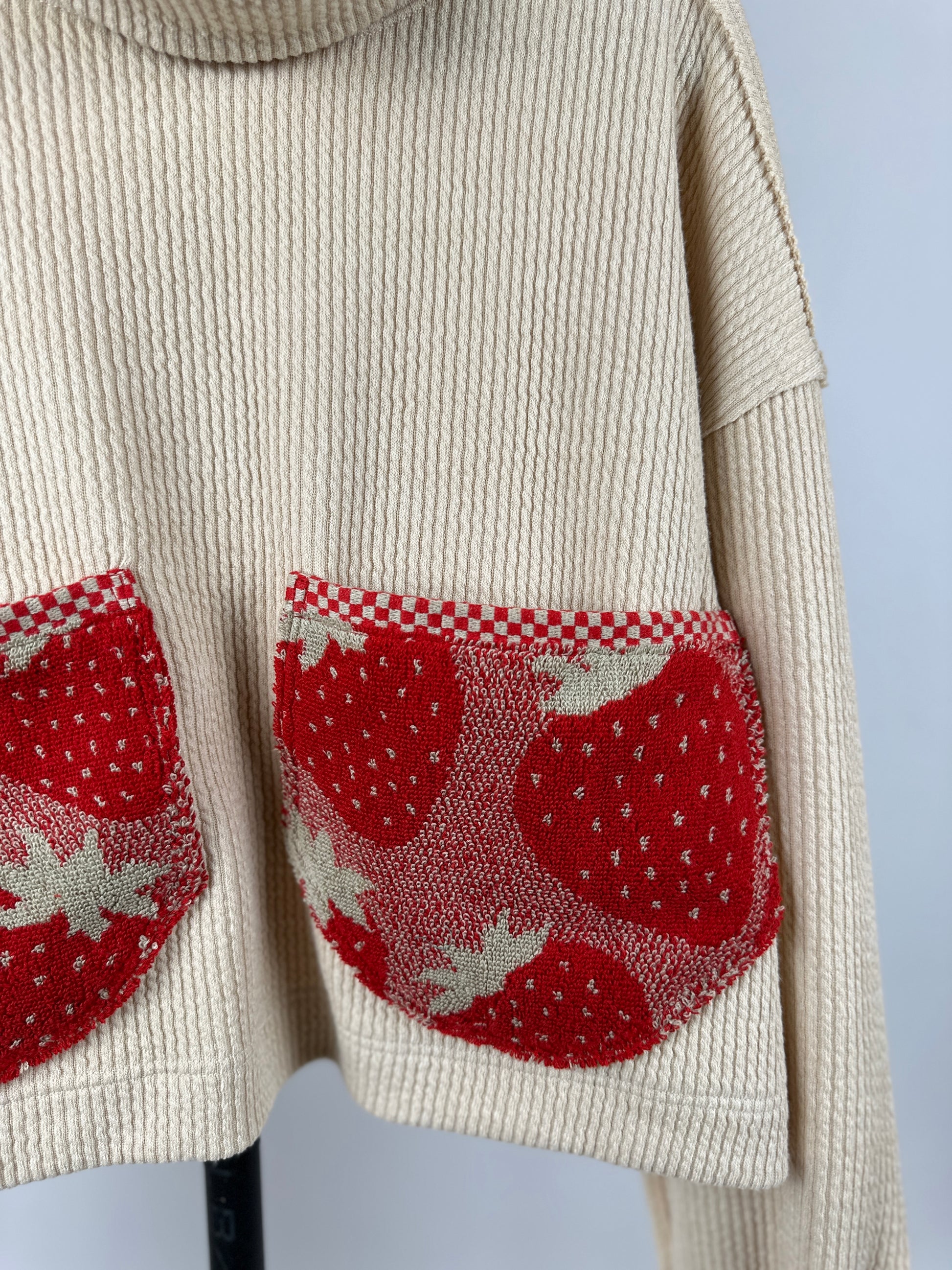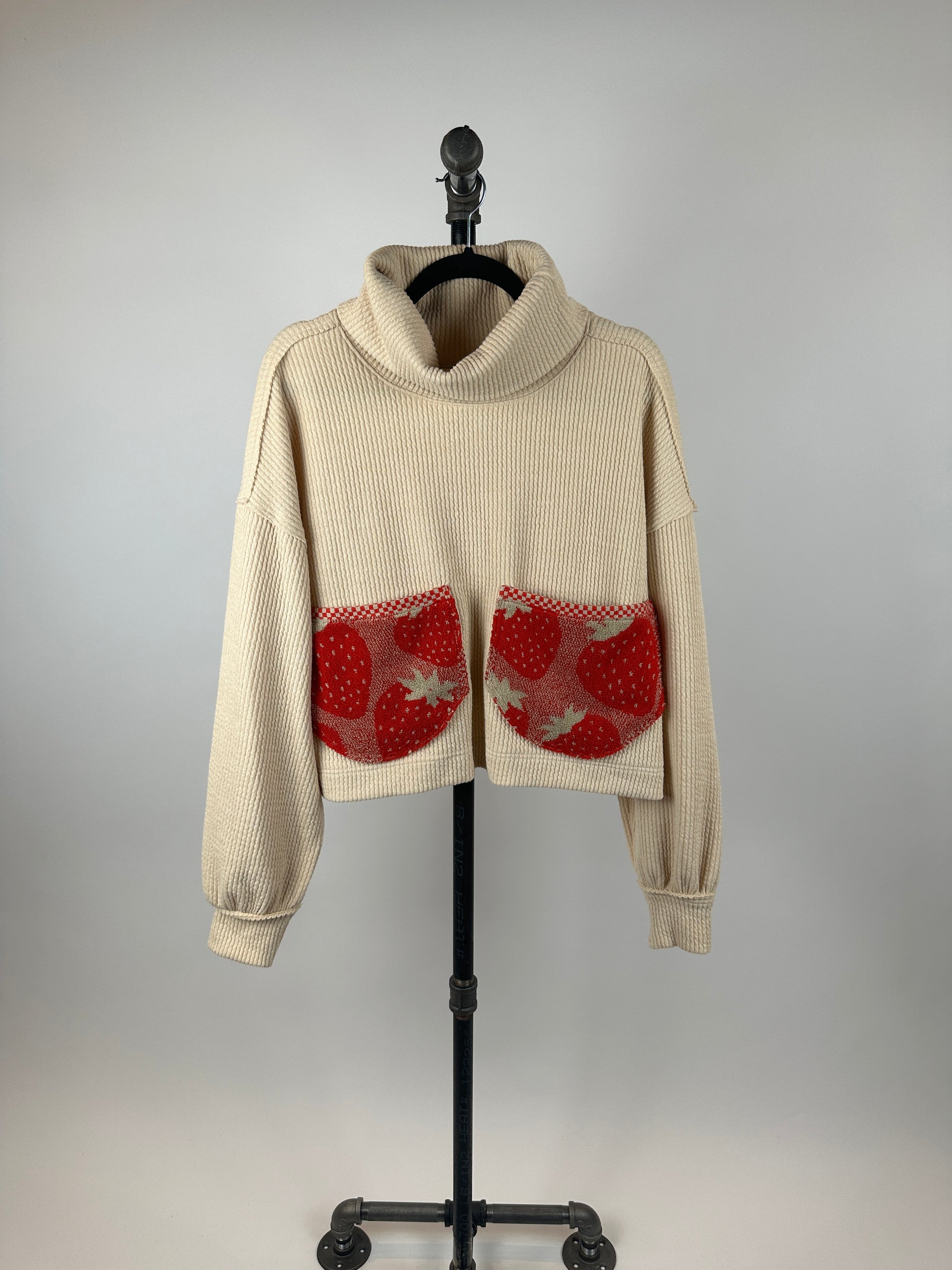 Upgrade your wardrobe with The Berry 2, the ultimate combination of sustainability and style. This upcycled turtleneck sweatshirt boasts a super soft feel, a slightly cropped but relaxed fit, and playful strawberry pocket details. Plus, the balloon sleeves add a touch of whimsy to any outfit. Don't miss out on this one-of-a-kind piece!
