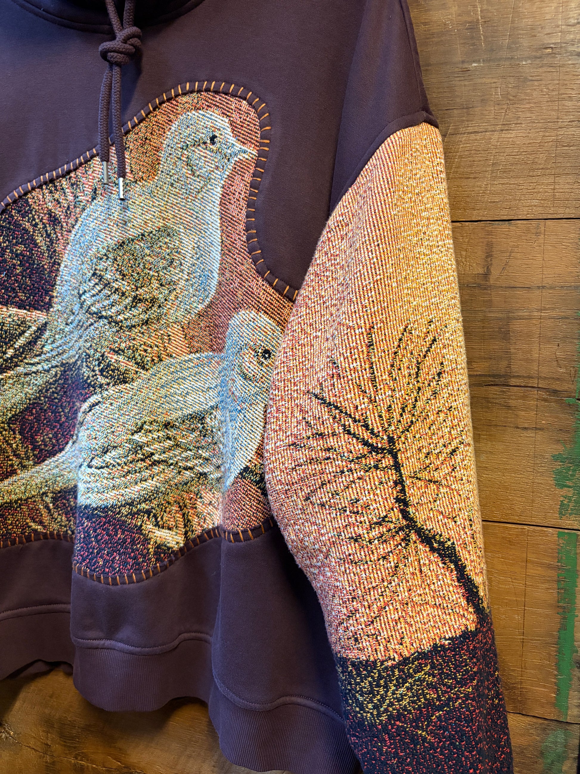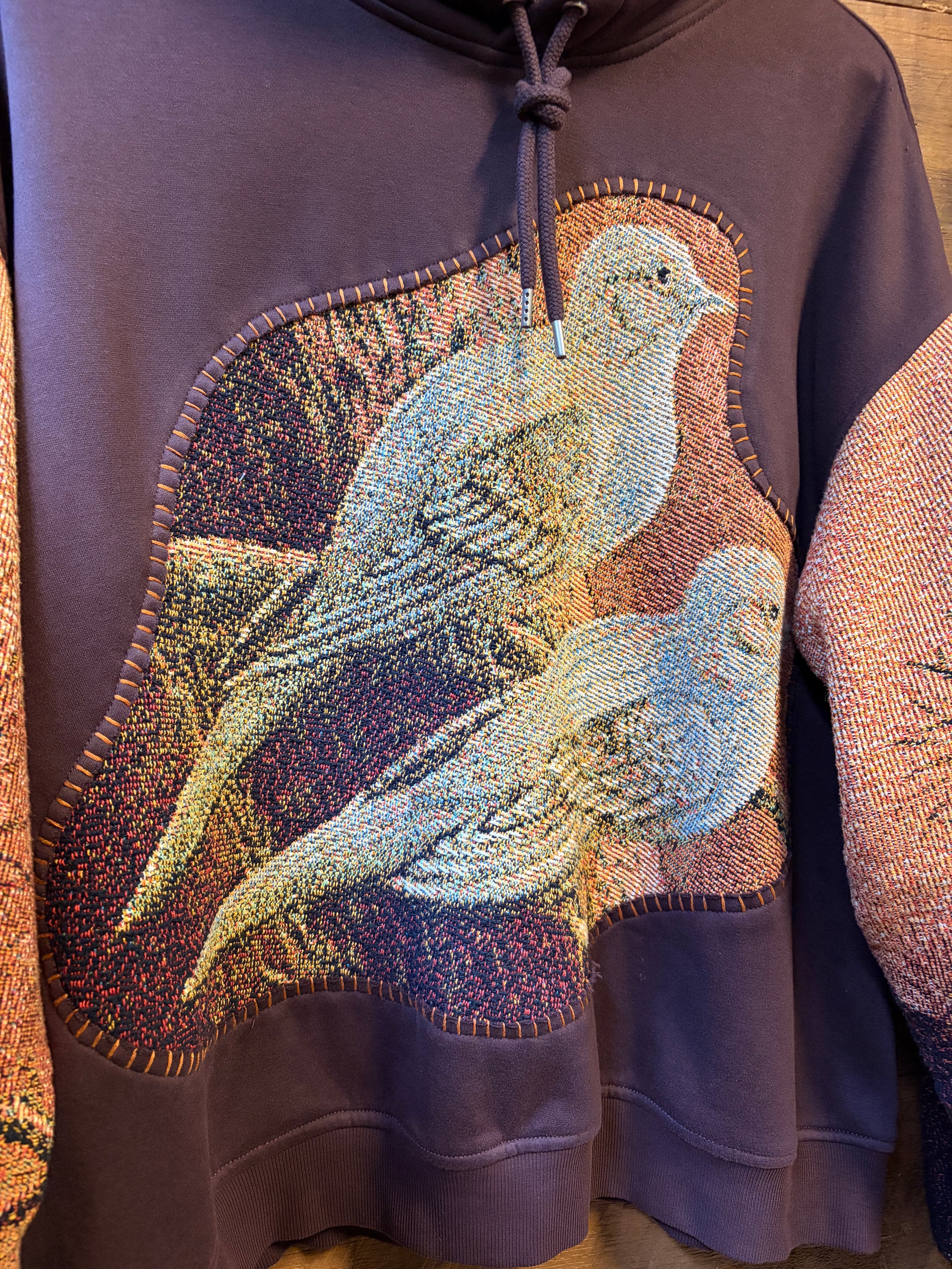 Bring some feathered fun to your wardrobe with The Birdy, an oversized hoodie crafted from upcycled fabrics. Featuring eye-catching contrasting sleeves and a charming bird motif on the front, created from an upcycled blanket. This cozy piece adds a quirky twist to your casual look. The detailed embroidered stitching highlights the design while the roomy fit ensures comfort for all-day adventures. Perfect for those who love sustainable style with a playful edge.