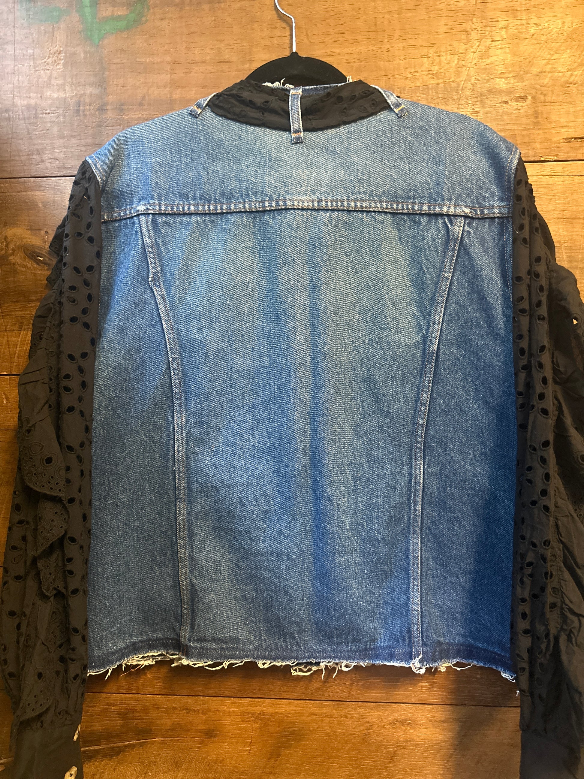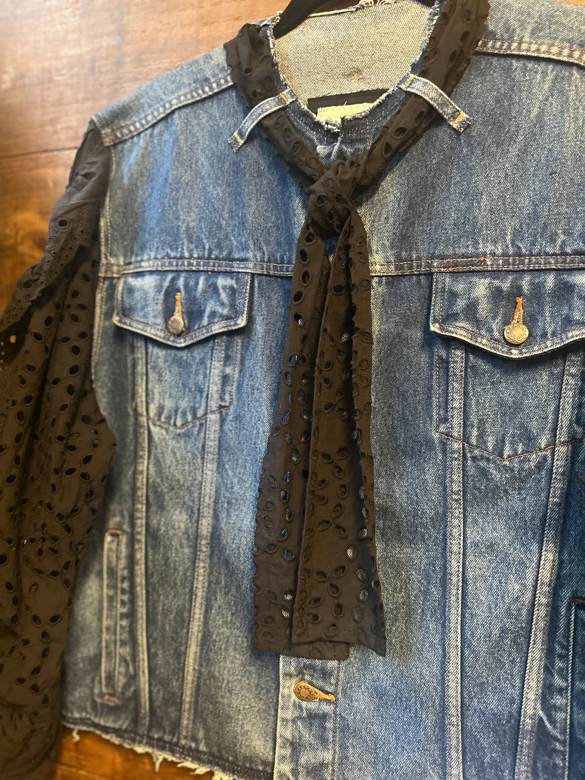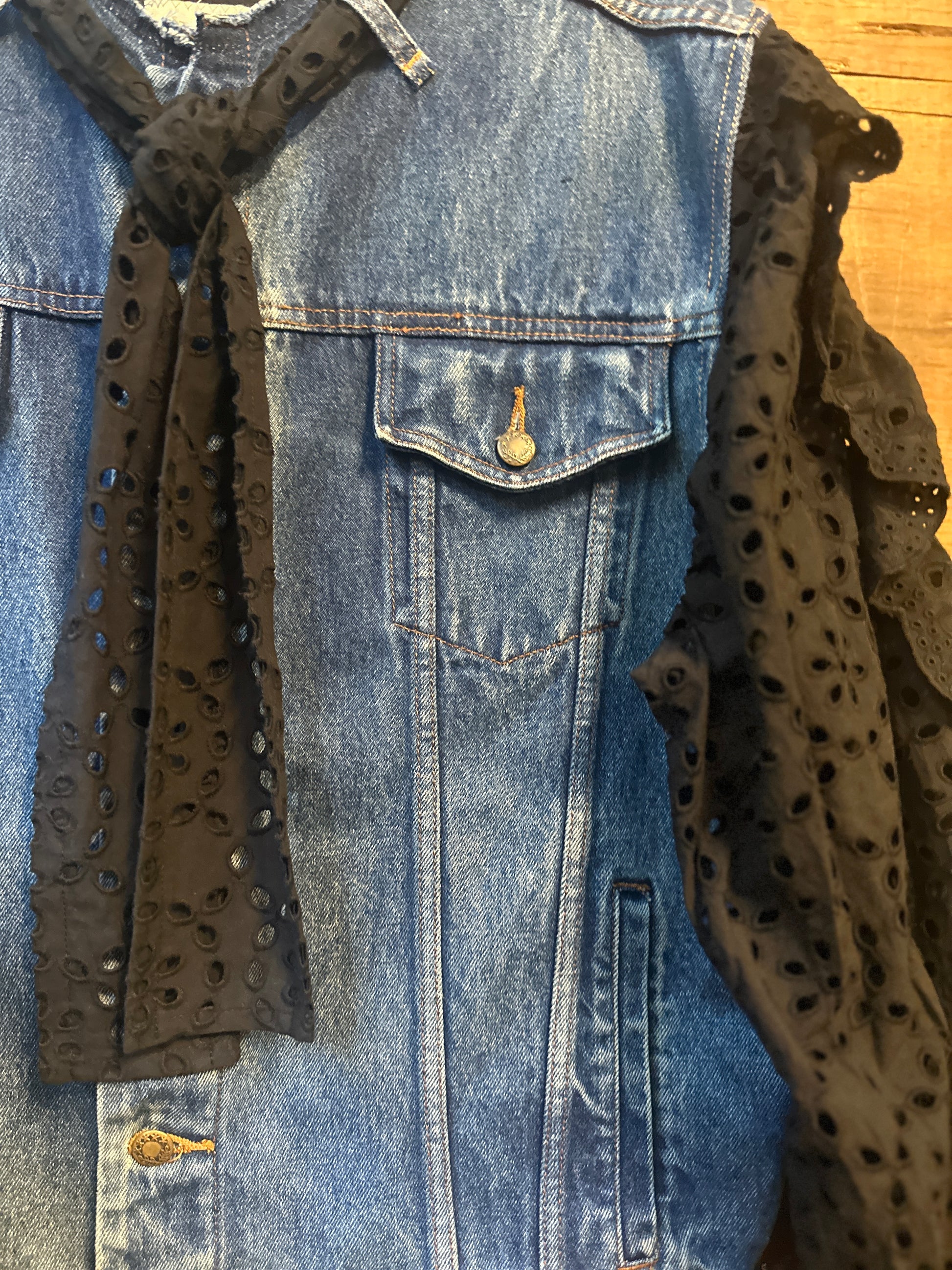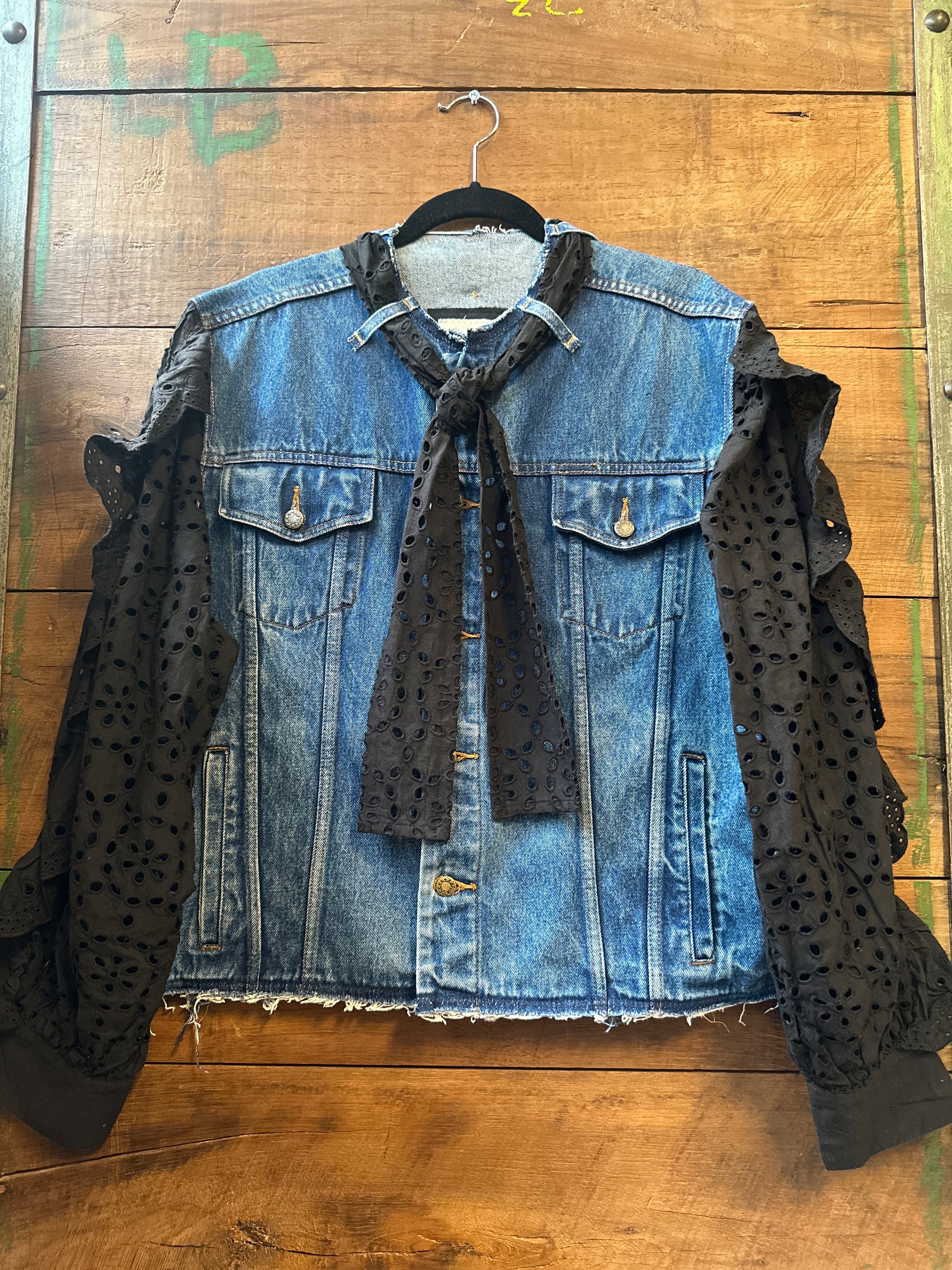 Rock the Black Eye denim jacket with its edgy, upcycled design and playful details like eyelet balloon sleeves and a tie at the neck. The raw hemline adds a touch of rebellious style (without hurting the environment)!