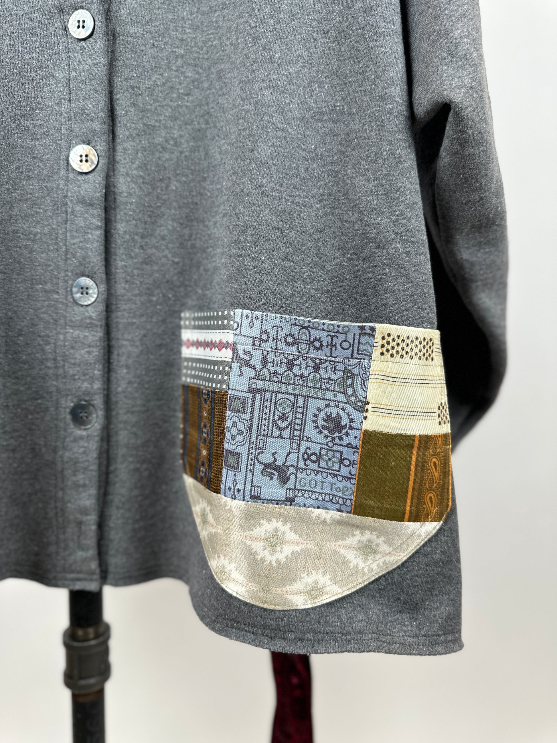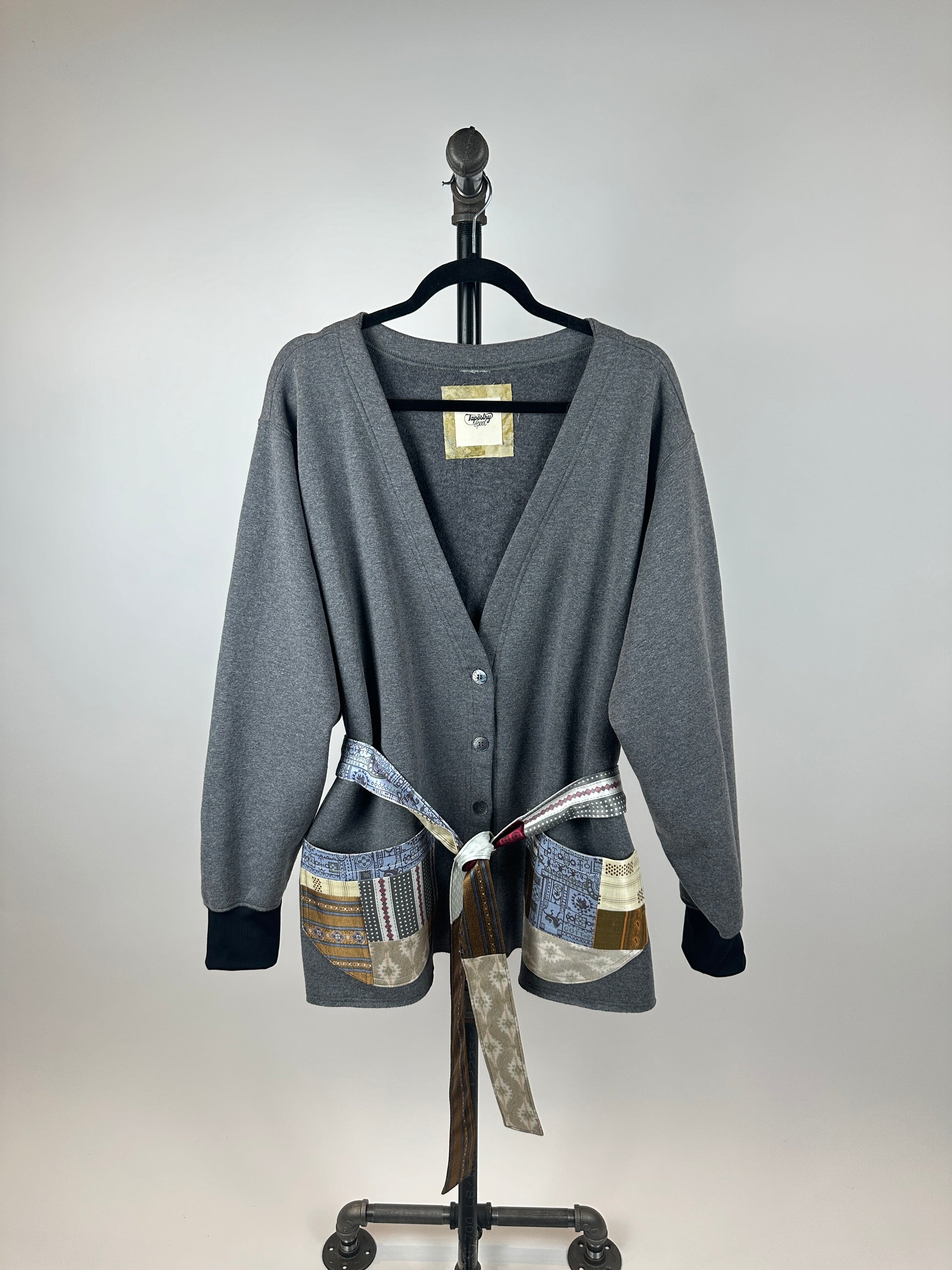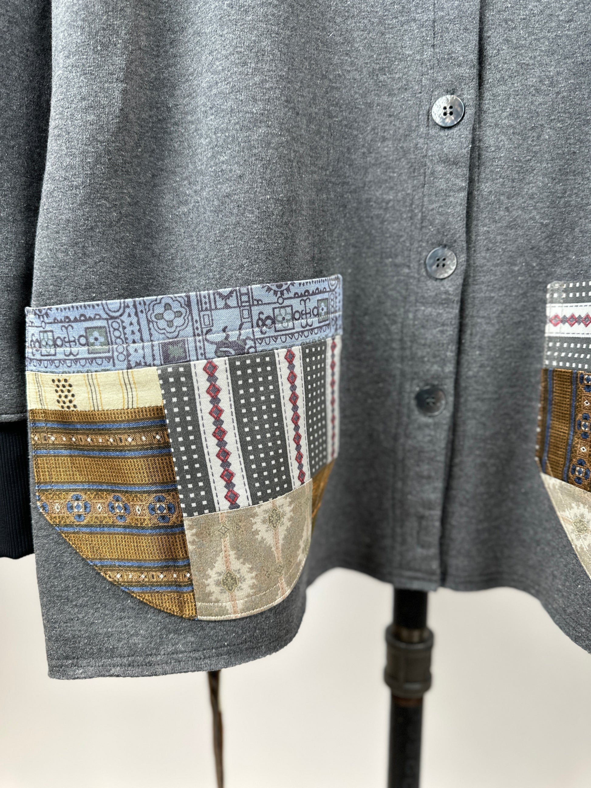 The Boden: not your average cardigan! This oversized, button-up sweatshirt is uniquely upcycled with contrasting patchwork pockets and a matching belt. Stay cozy and stylish while making a statement for sustainability. (Belts, buttons, and patchwork, oh my!)