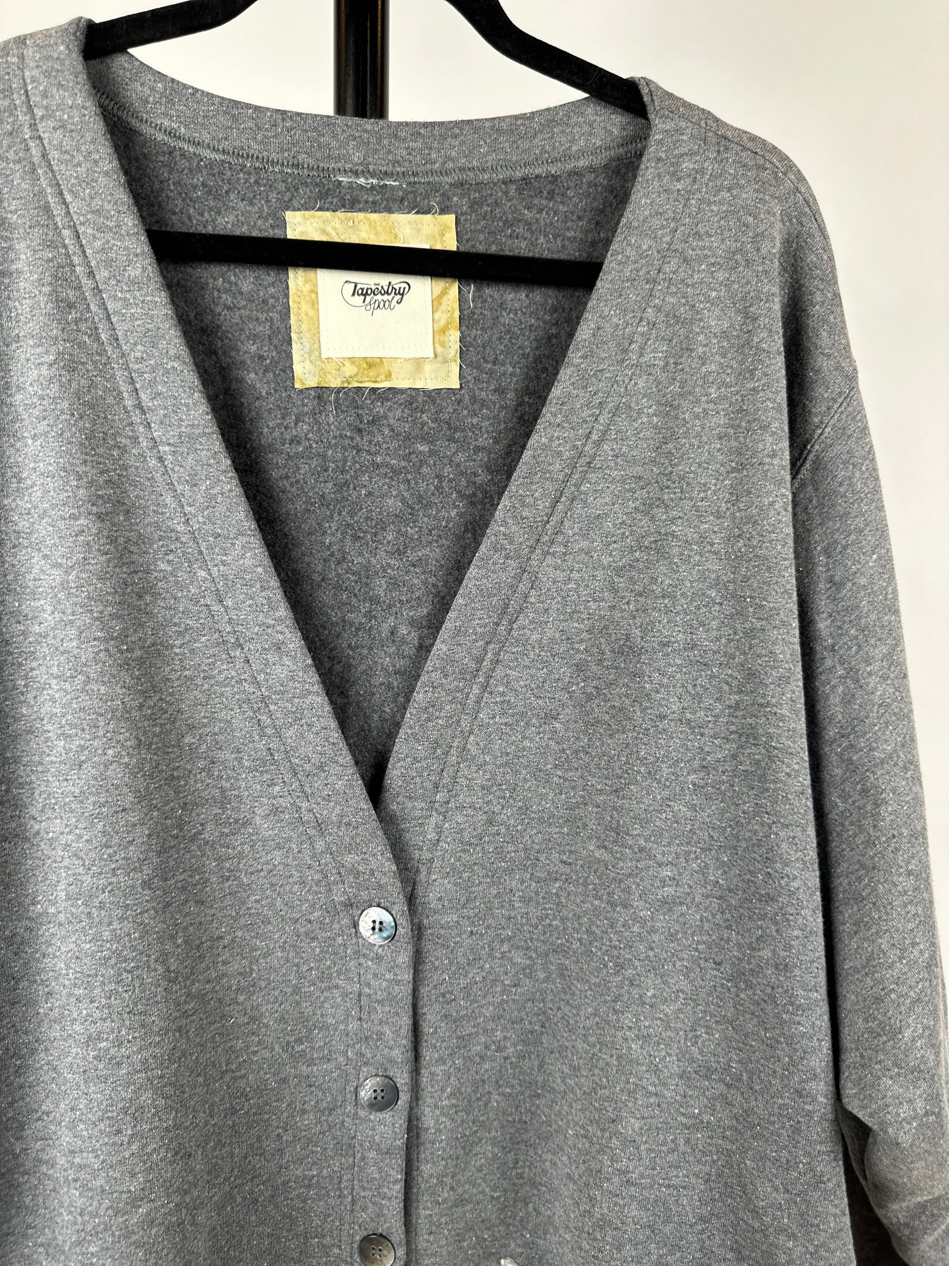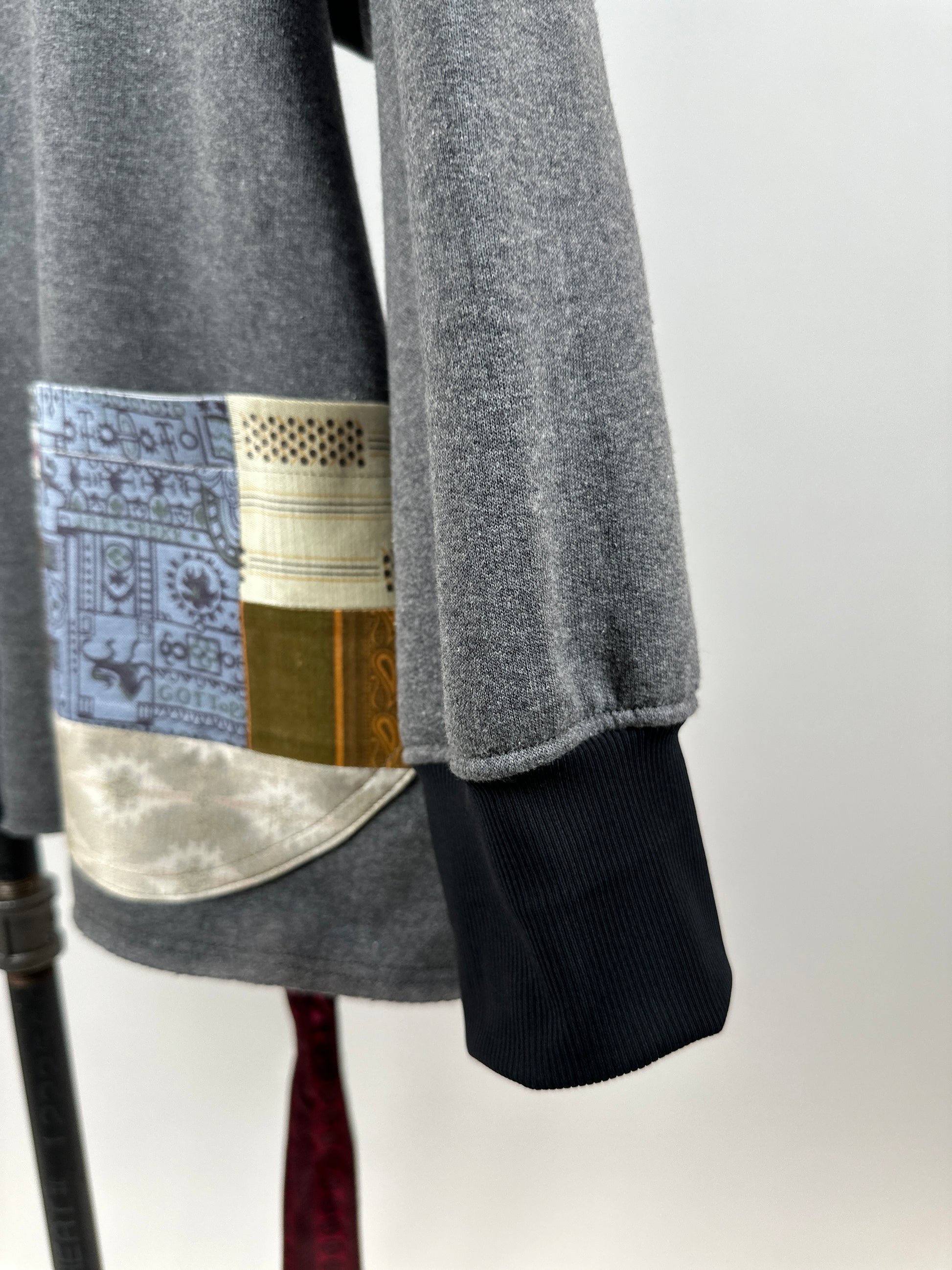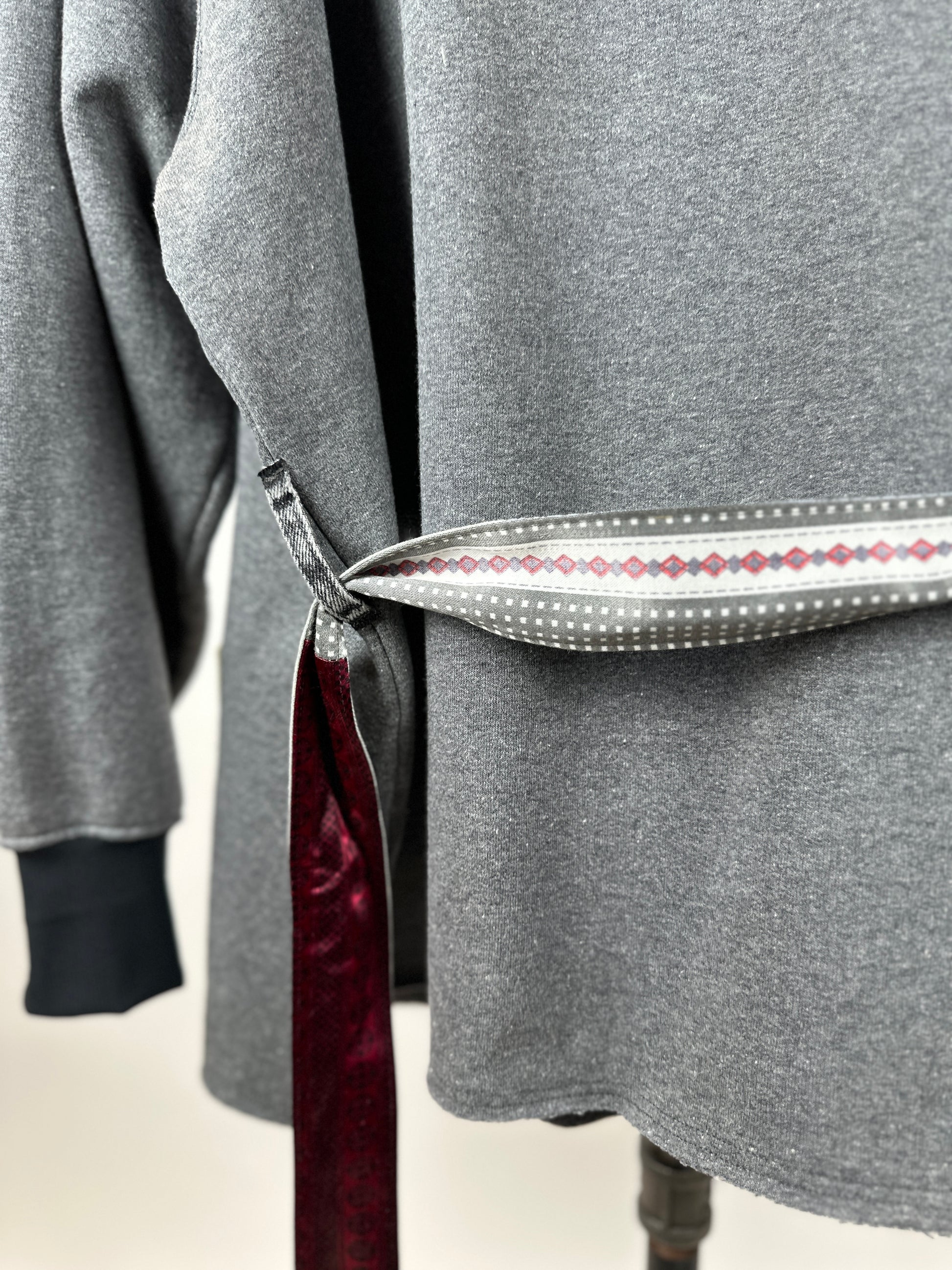 The Boden: not your average cardigan! This oversized, button-up sweatshirt is uniquely upcycled with contrasting patchwork pockets and a matching belt. Stay cozy and stylish while making a statement for sustainability. (Belts, buttons, and patchwork, oh my!)