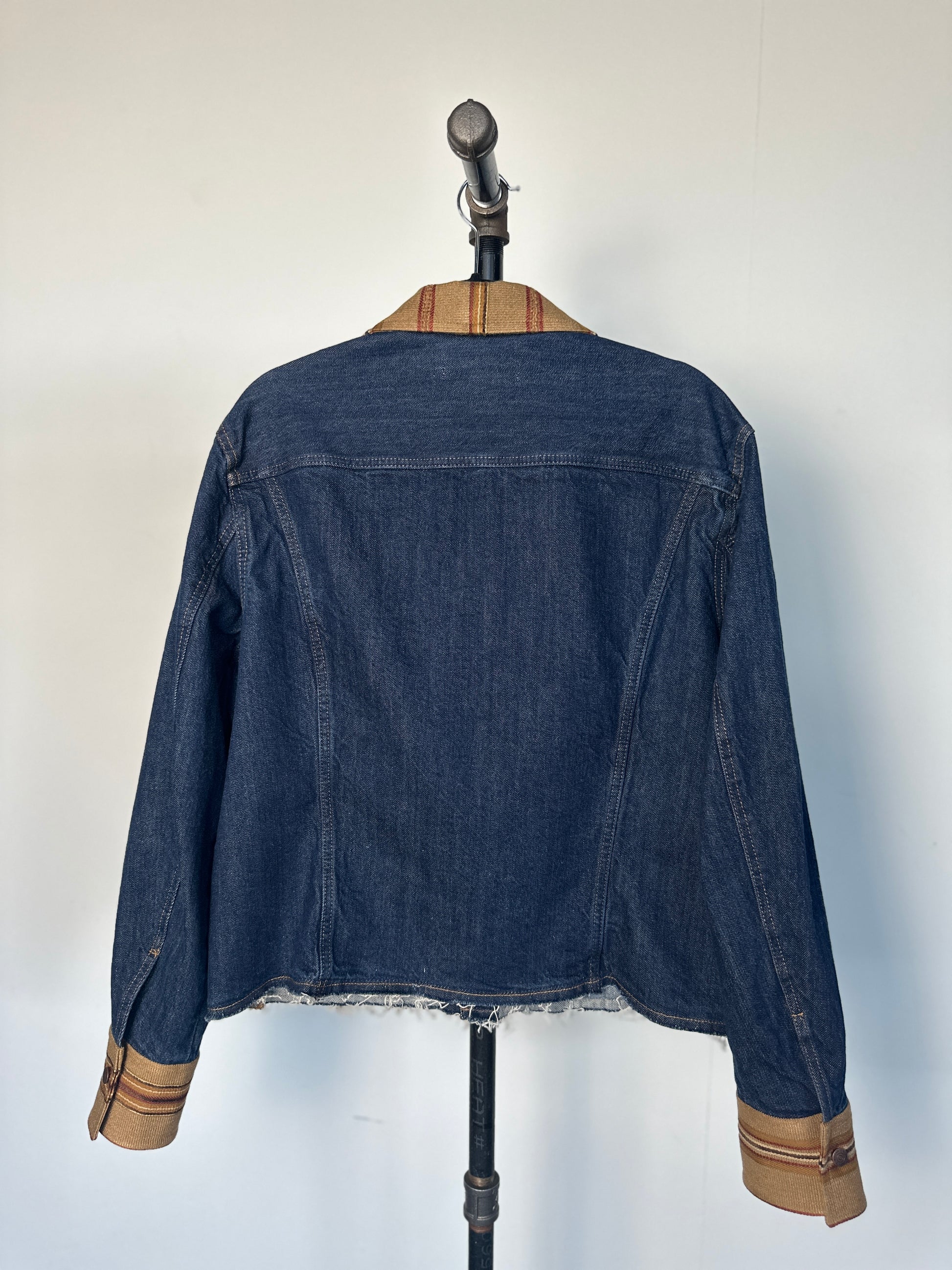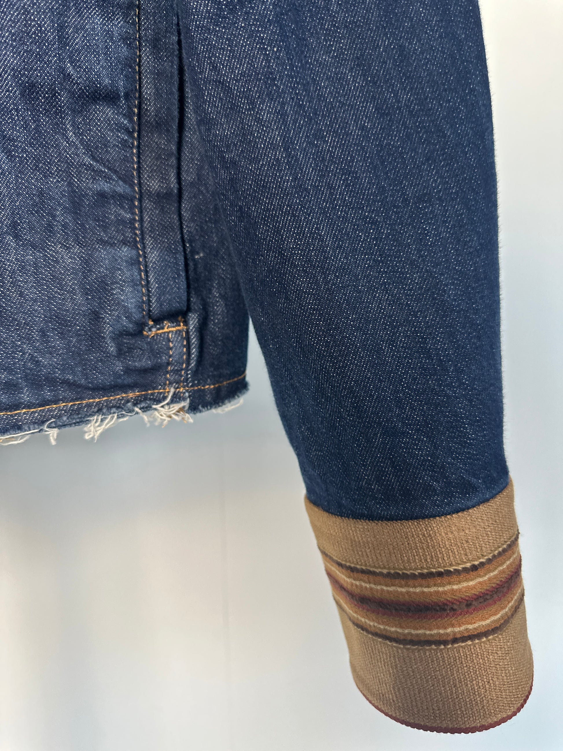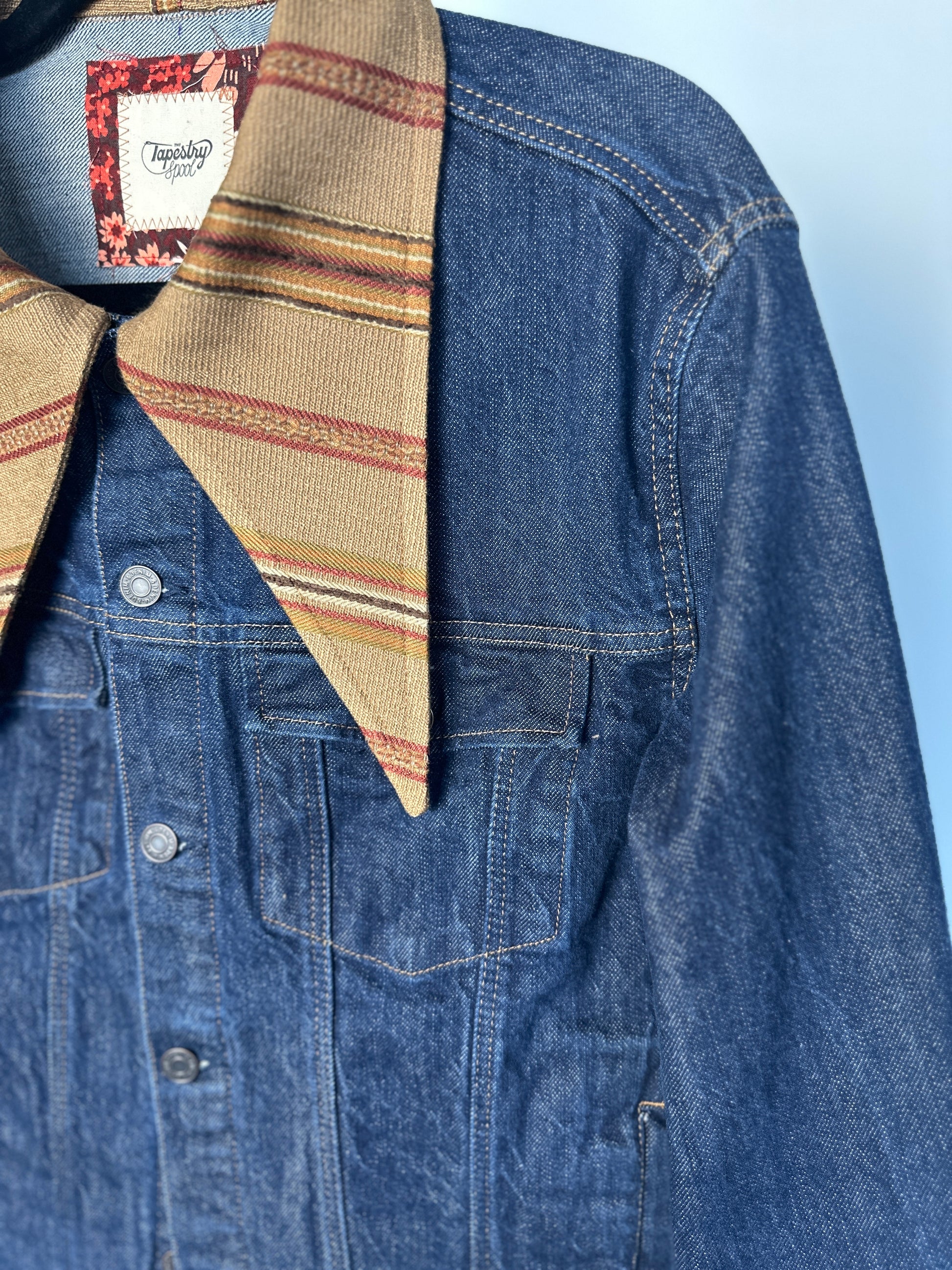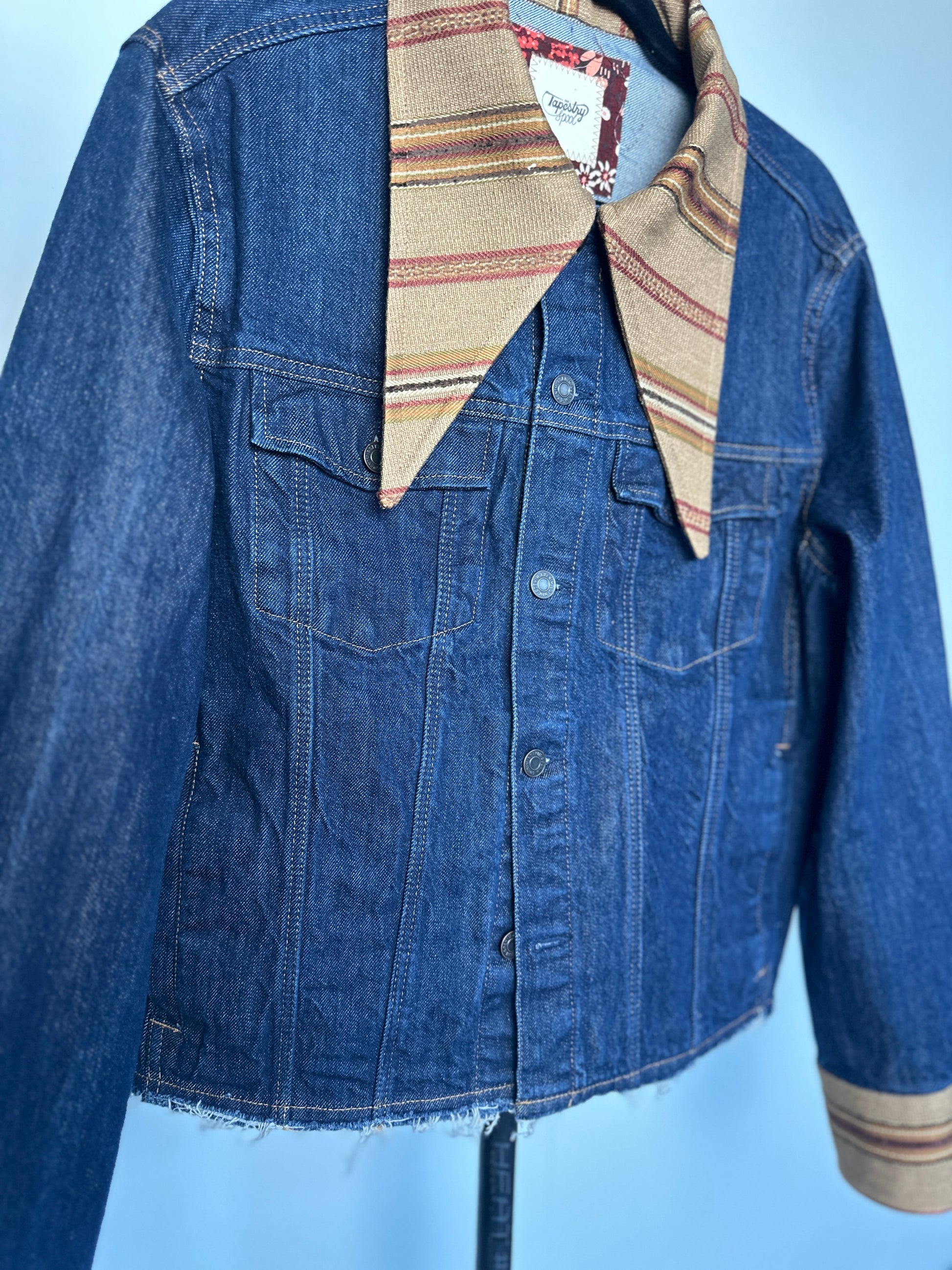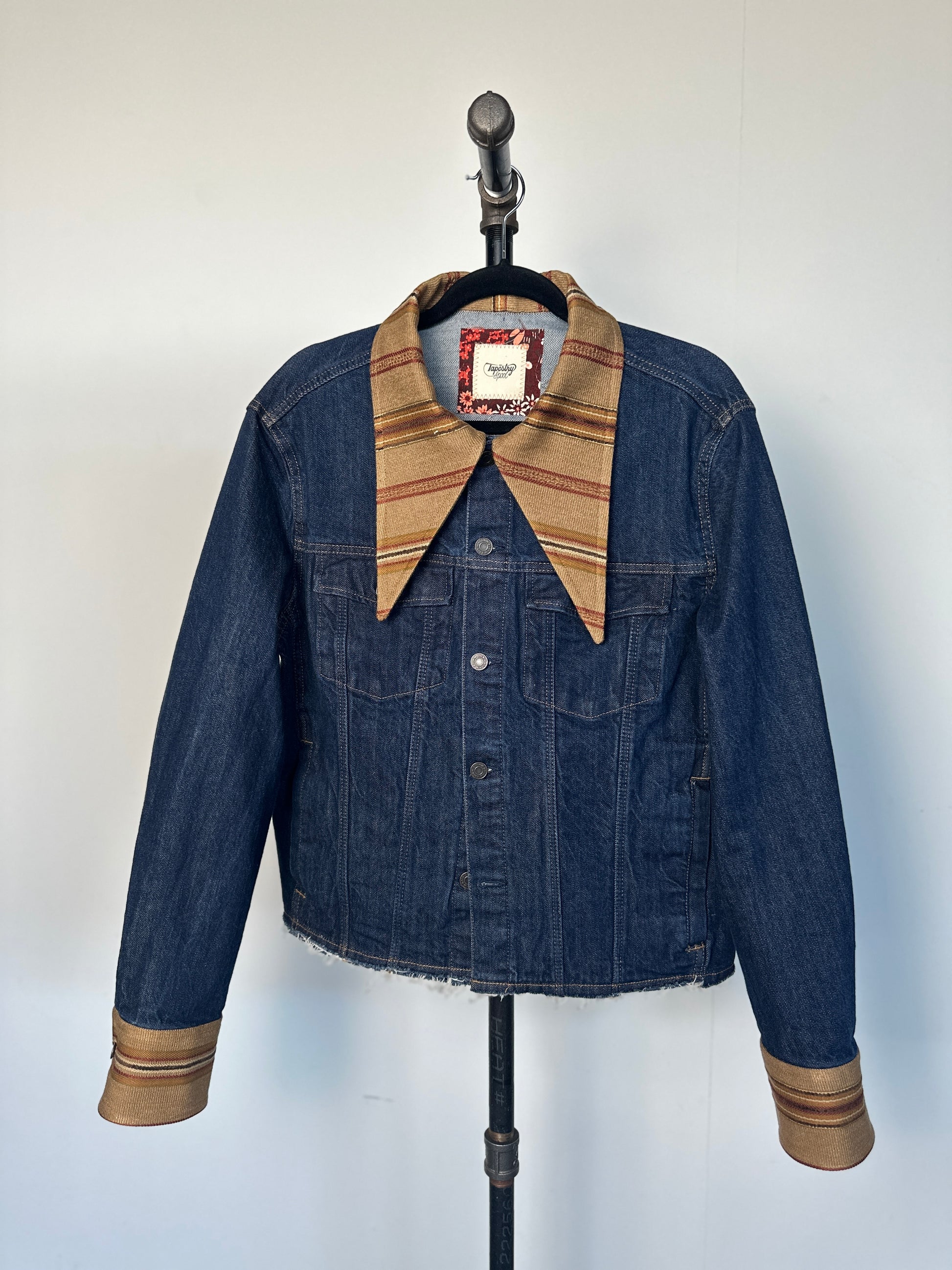 Get ready to make a statement with The Boone - the ultimate upcycled denim jacket. The dark wash adds a touch of sophistication to this piece, while the exaggerated and striped pointy collar and cuffs give it a unique and edgy twist. Embrace your individuality and style with The Boone.