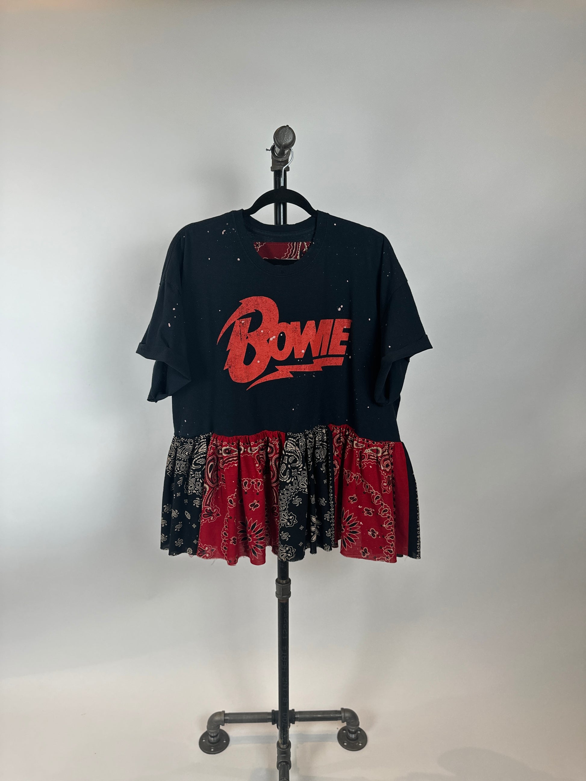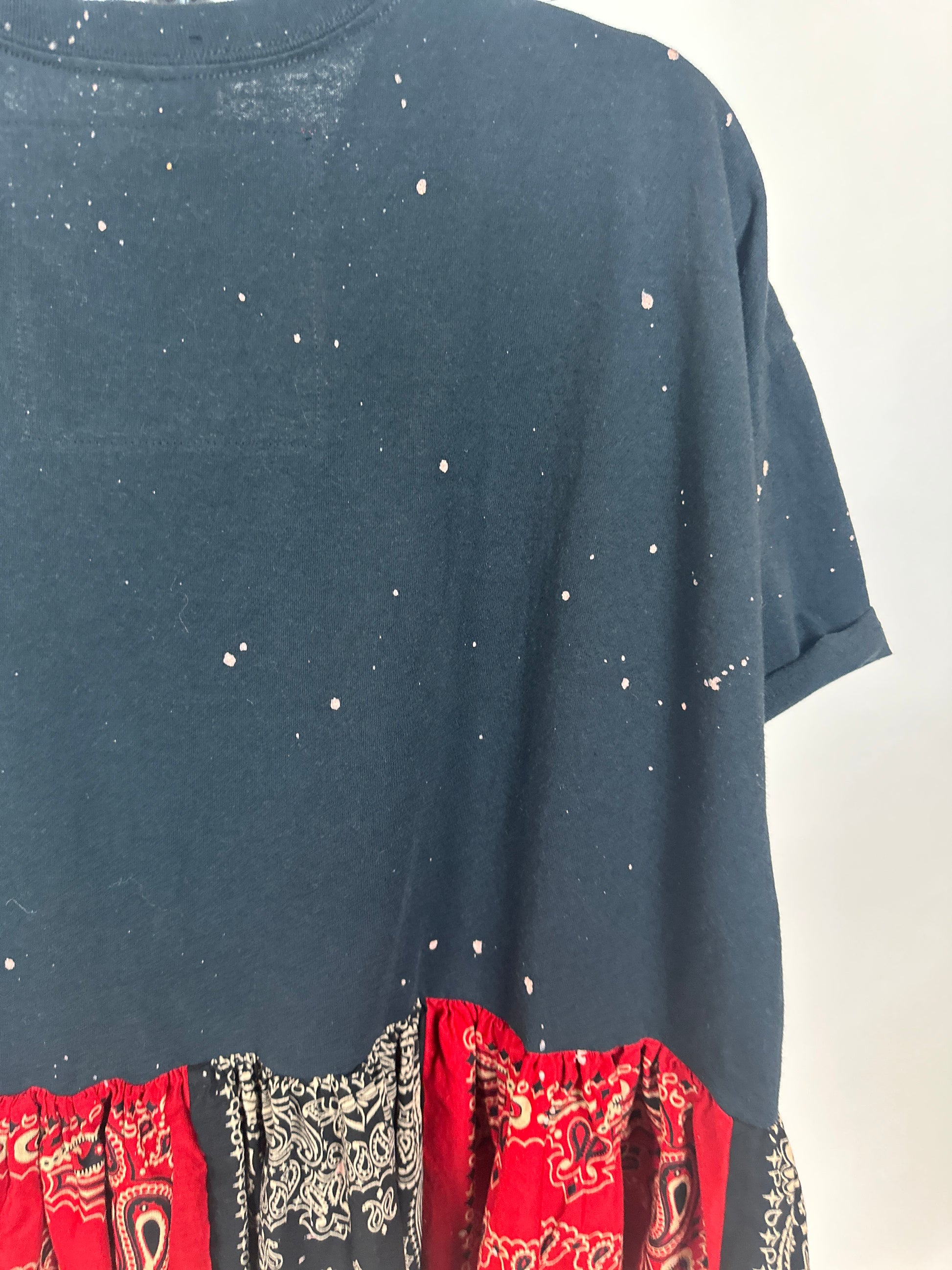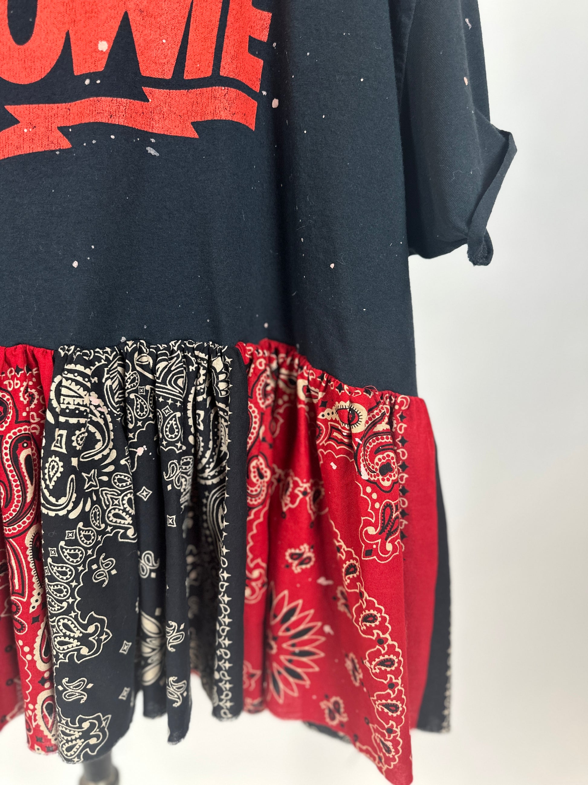 Get ready to rock in The Bowie! This upcycled graphic tee adds a punk twist to any outfit with its splatter paint design. Tea dyed bandanas were pieced to create a gathered skirt, attached to the oversized tee - perfect for those who embrace their inner rebel. Let your style shine with The Bowie!