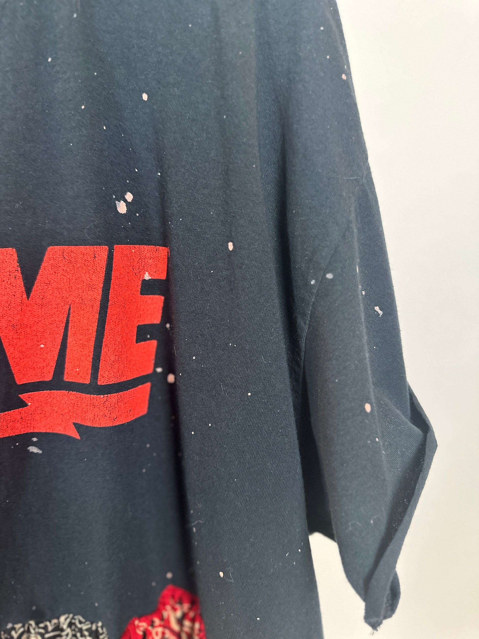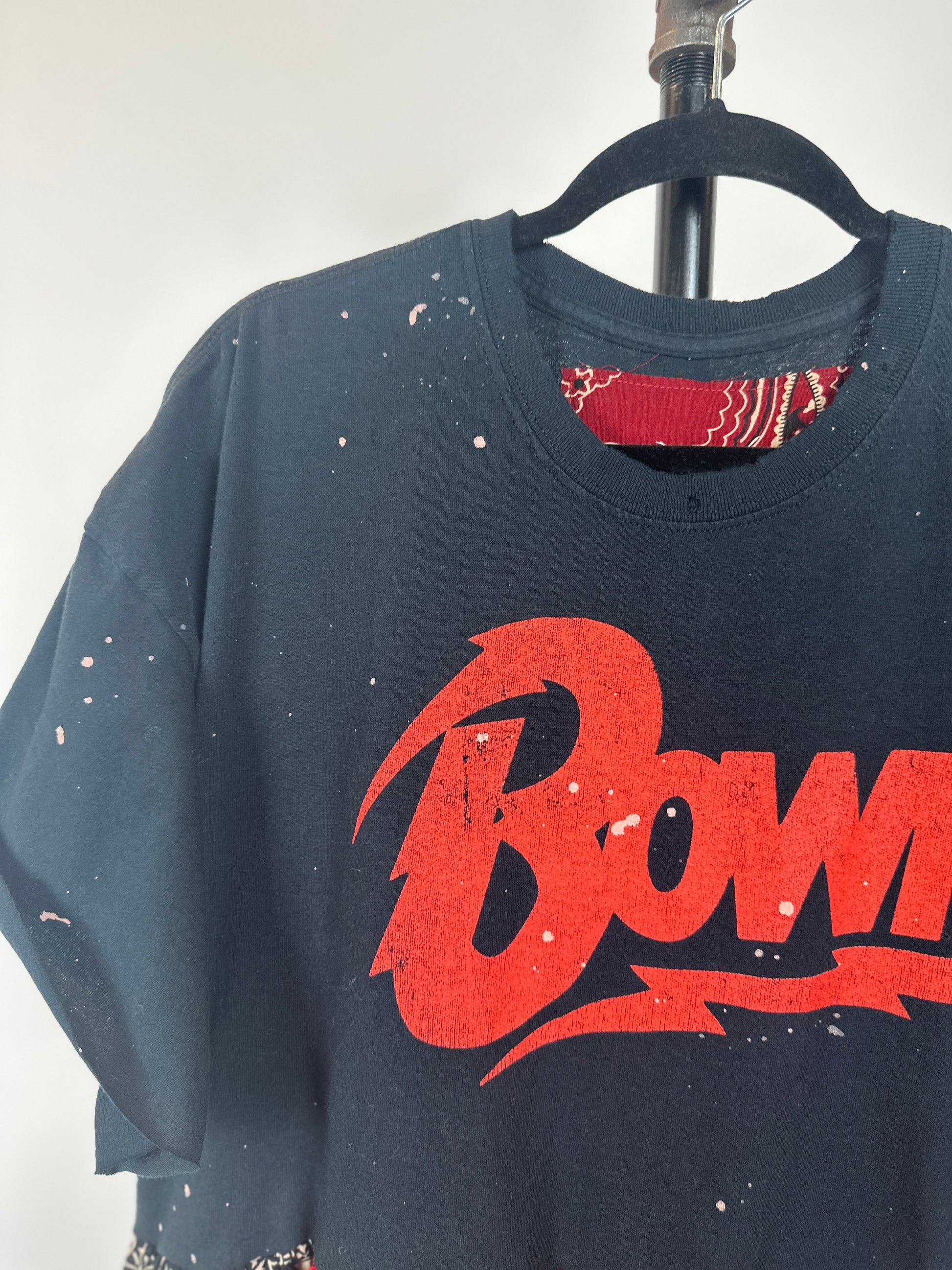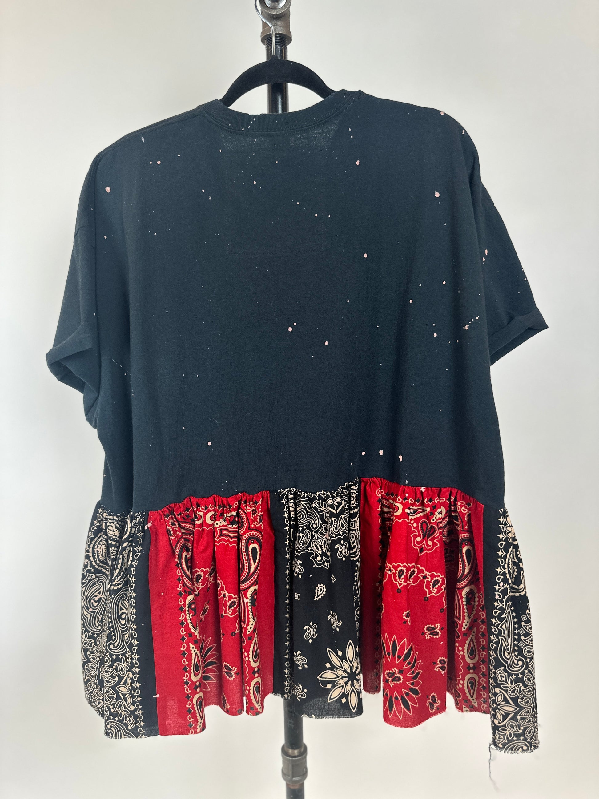 Get ready to rock in The Bowie! This upcycled graphic tee adds a punk twist to any outfit with its splatter paint design. Tea dyed bandanas were pieced to create a gathered skirt, attached to the oversized tee - perfect for those who embrace their inner rebel. Let your style shine with The Bowie!