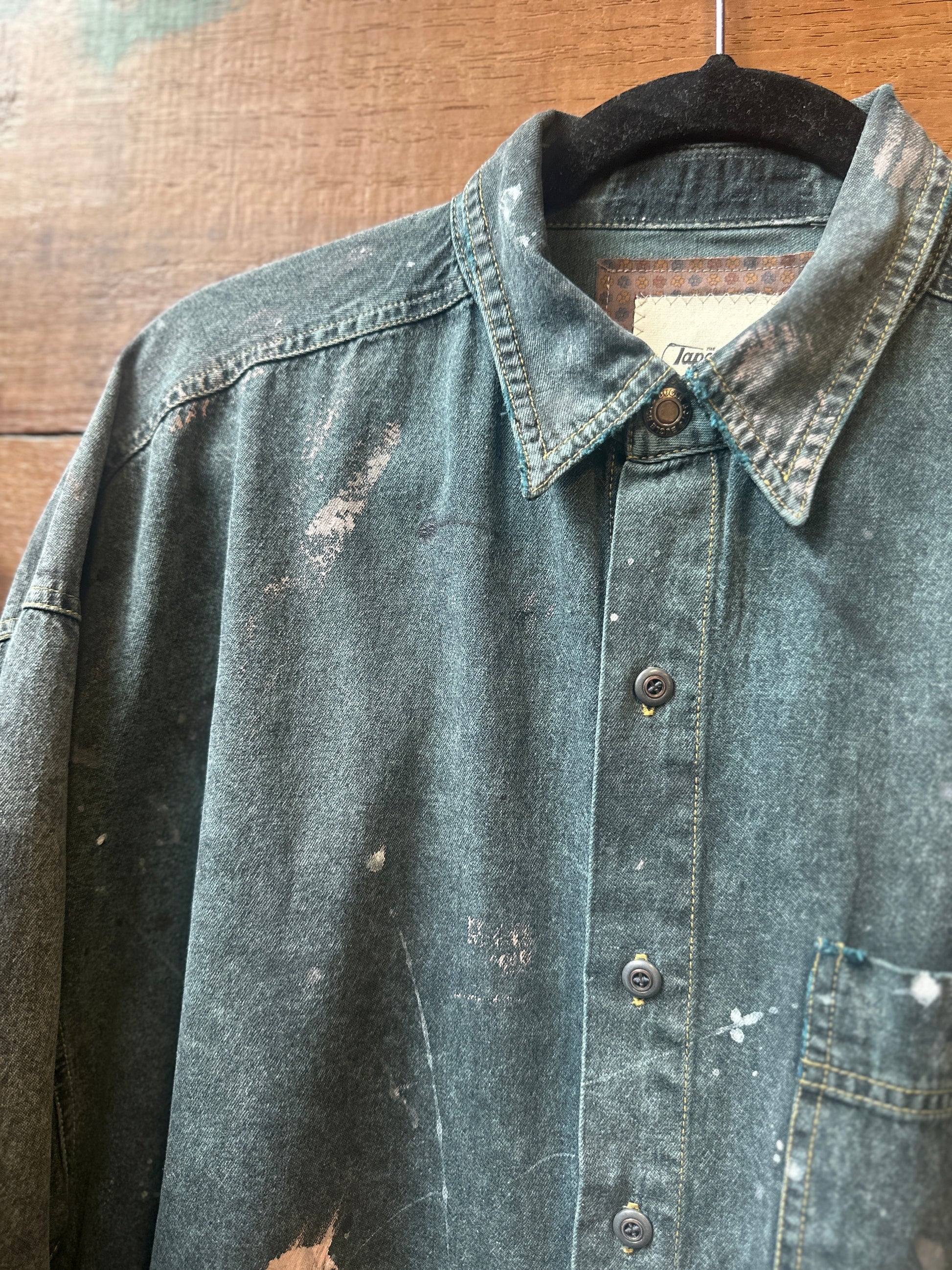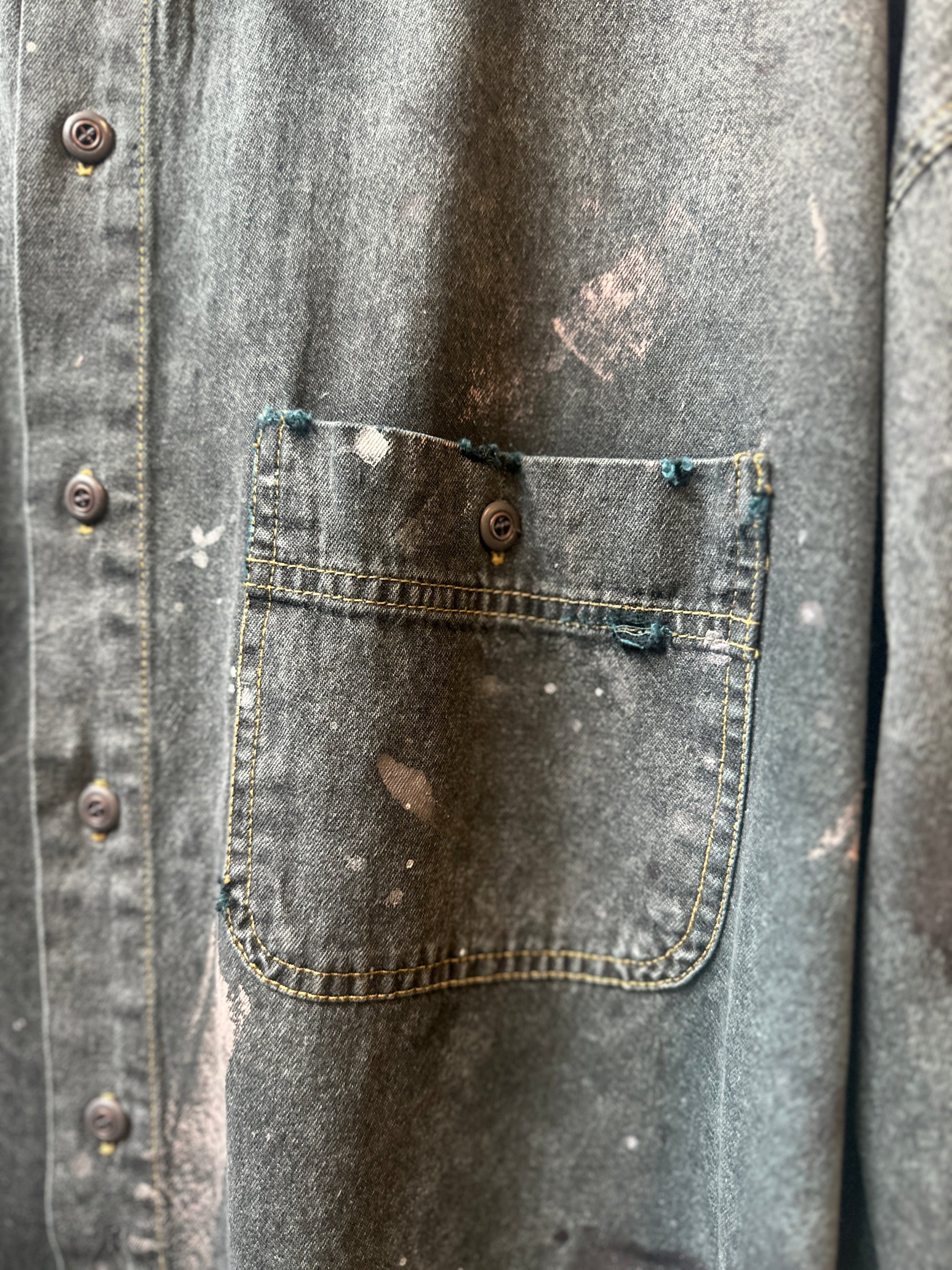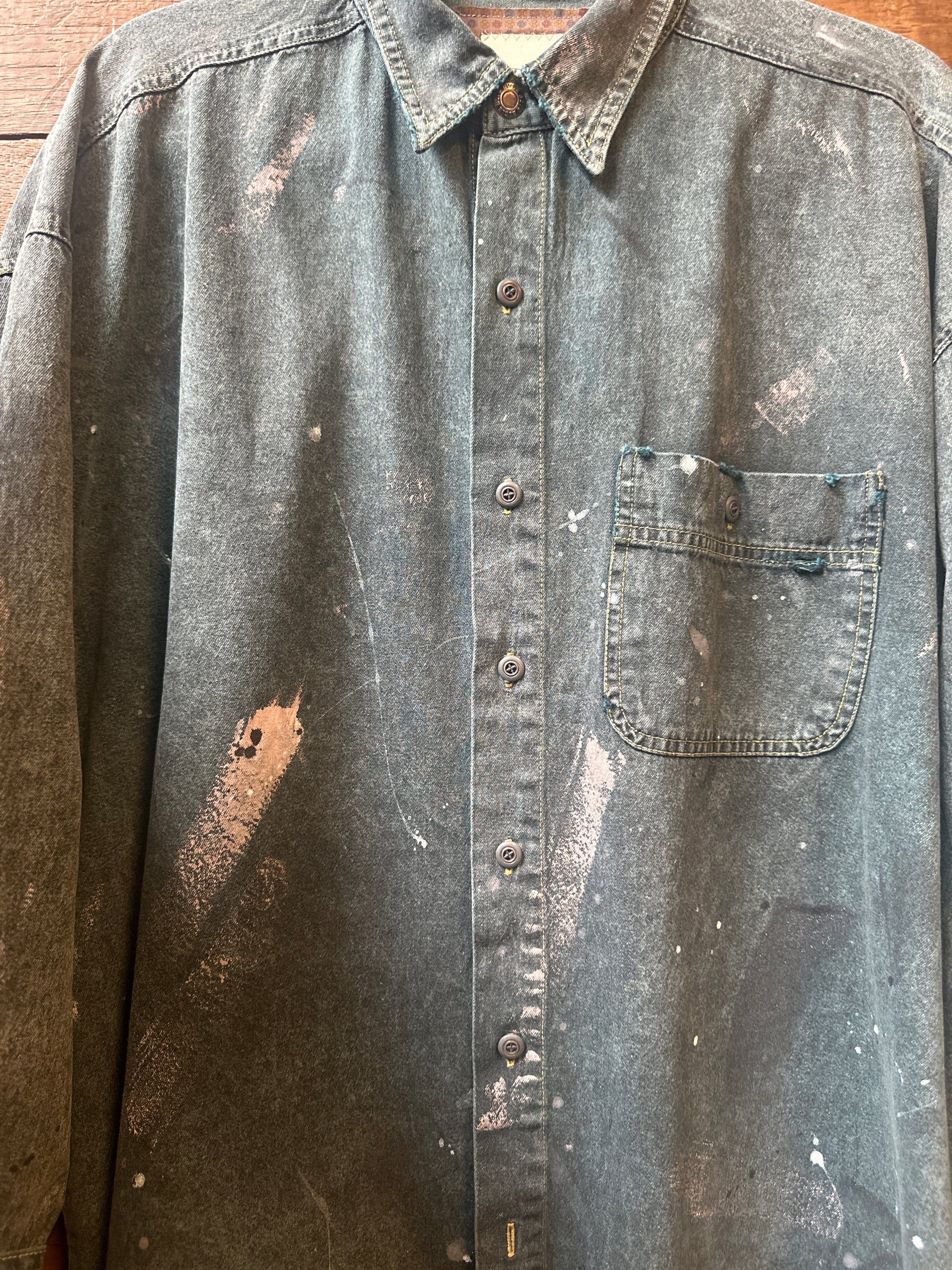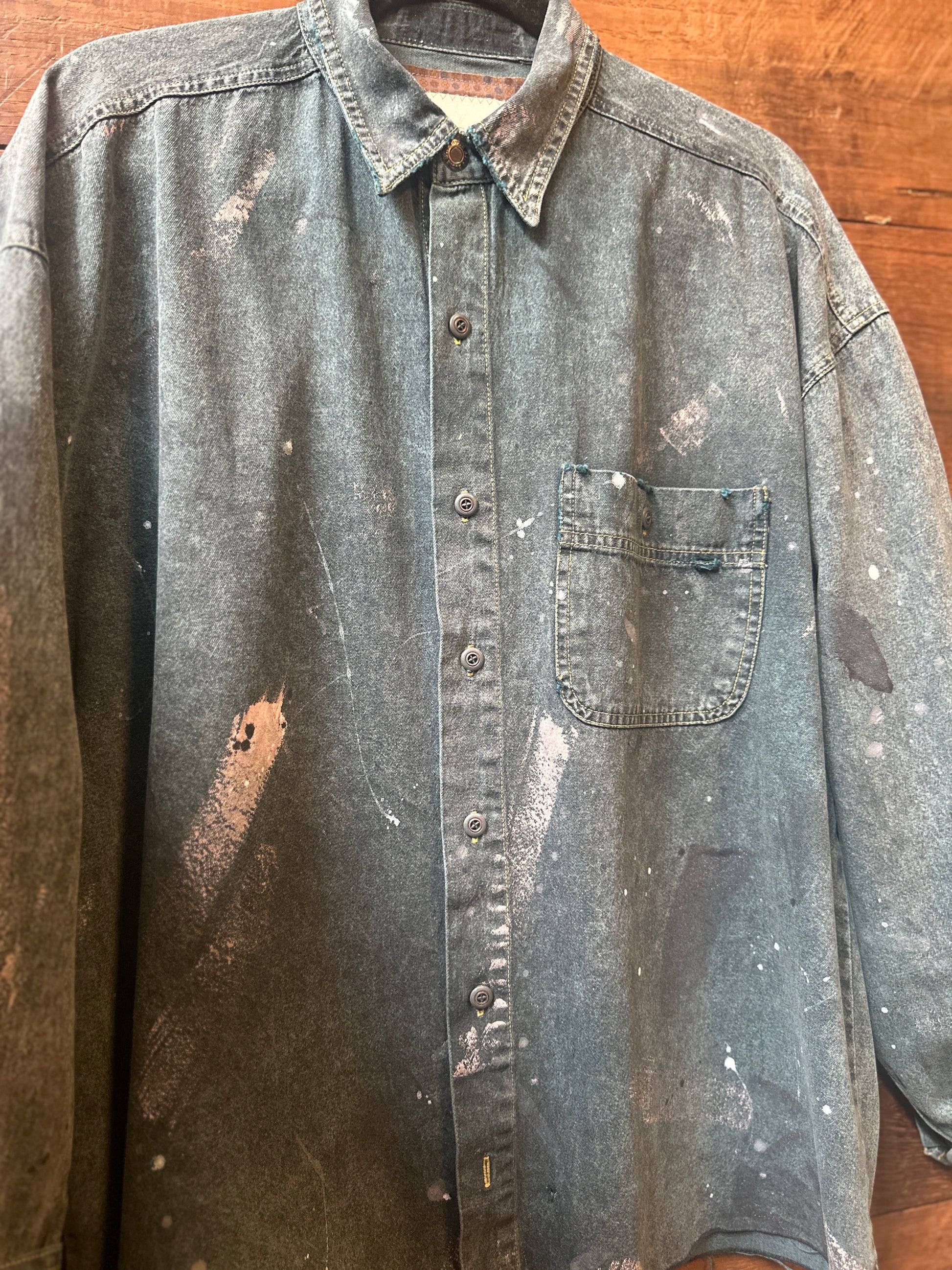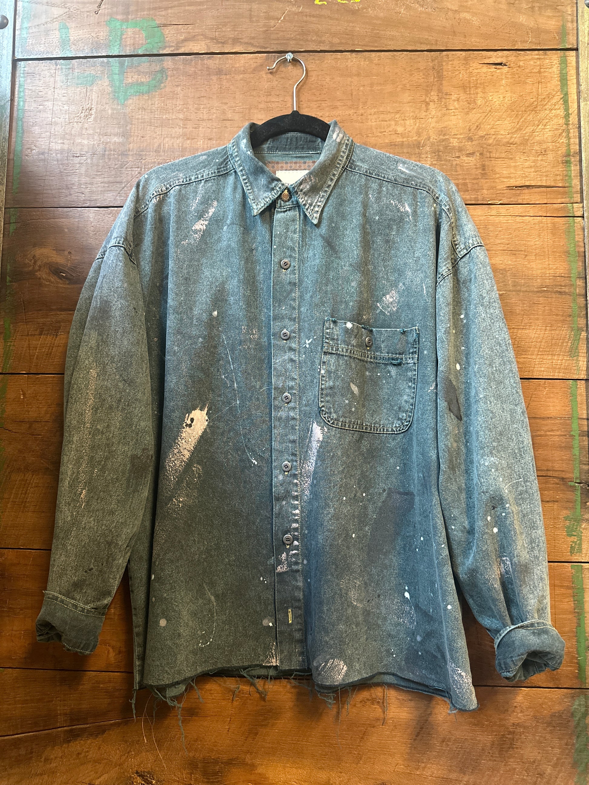 The Bugle Boy: a playful twist on the classic denim shirt. This upcycled vintage piece boasts an oversized fit and eye-catching paint splatters throughout. Get a unique and slightly distressed look while helping the environment. (And yes, it's as cool as it sounds.)