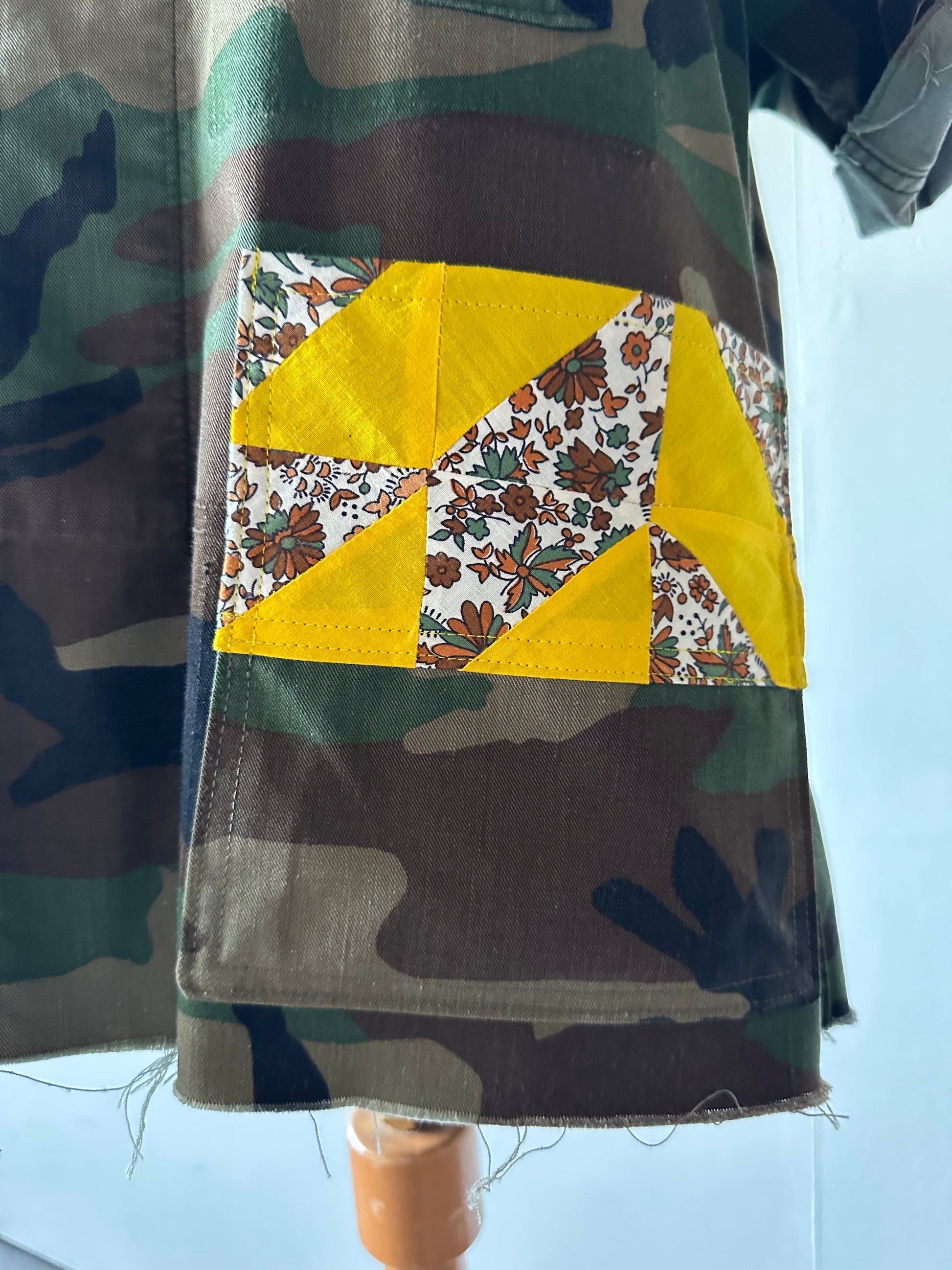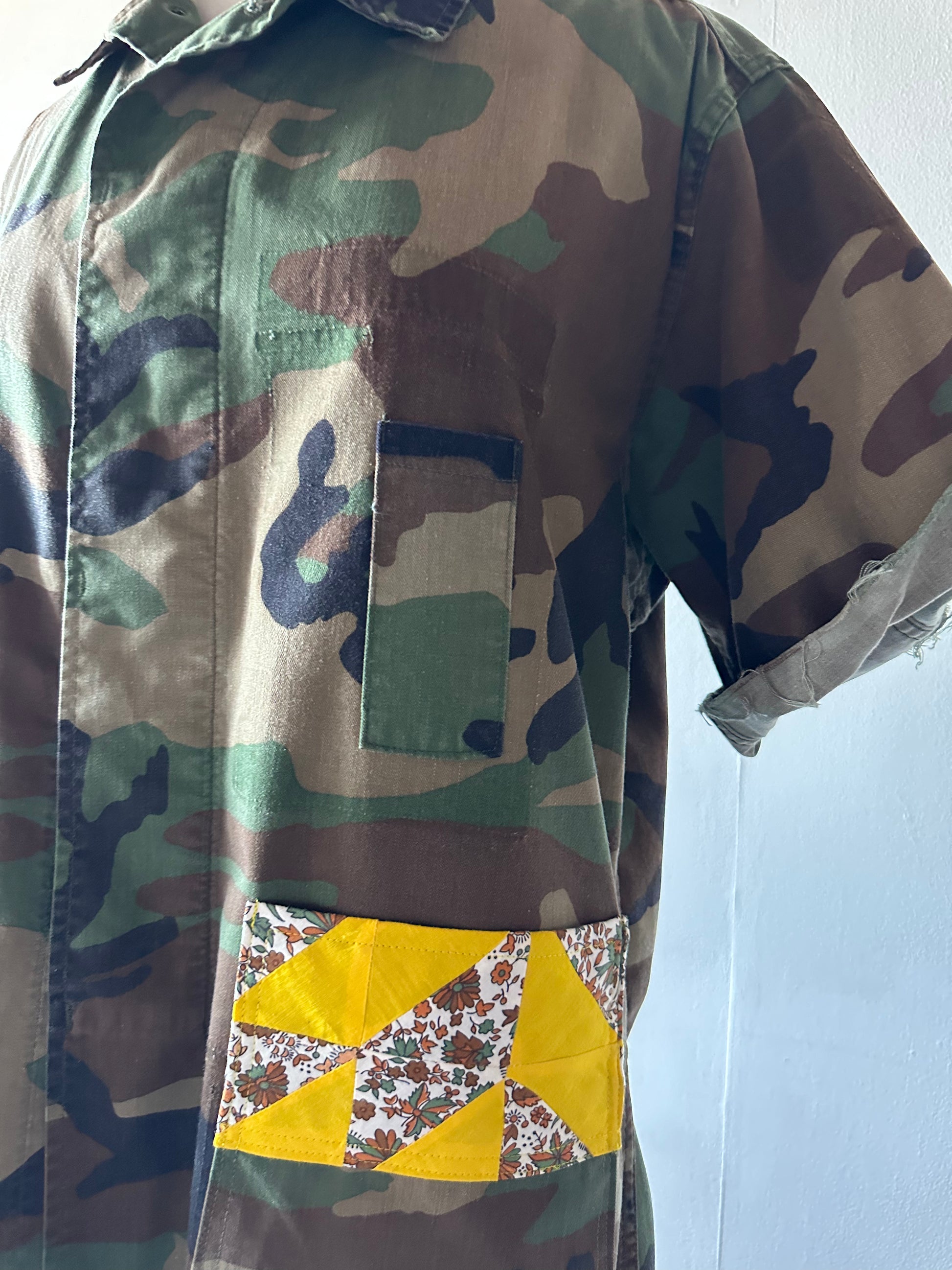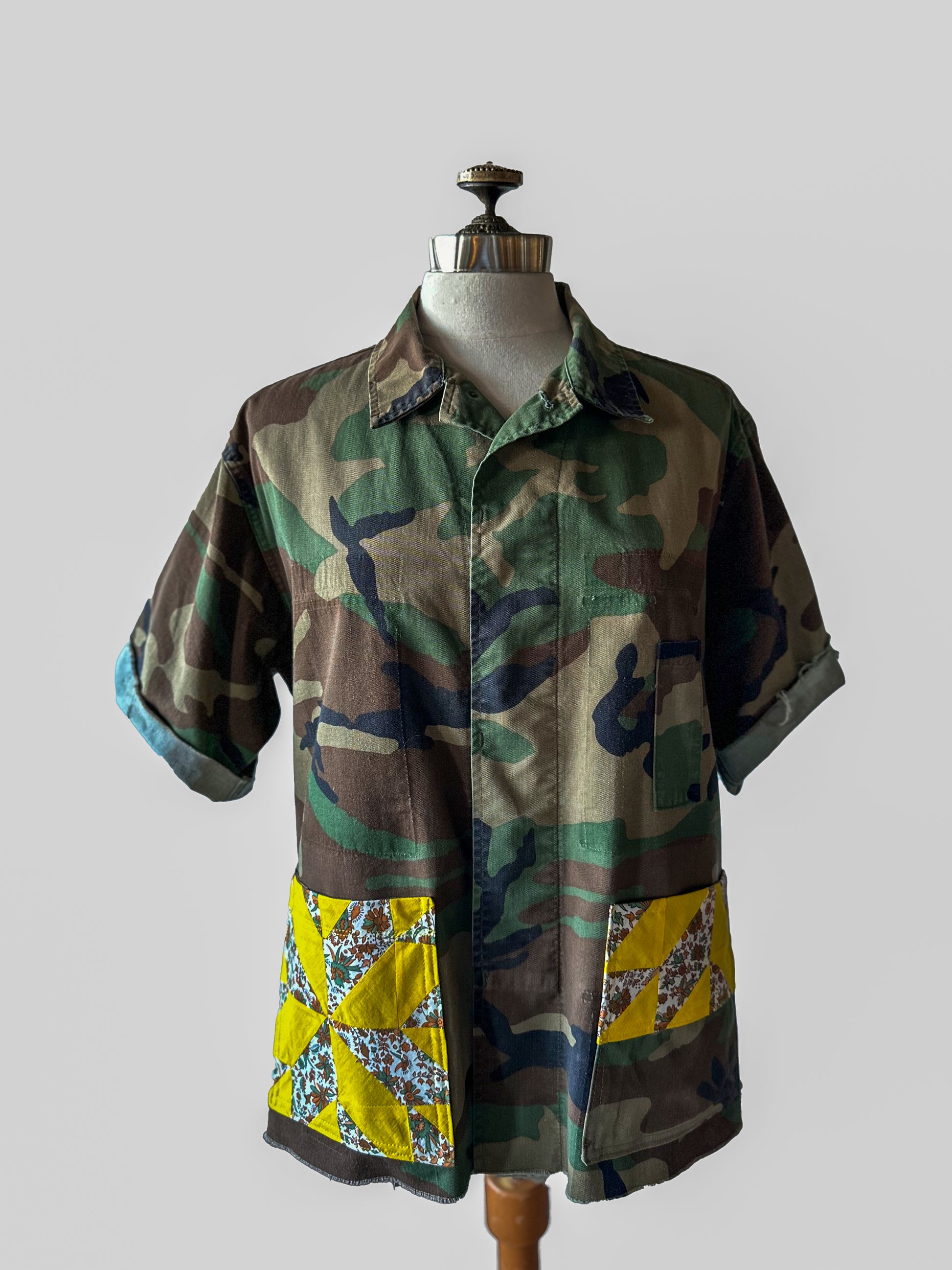 Turn heads with The Calico, a playful and quirky upcycled camo jacket featuring short sleeves and unique quilt patch pockets. Raw edges at hemline and sleeves in a relaxed fit - perfect for spring and summer!