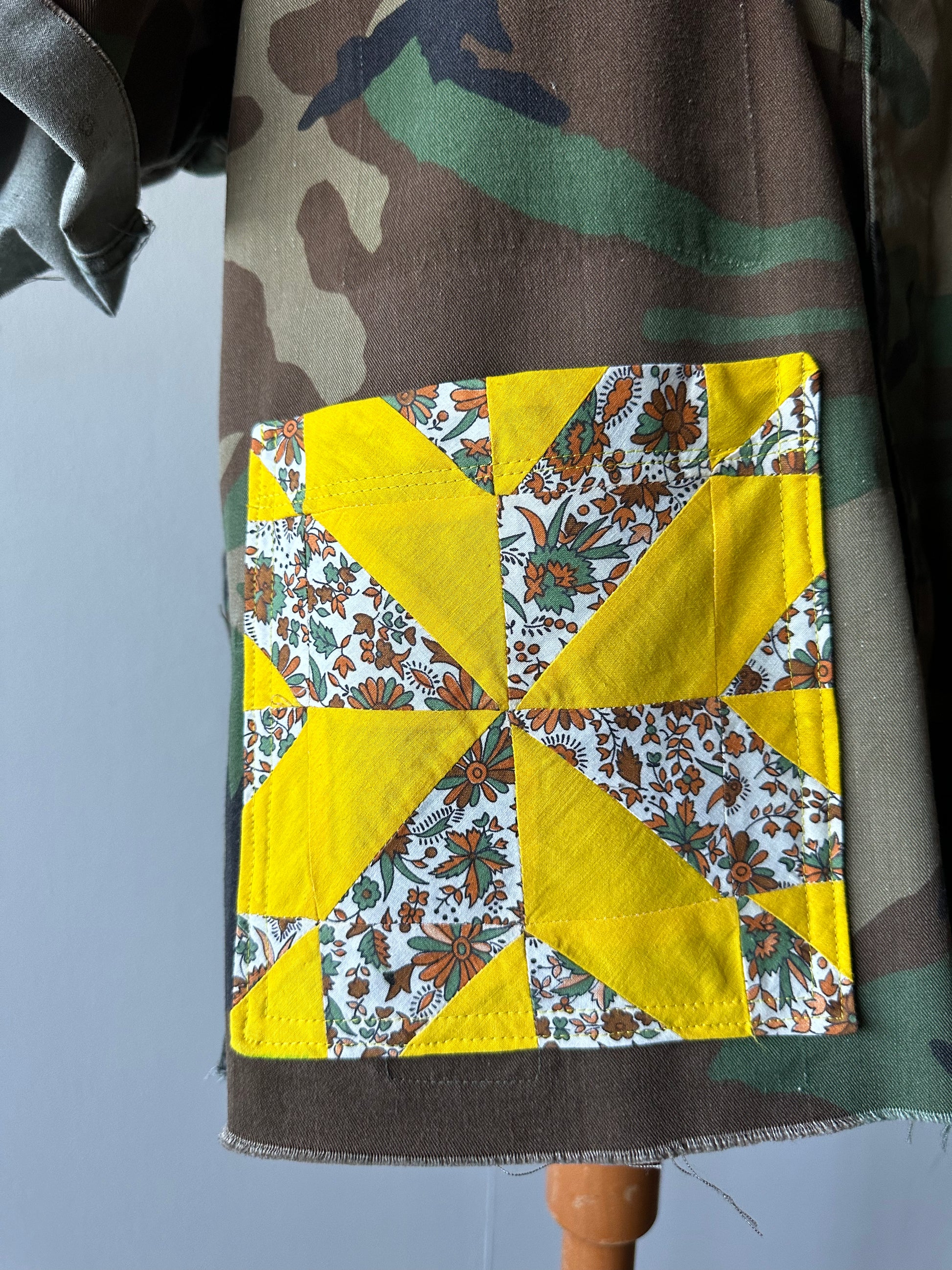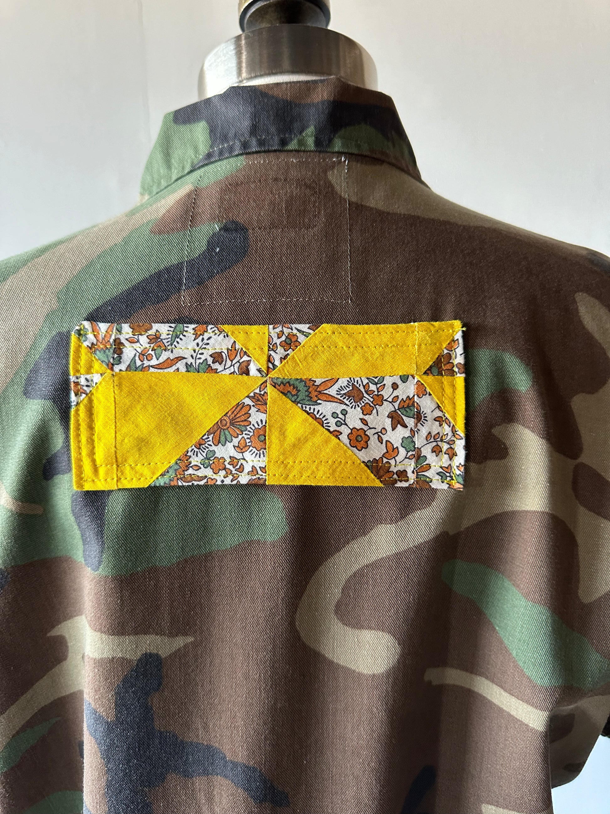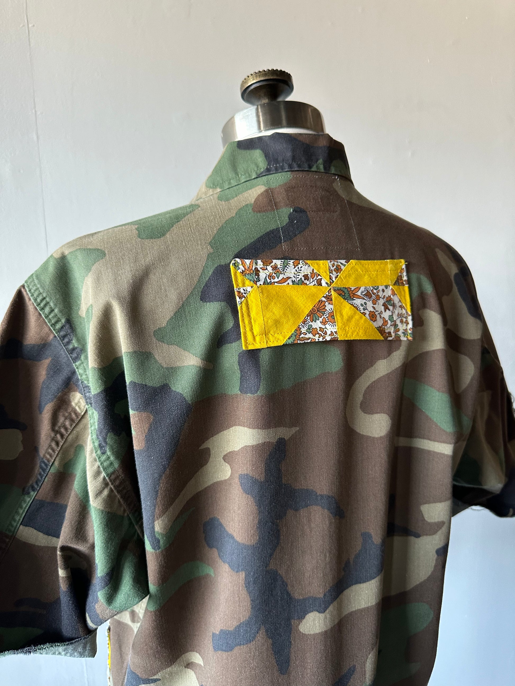 Turn heads with The Calico, a playful and quirky upcycled camo jacket featuring short sleeves and unique quilt patch pockets. Raw edges at hemline and sleeves in a relaxed fit - perfect for spring and summer!