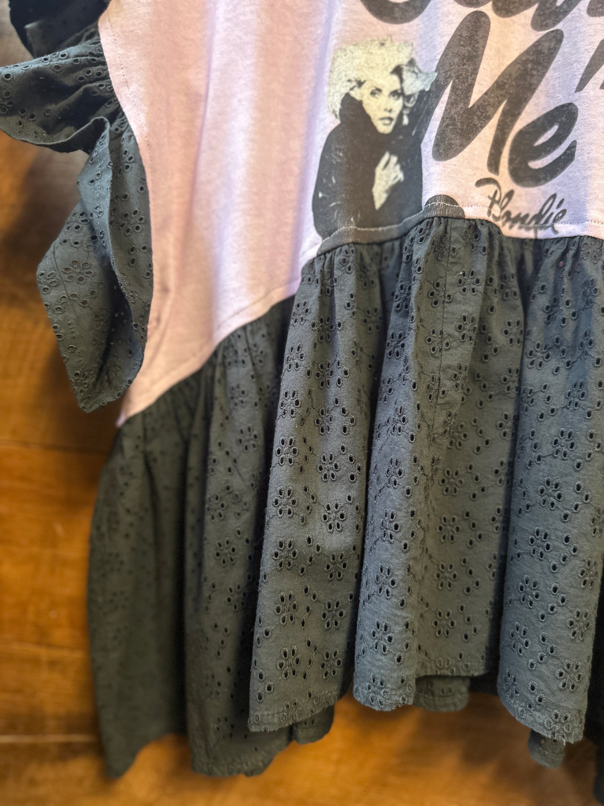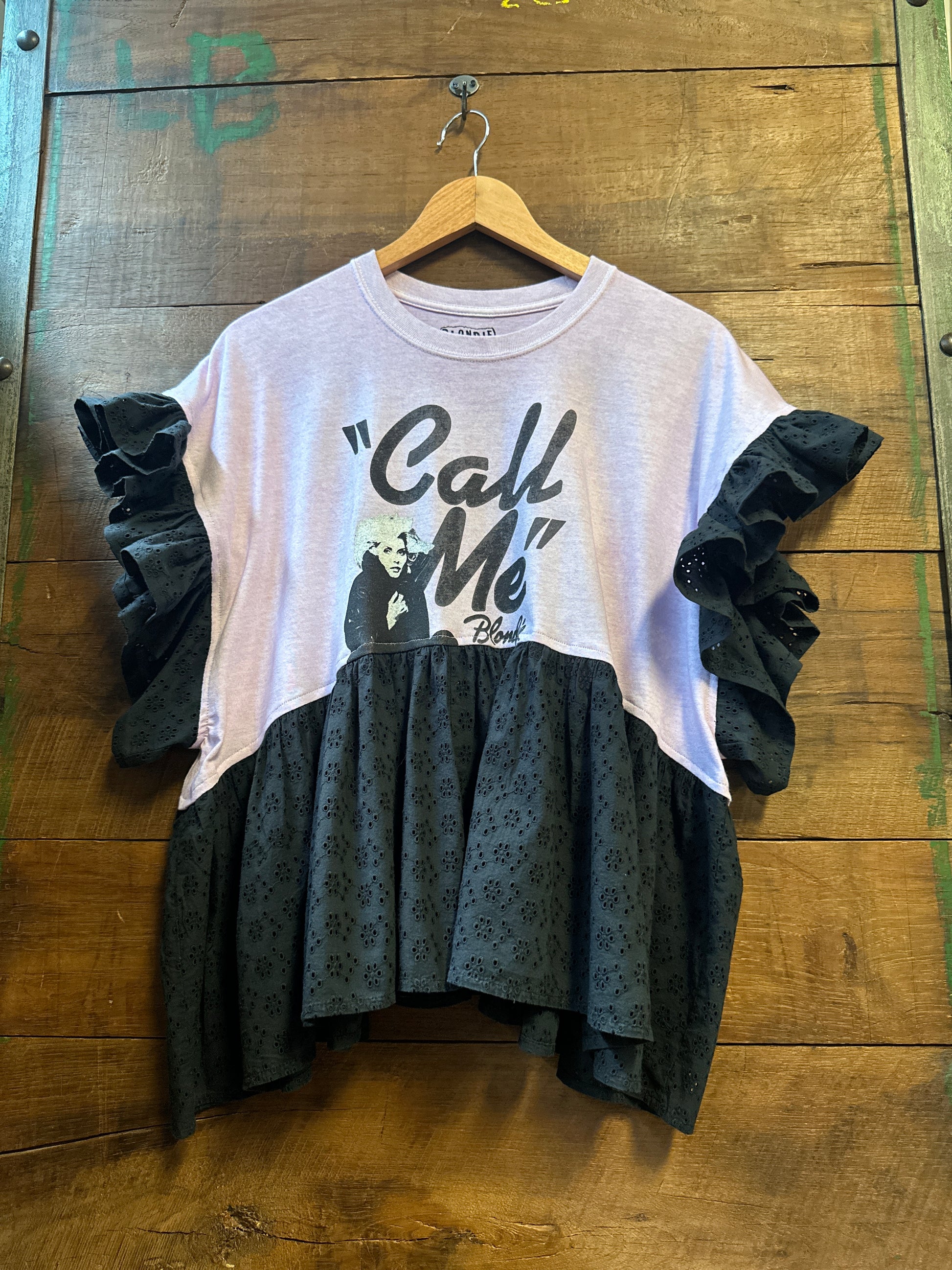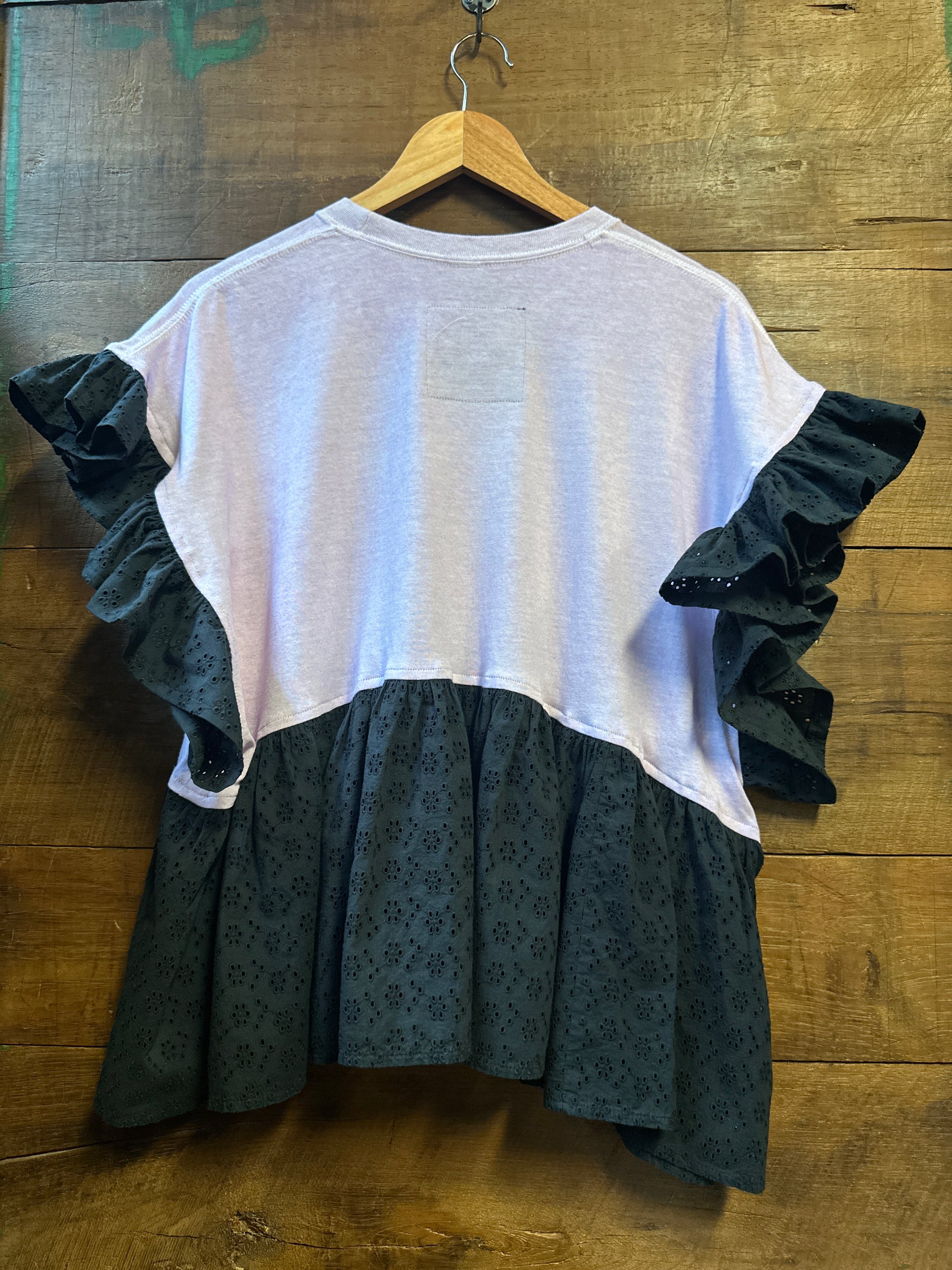 Embrace effortless style with "The Call Me" upcycled tee, featuring an oversized fit for ultimate comfort. Playful eyelet gathers shape the peplum skirt and sleeves, adding a flirty, feminine touch. Crafted from lightweight fabric, this tee keeps you cool and breezy all day long. Perfect for those who love unique, eco-friendly fashion with a fun twist!