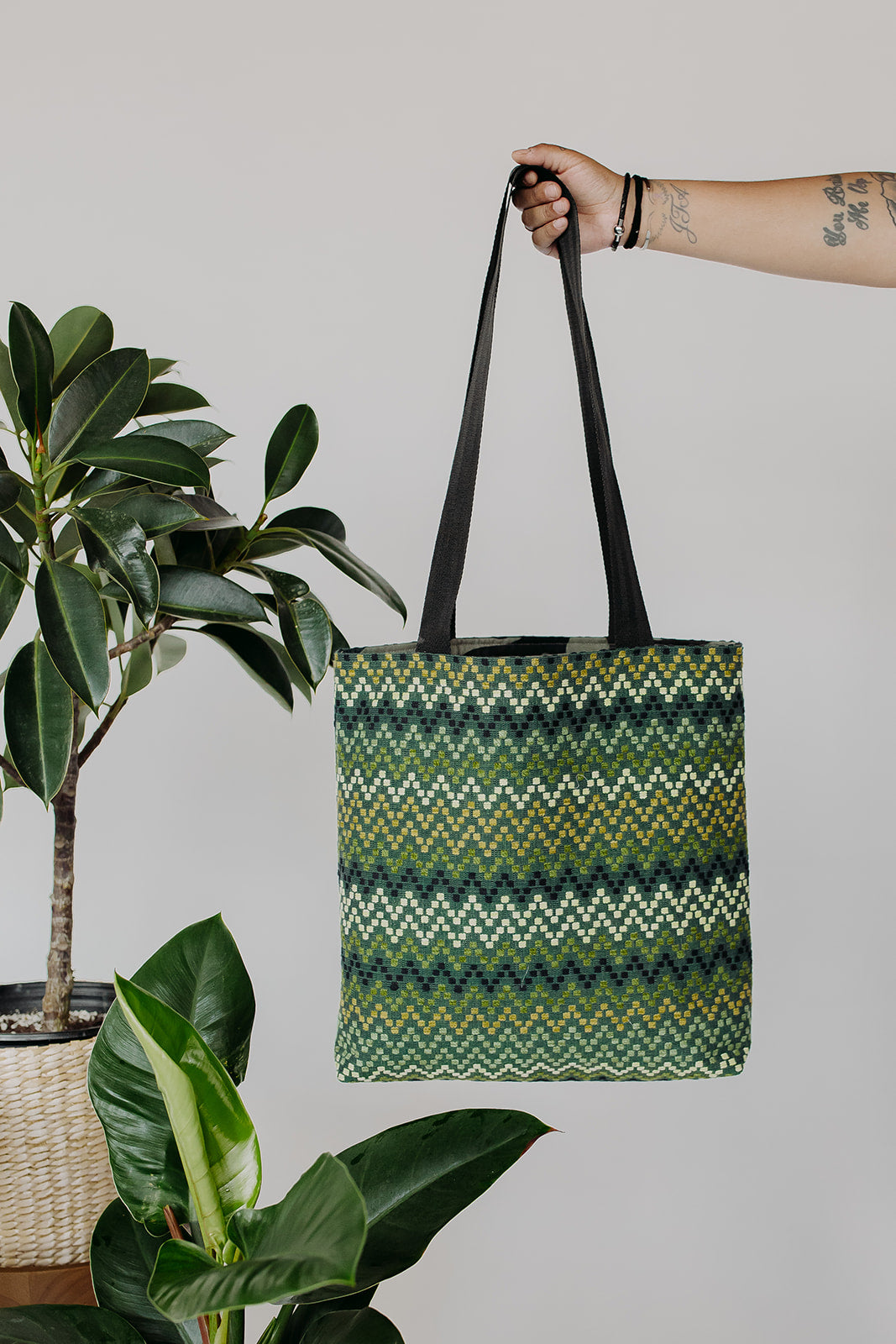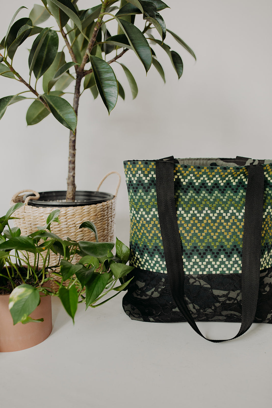 Fully lined tote bag constructed from a vintage fabric in a green/white/black check. Lace detail ads a nice contrast along with an interior pocket that will hold any size phone along with a side for a charger or other accessories. 2” wide black strap.