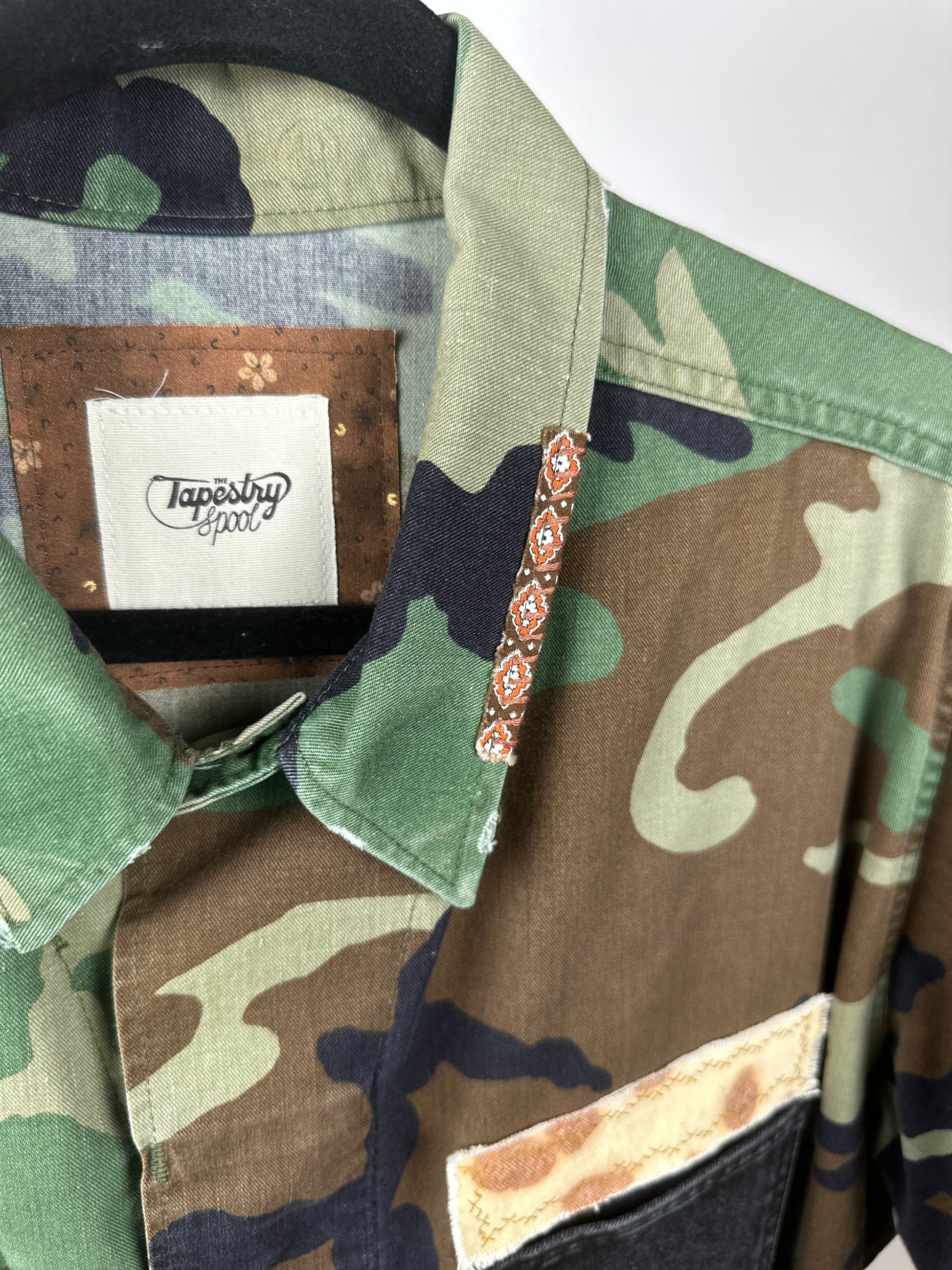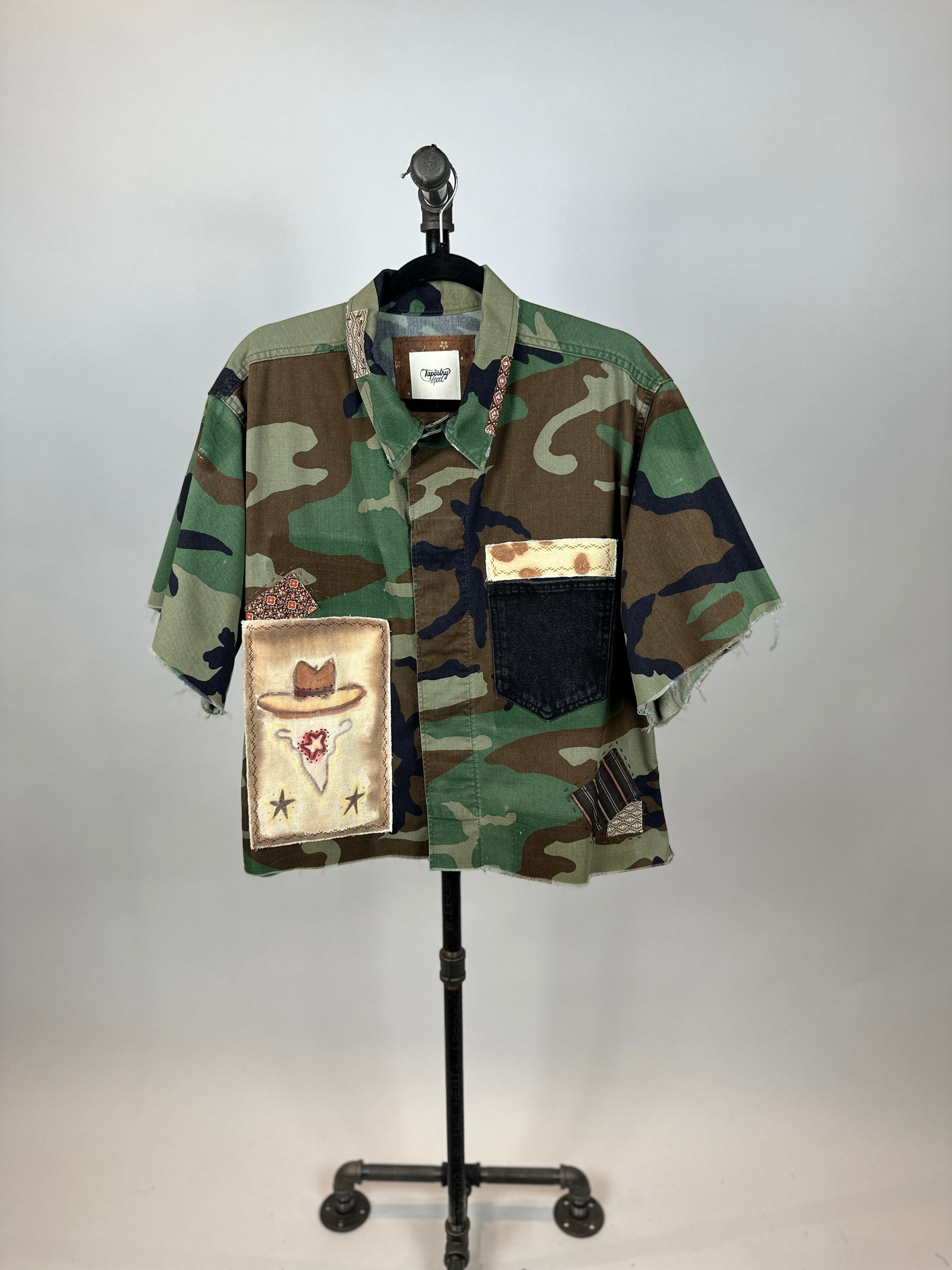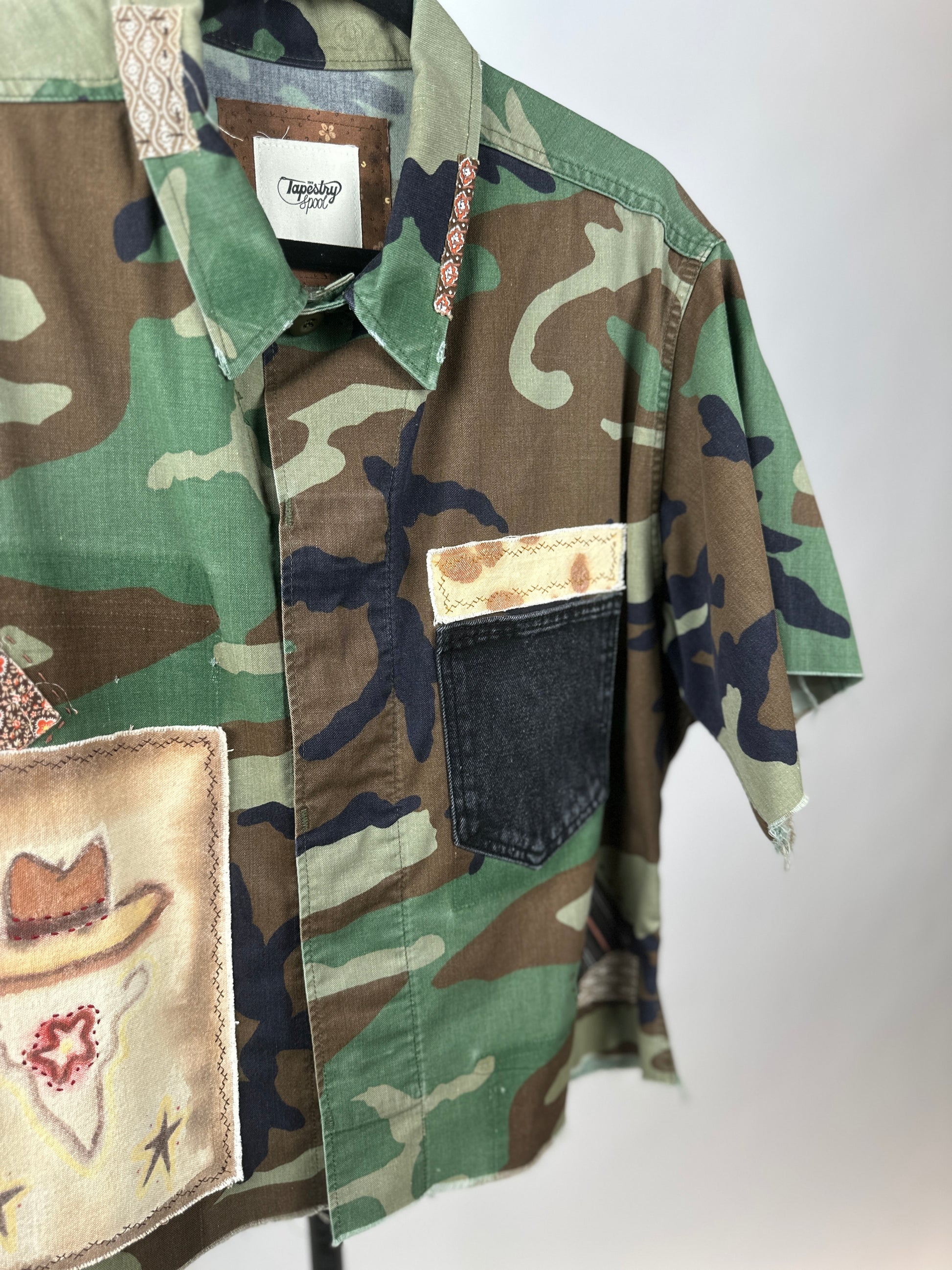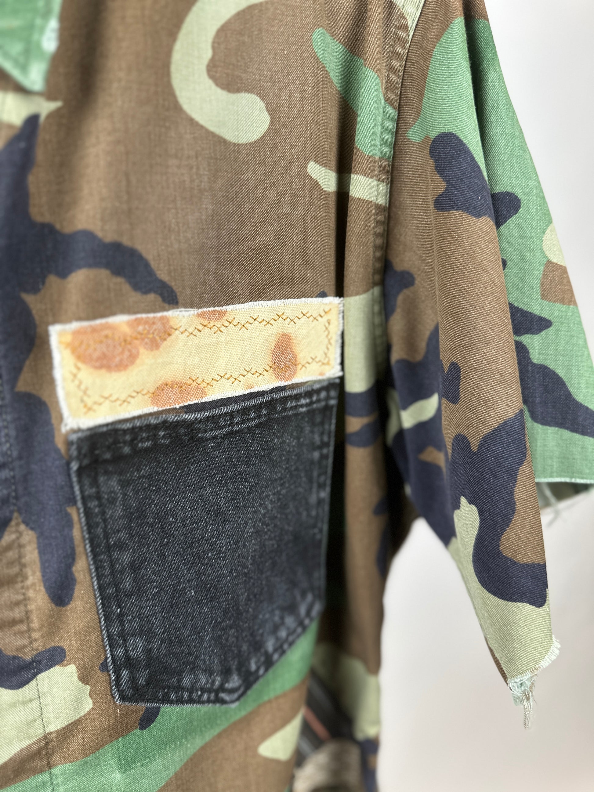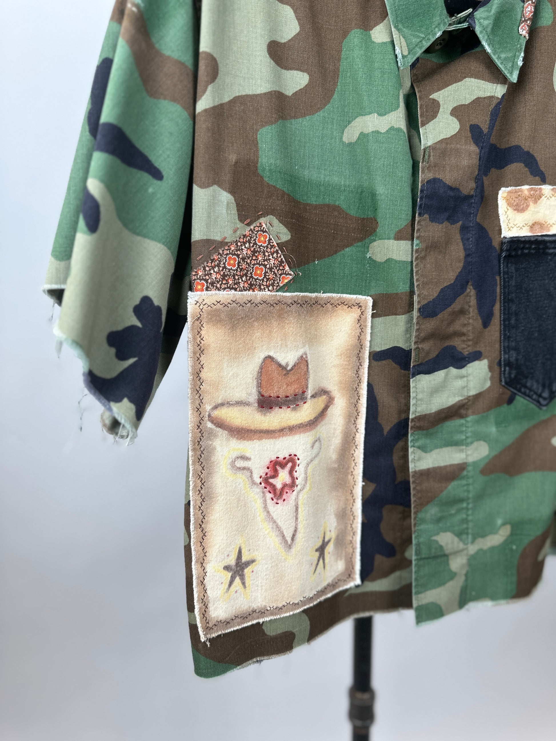 Get ready to stand out in The Cisco! This upcycled vintage camo jacket is one of a kind with handpainted appliques and unique embroidery. Its raw hemline adds a touch of edginess while the short sleeves keep you cool. Unique and playful, this jacket is perfect for those who don't take themselves too seriously!