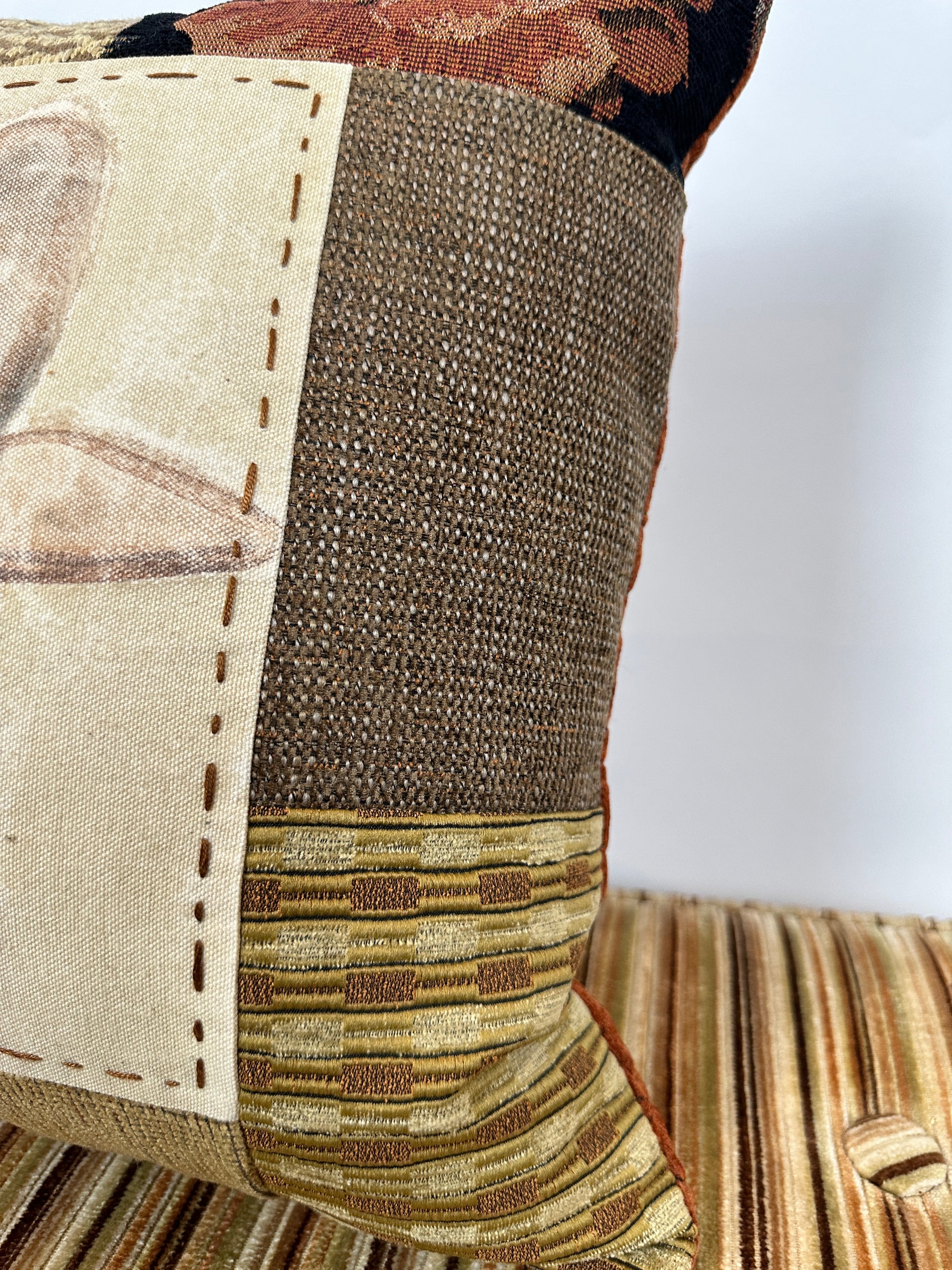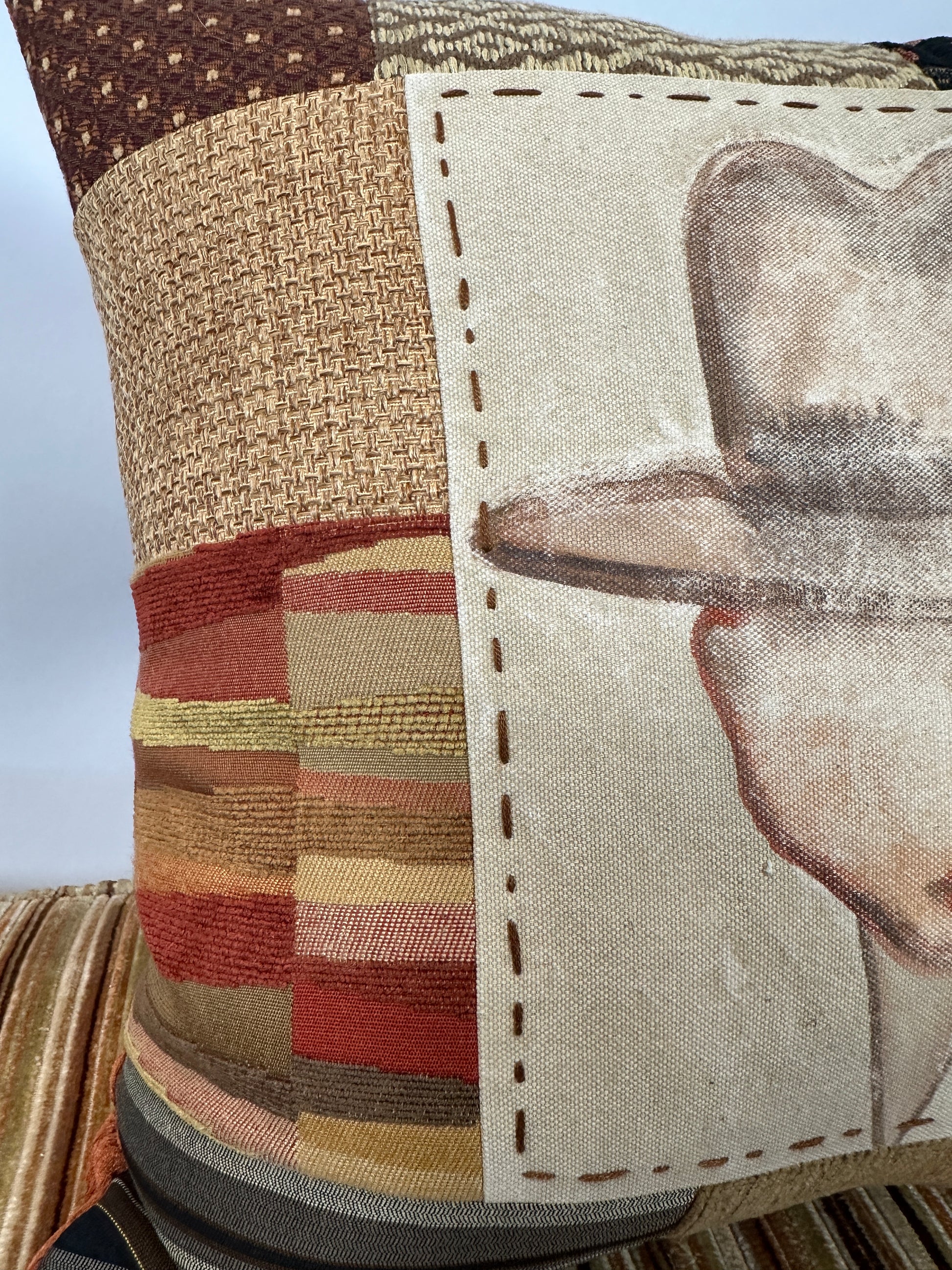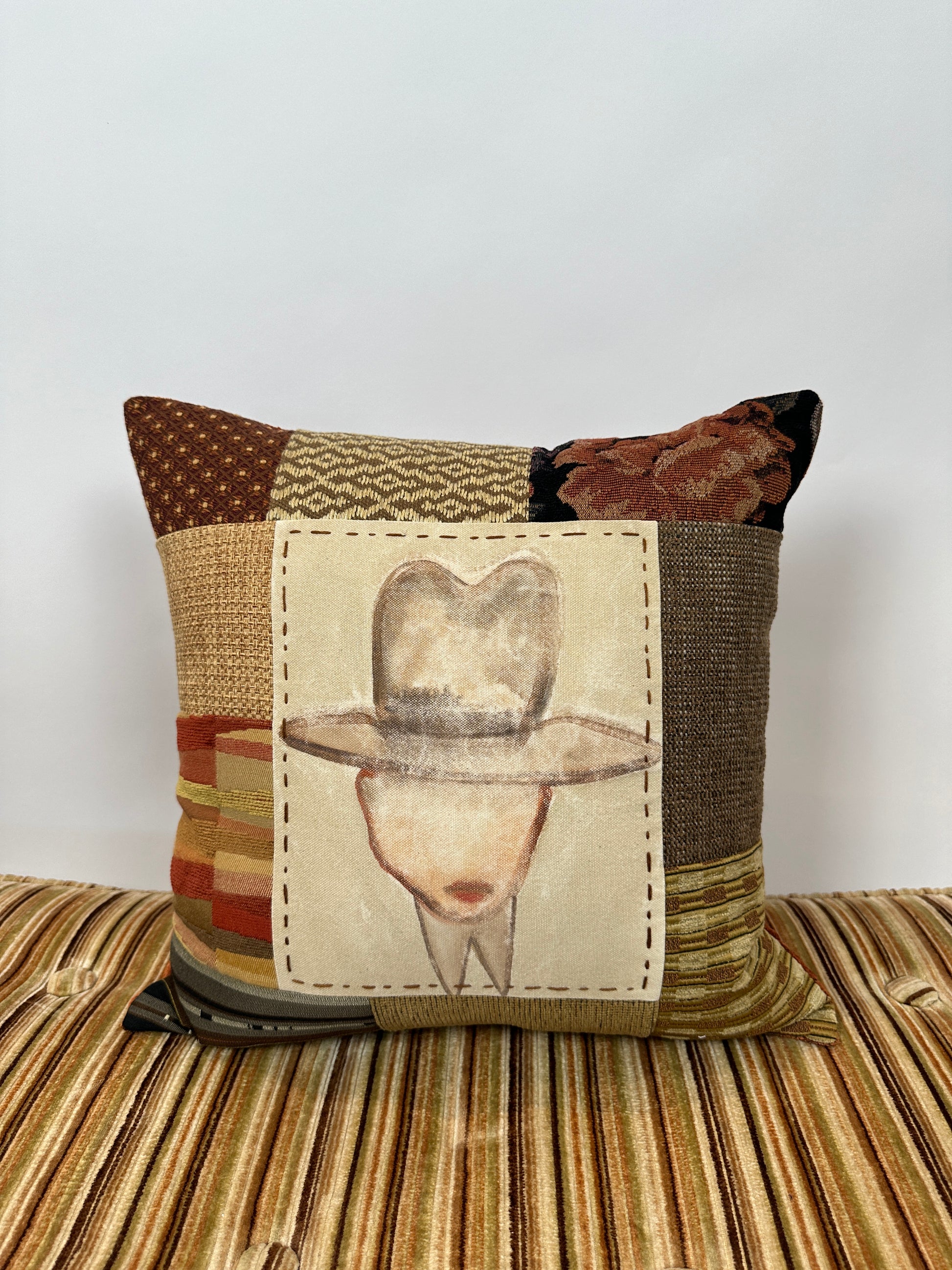 Cowboy up your couch with The Cowboy, a one-of-a-kind 18" pillow featuring a hand painted cowboy and upcycled fabric patchwork. With intricate embroidery, this unique throw pillow adds a touch of Wild West whimsy to any room. Saddle up and add some character to your home decor with The Cowboy!