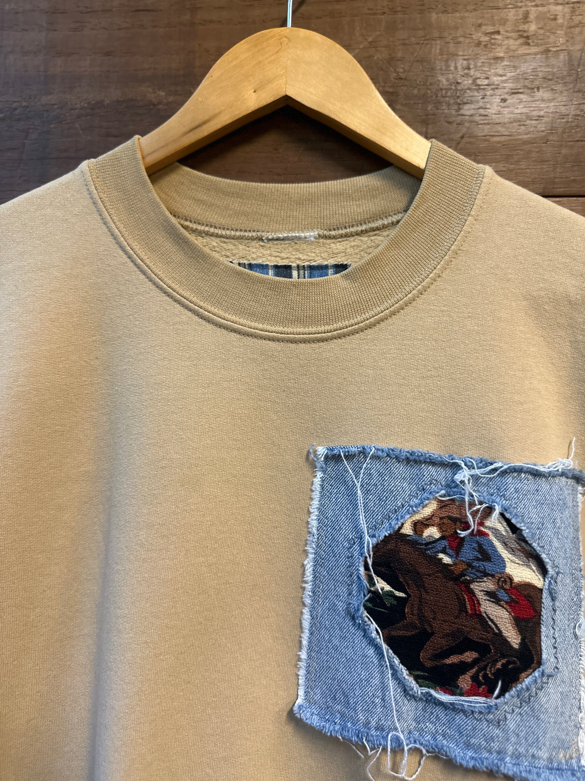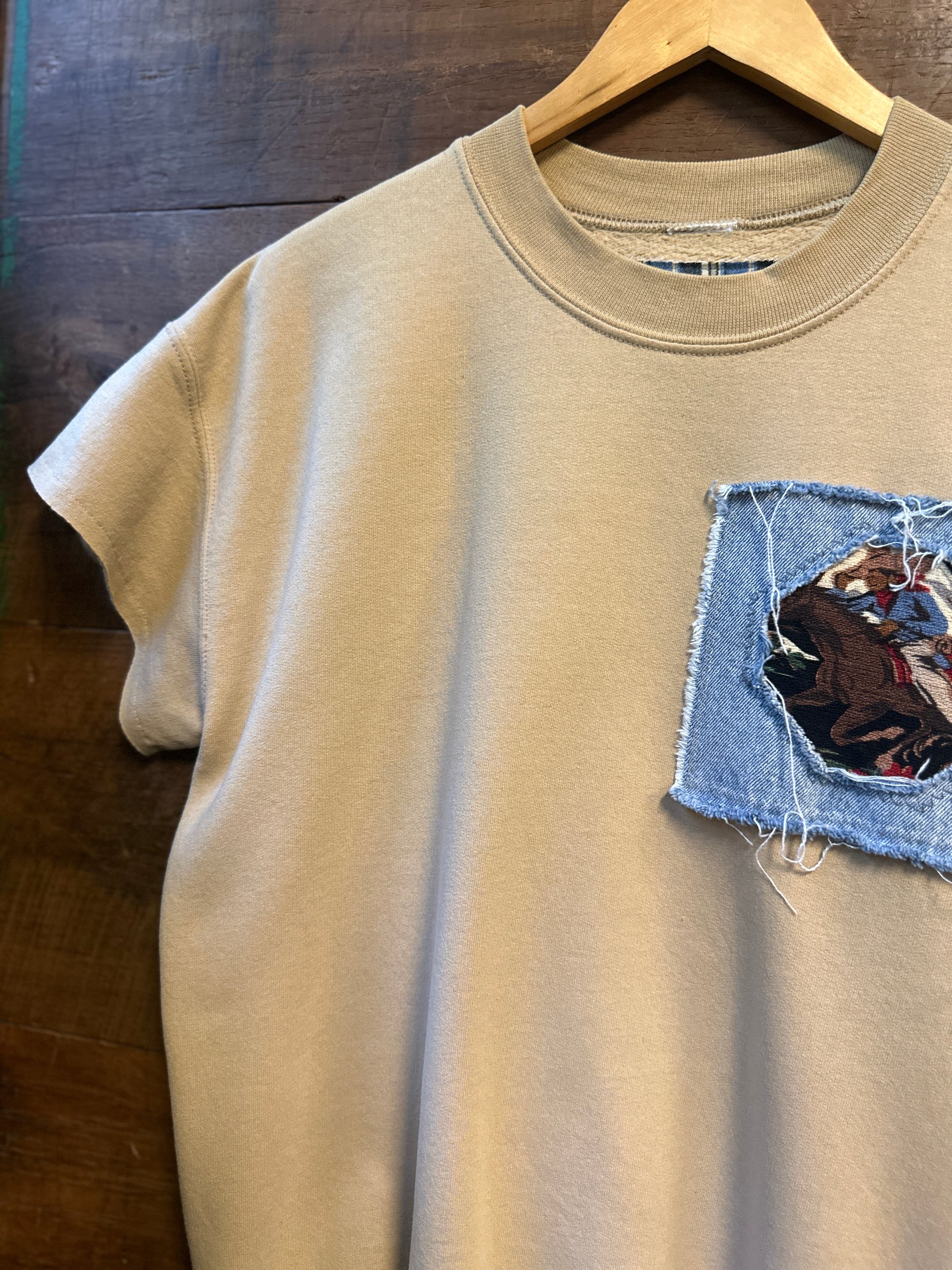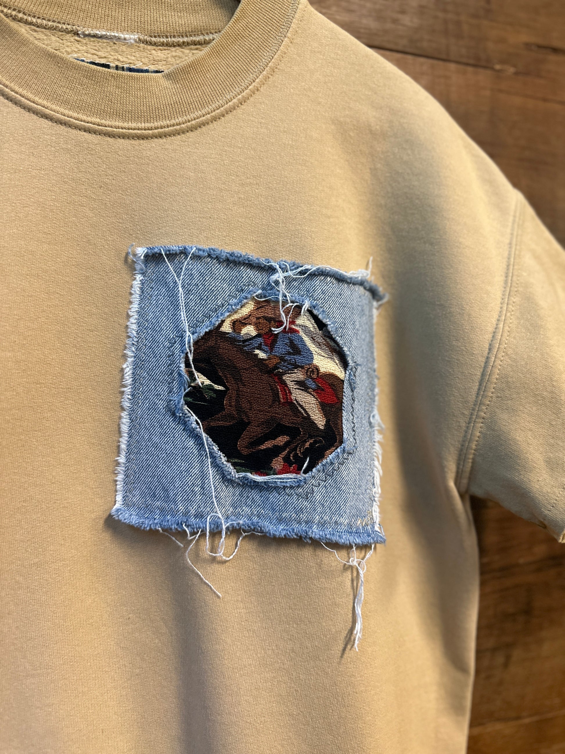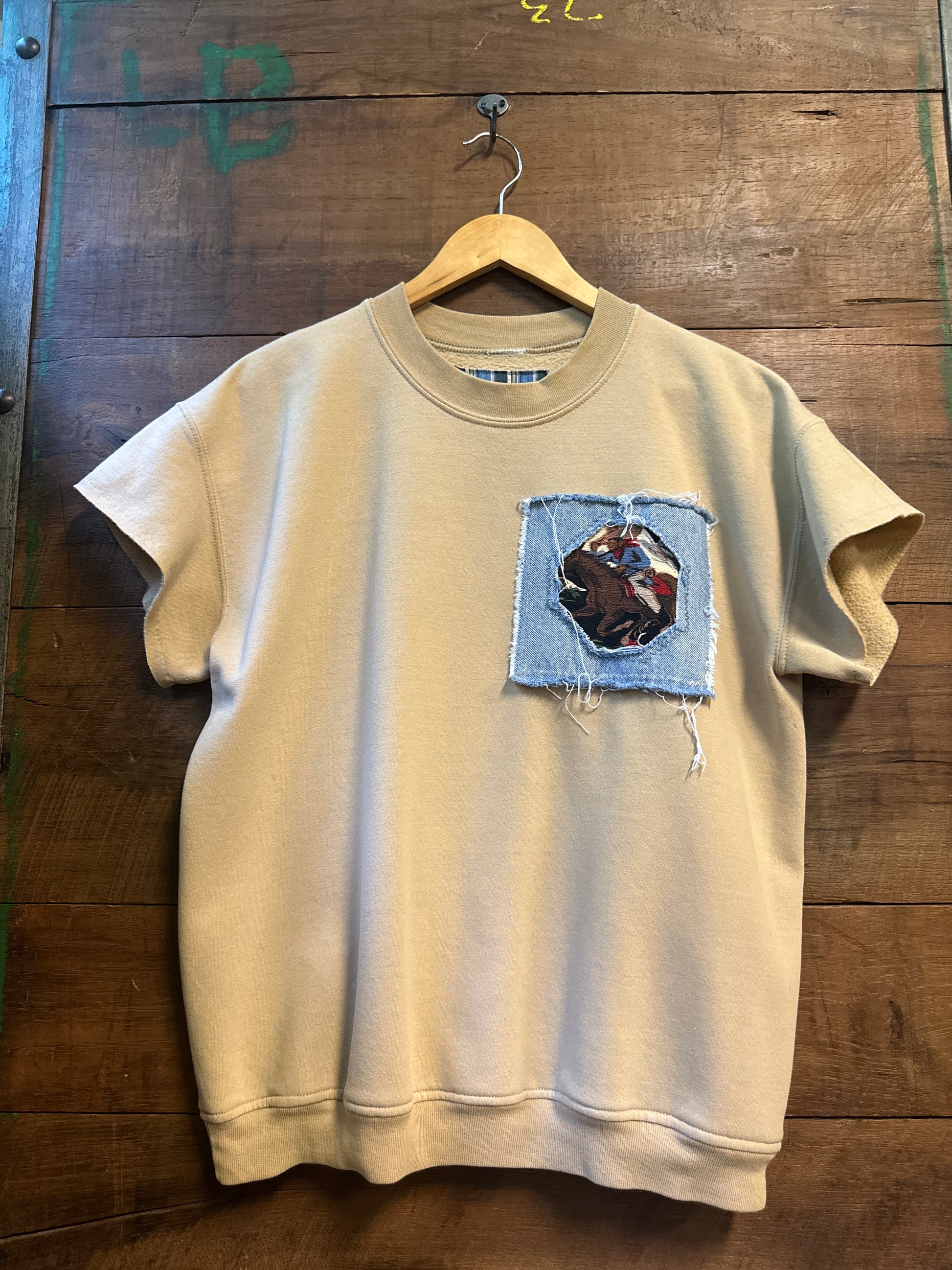 Embrace your wild side with The Cowboy, an upcycled crewneck sweatshirt featuring short sleeves for a breezy, laid-back vibe. The standout cowboy patch on the front adds a touch of rustic charm, making this unique piece perfect for those who love a playful twist on classic style. Comfortable, eco-friendly, and full of character—ride into casual cool with The Cowboy!