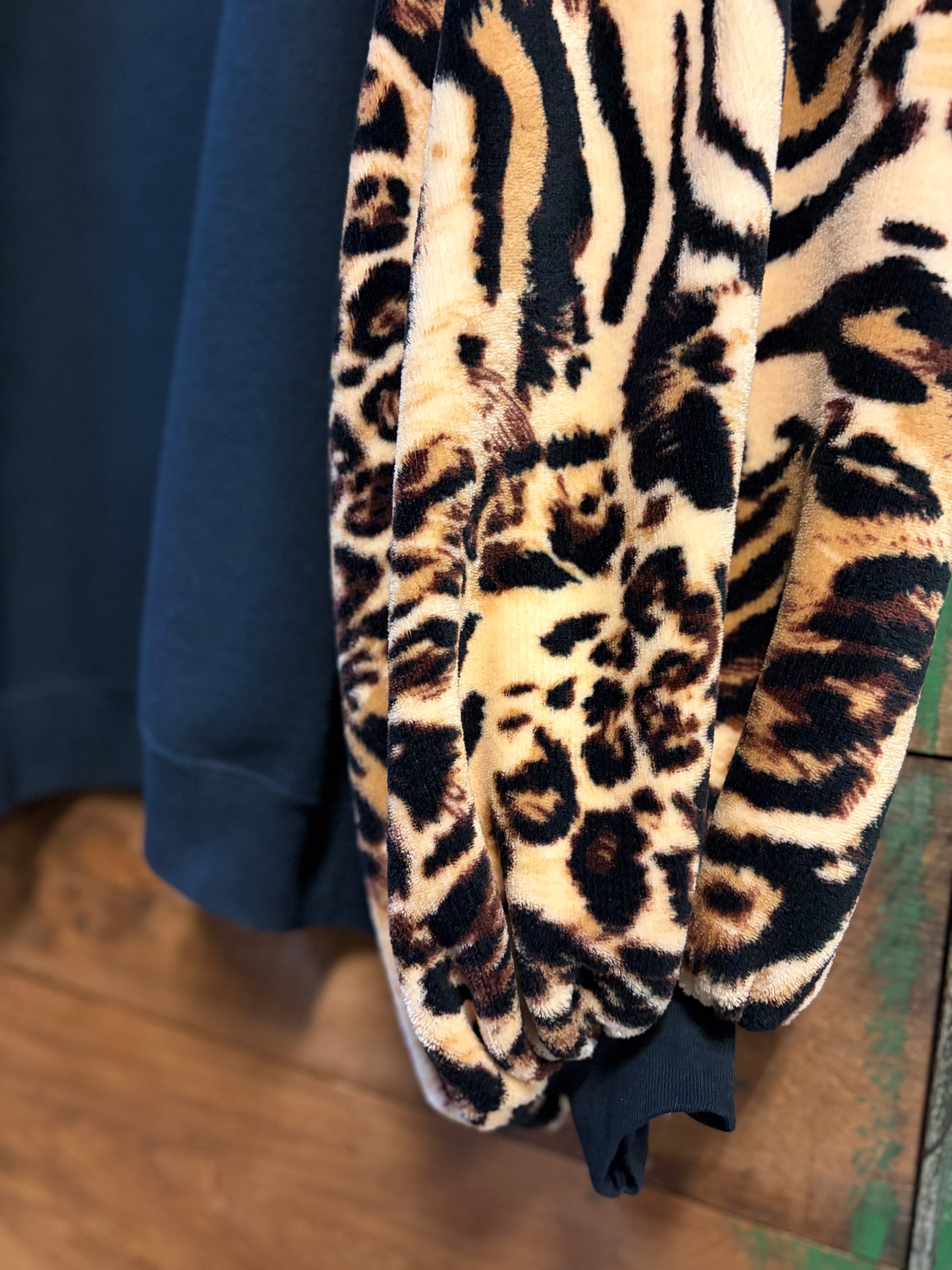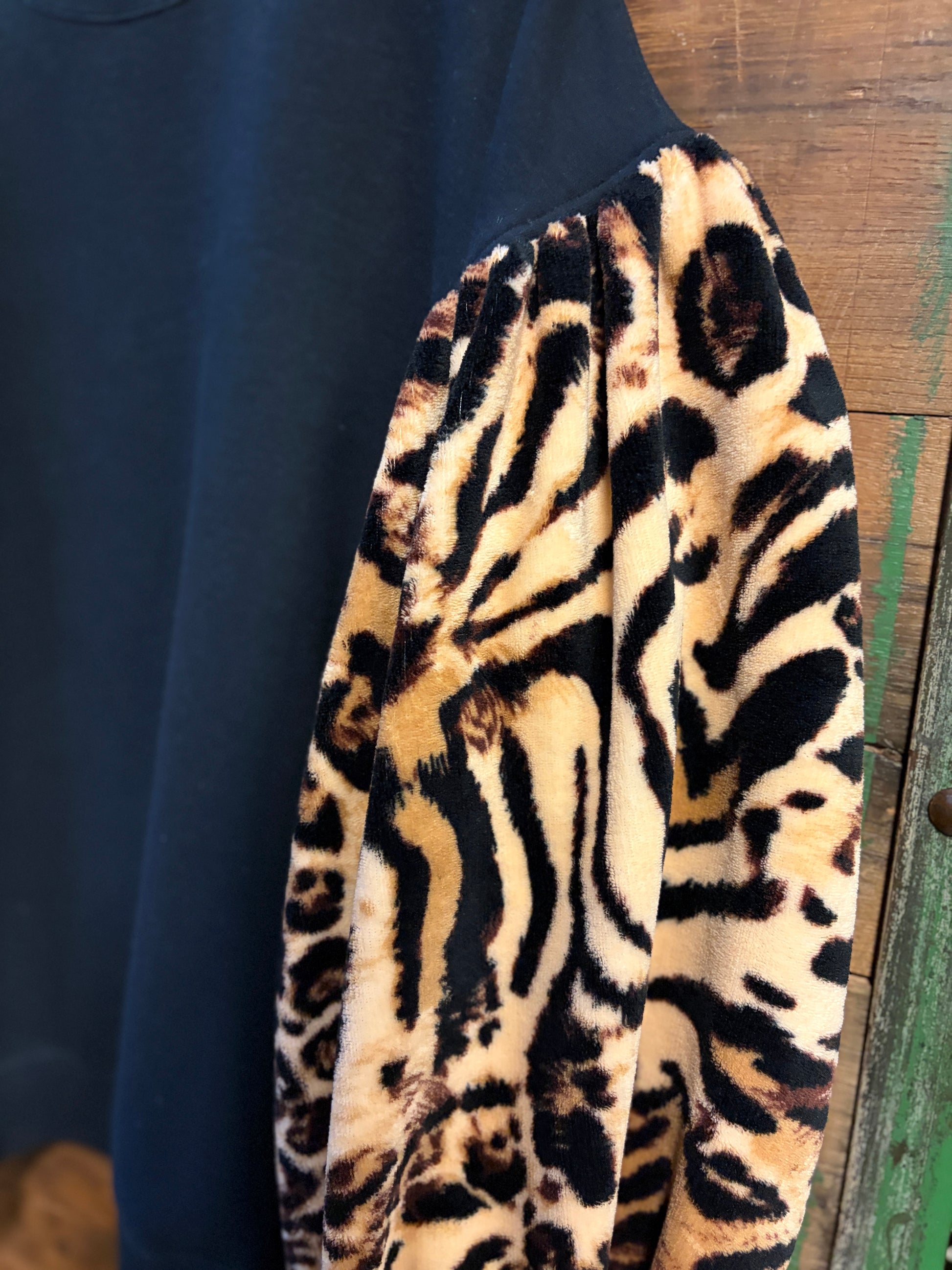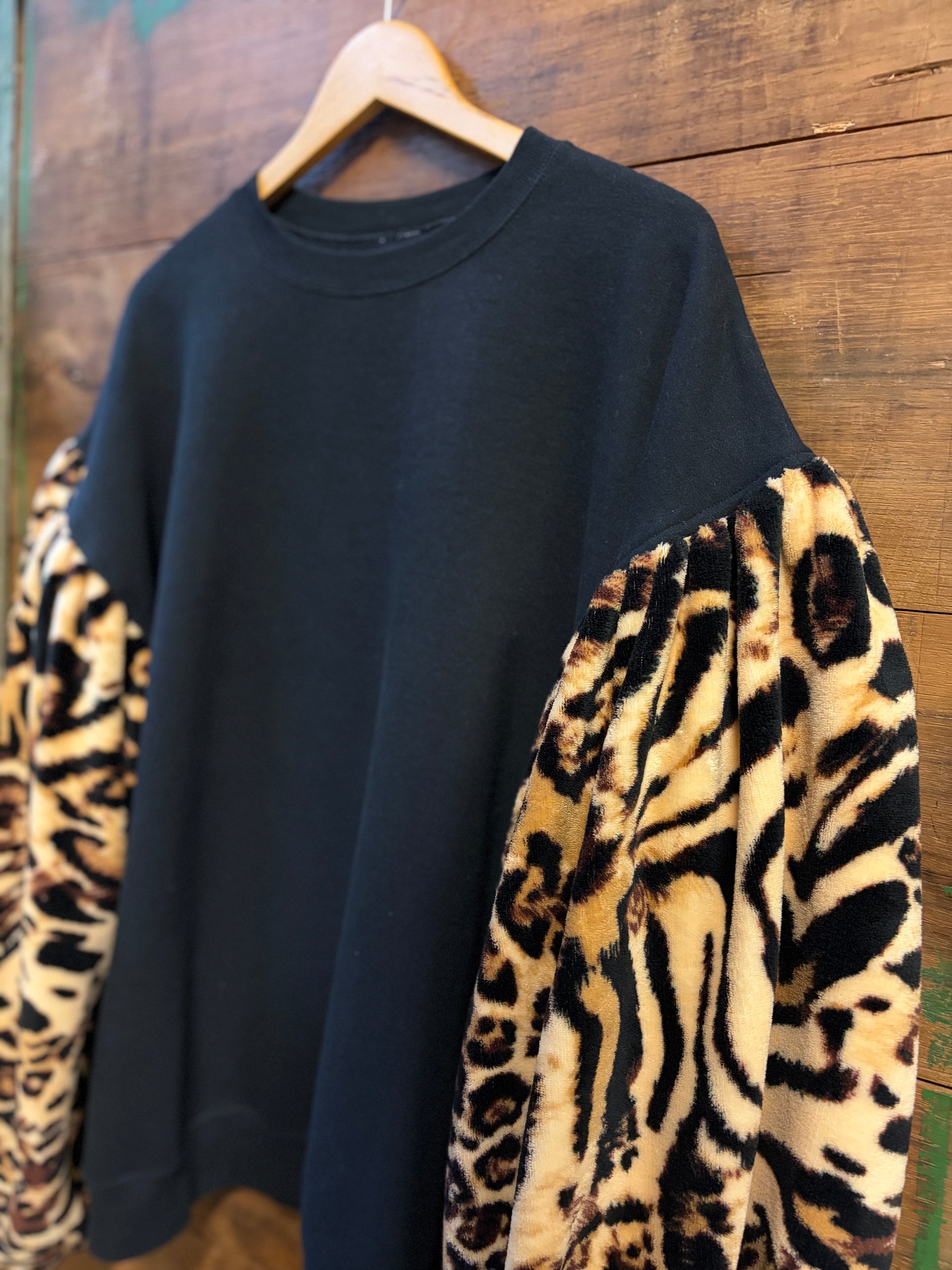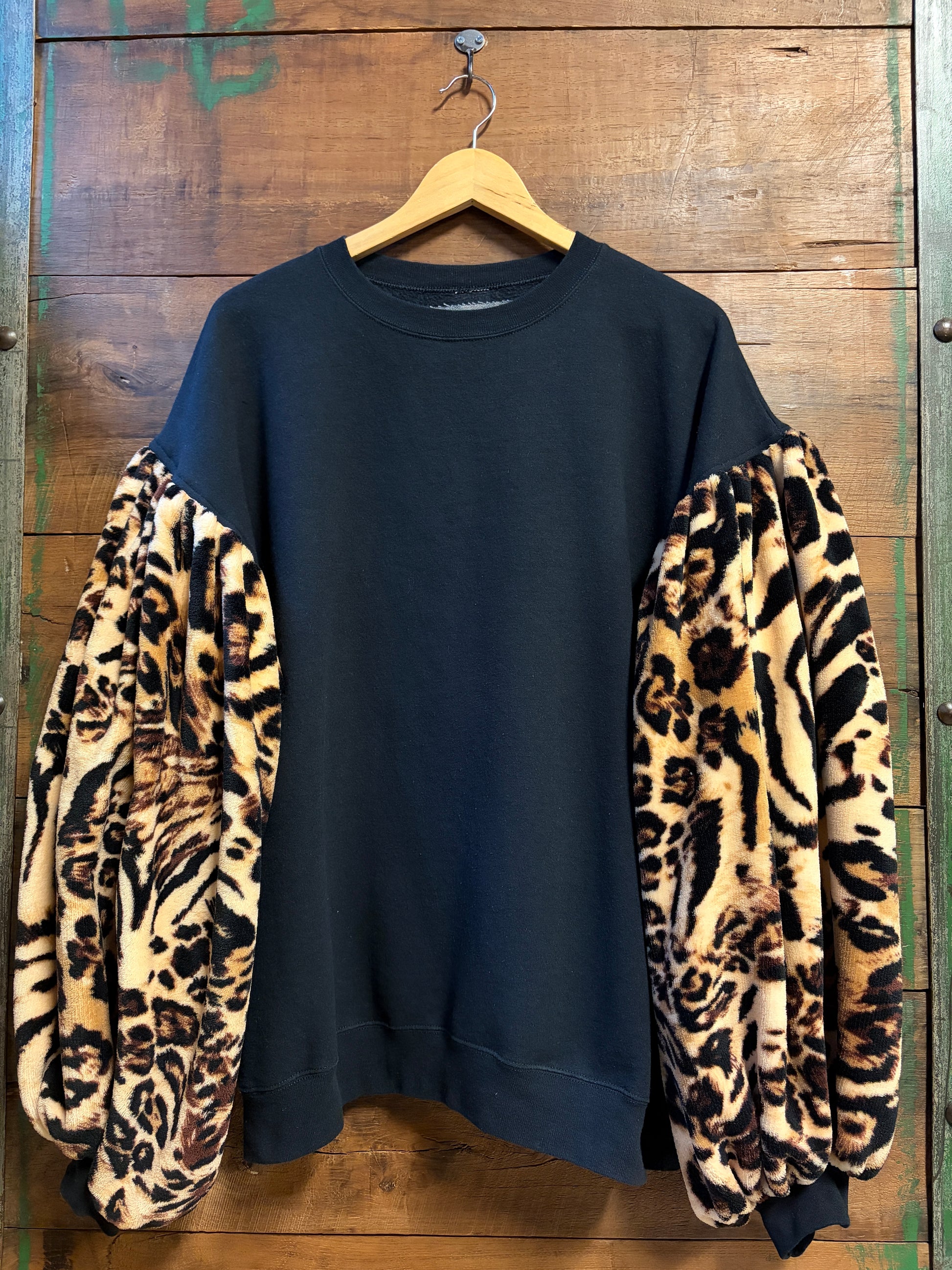 Meet your new favorite layering piece, a cozy black crewneck sweatshirt with a playful twist. Oversized and oh-so-comfortable, it features exaggerated balloon sleeves crafted from a contrasting ultra-soft animal print that adds instant personality. Upcycled with care, this sweatshirt blends comfort with creative style, perfect for anyone who loves a little unexpected flair in their everyday wardrobe.