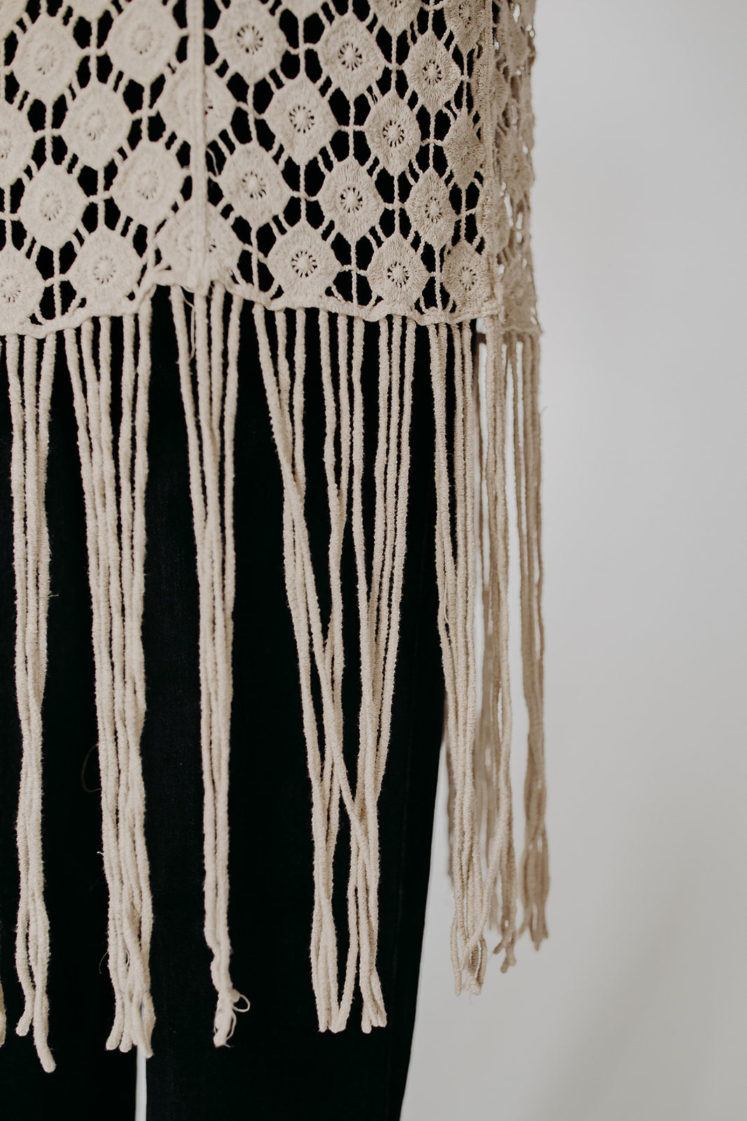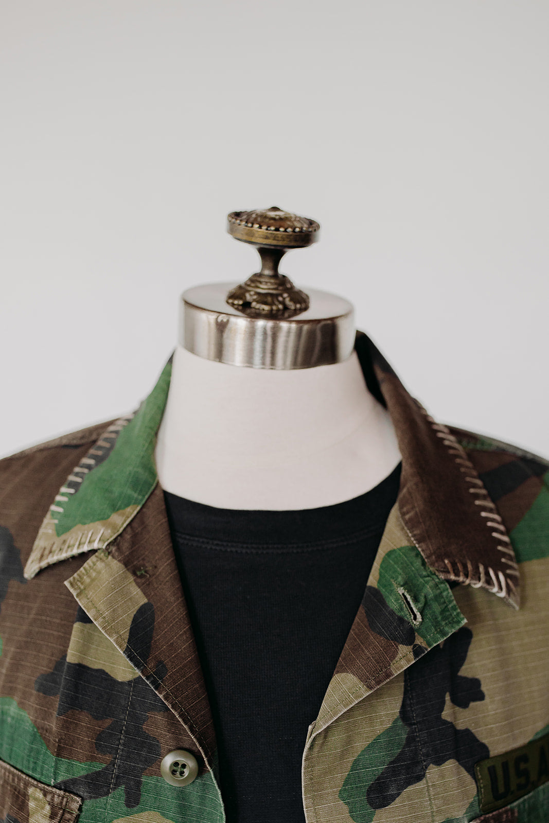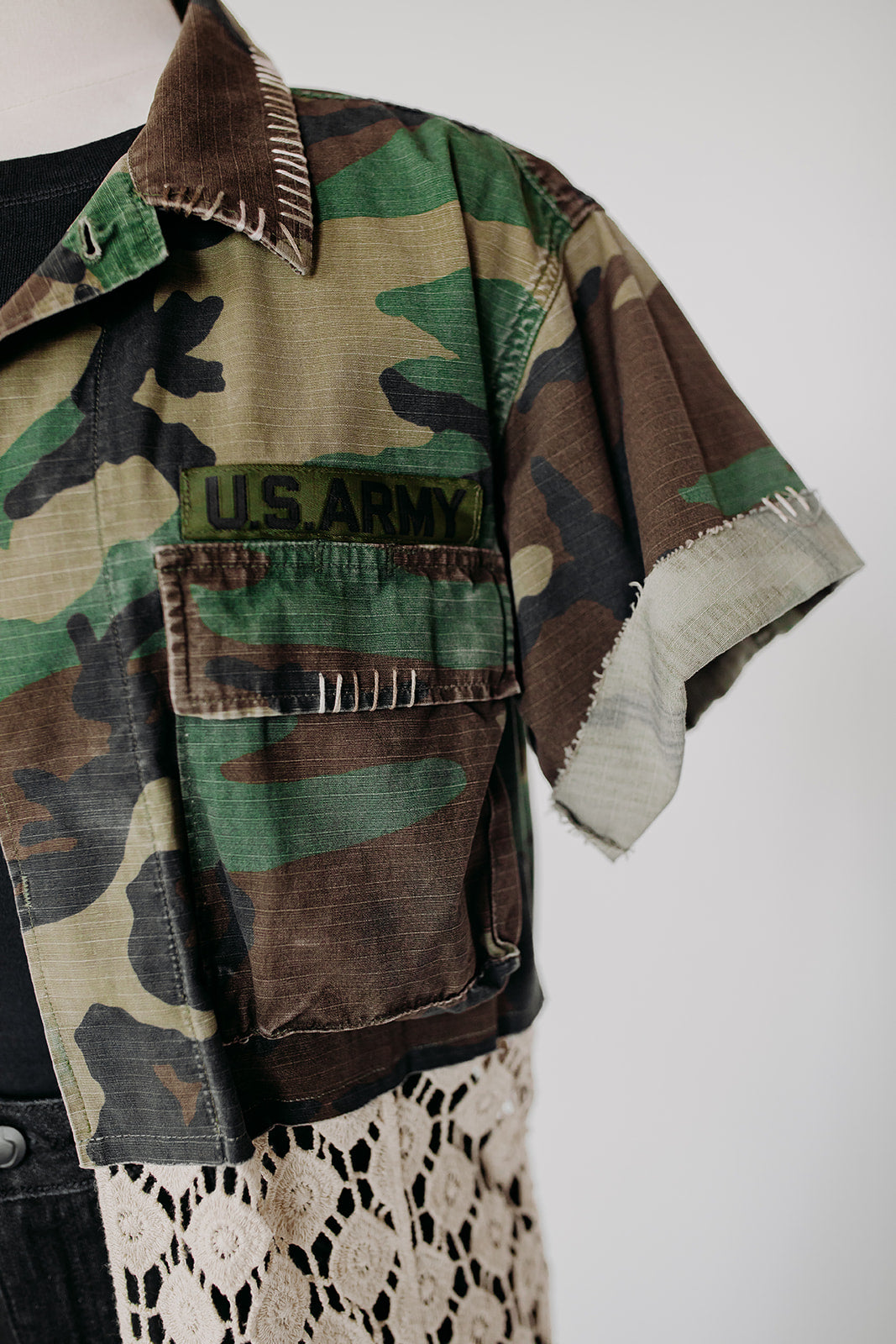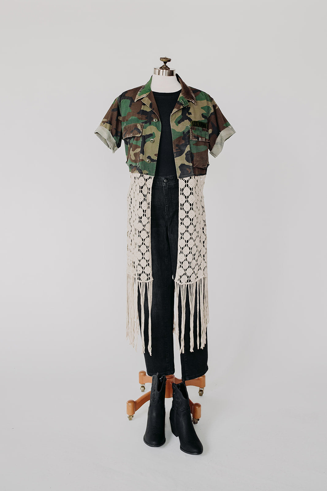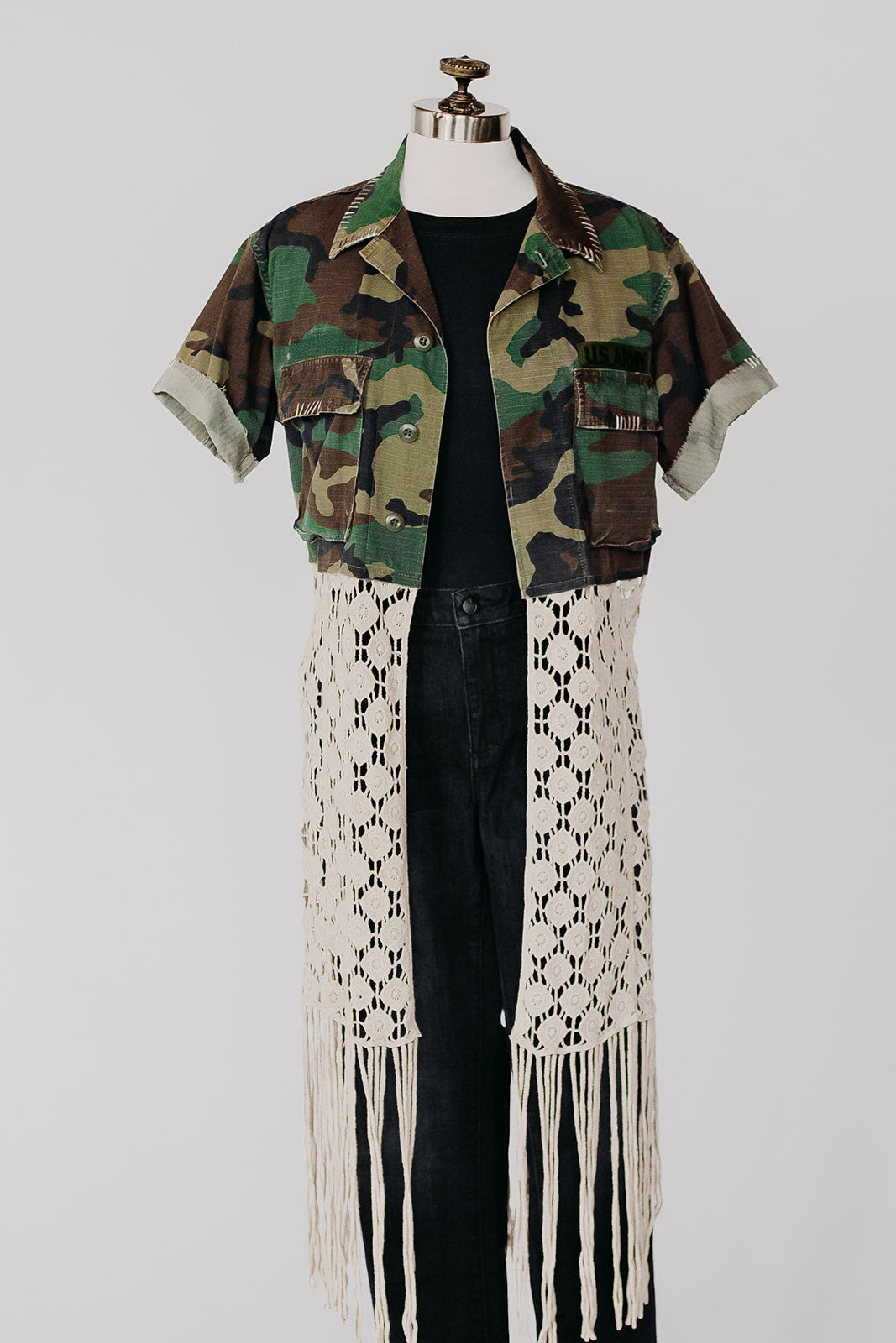 This one was named after Daisy Jones and the Six! Featuring a medium weight cropped camo jacket with an attached crocheted bottom. Embroidered trim at the collar, pockets and sleeve.