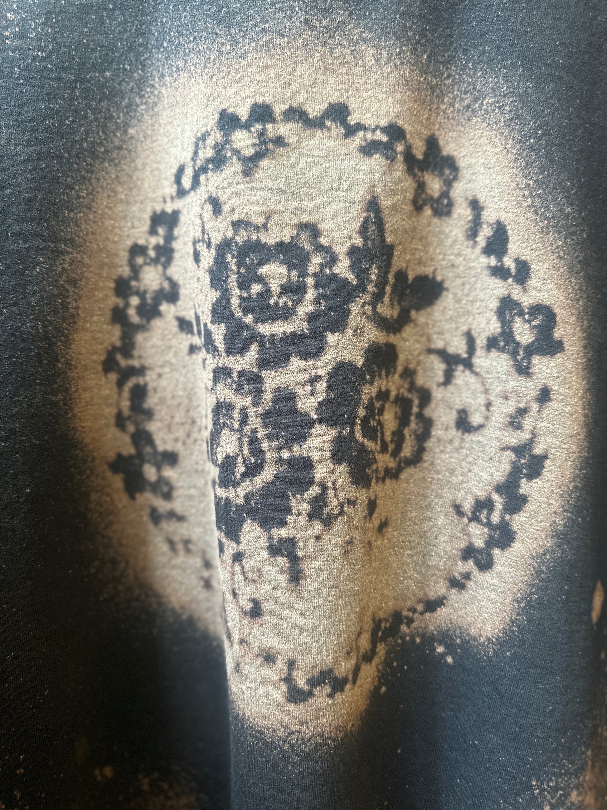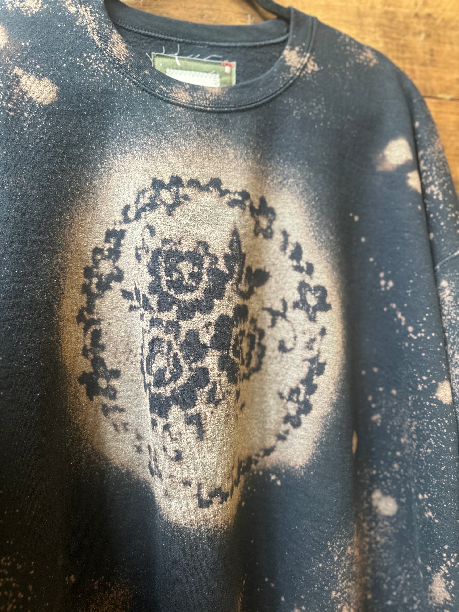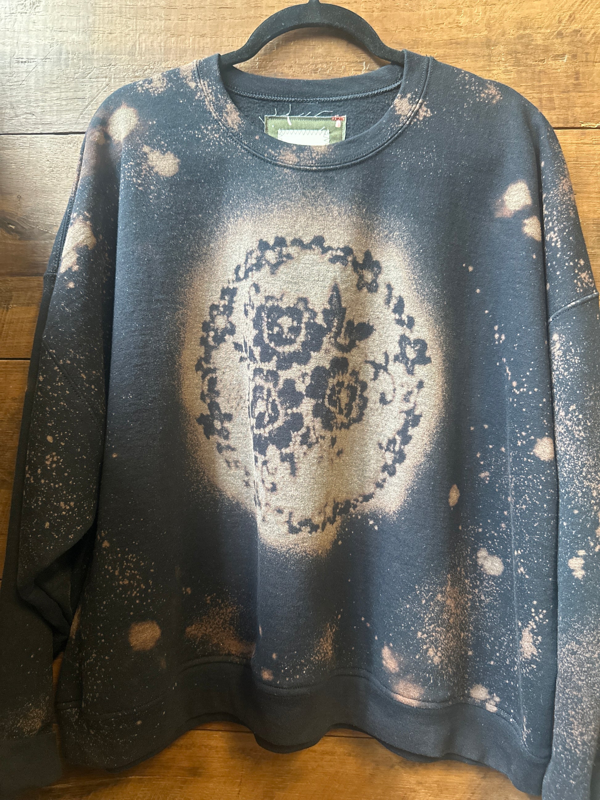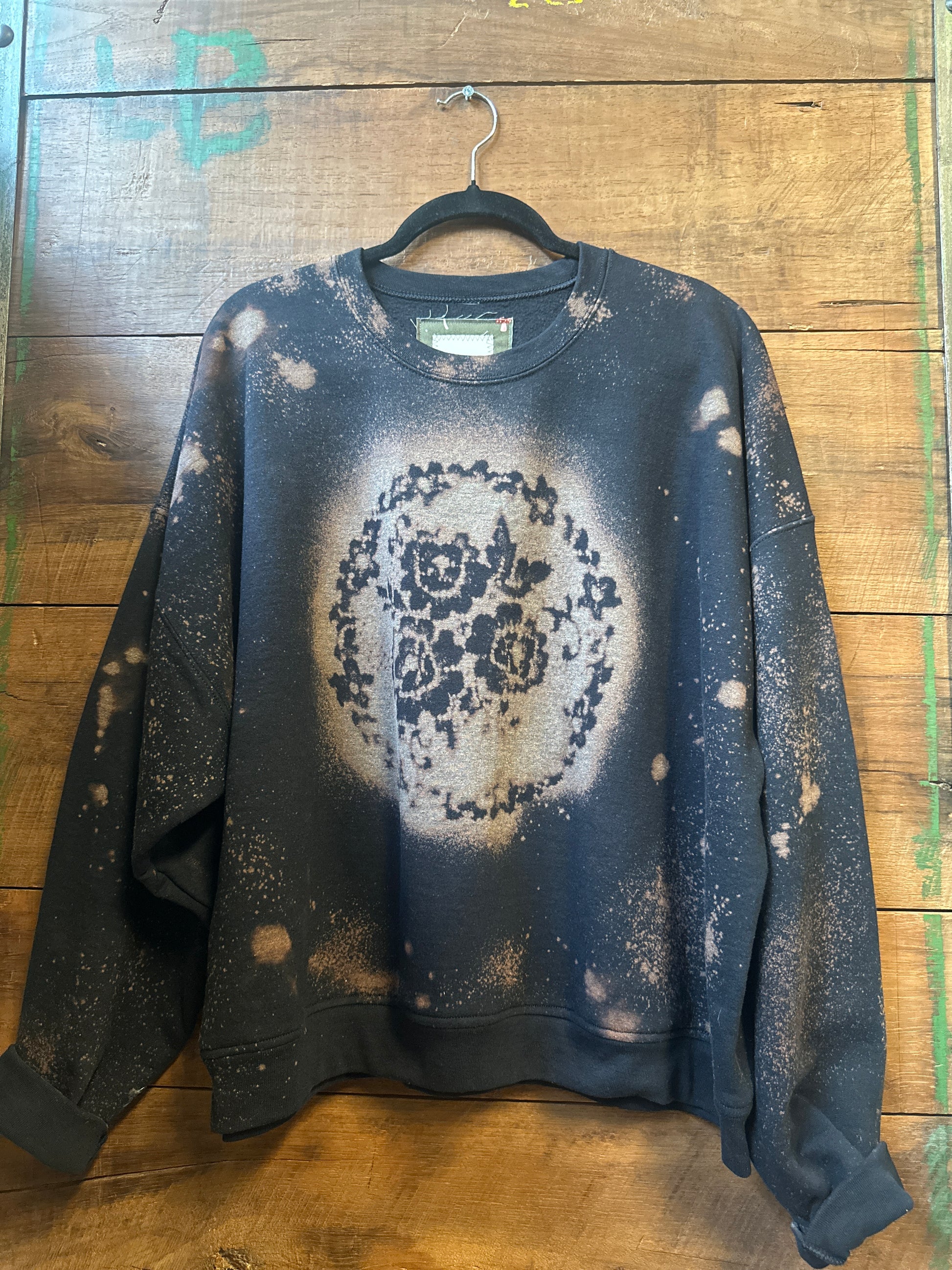 The Darma: Your new go-to for eco-friendly and stylish comfort. This upcycled crewneck sweatshirt features an oversized fit and a unique floral bleach design on the front and throughout. Stay environmentally conscious without sacrificing fashion.