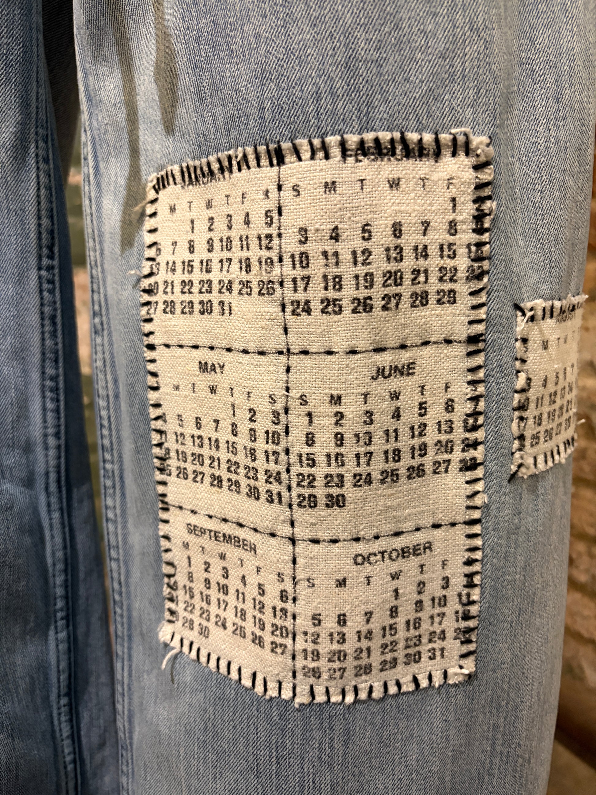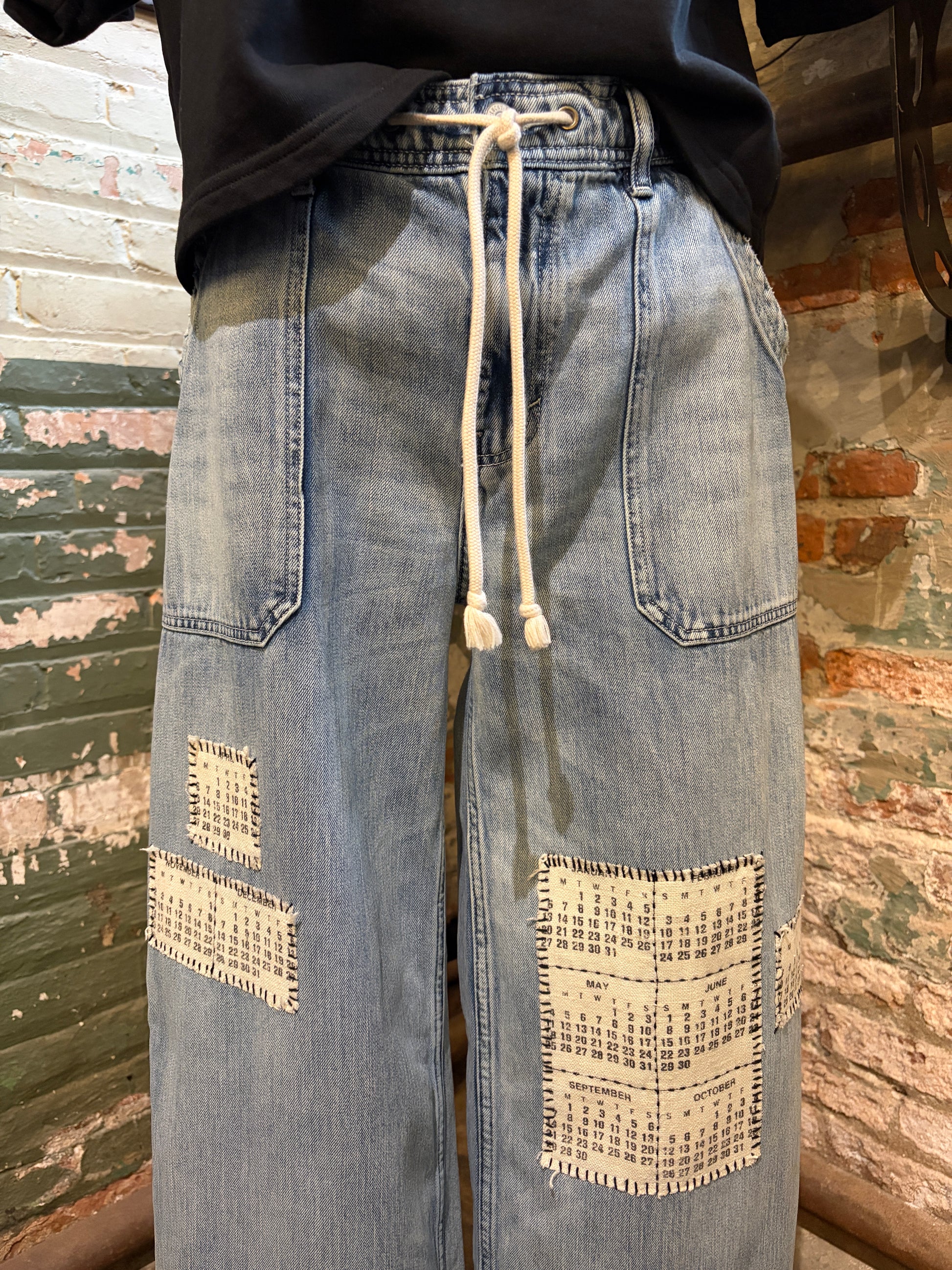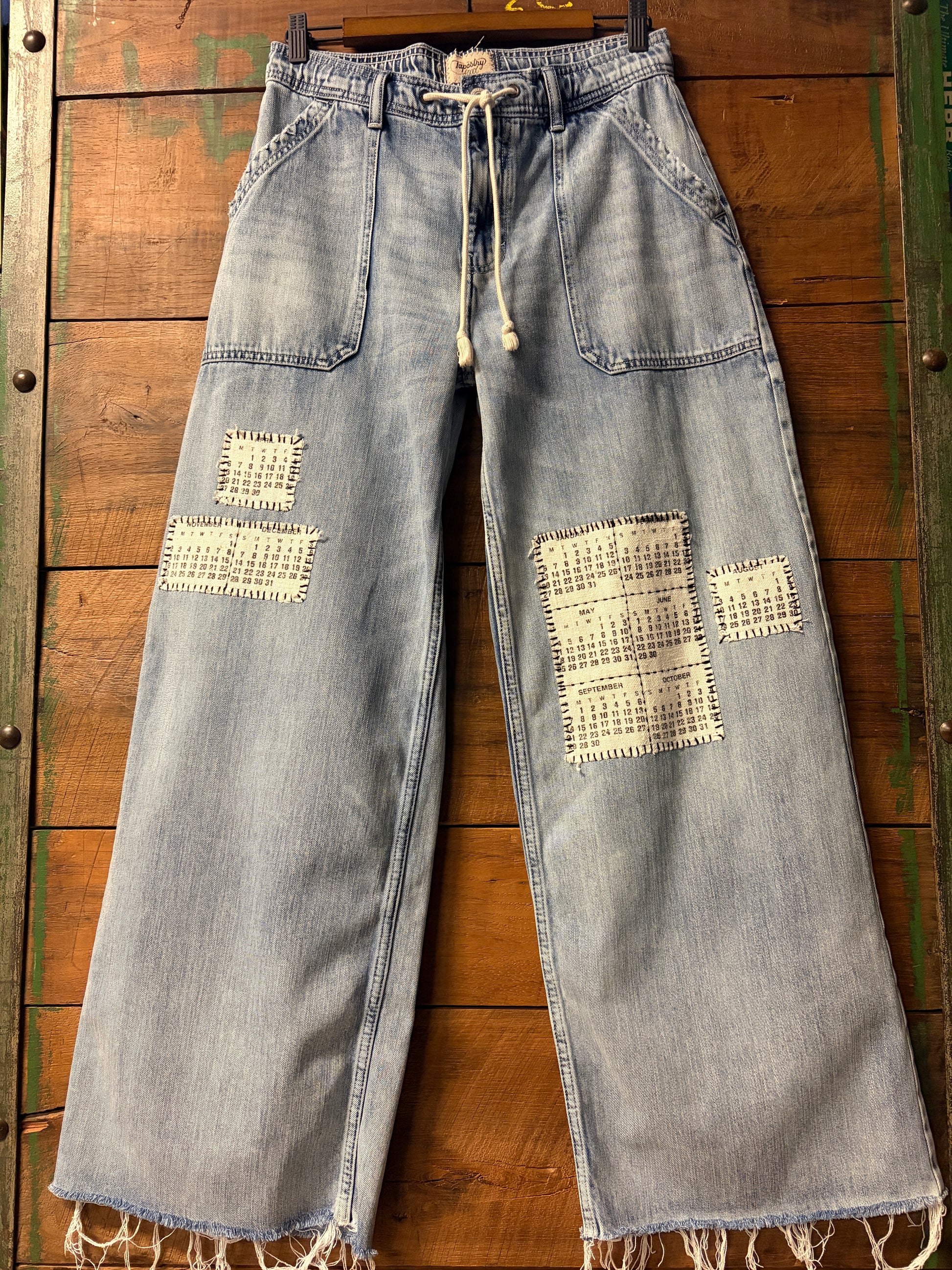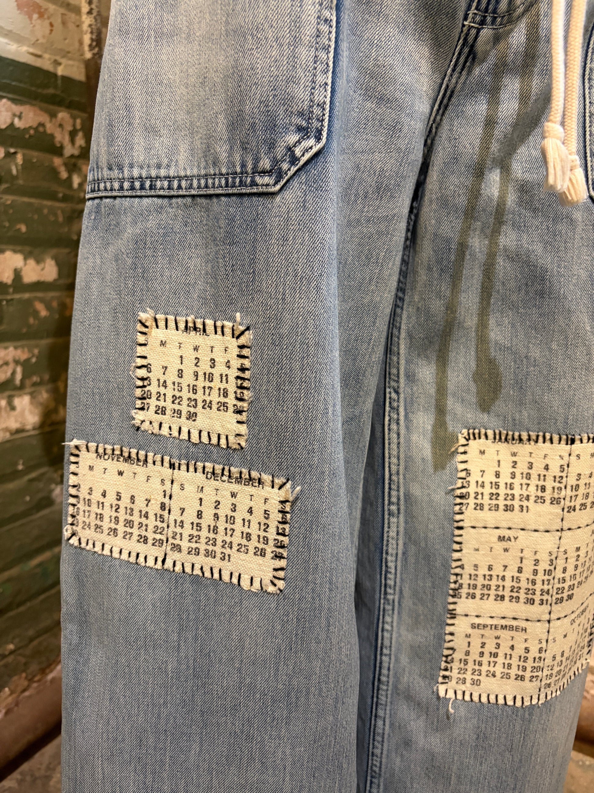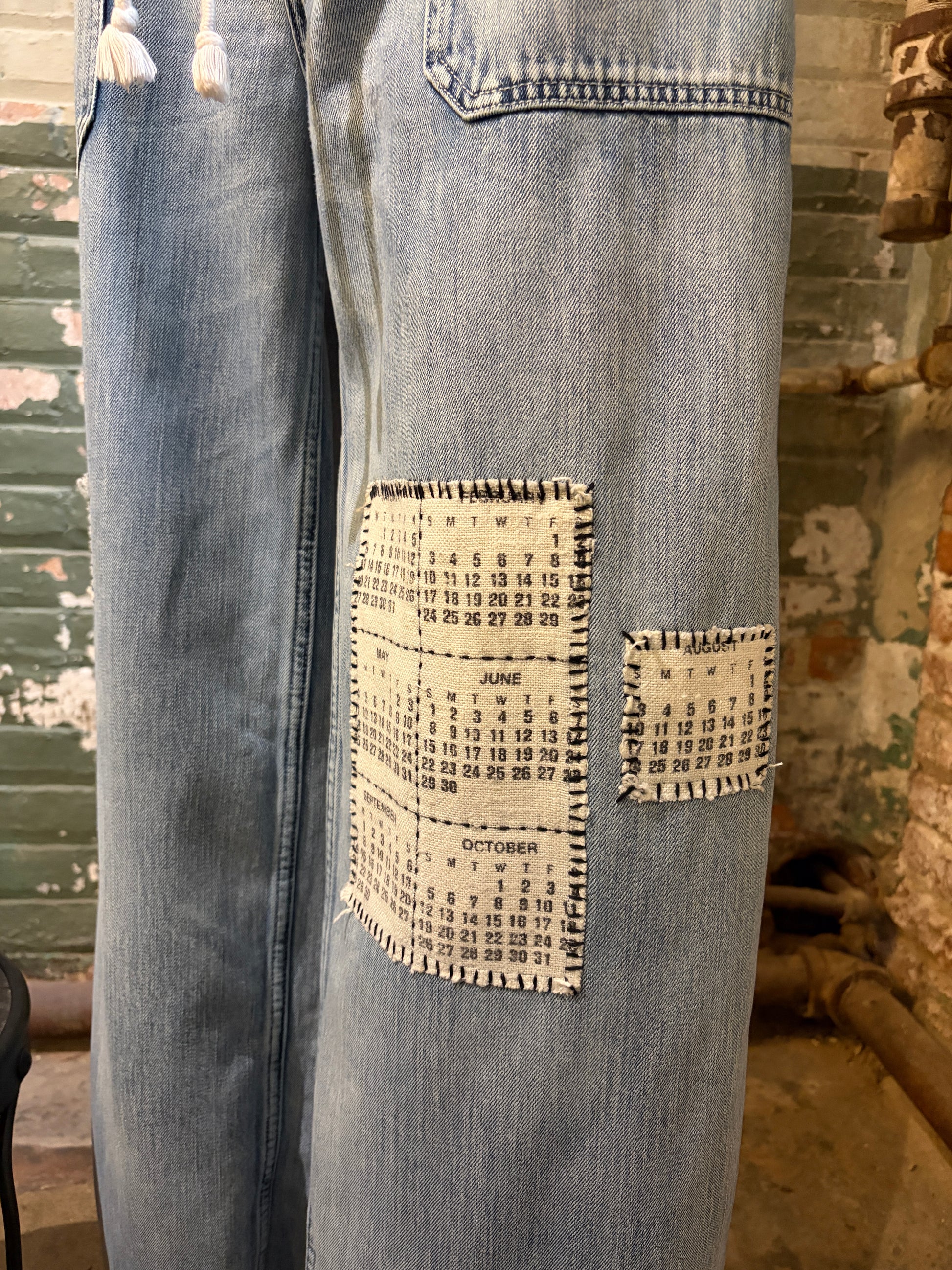 Meet The Date, your new favorite pair of statement jeans with serious personality. These upcycled wide-leg beauties feature a relaxed drawstring waist for all-day comfort and an intentionally raw hemline that celebrates their second-life story. The real magic? Vintage calendar tea towel patches embroidered across the fronts, turning everyday dates into wearable art. Perfect for anyone who loves sustainable fashion with a sense of humor and doesn't mind standing out in a crowd.
