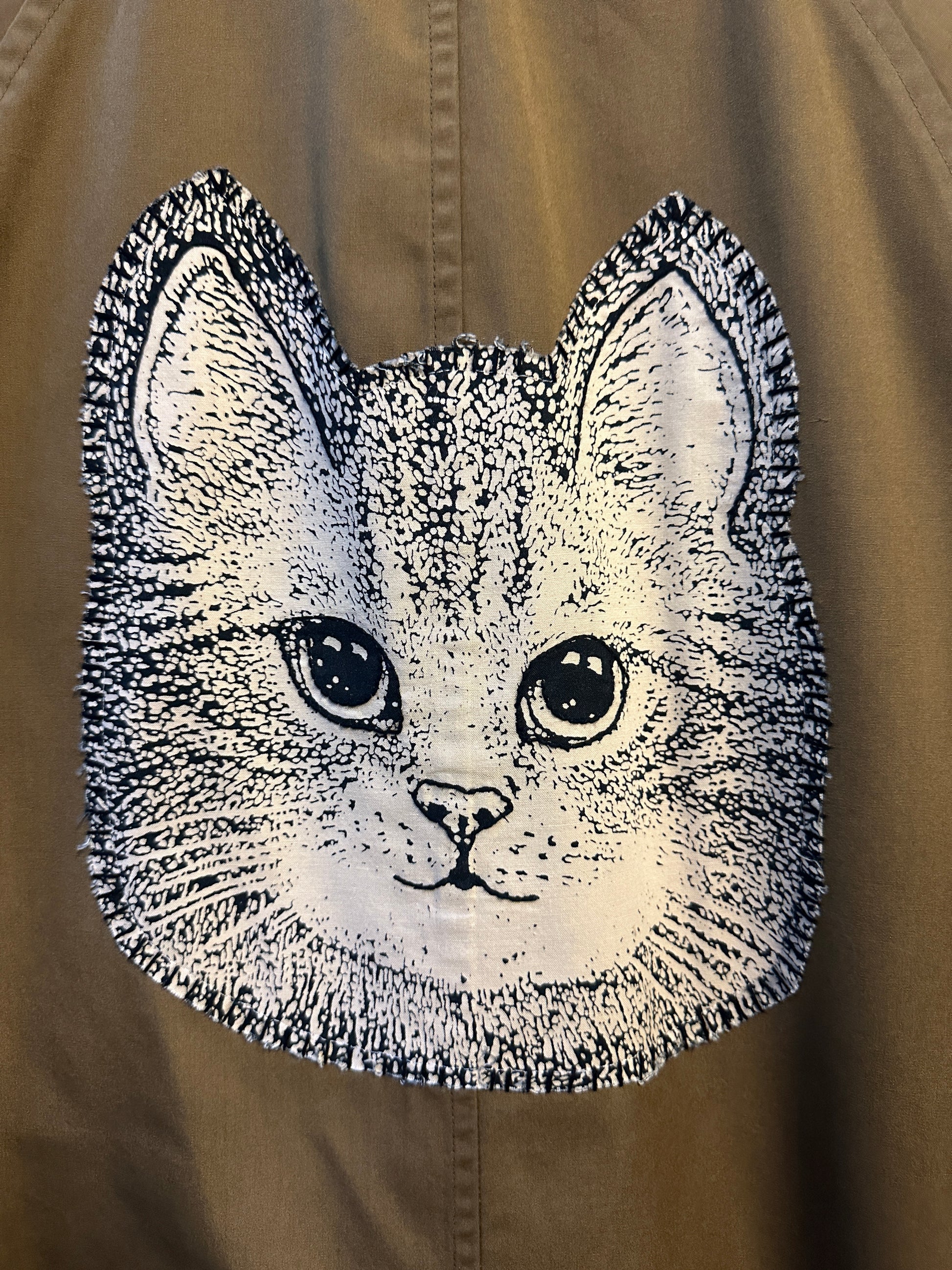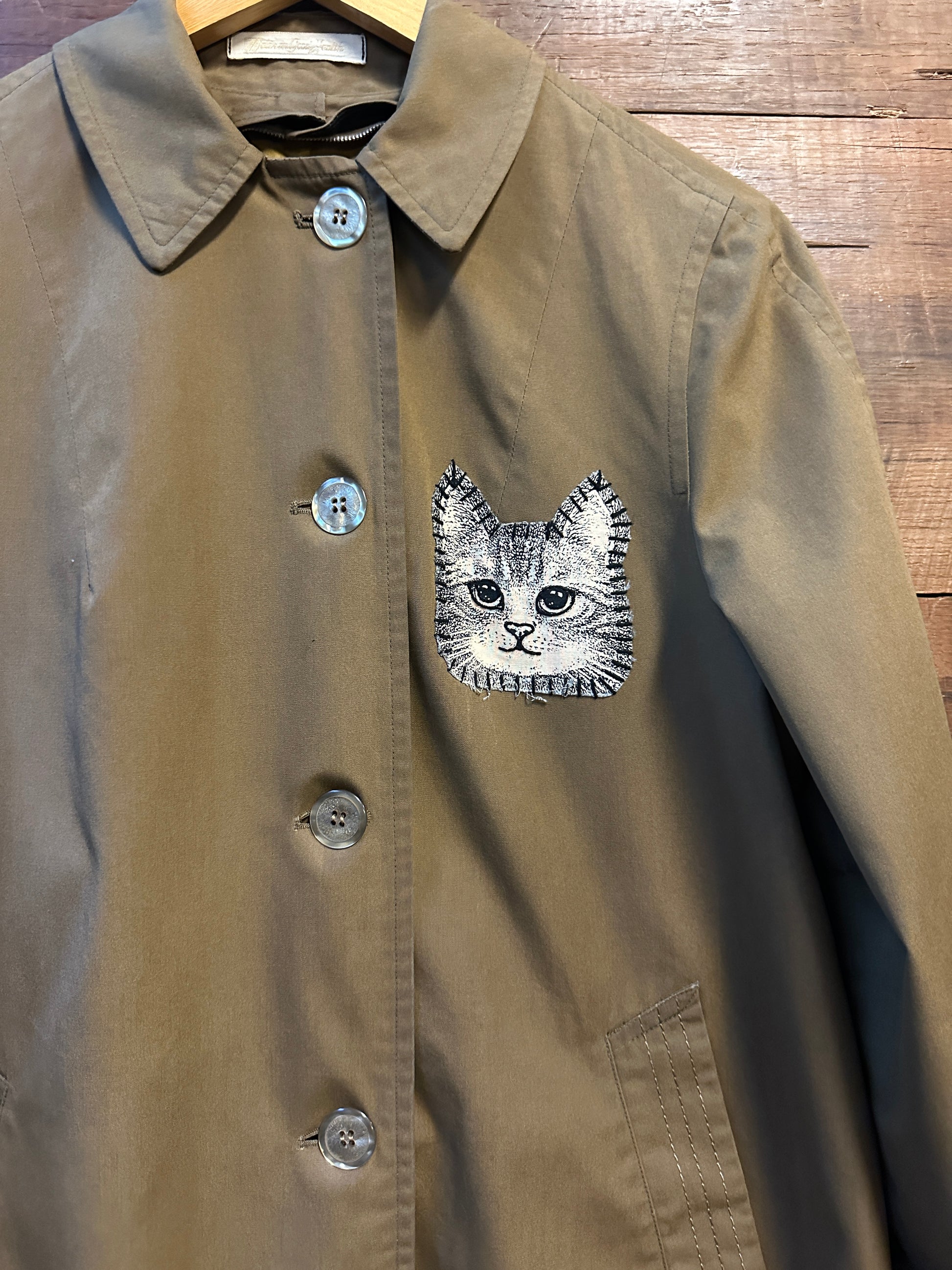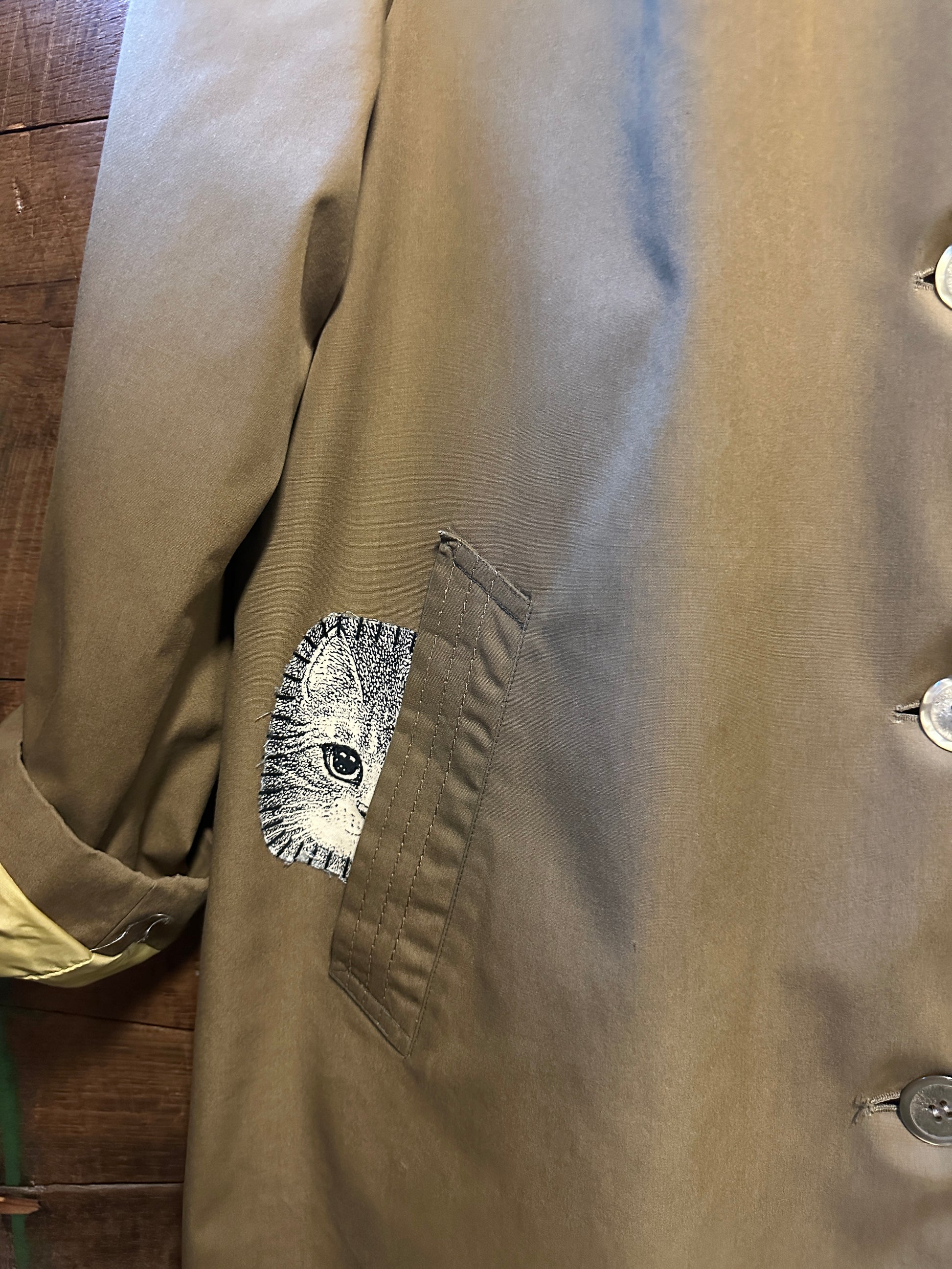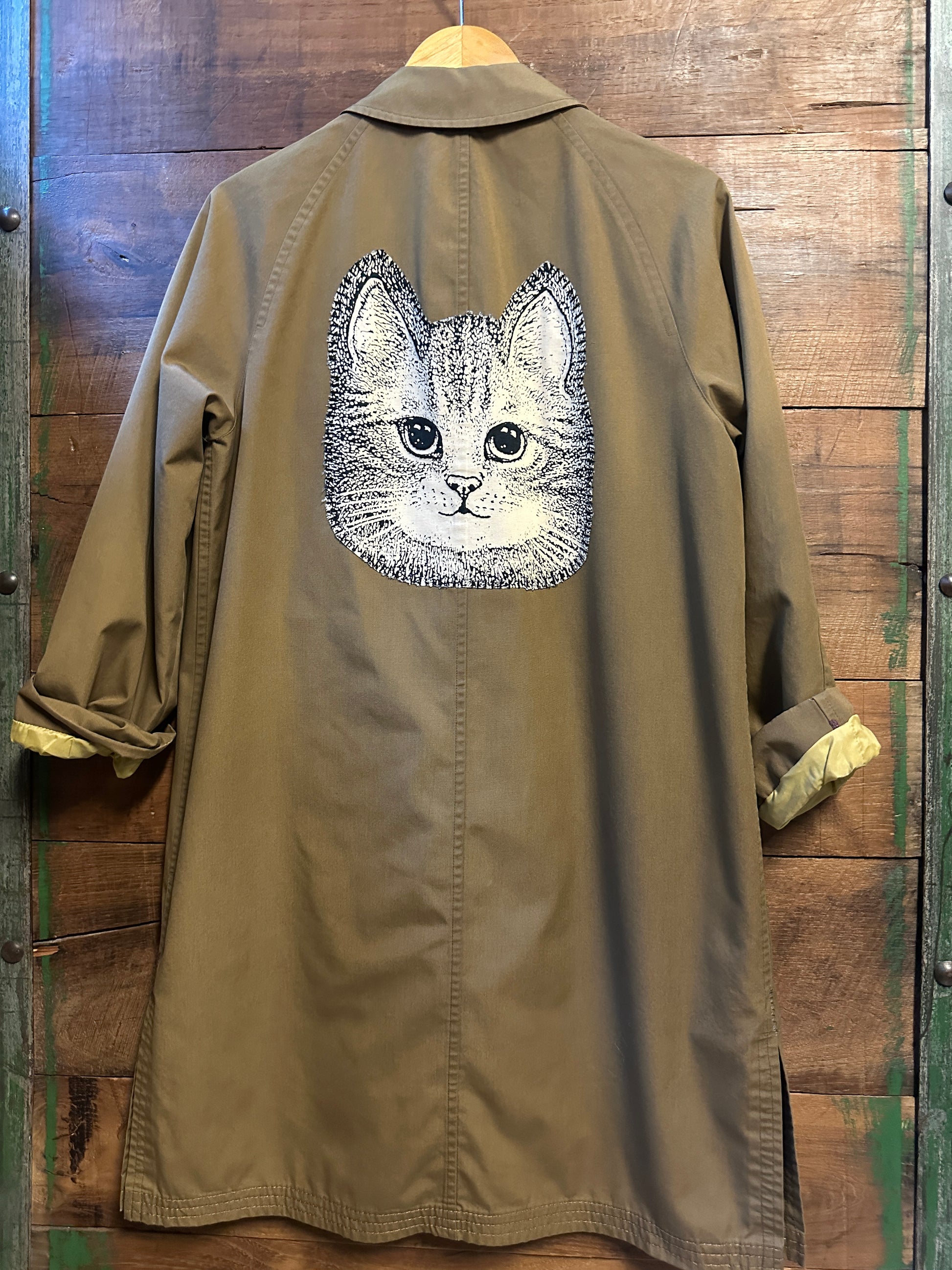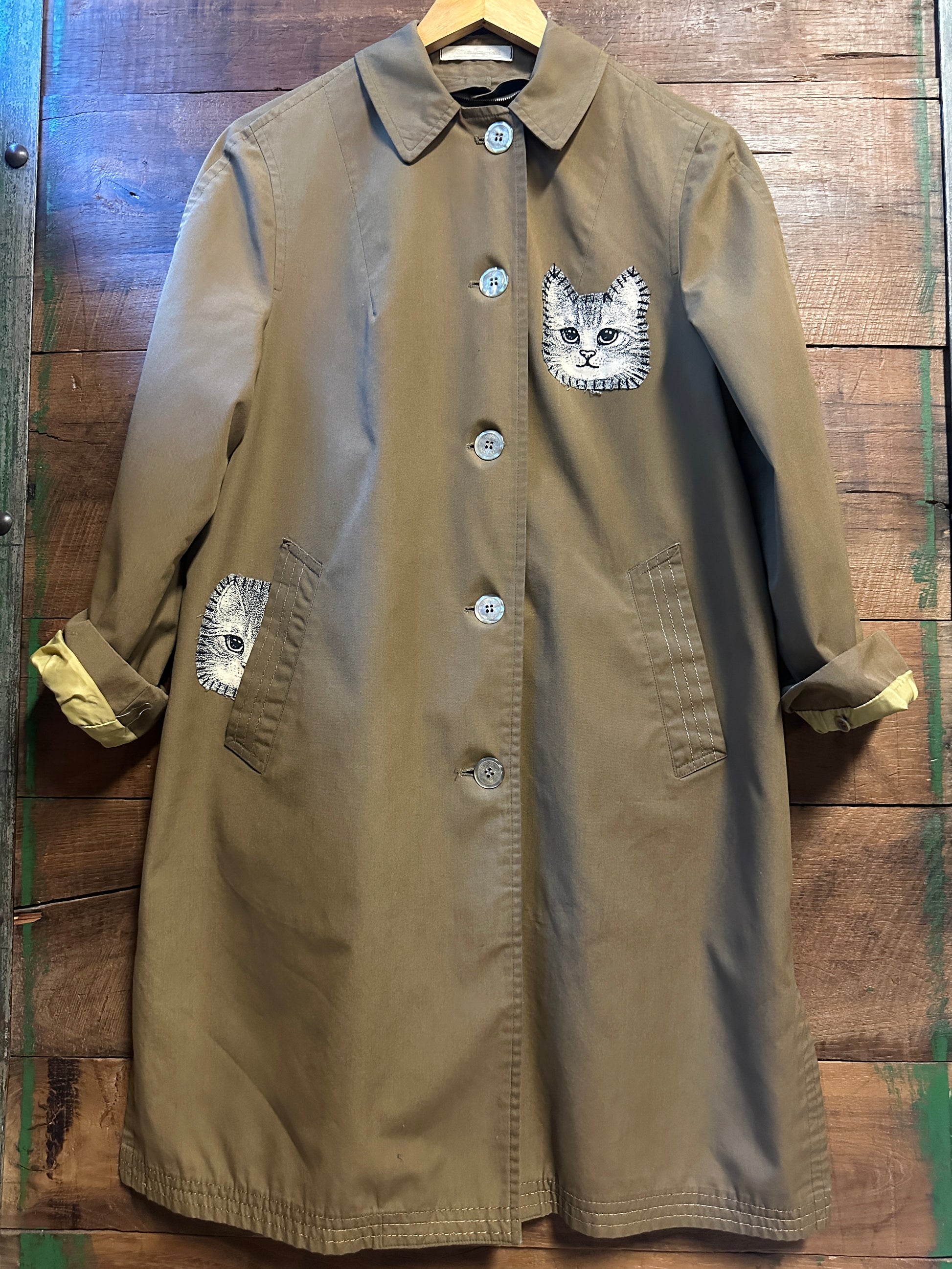 Step out in style with The Eleanor, an upcycled vintage trench coat that's as unique as you are. Lightweight and washable for everyday ease, it features charming hand-stitched cat patches on both front and back, adding a playful touch to your wardrobe. Perfect for those who love to blend classic fashion with a bit of whimsy.
