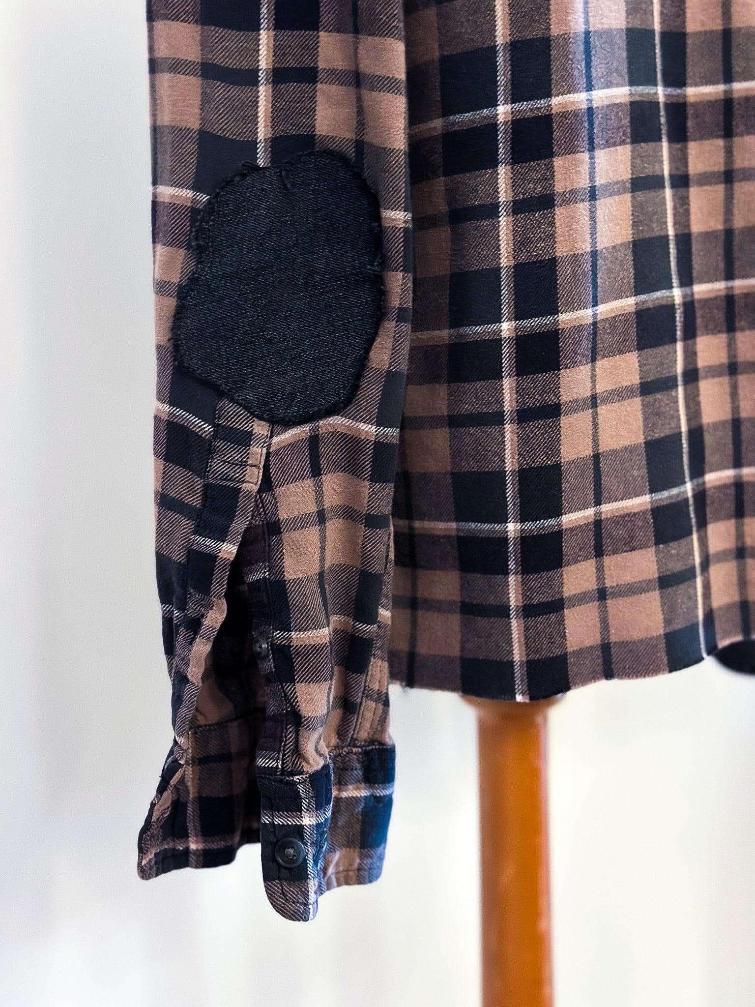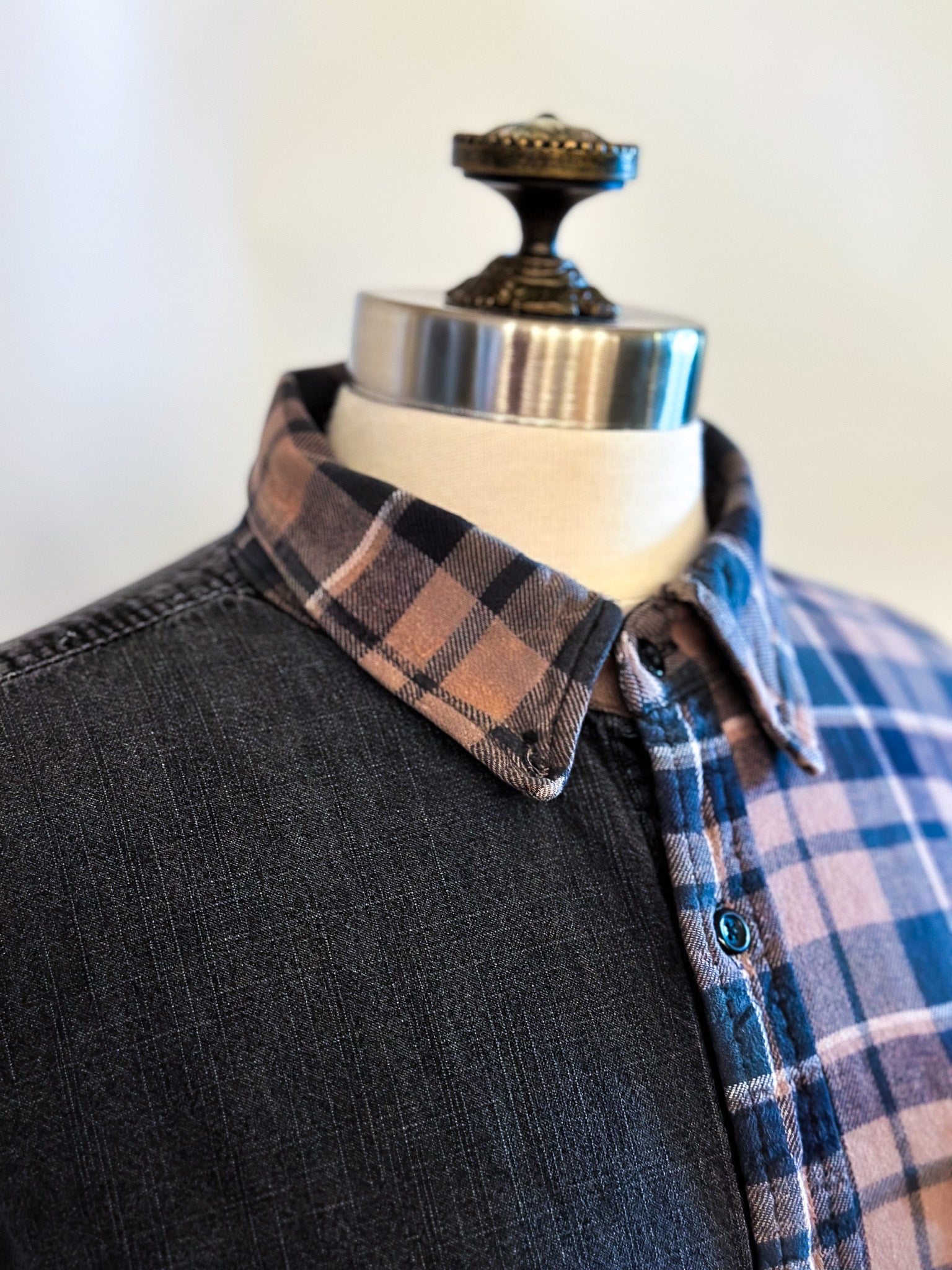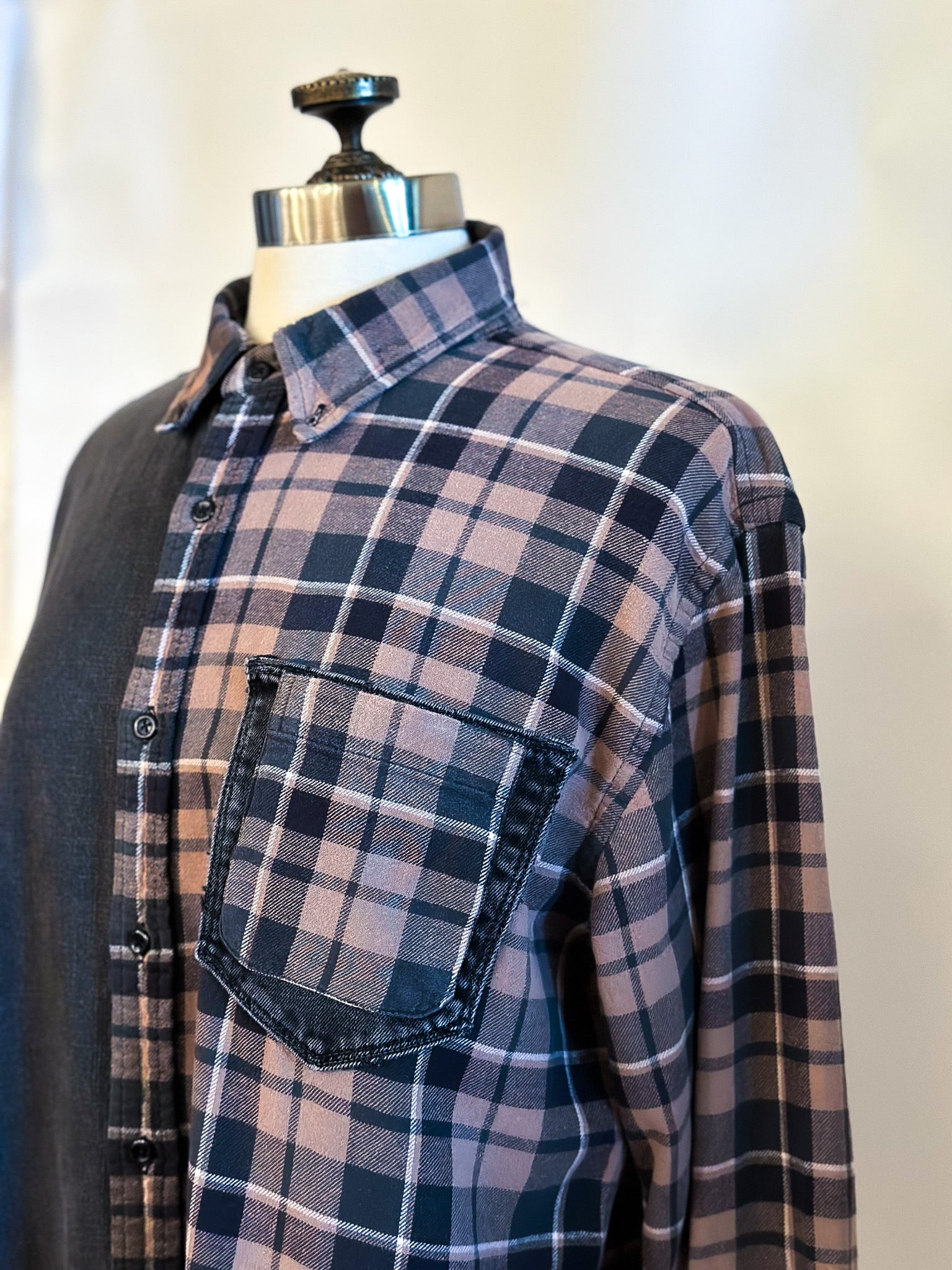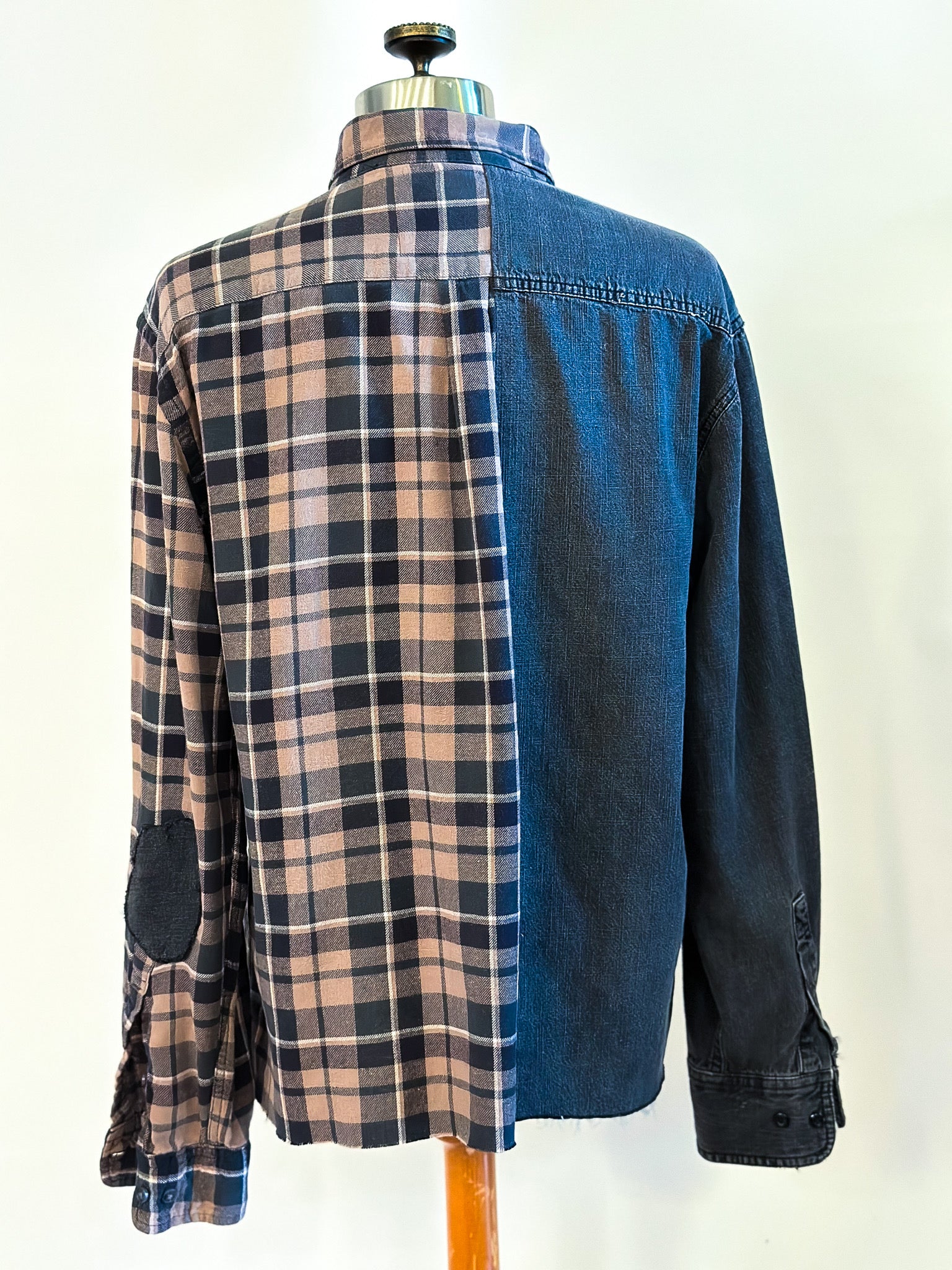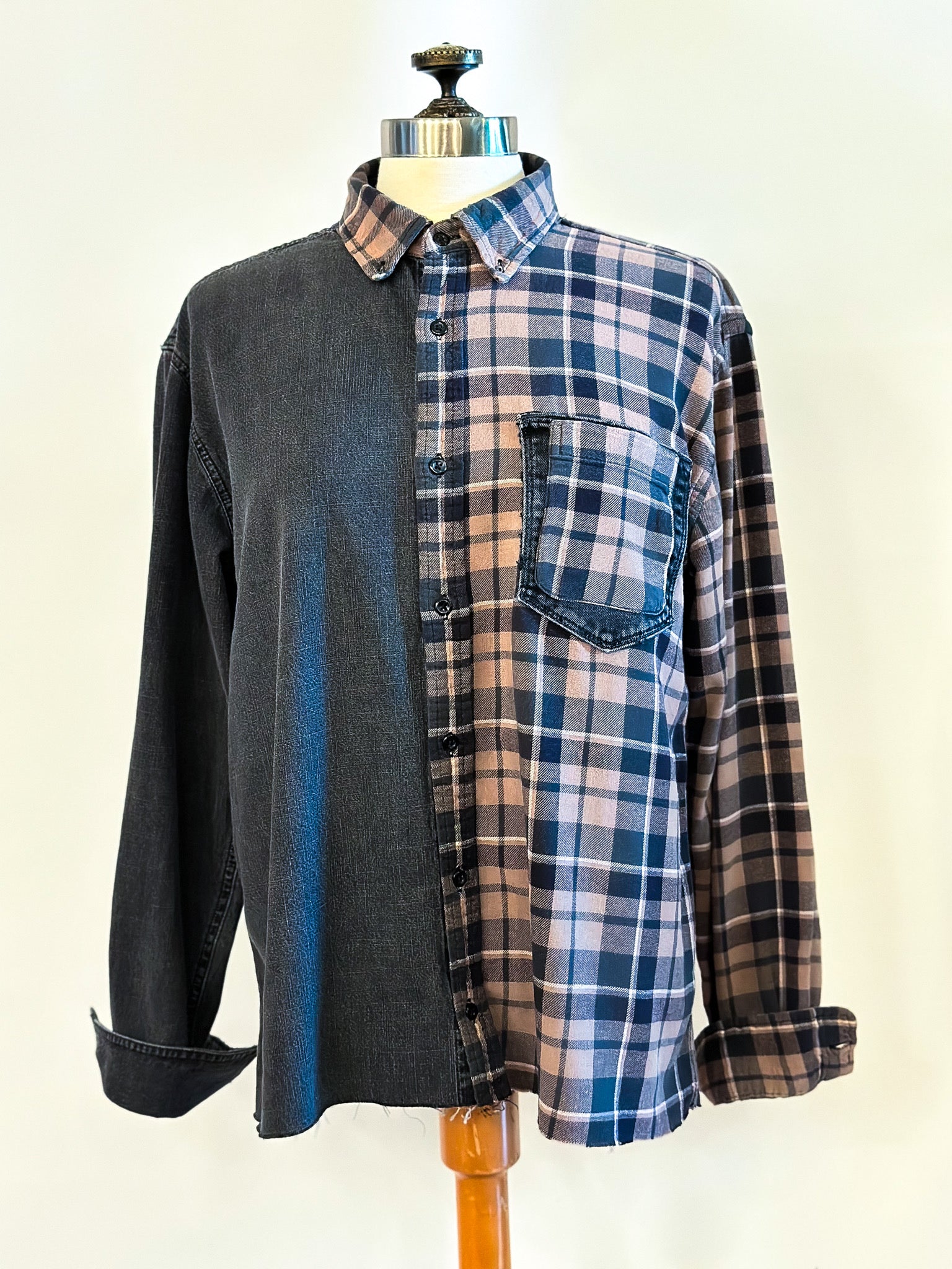 Be fashion-forward in this upcycled 1/2 and 1/2 classic denim and flannel shirt. This flannel is one of the softest, most worn in fabrics, sure to be a favorite. One sleeve has been extra loved and has been patched with a contrasting denim fabric, adding even more detail. Super cool, neutral plaid will be oh so easy to style!