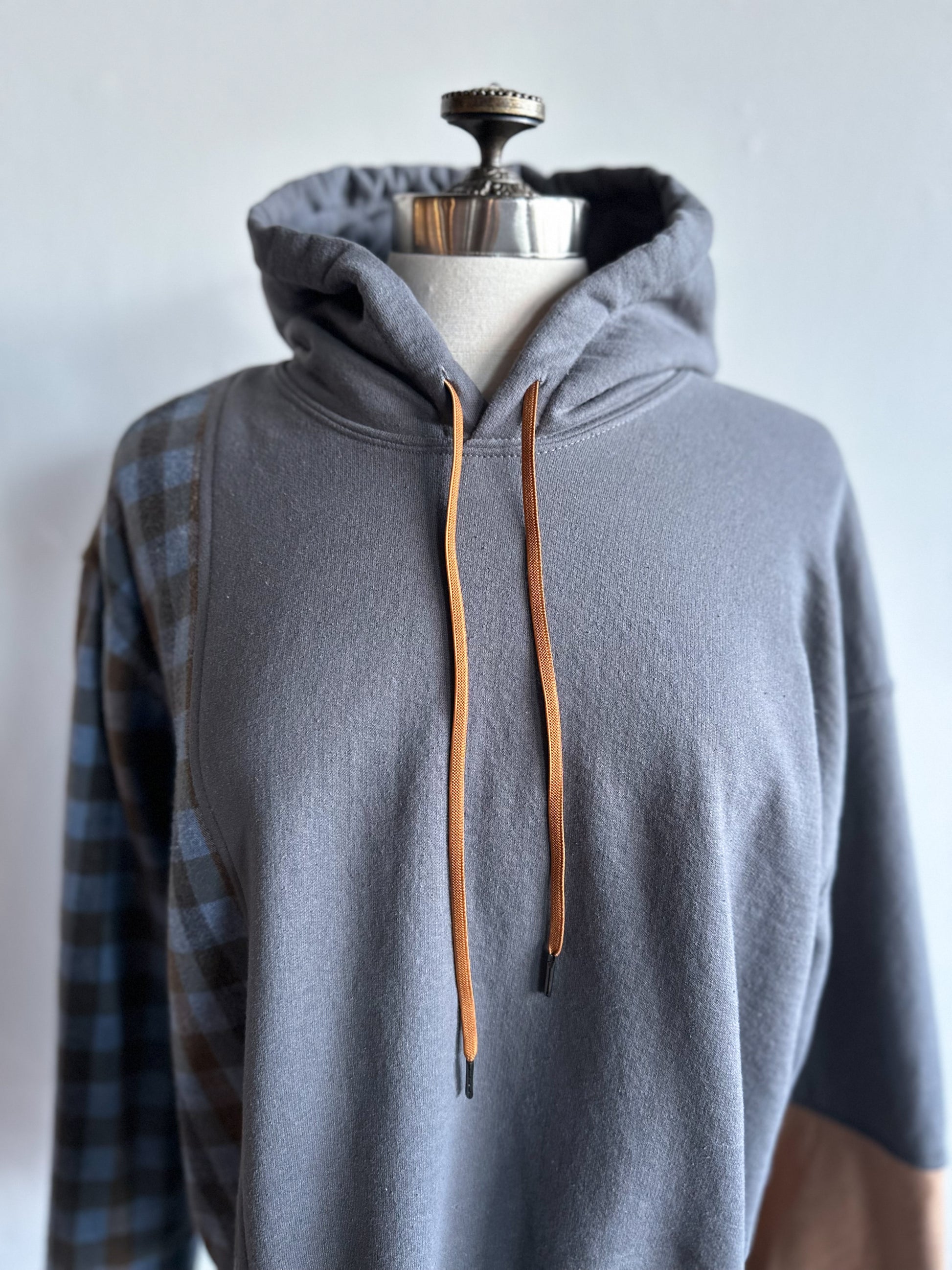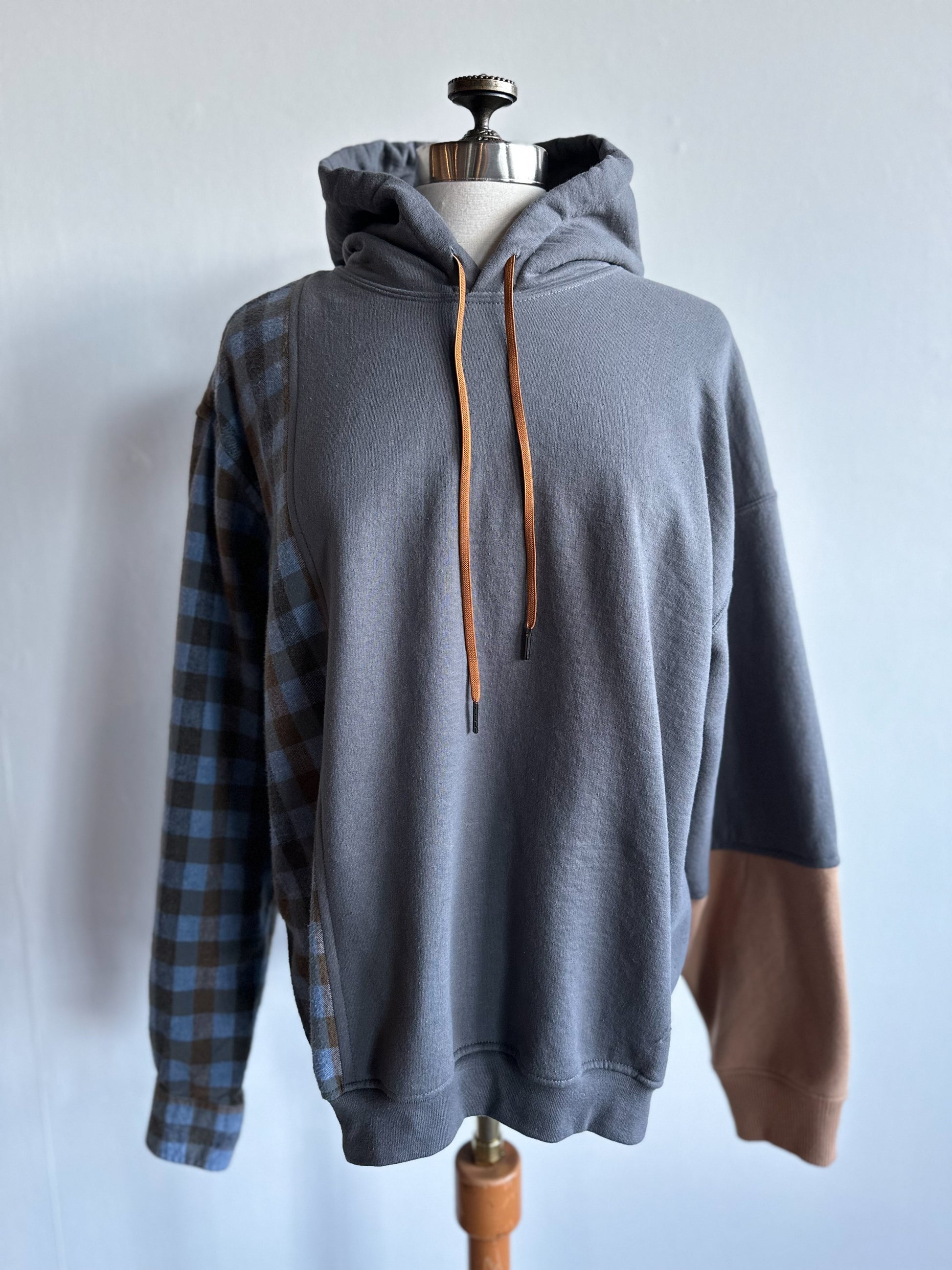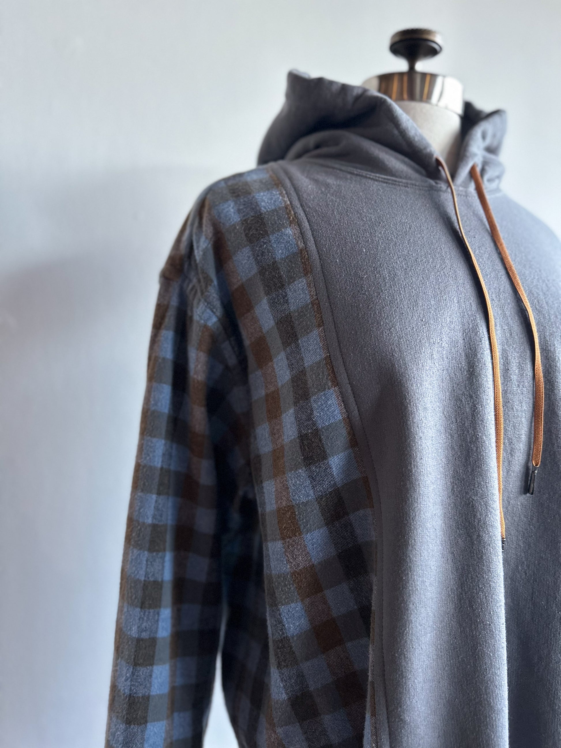 The Finn is a stylish and eco-friendly hoodie, made with upcycled materials and featuring a unique color block design. Stay warm and make a statement with the added touch of cozy flannel. A must-have for the fashion-forward and environmentally conscious individual.