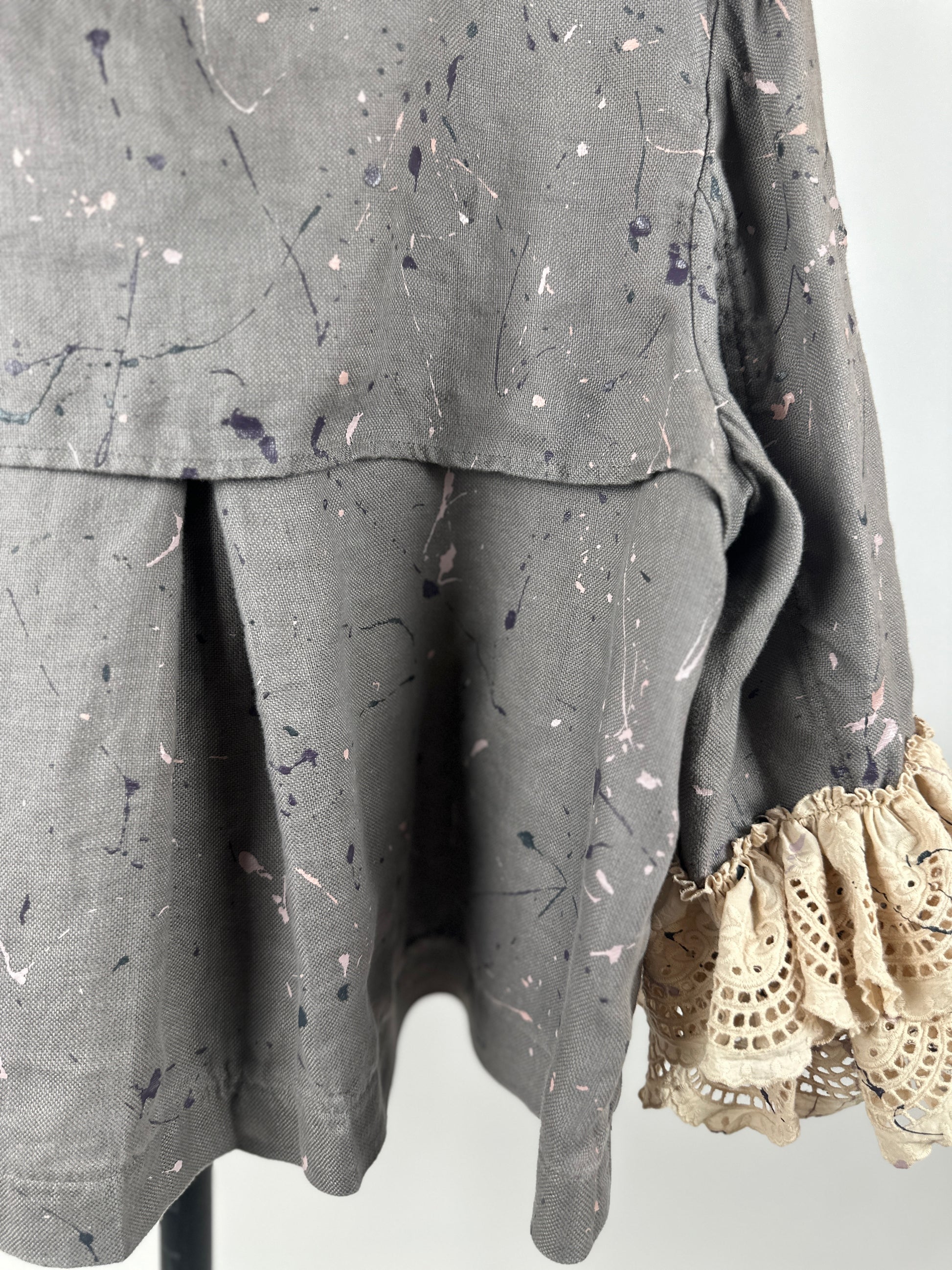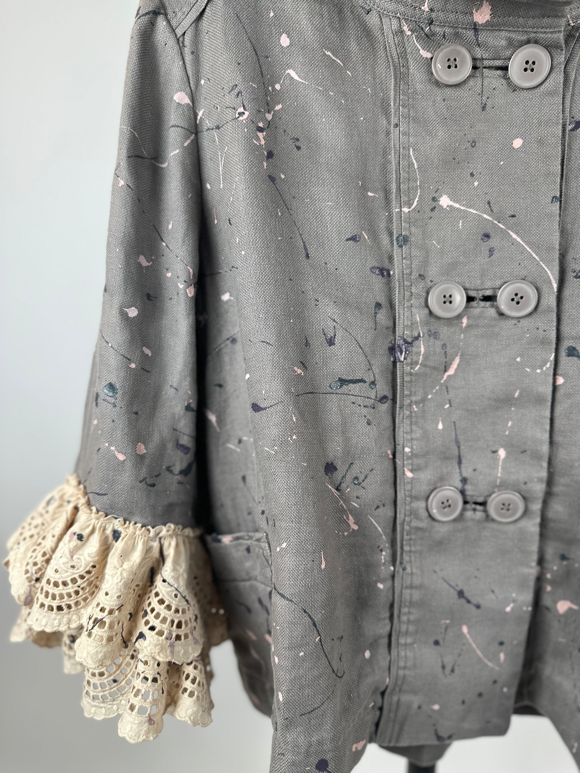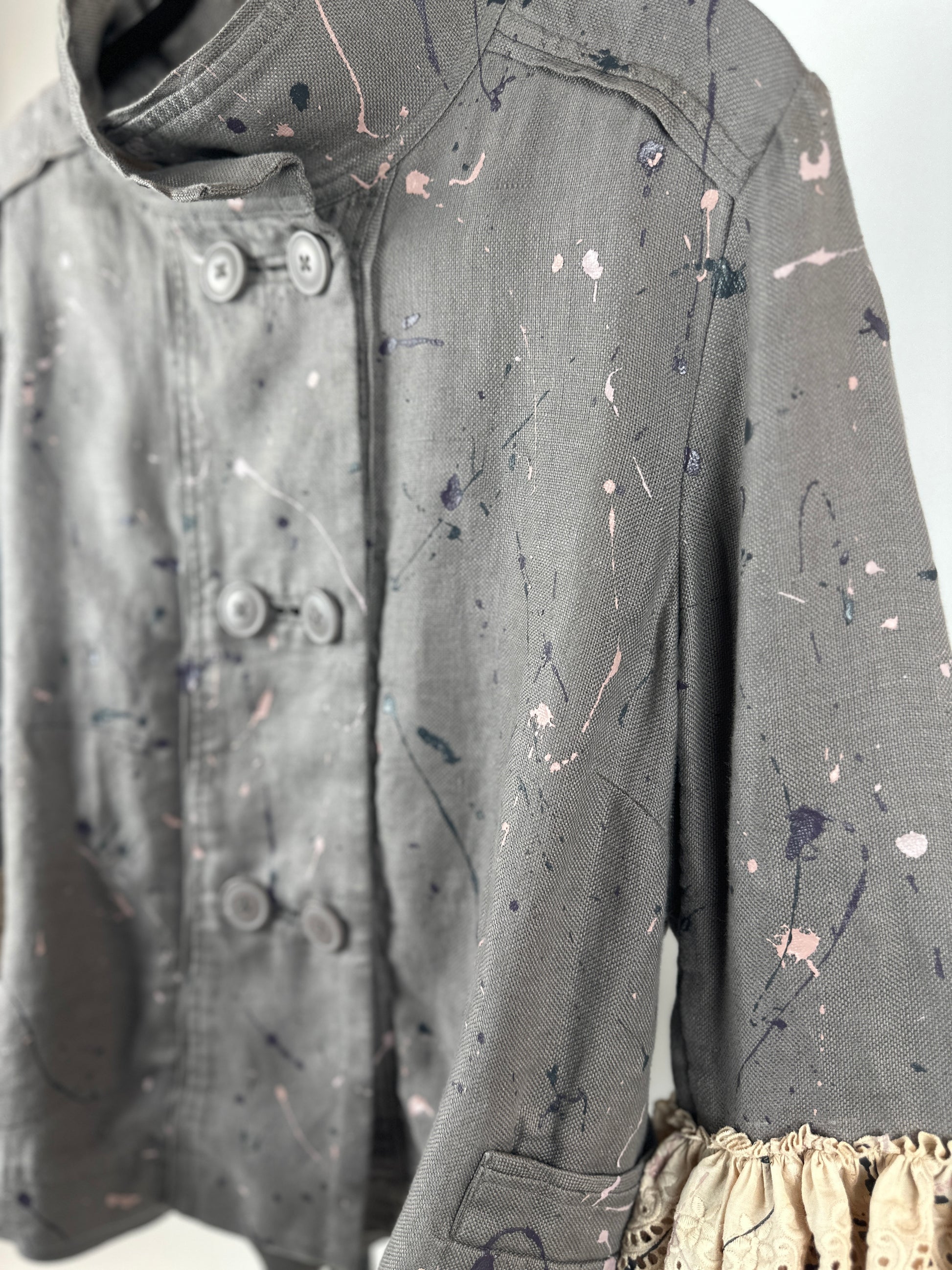 Get ready to make a statement with The Fleetwood! This unique upcycled linen jacket features a muted splatter paint design, 3/4 sleeves with a ruffle eyelet detail. Its loose fit ensures comfort and versatility, making it perfect for any occasion. Upgrade your wardrobe with this one-of-a-kind piece!