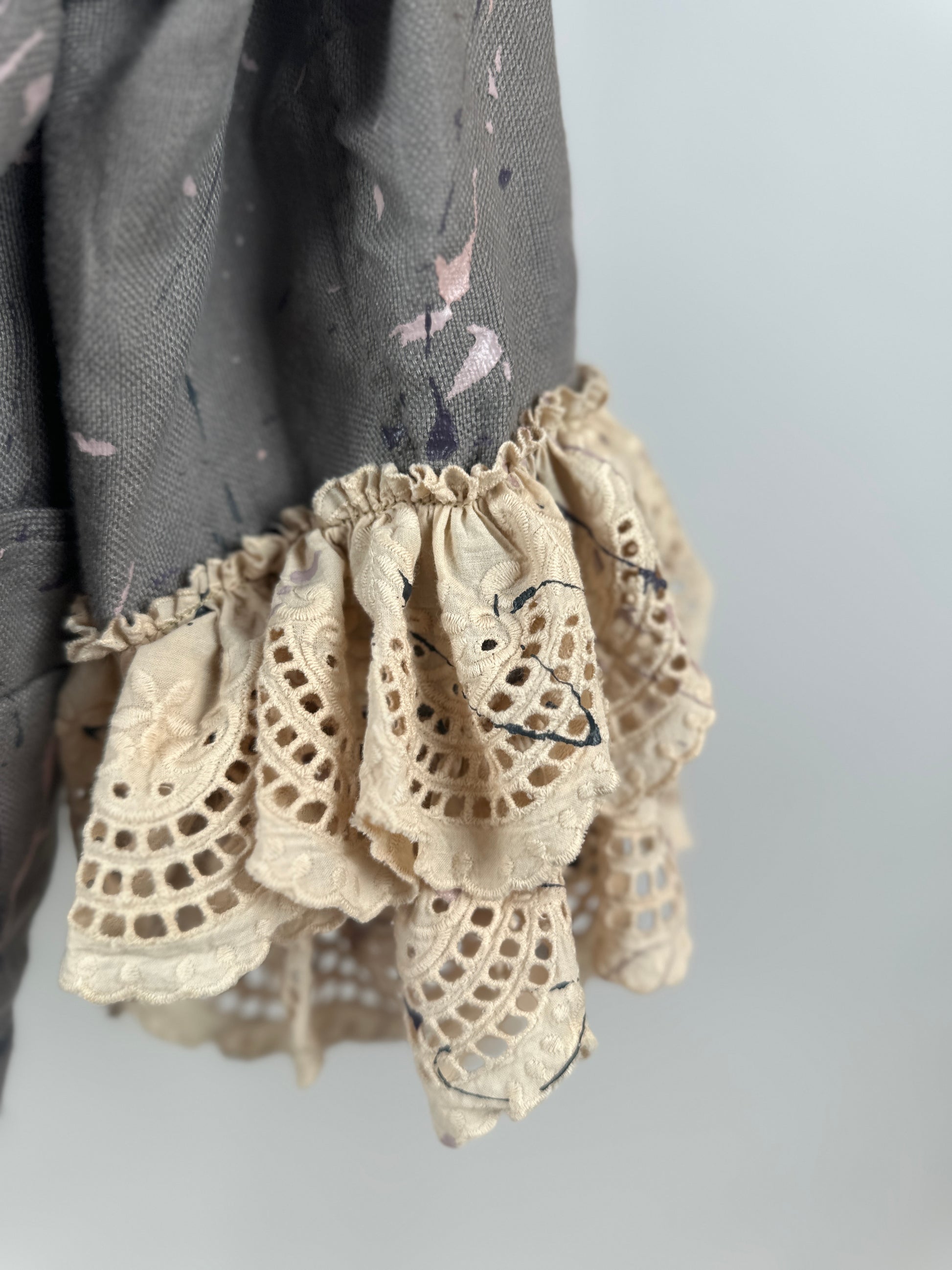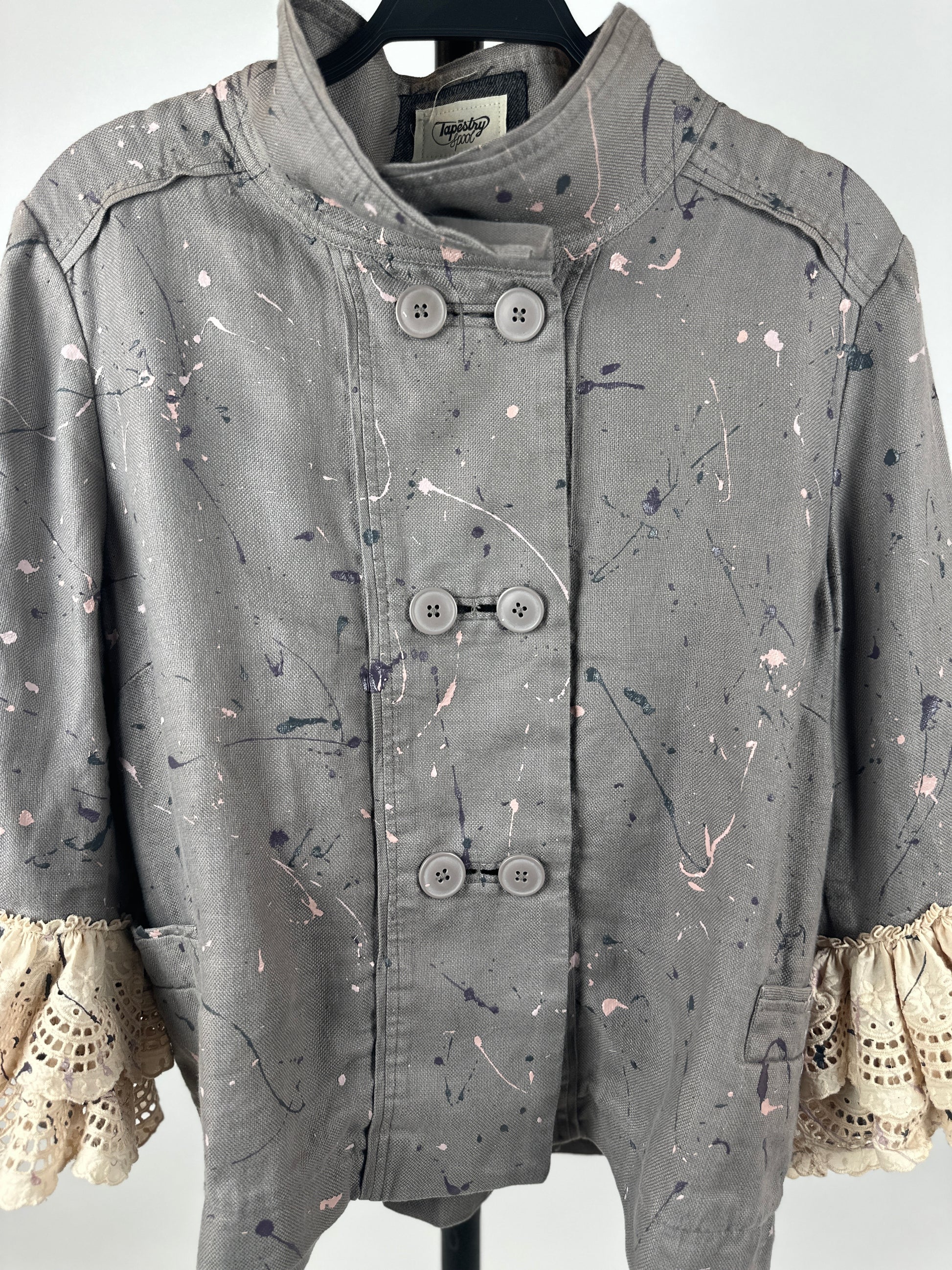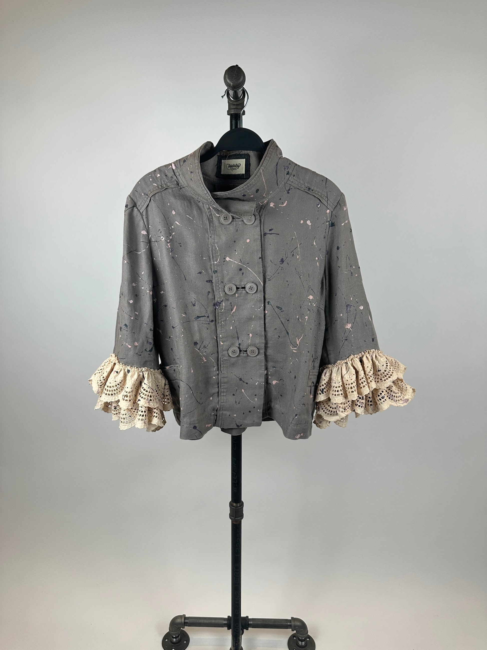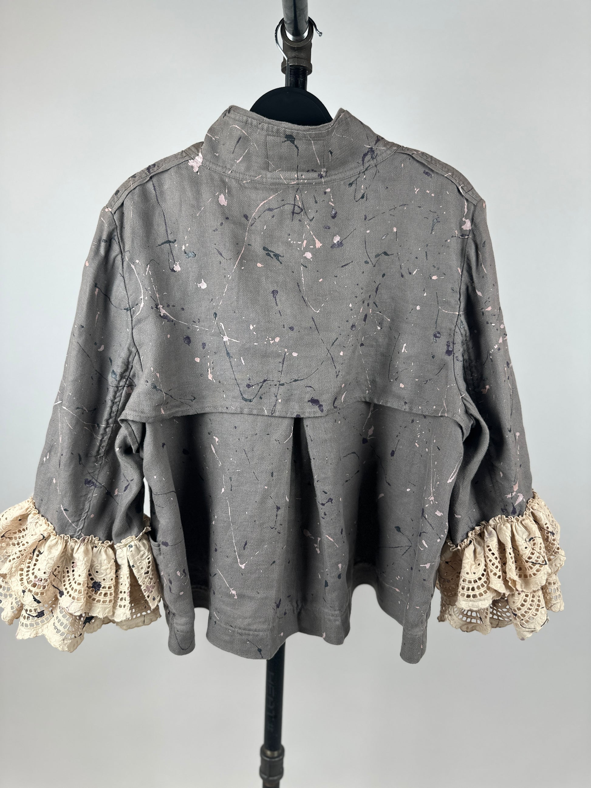 Get ready to make a statement with The Fleetwood! This unique upcycled linen jacket features a muted splatter paint design, 3/4 sleeves with a ruffle eyelet detail. Its loose fit ensures comfort and versatility, making it perfect for any occasion. Upgrade your wardrobe with this one-of-a-kind piece!