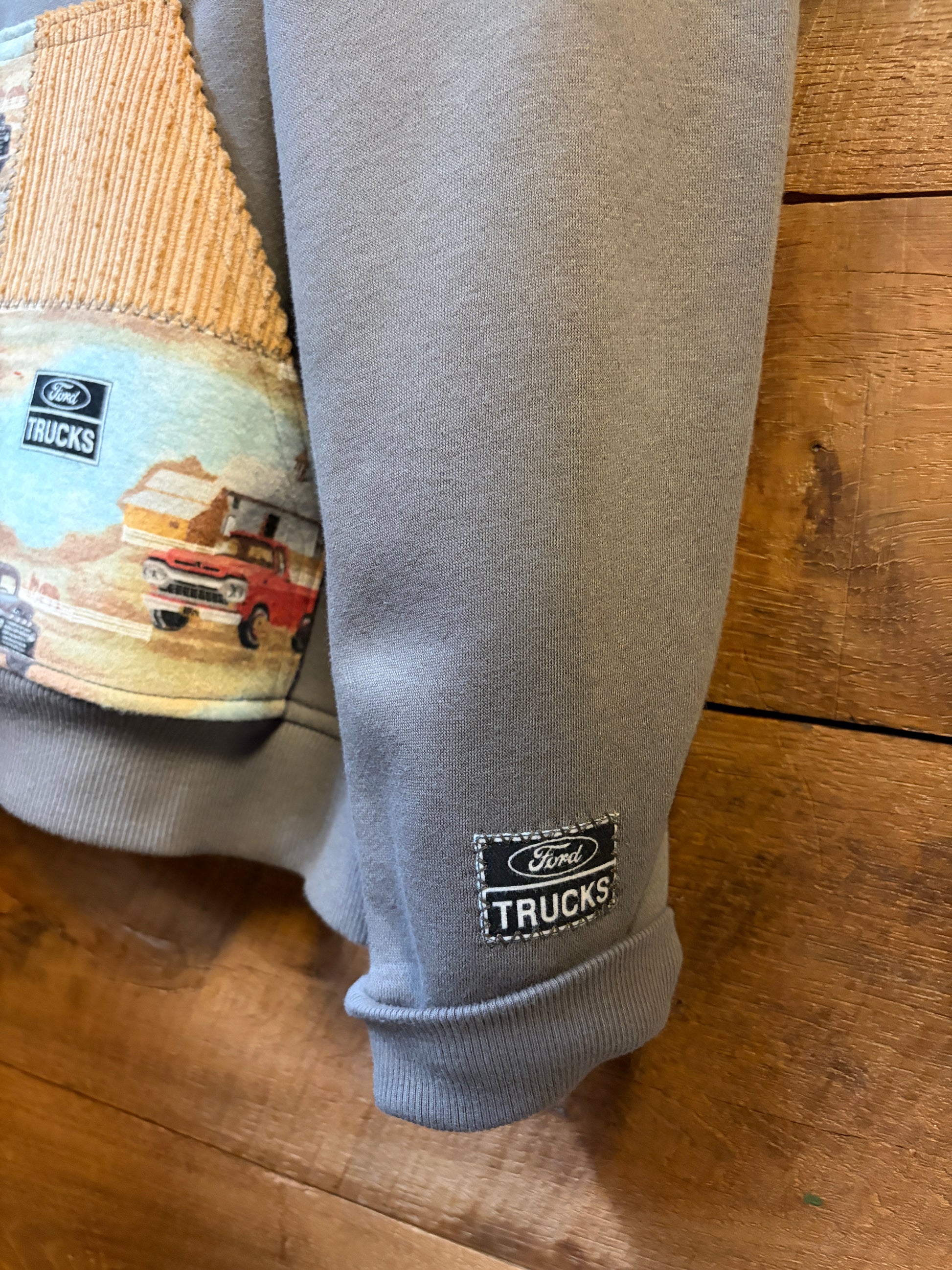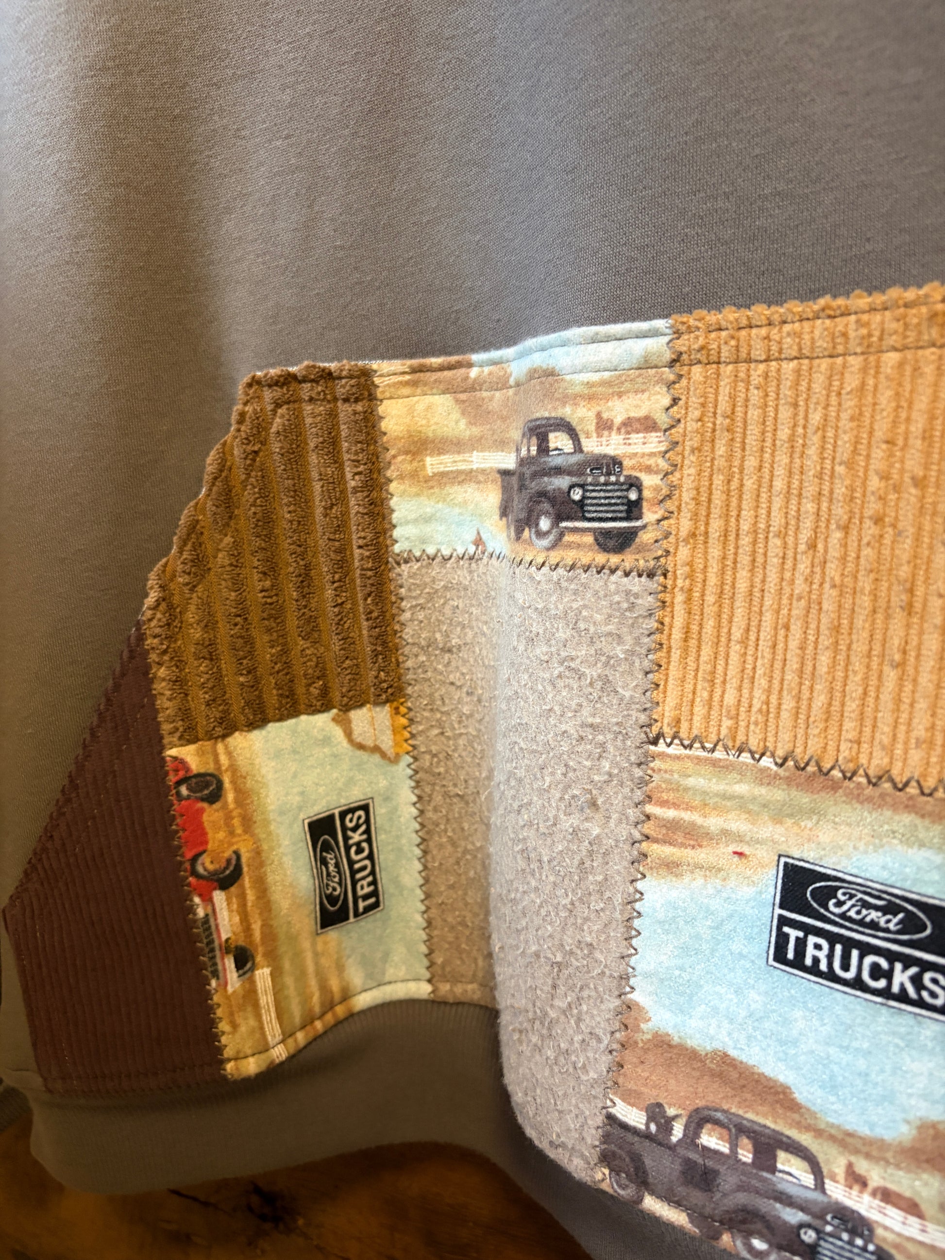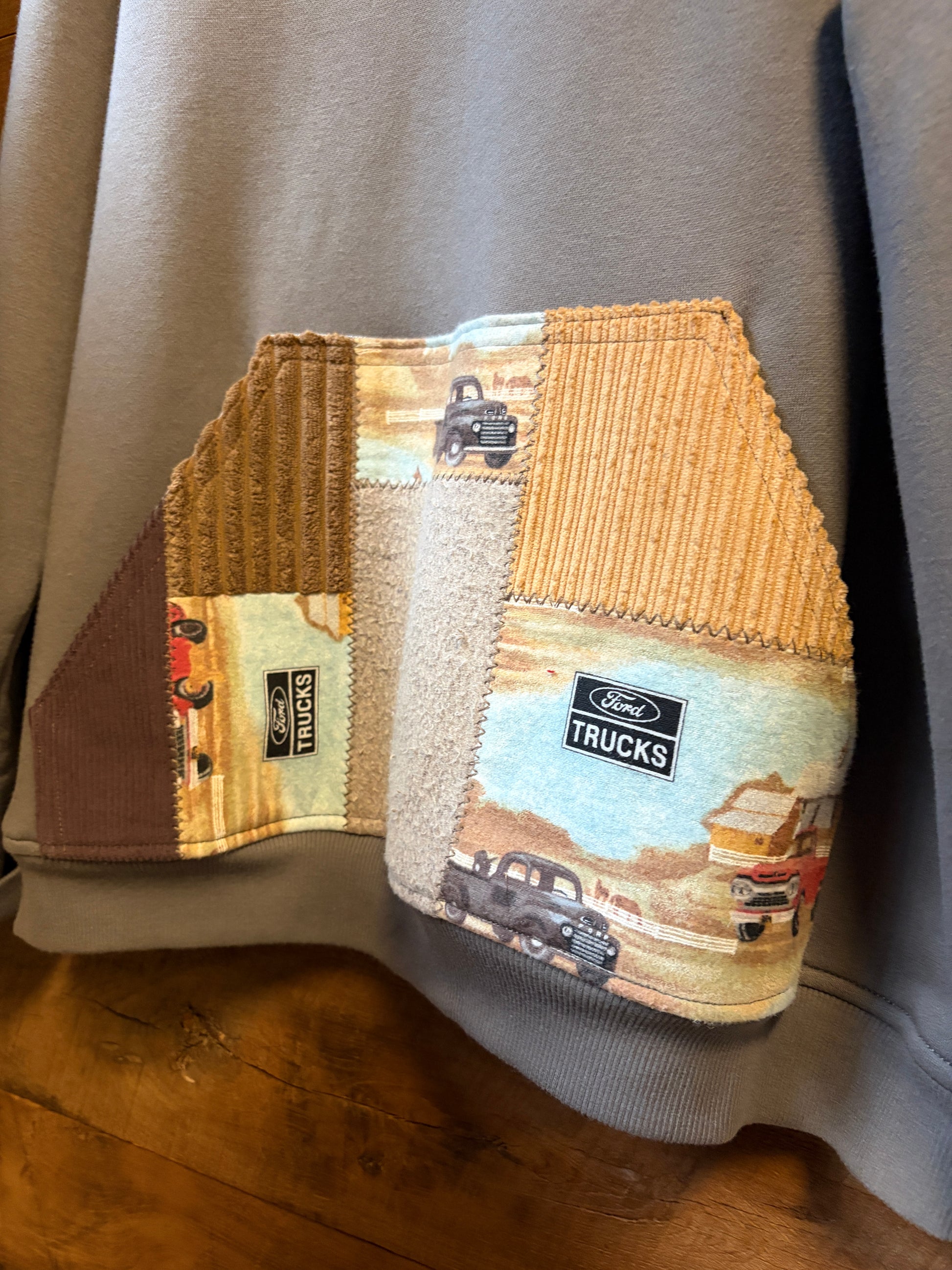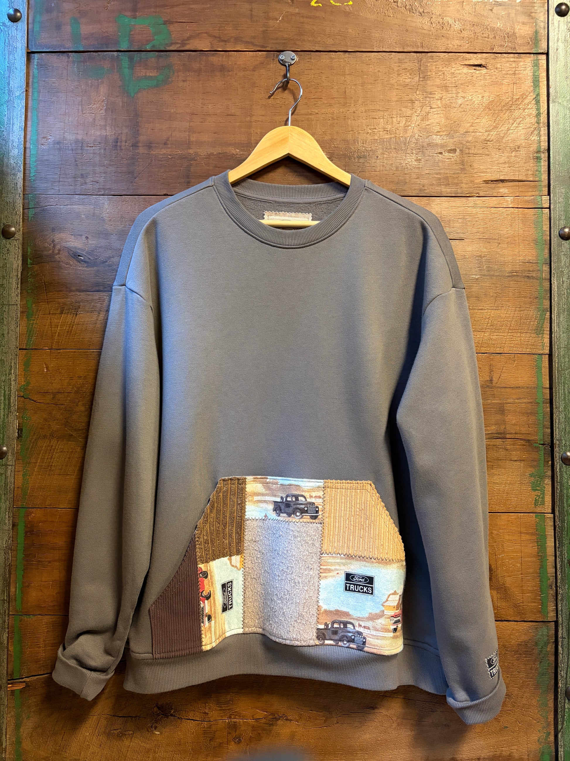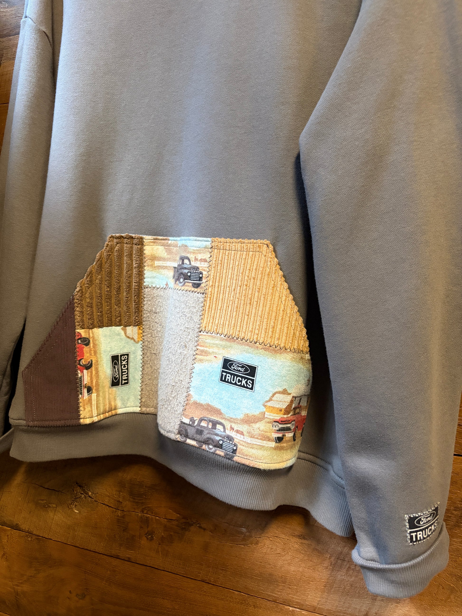 Get cozy in "The Ford," an upcycled crewneck sweatshirt with a relaxed fit that feels like a warm hug. Its soft fabric makes lounging irresistible, while the patchwork kanga pocket showcases charming vintage Ford trucks for a quirky, nostalgic touch. Perfect for adding a playful twist to your everyday comfort!