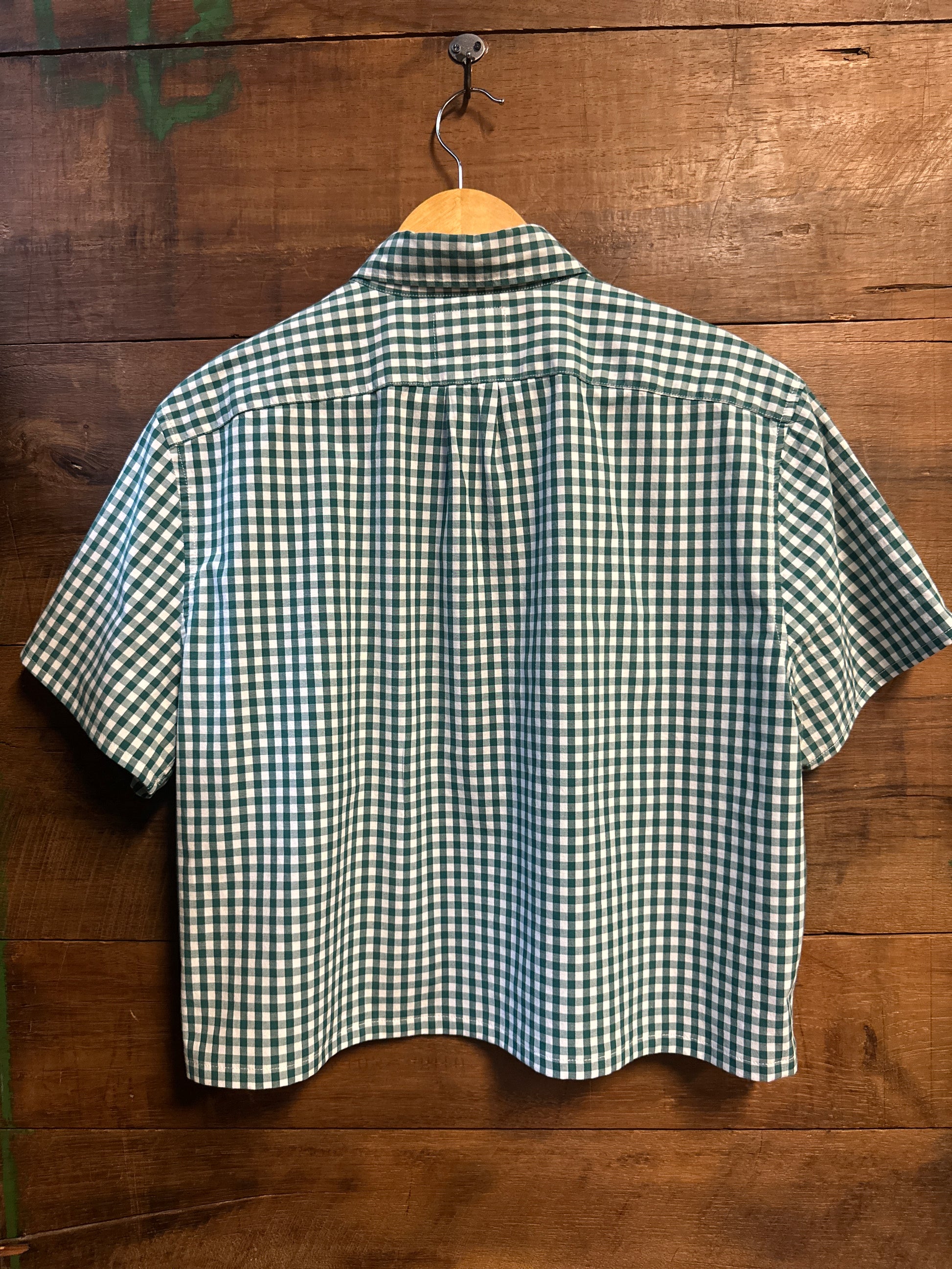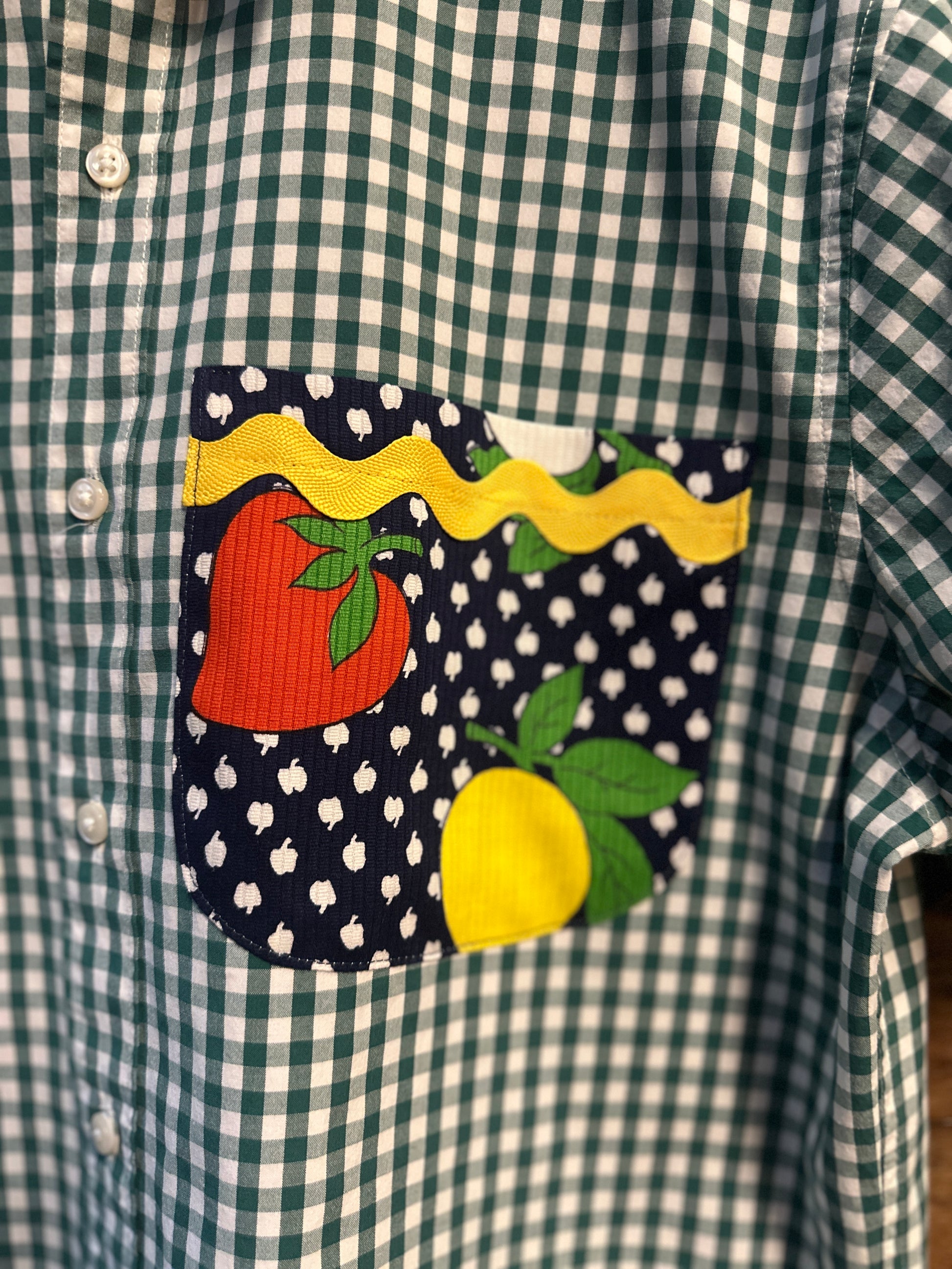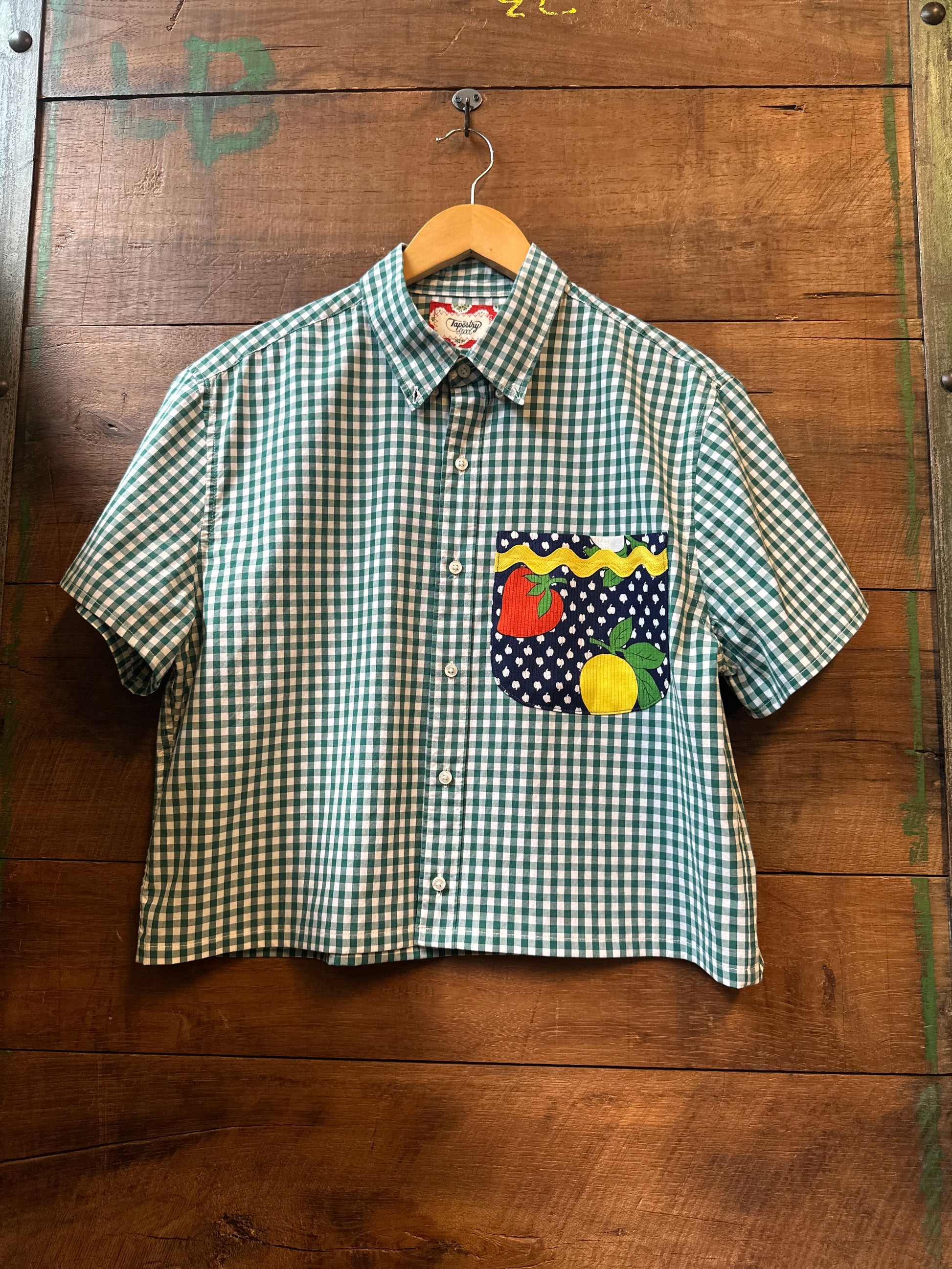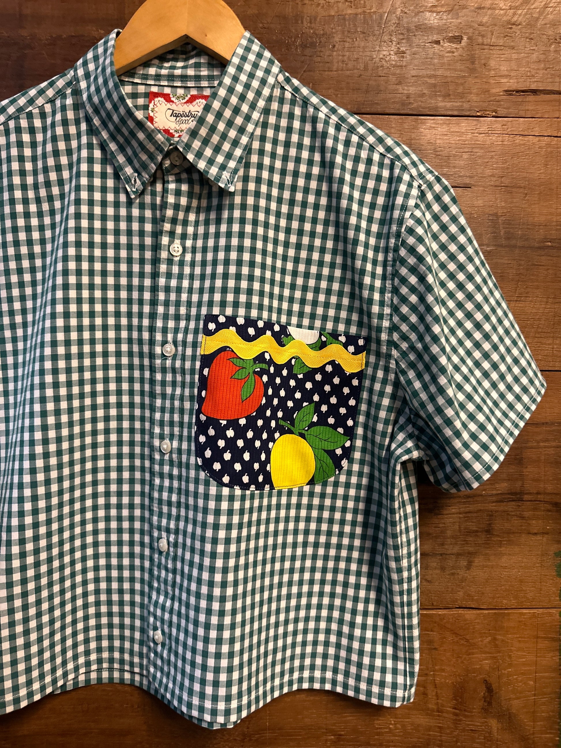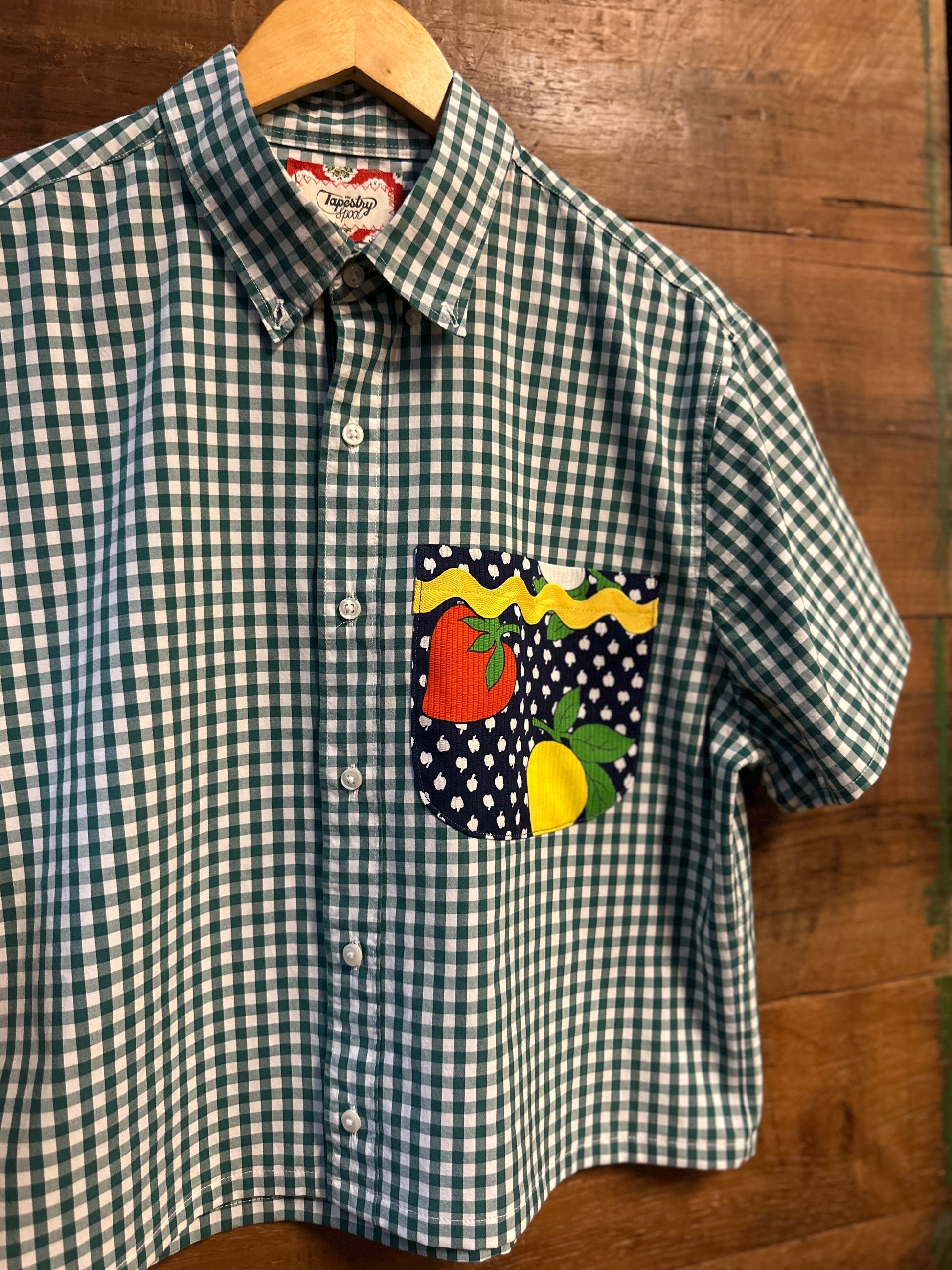 Bring a splash of fun to your wardrobe with The Fruity, an upcycled woven shirt featuring a lively green gingham check pattern. Its cropped fit adds a trendy edge, while the contrasting pocket bursts with bright, colorful fruit designs—perfect for those who love a playful twist on classic style. Sustainable and stylish, this shirt is a fresh pick for sunny days and cheerful vibes.