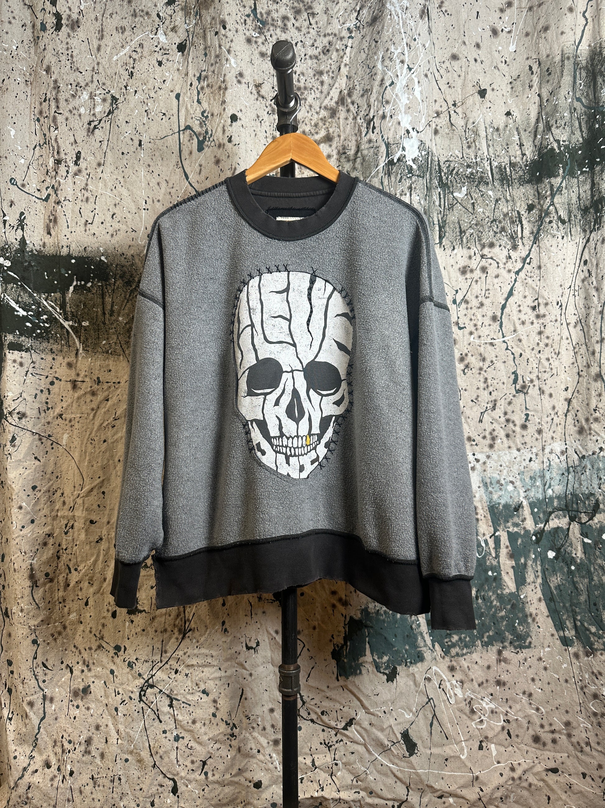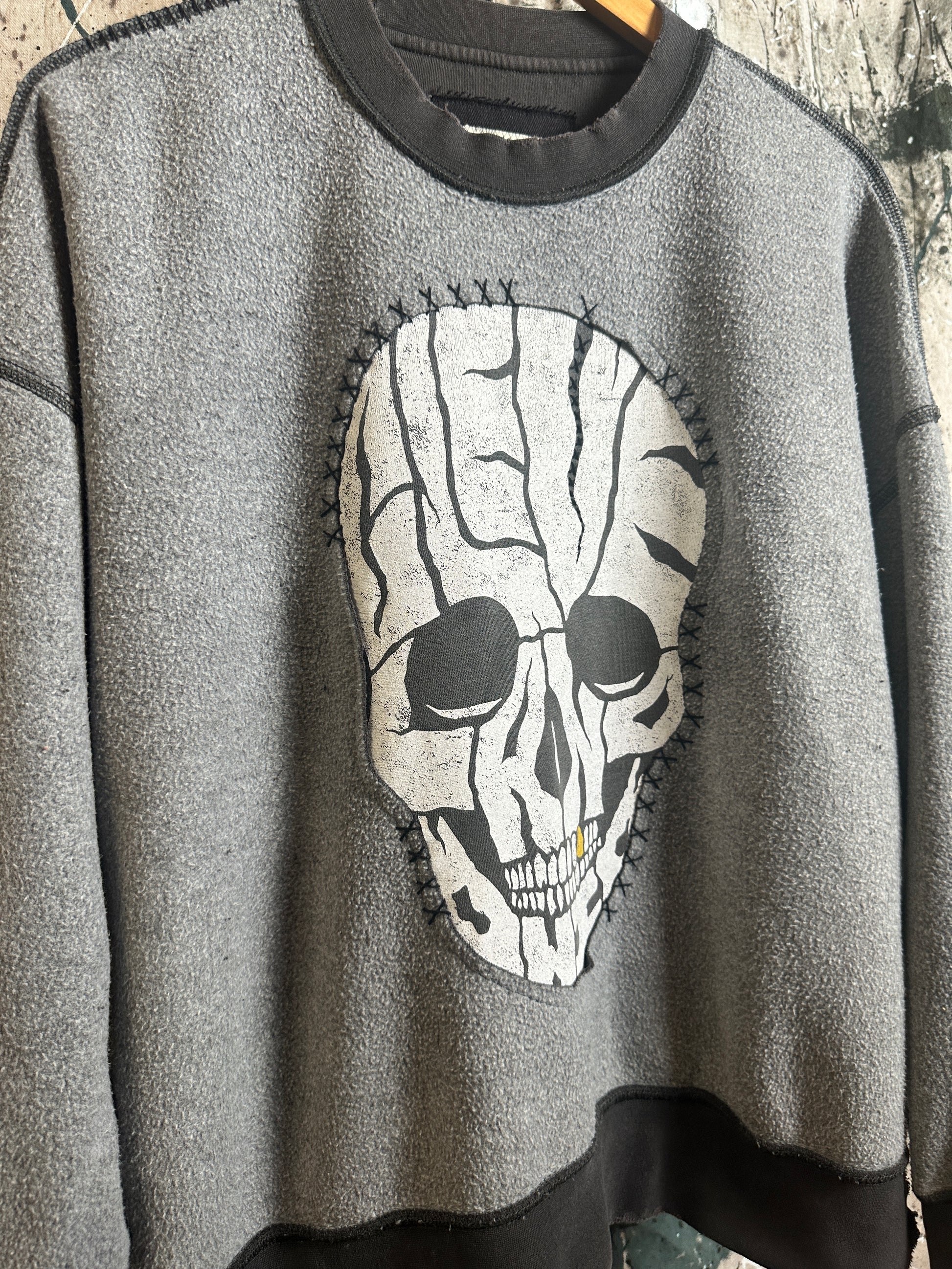 The Goldie is an upcycled crewneck sweatshirt that brings a playful edge to your wardrobe. Featuring a bold skull graphic on the front and detailed black embroidery stitching throughout, it adds cool vibes with every wear. Side slits at the hemline enhance its loose fit for extra comfort and style flair.
