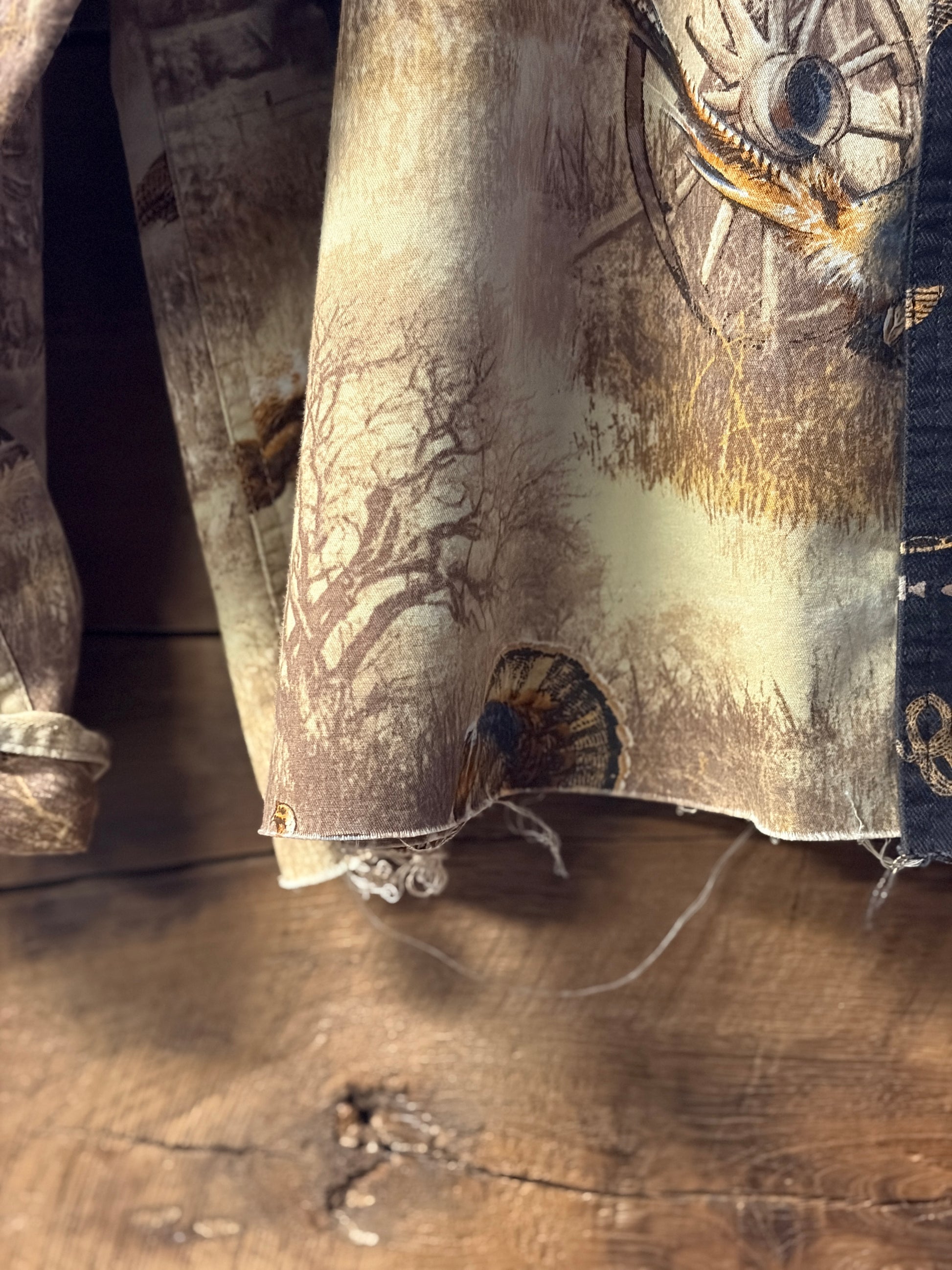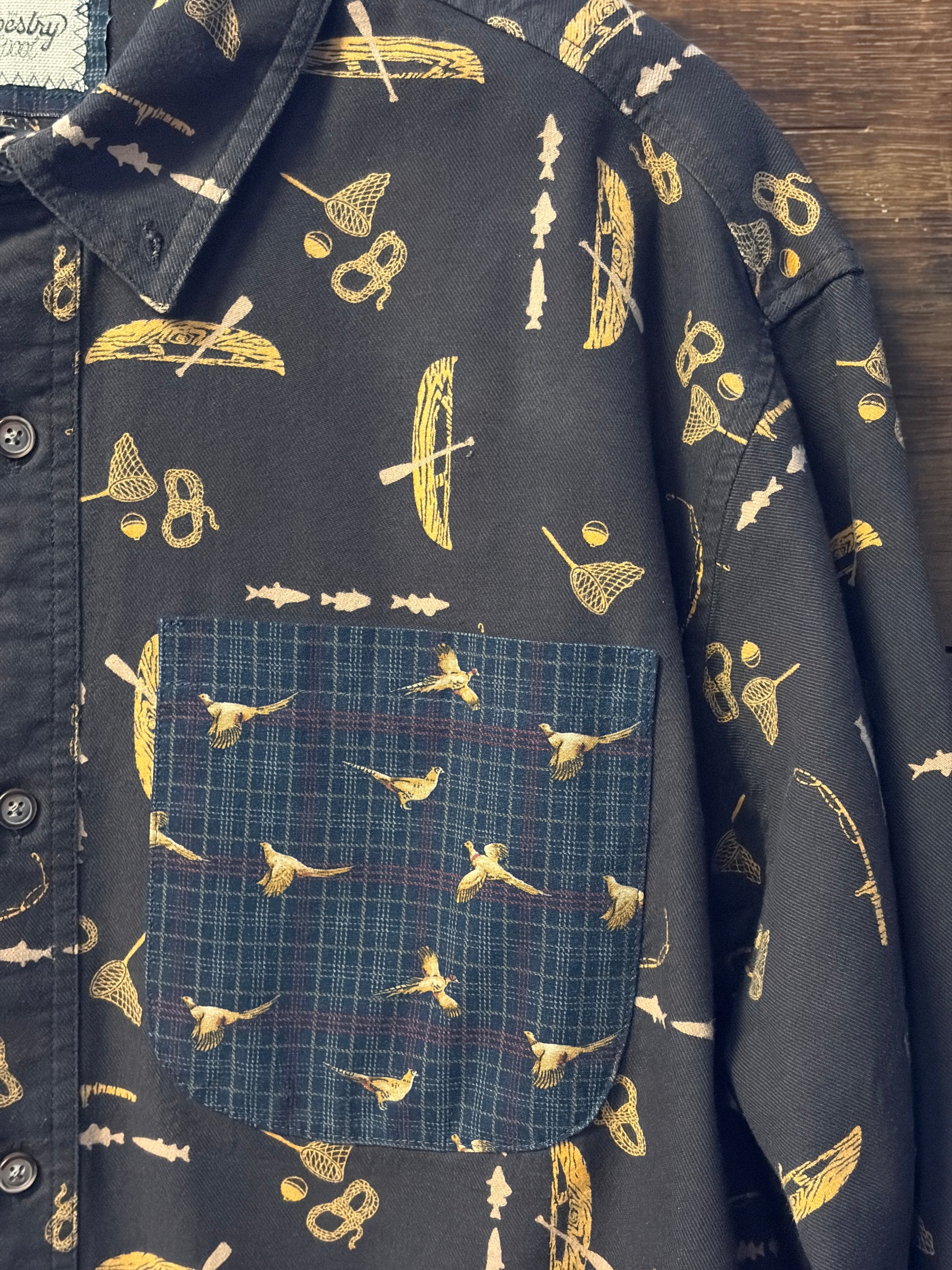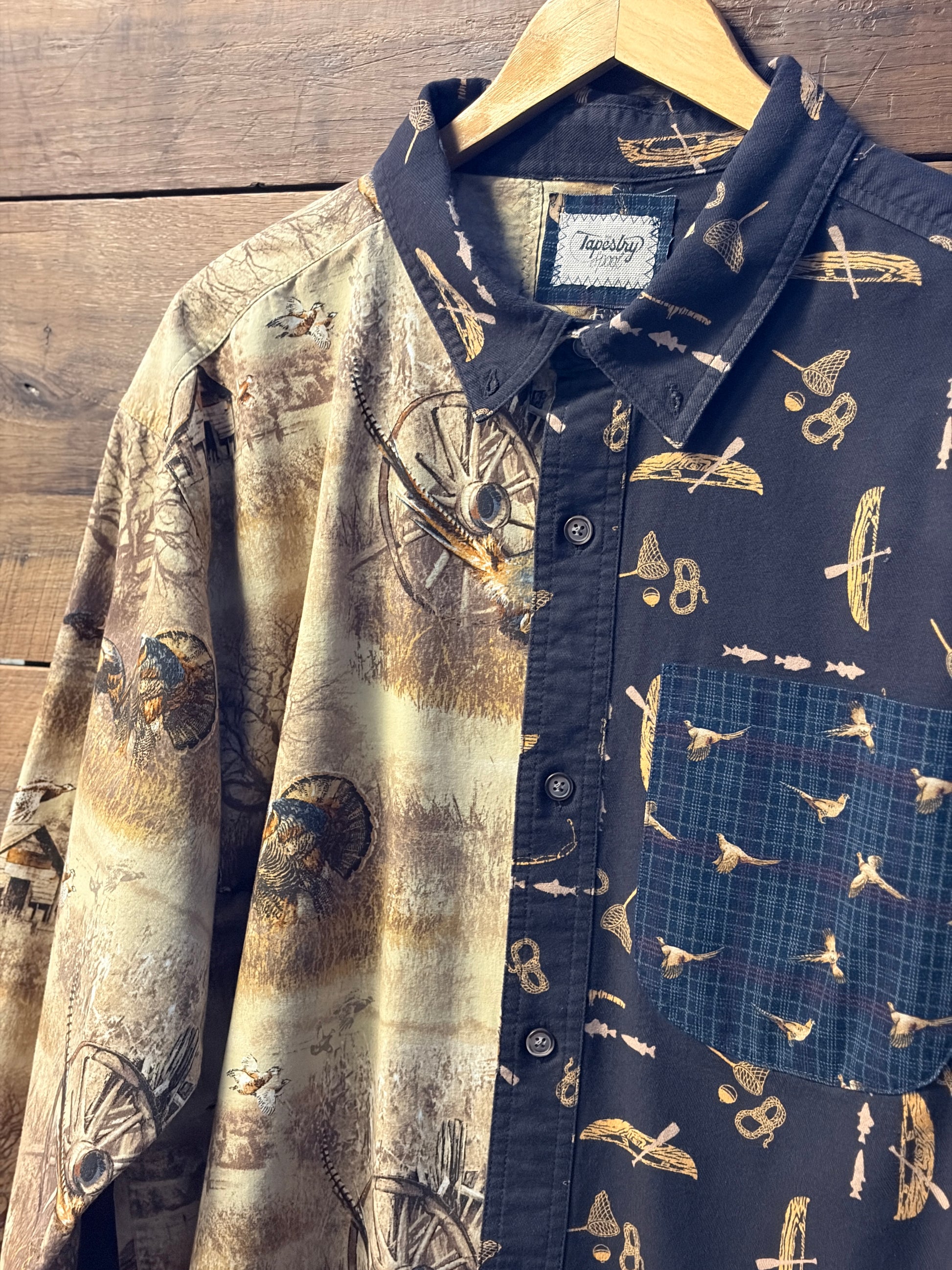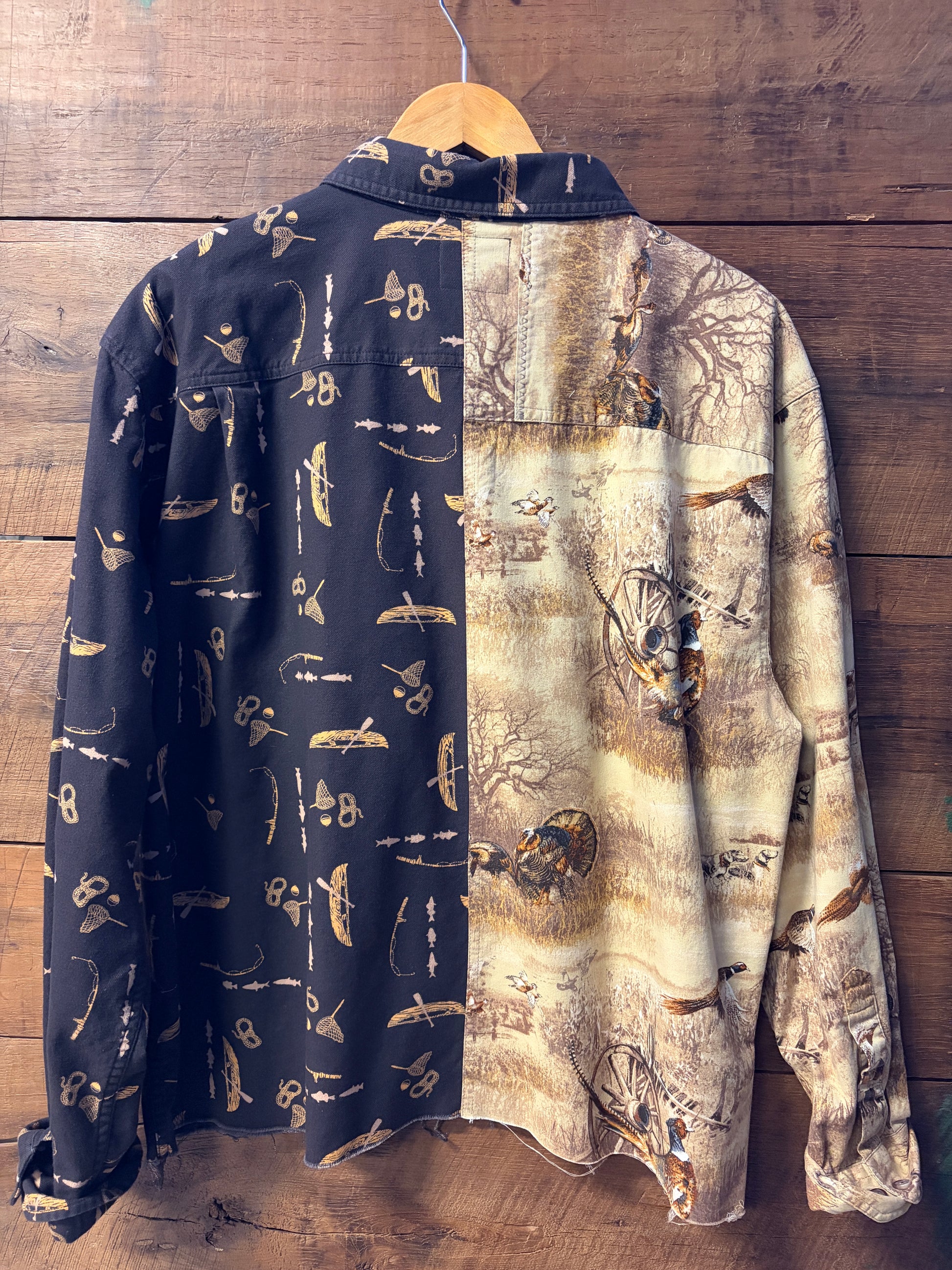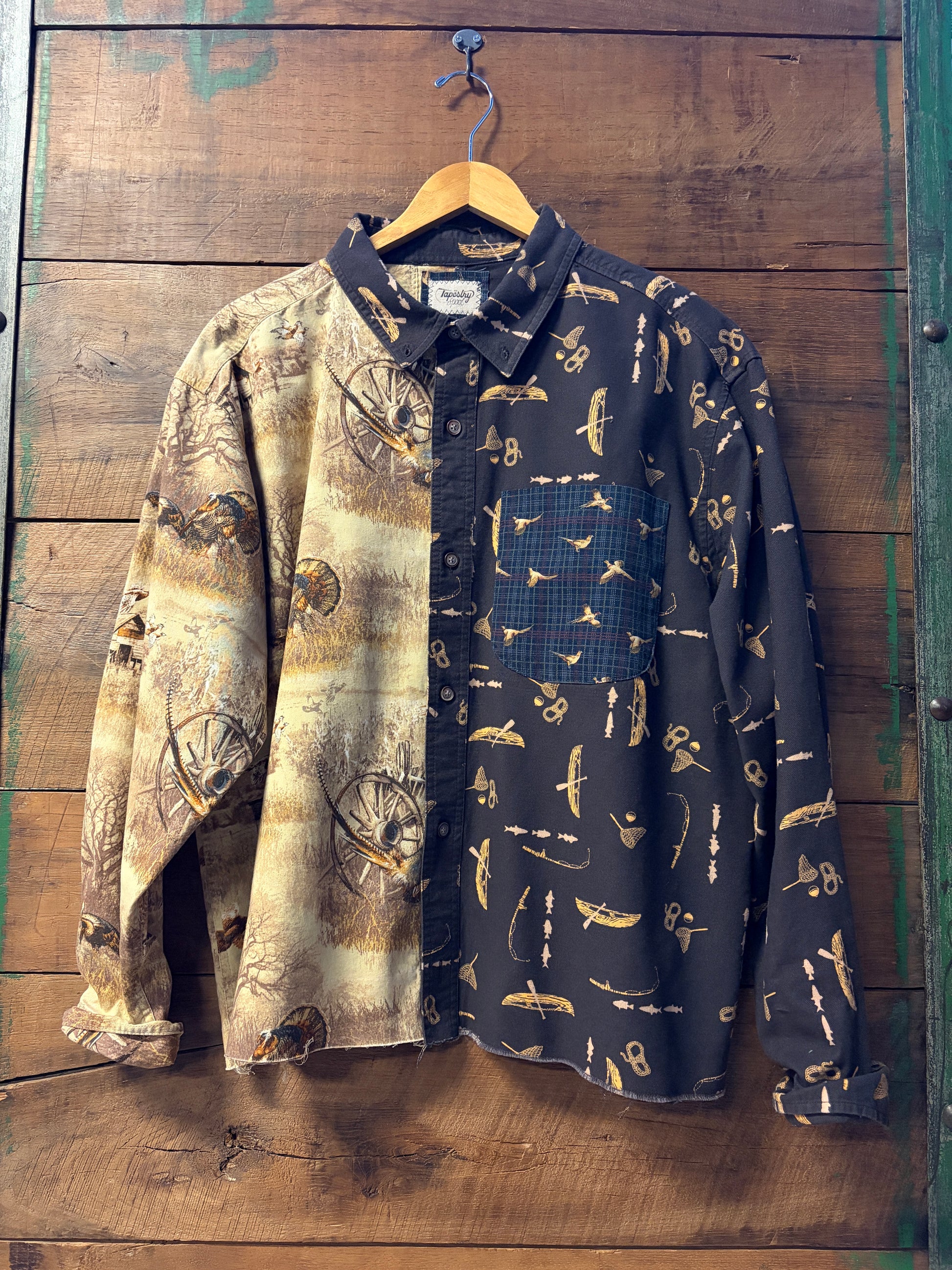 Meet The Griff, your new favorite oversized layer that's part flannel, all personality. This one-of-a-kind shirt combines three outdoor-themed flannel shirts into a bold 1/2 and 1/2 design, creating unexpected color and pattern combinations. The relaxed, oversized fit pairs perfectly with everything in your closet, while the raw edge hemline adds an intentionally undone vibe. Perfect for those who'd rather wear art than match their outfit.