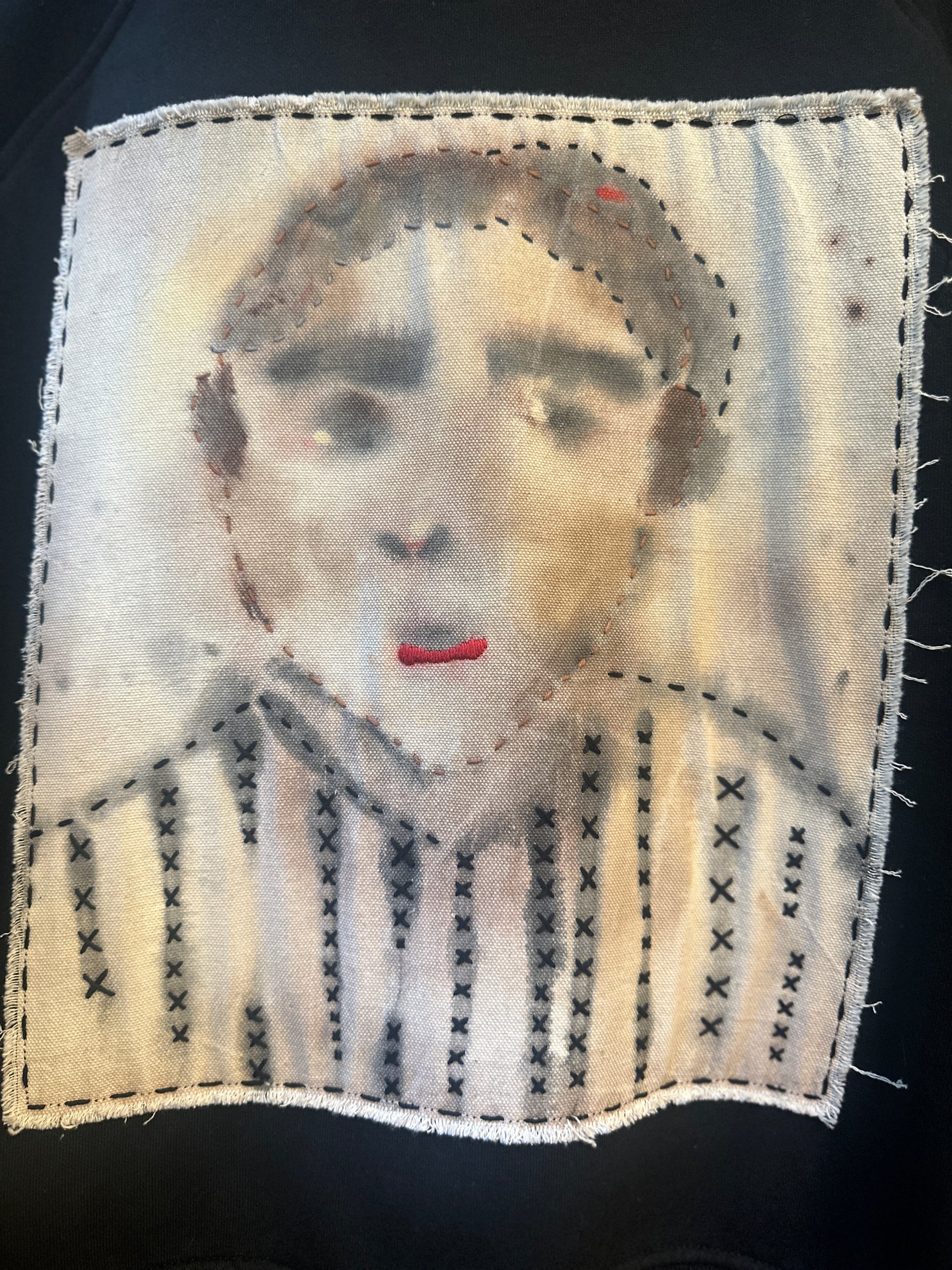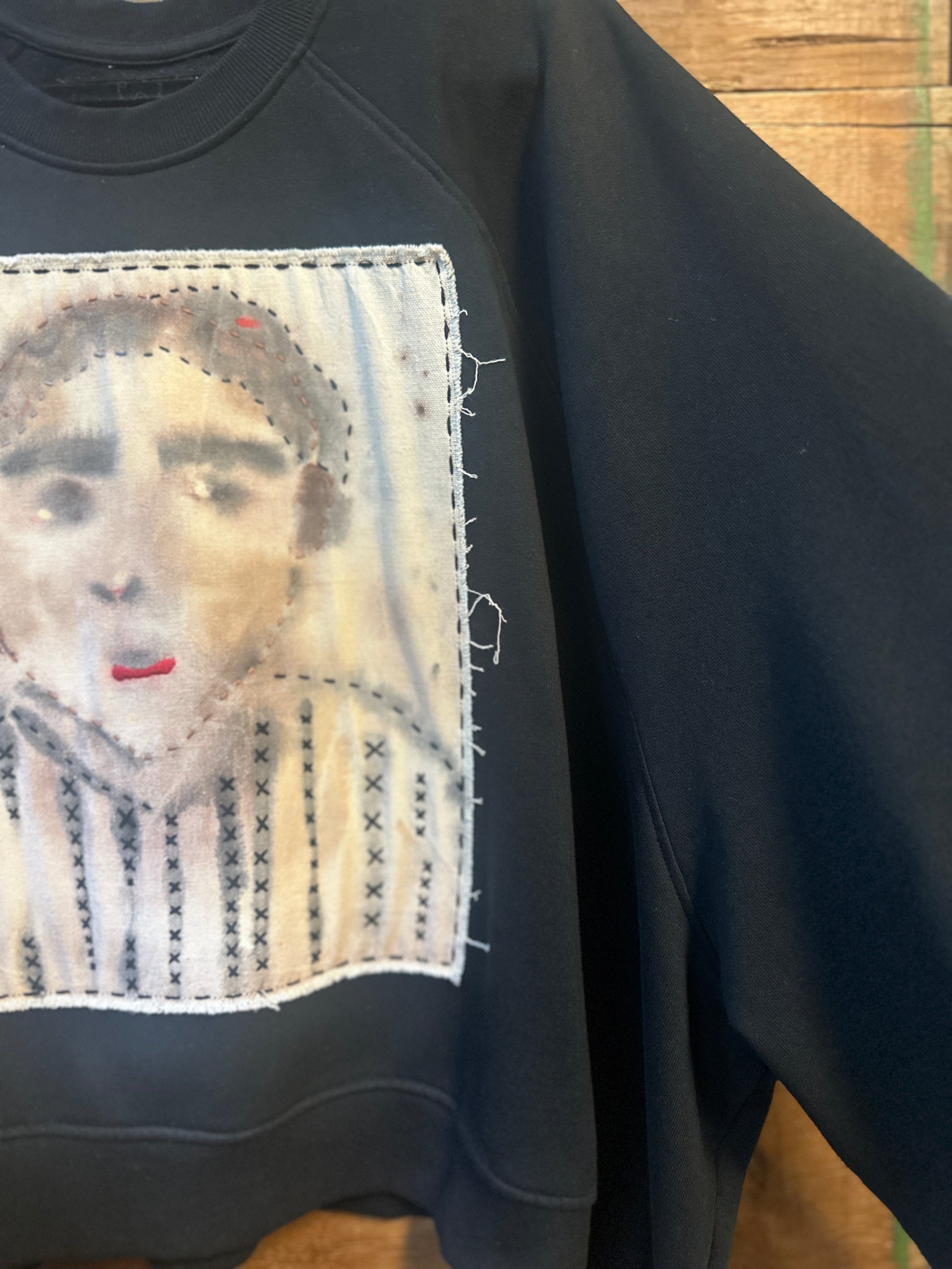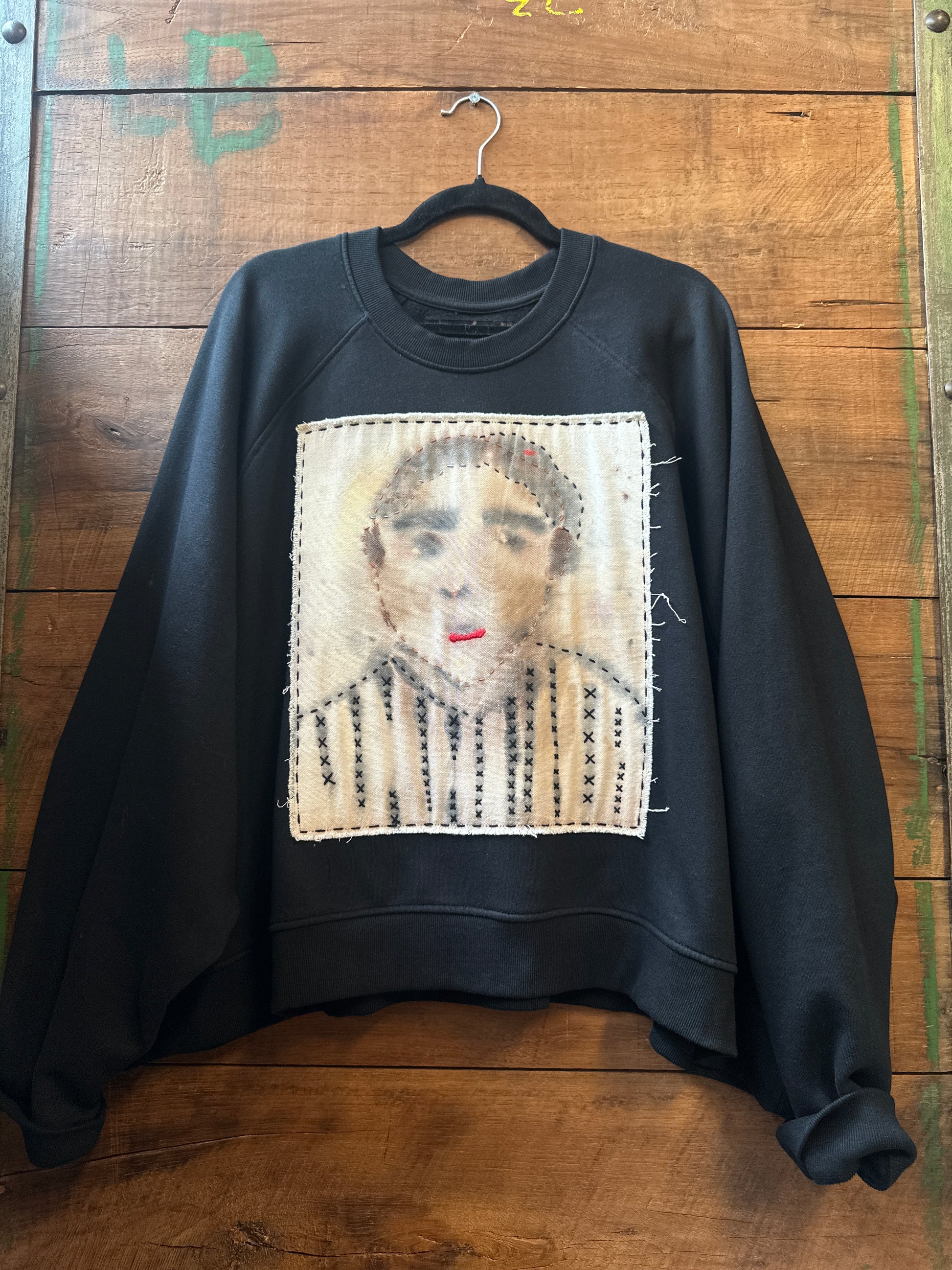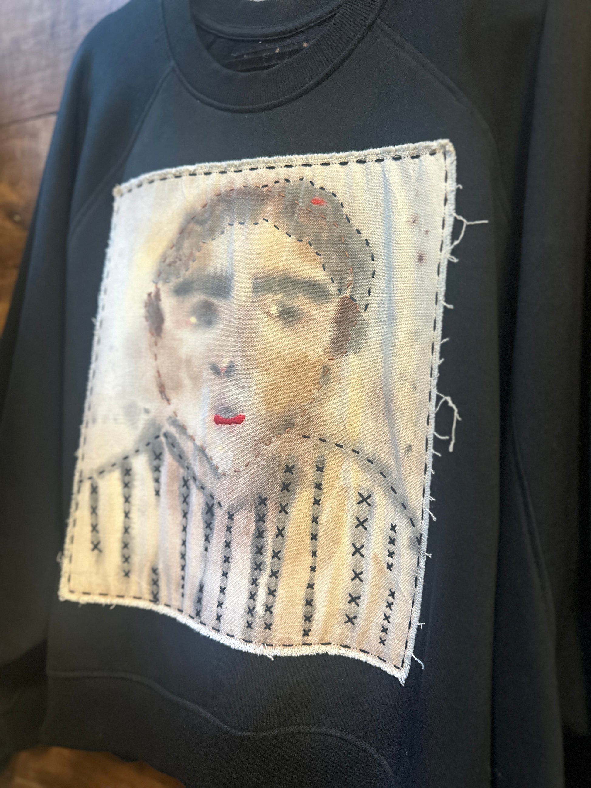 Get ready to stand out in The Guy, a sustainable and stylish crewneck sweatshirt. With an oversized fit and unique hand painted graphic on the front, this upcycled sweatshirt is a true statement piece. The embroidered stitching adds an extra touch of detail to this one-of-a-kind garment.