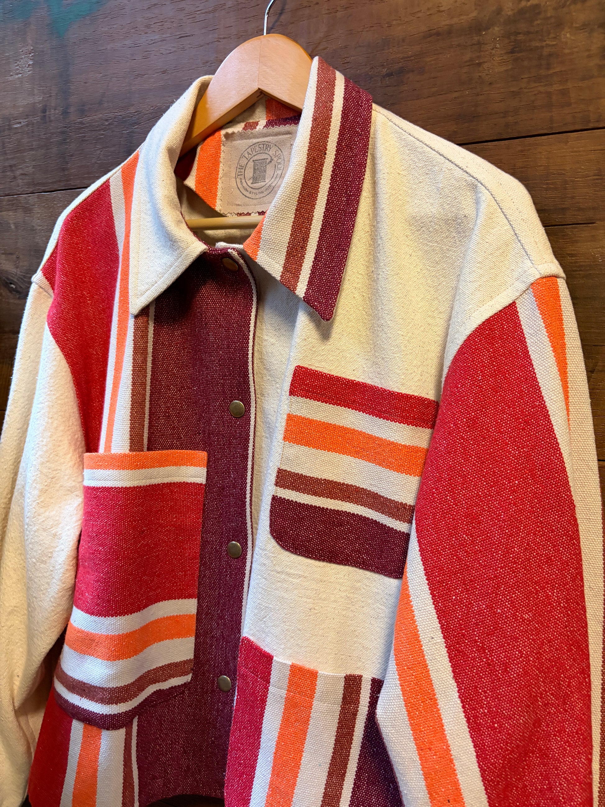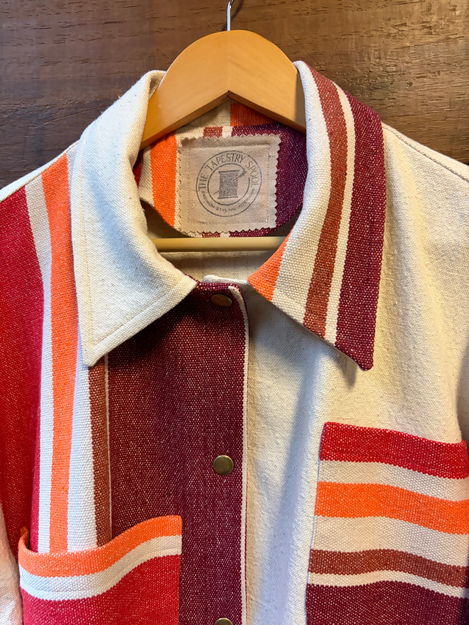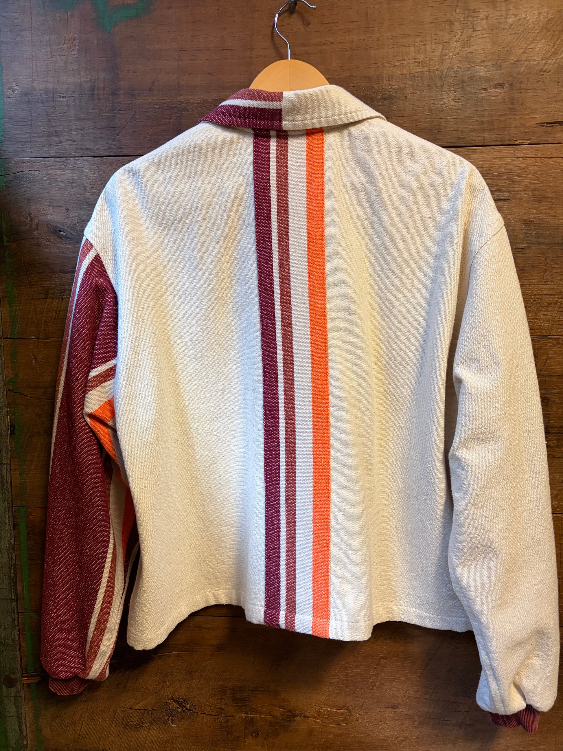 Stay cozy and stylish in The Hammock, a worker jacket crafted from upcycled canvas and a hammock (yes, a hammock!) for a super soft feel. Its oversized fit and knit cuffs add comfort, while playful contrasting stripes throughout and down the back give it a unique twist. Perfect for those who love eco-friendly fashion with a fun edge!