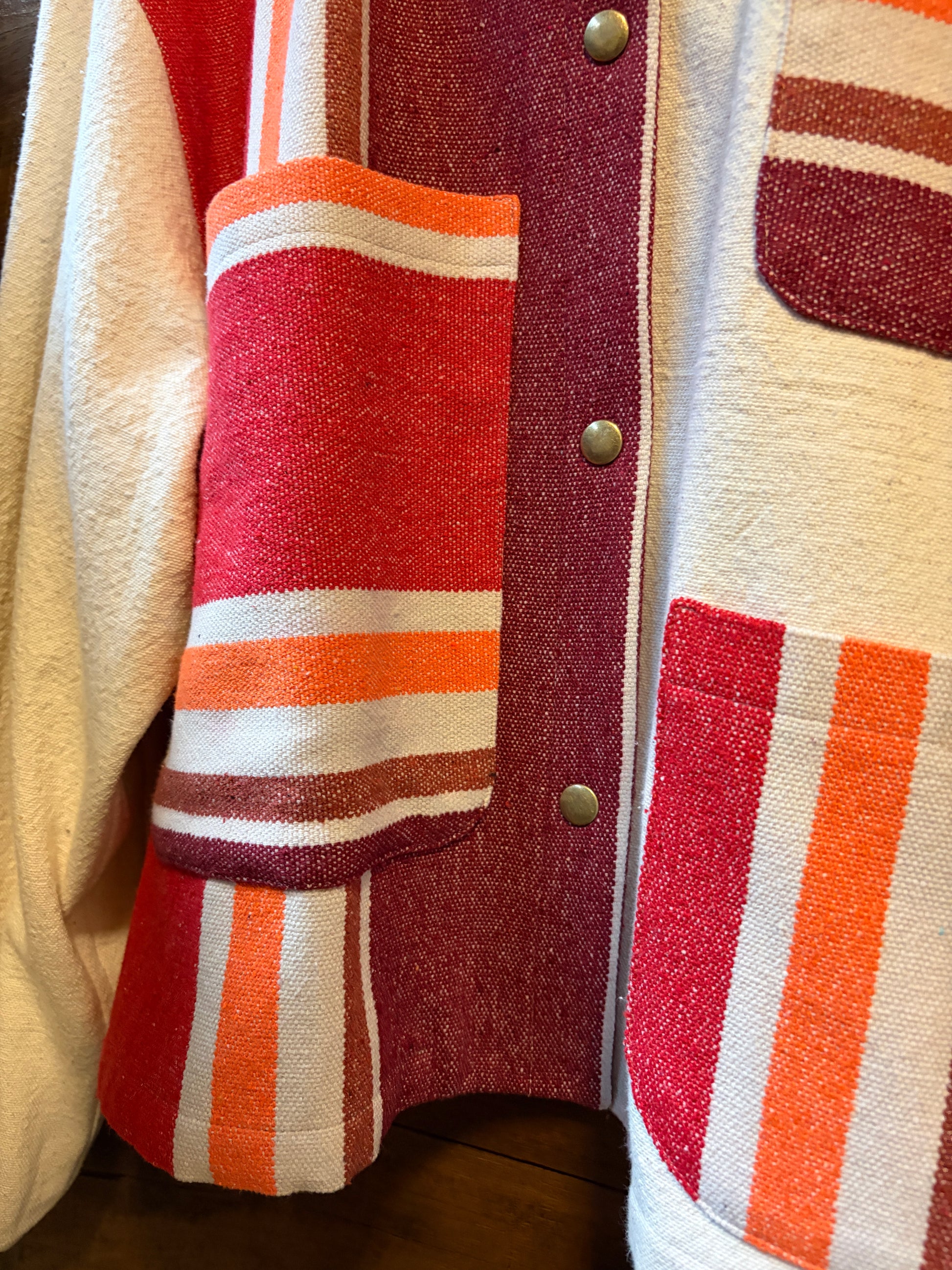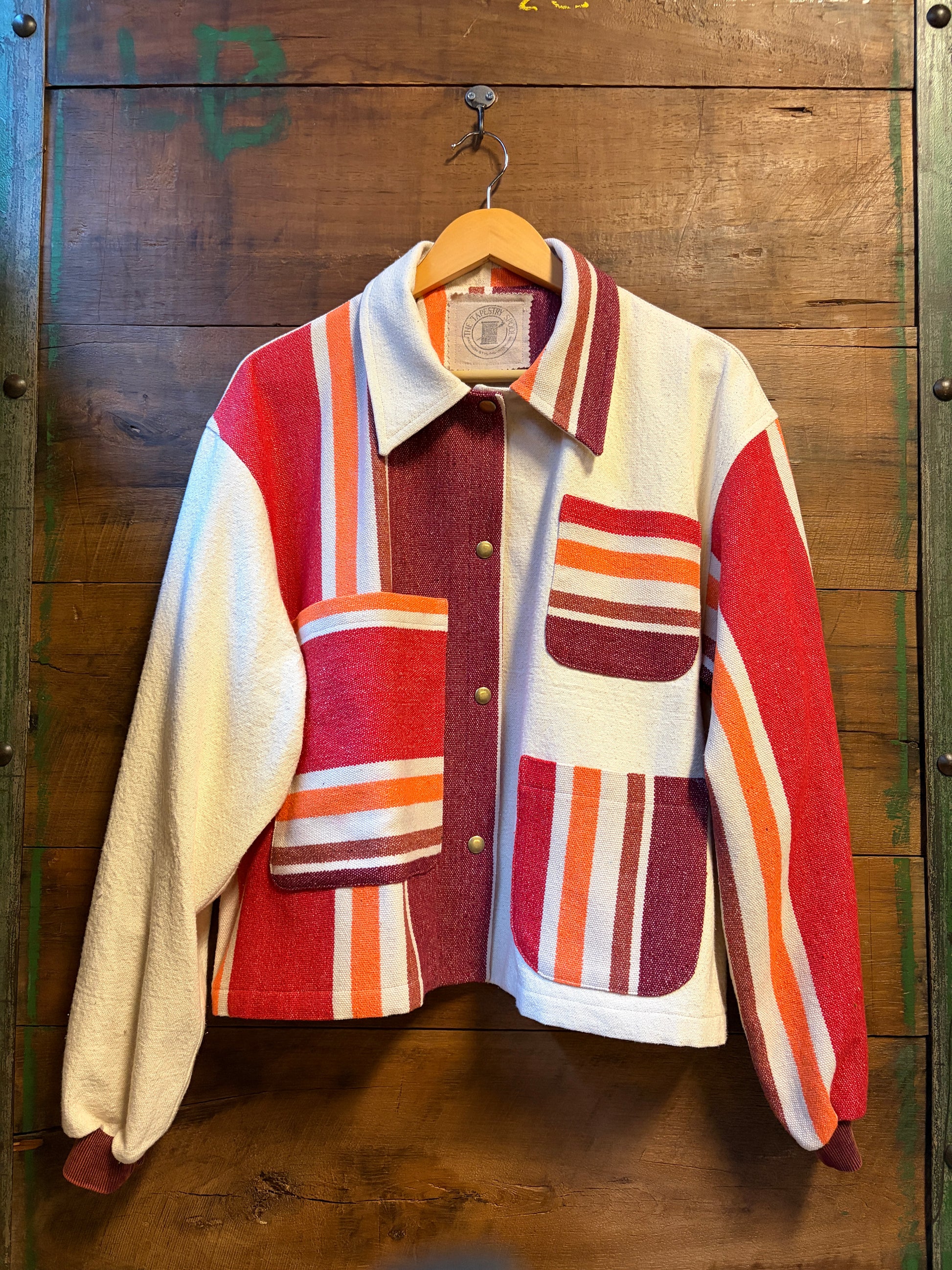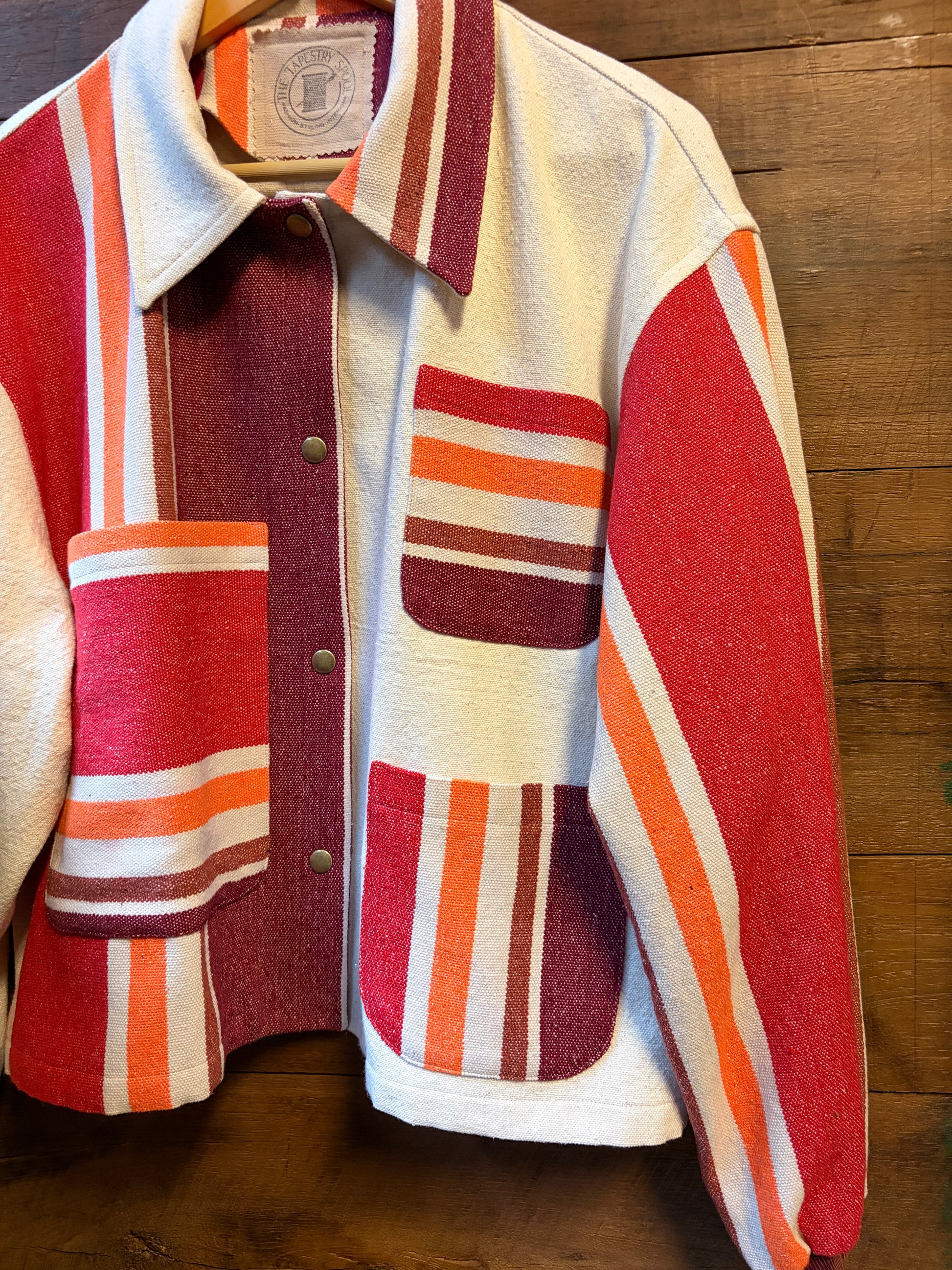 Stay cozy and stylish in The Hammock, a worker jacket crafted from upcycled canvas and a hammock (yes, a hammock!) for a super soft feel. Its oversized fit and knit cuffs add comfort, while playful contrasting stripes throughout and down the back give it a unique twist. Perfect for those who love eco-friendly fashion with a fun edge!