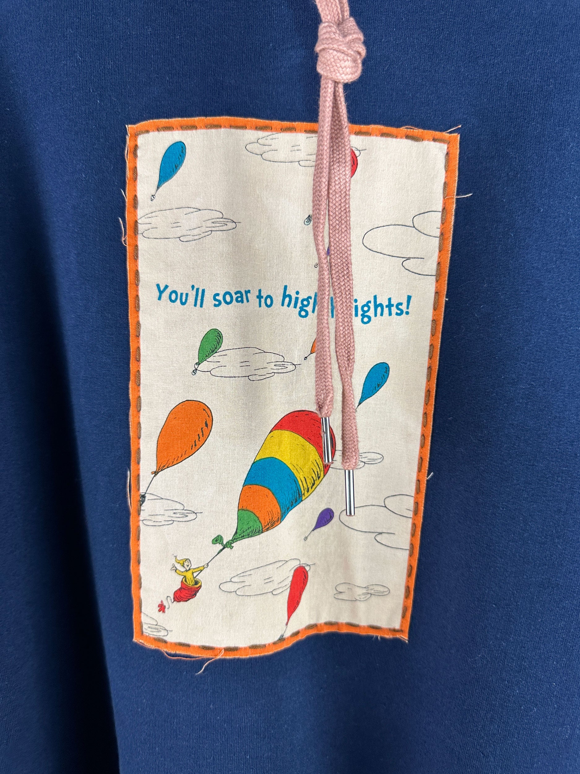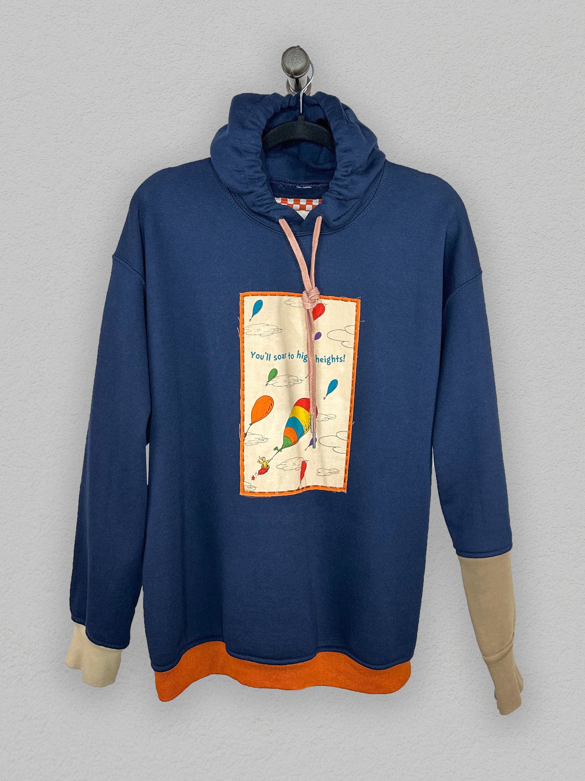 "The Heights" hoodie turns fashion into an eco-friendly adventure with its upcycled material and tea-dyed Dr. Seuss applique. Its unique cuff detail adds a playful twist to the classic hoodie style. Stay cozy and stylish while making a positive impact on the environment.