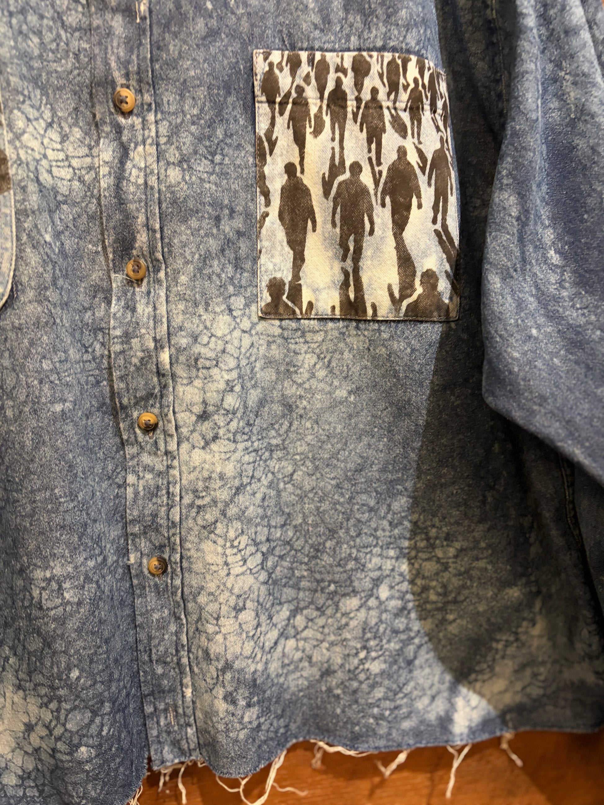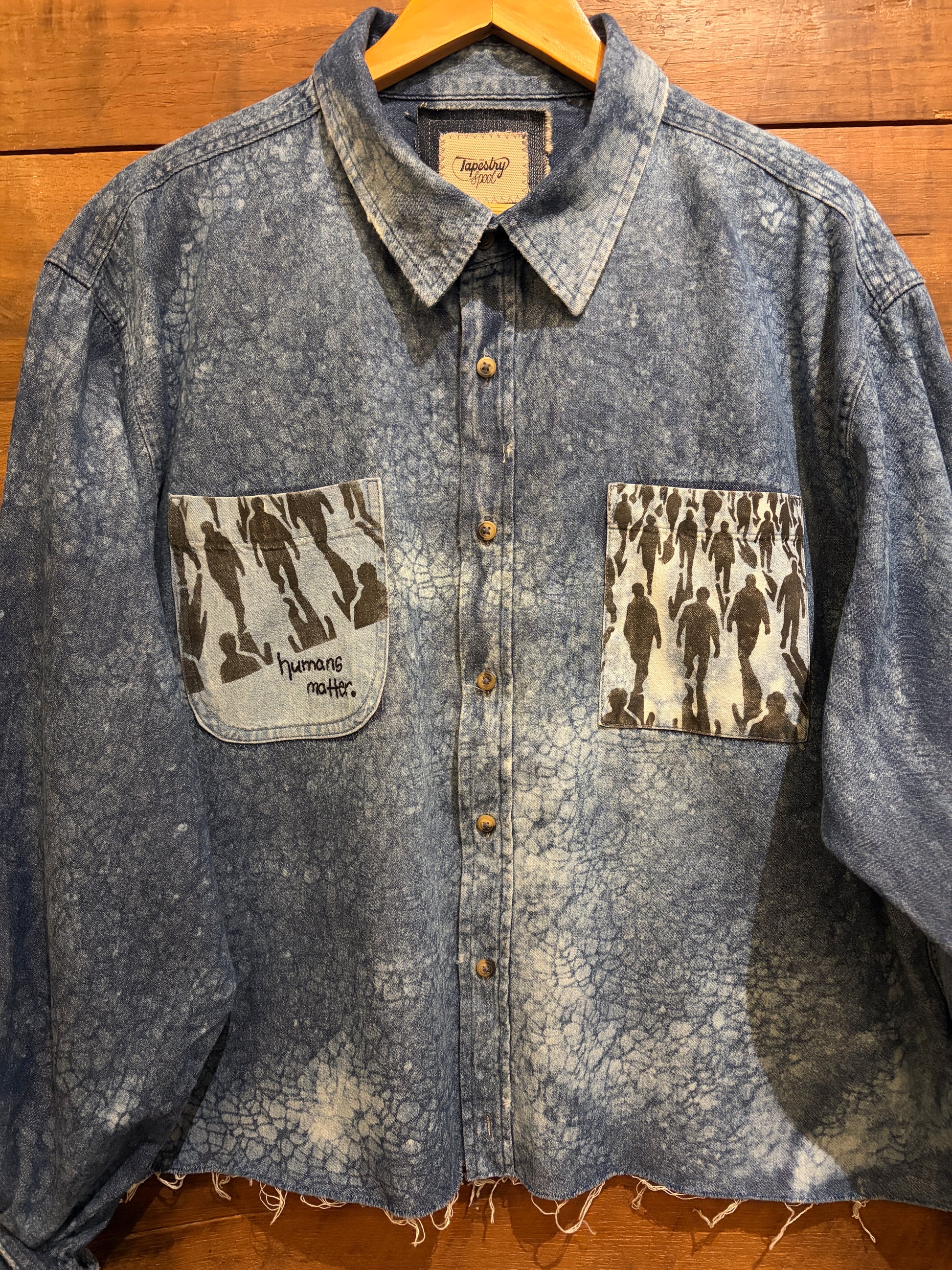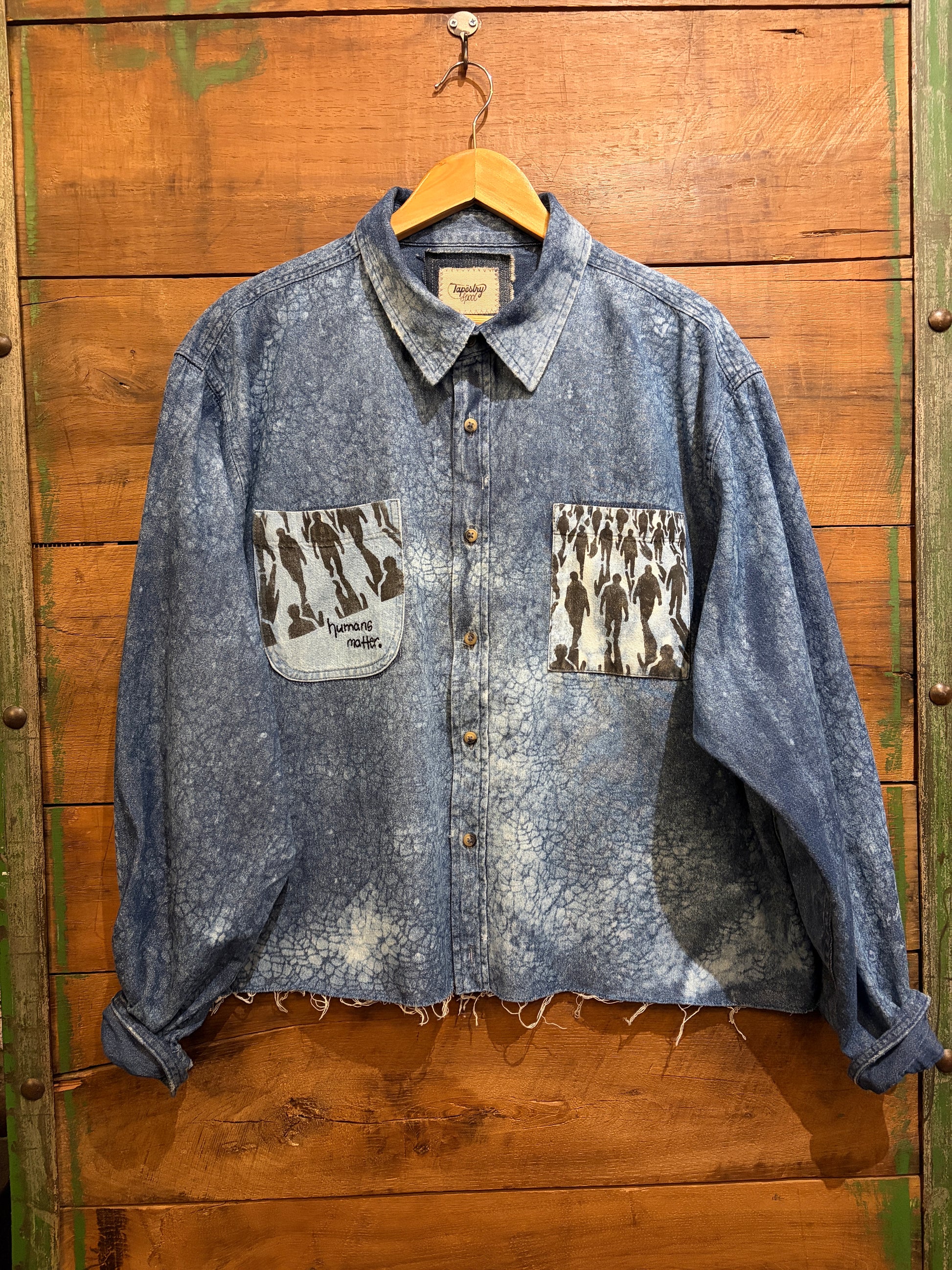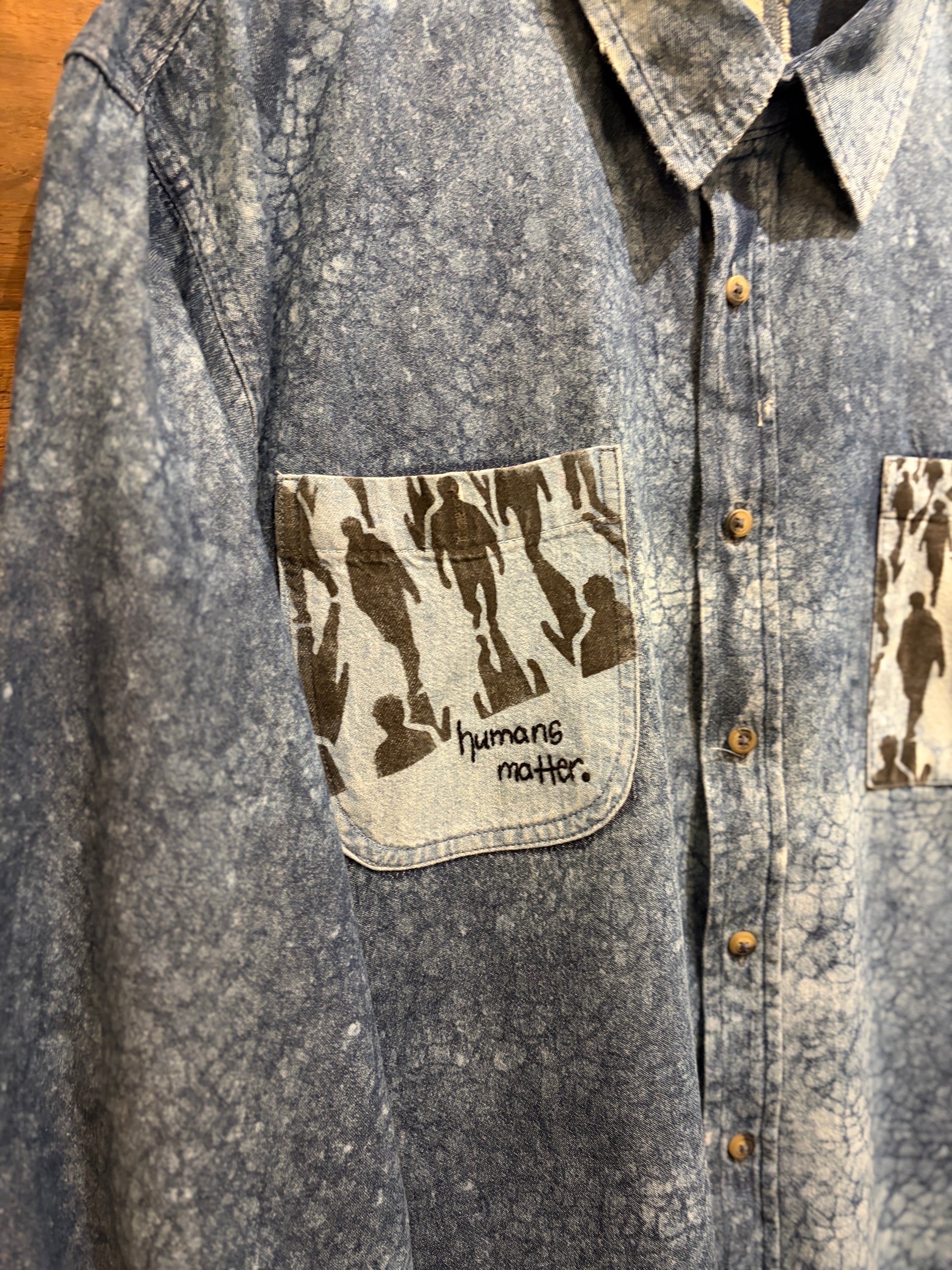 Throw on this oversized upcycled denim shirt and wear your values out loud. Featuring an all-over bleached design with hand-stenciled pocket details and "humans matter" embroidery, it's a one-of-a-kind piece that proves sustainability can be seriously stylish. The raw hemline adds that effortlessly cool edge. Perfect for anyone who believes fashion should make a statement, and not just about looking good.
