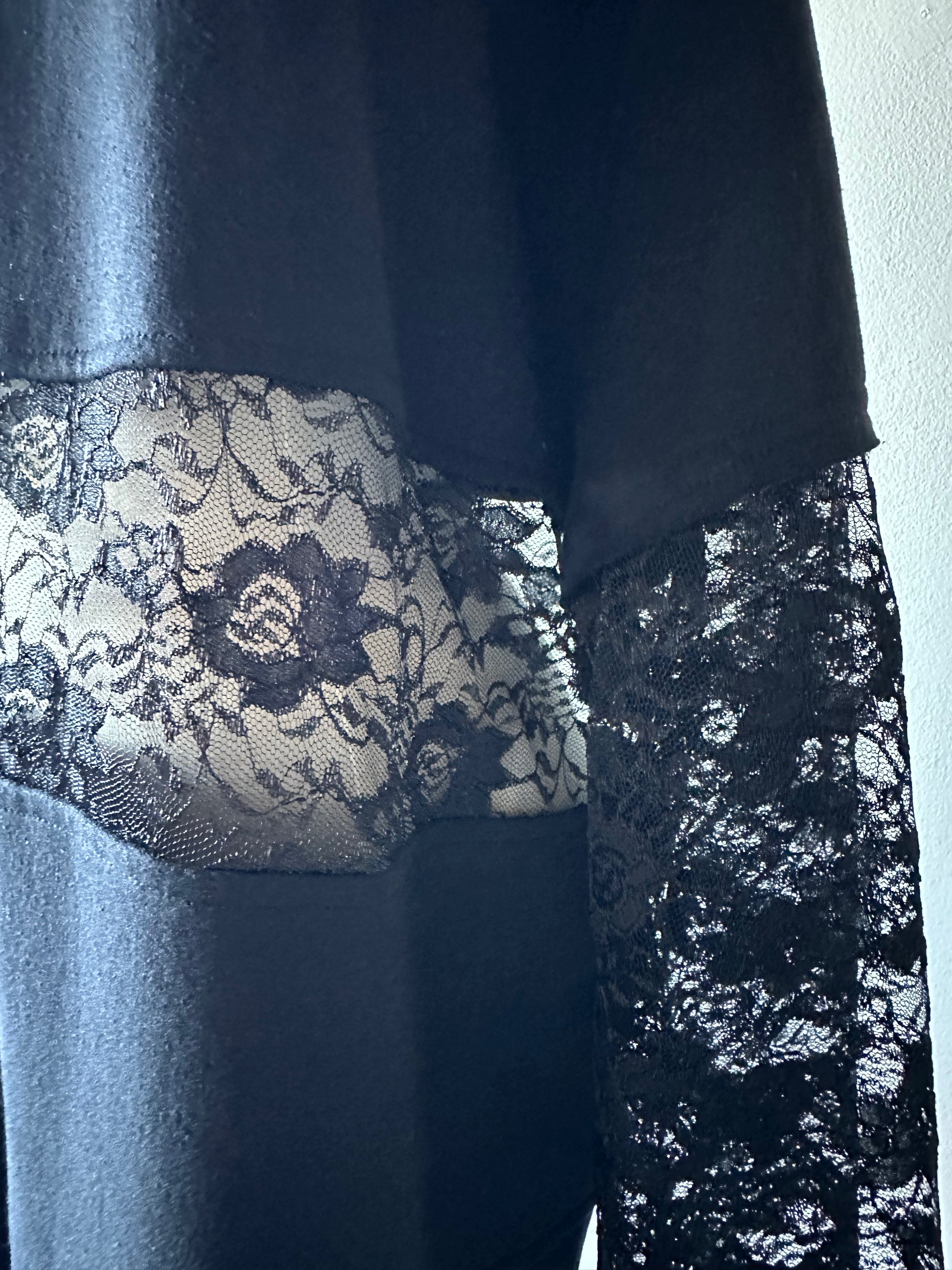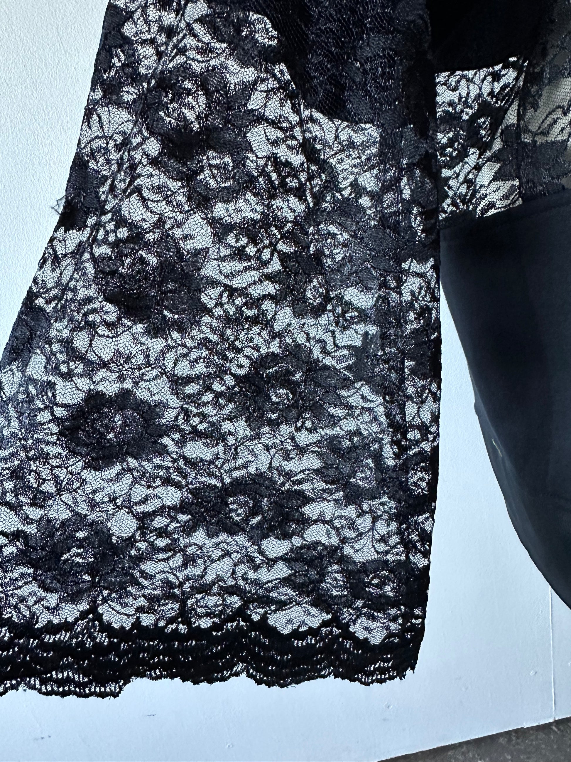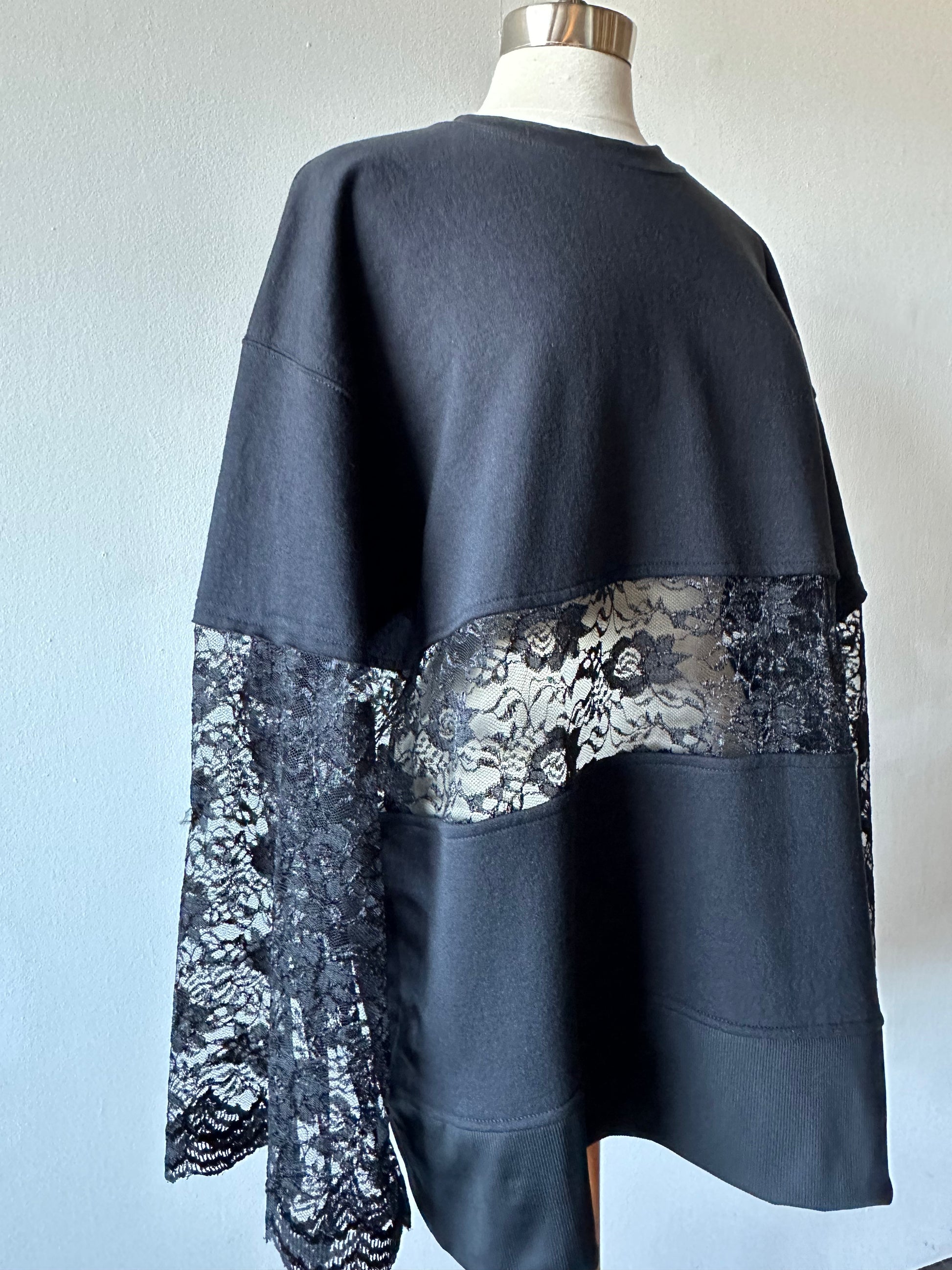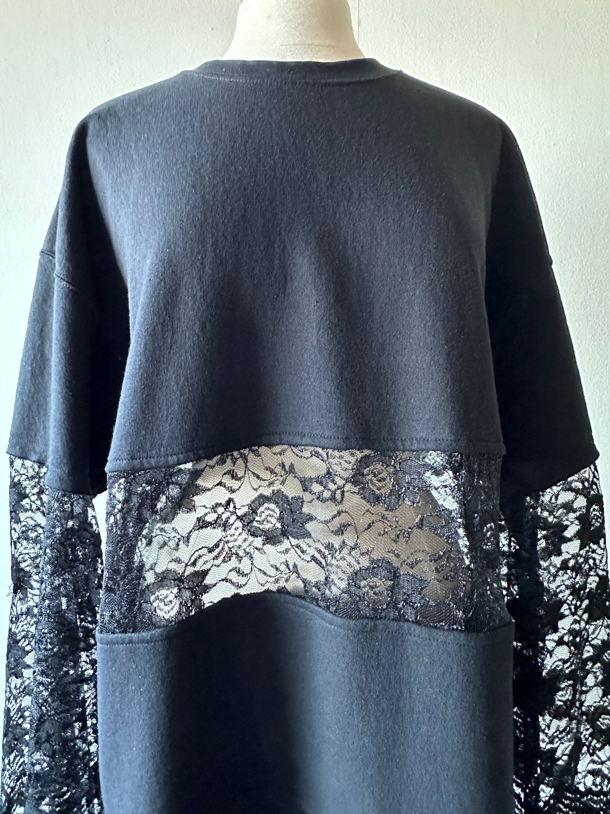 Get cozy in The Jessa, our upcycled crewneck sweatshirt with a twist! Featuring a delicate lace middle and charming lace bell sleeves, this sweatshirt brings style and sustainability together for a unique and comfy look. Long enough to wear as a dress or with leggings underneath in a relaxed oversized fit.