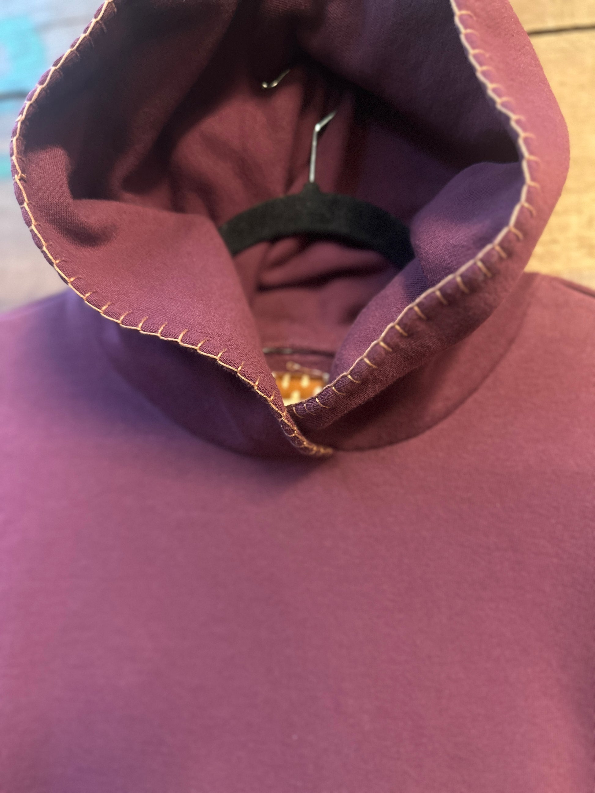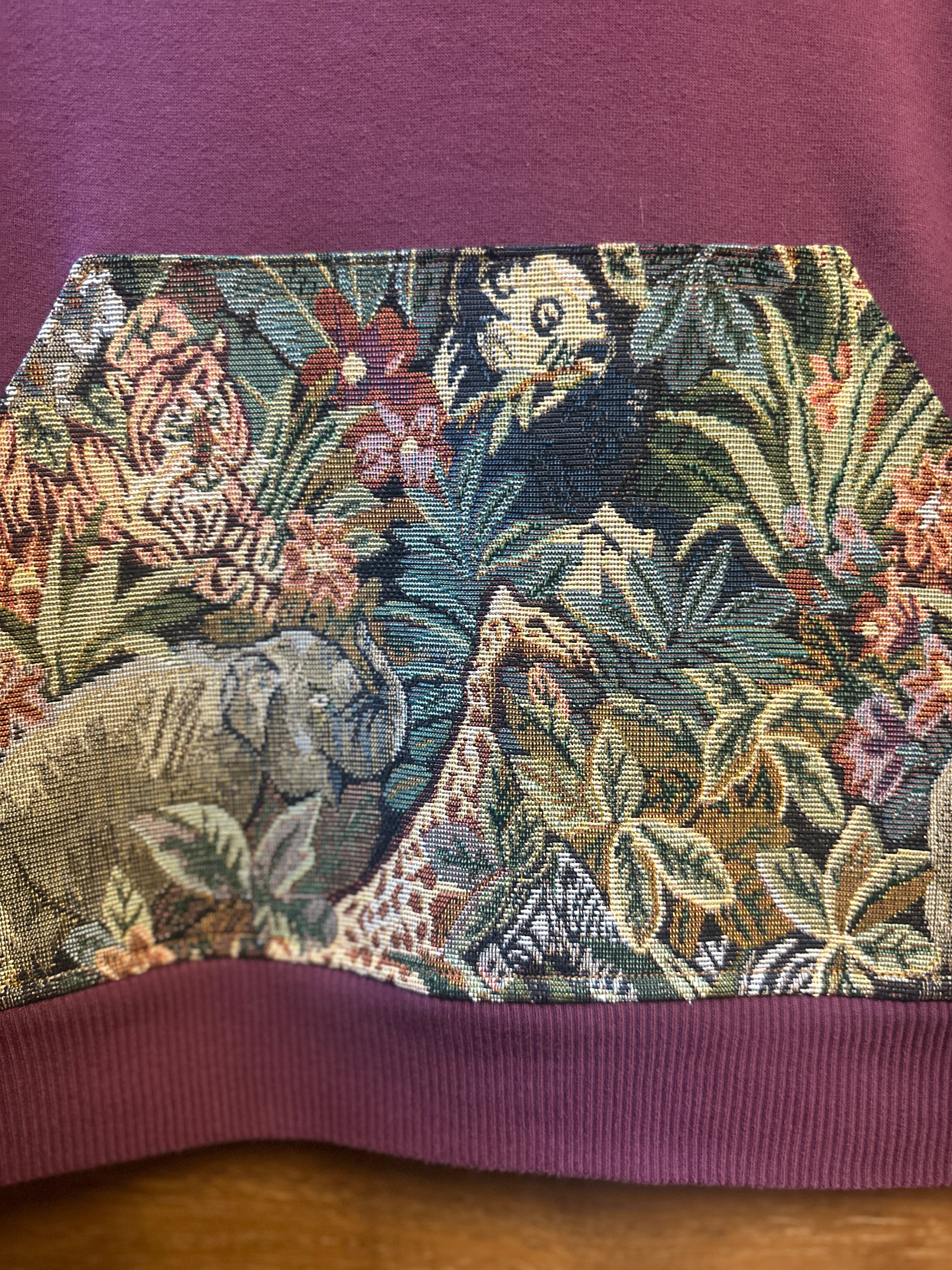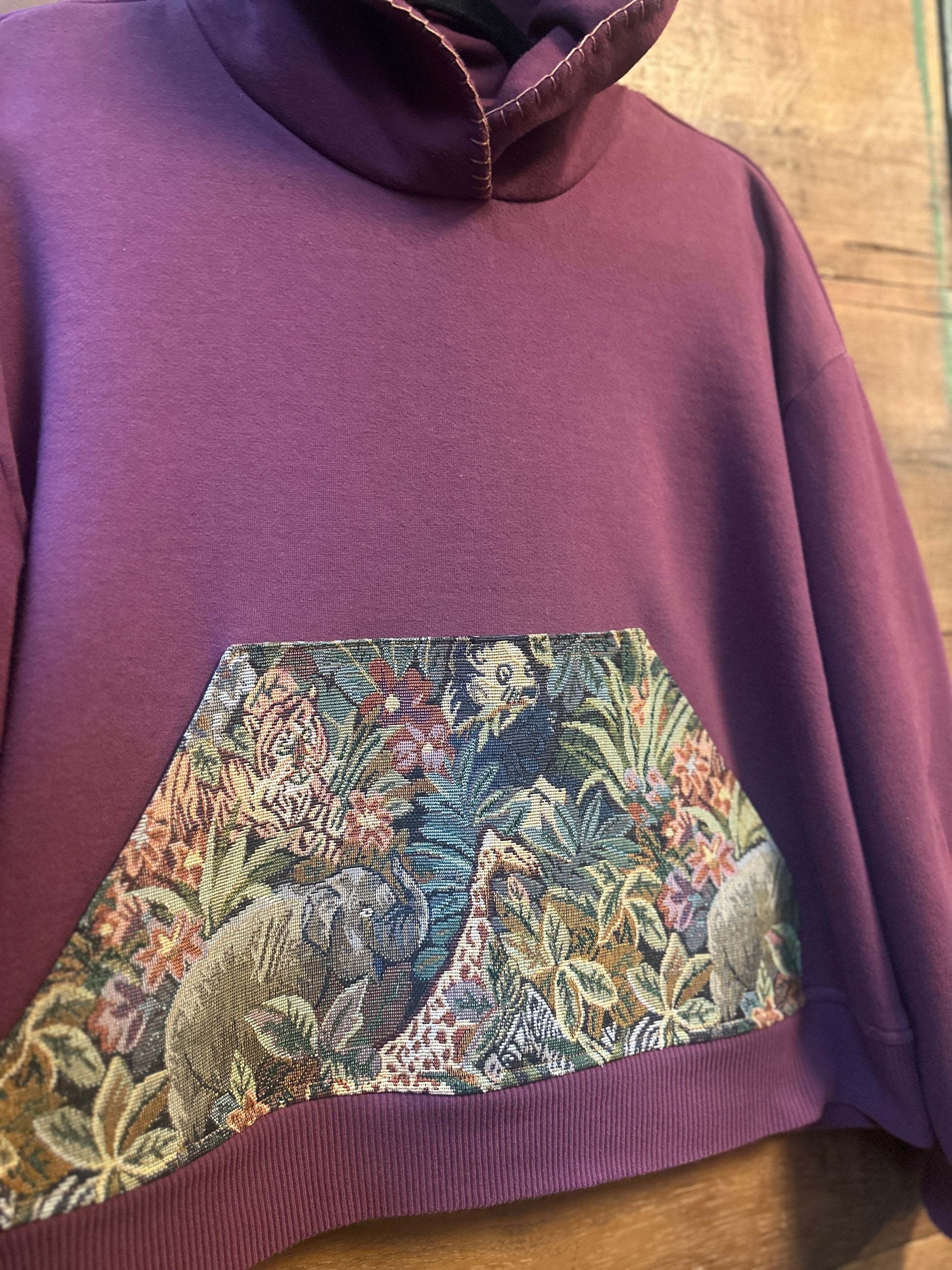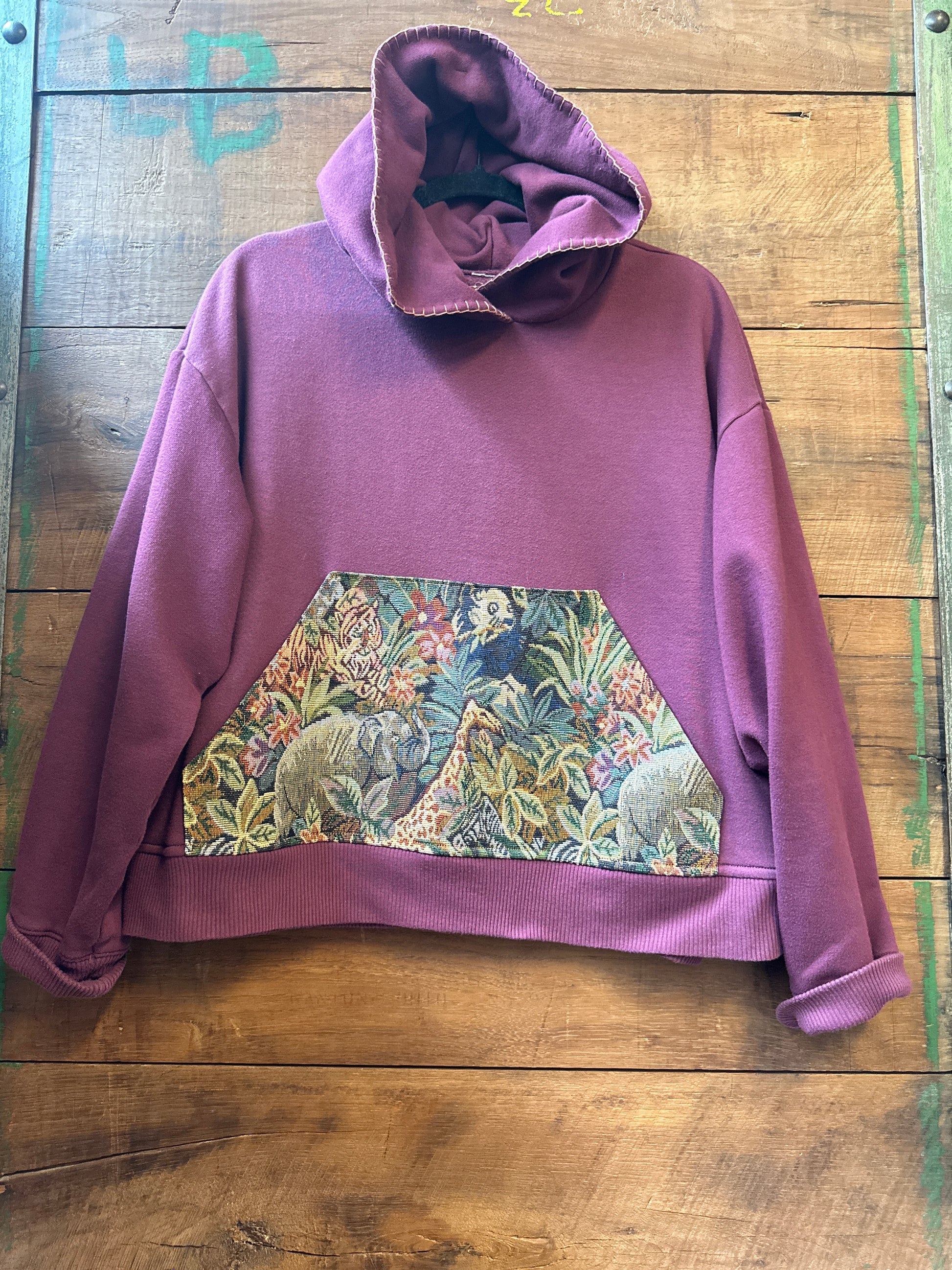 Meet your new favorite layering piece! This upcycled burgundy hoodie features a tapestry kanga pocket with a jungle animal motif. Complete with embroidered stitching in a contrasting color on the hood.