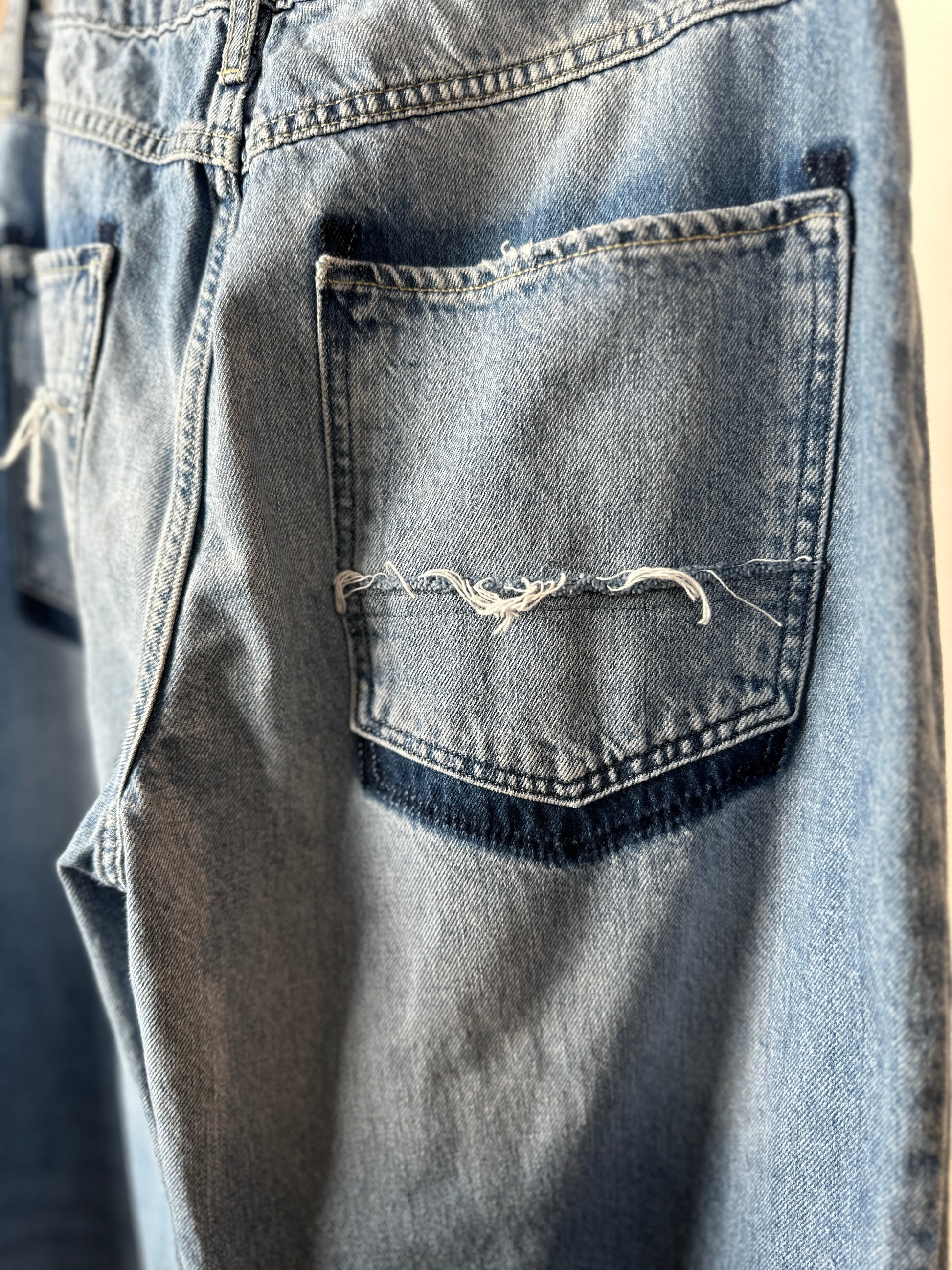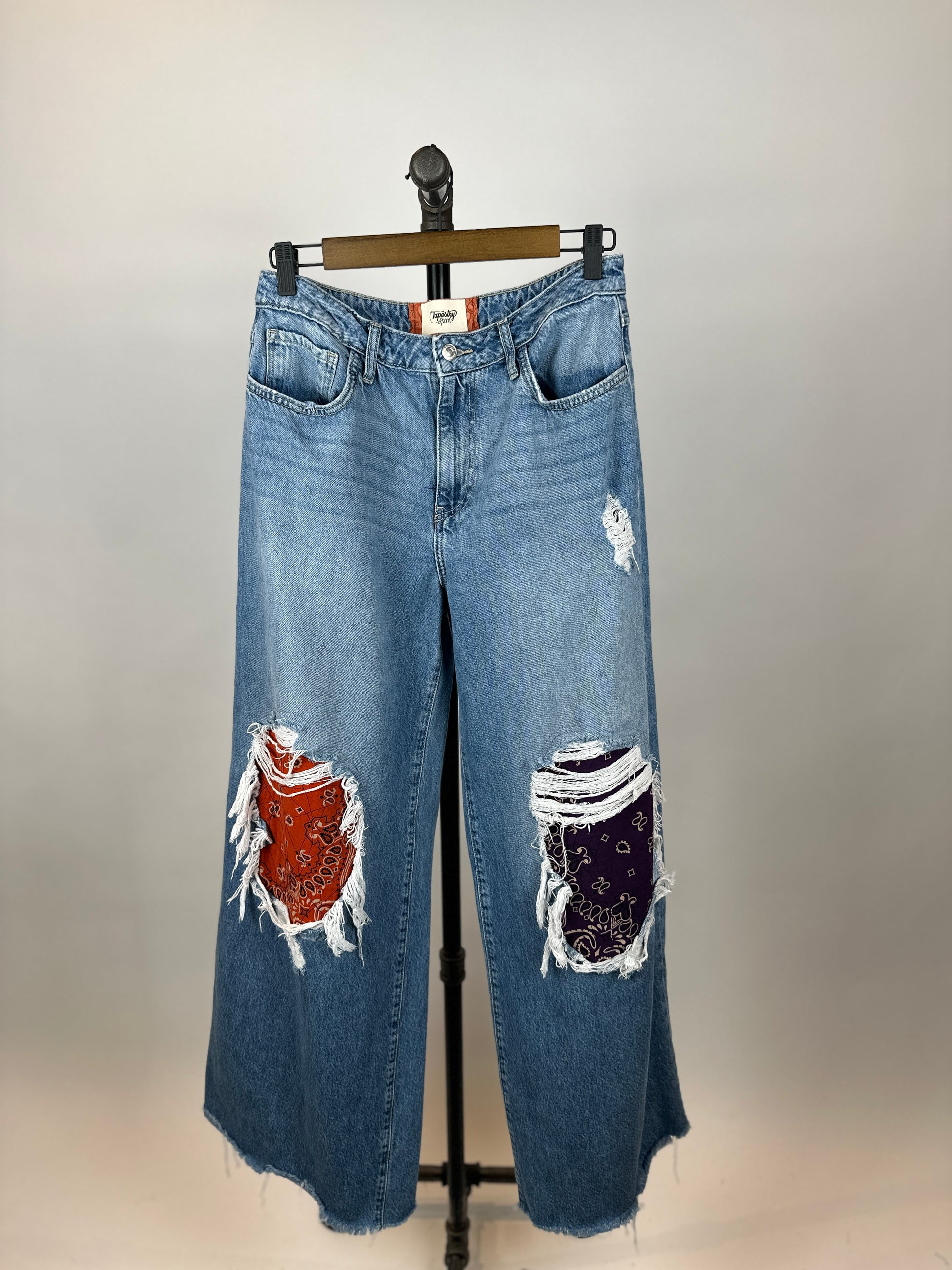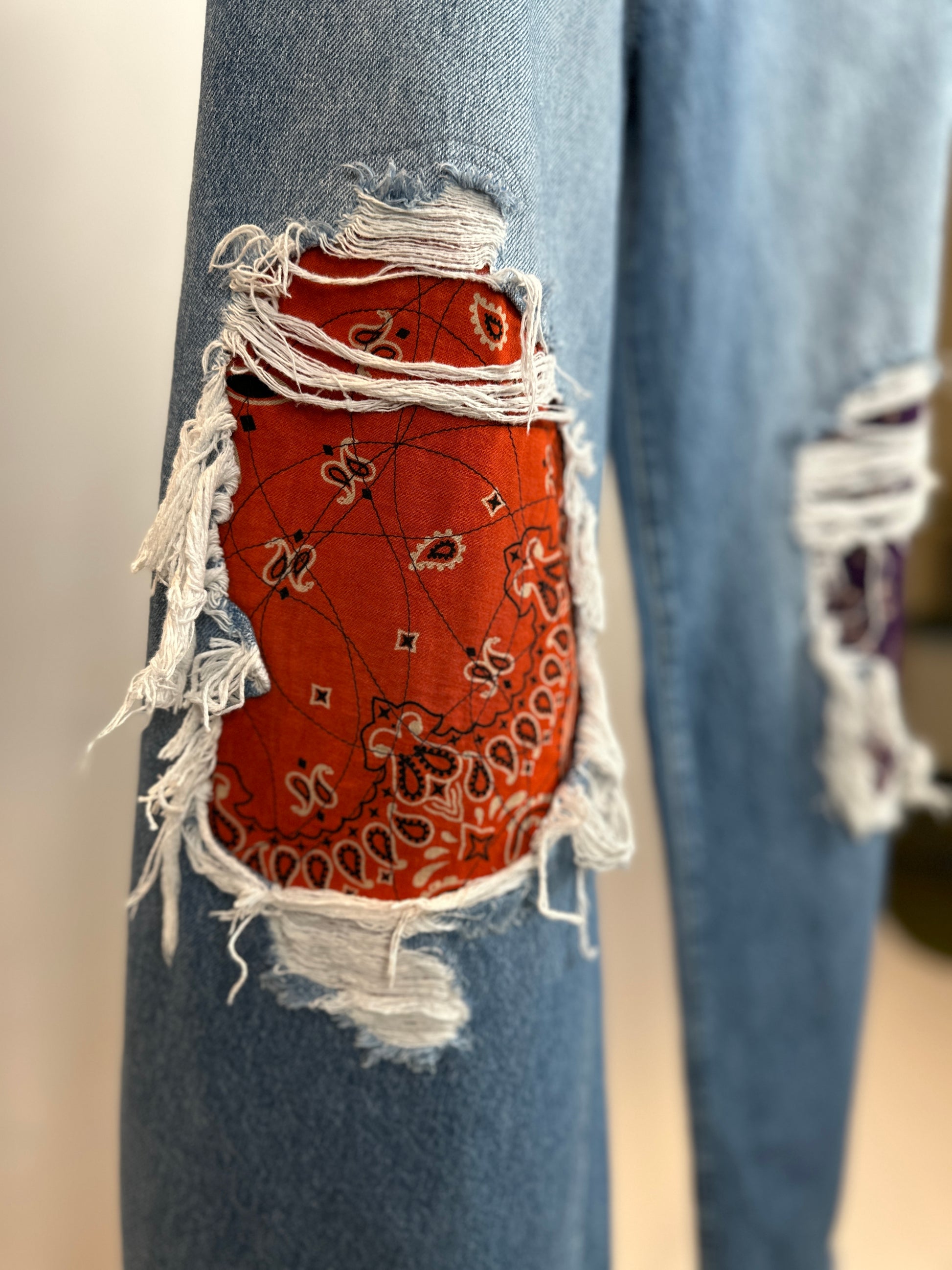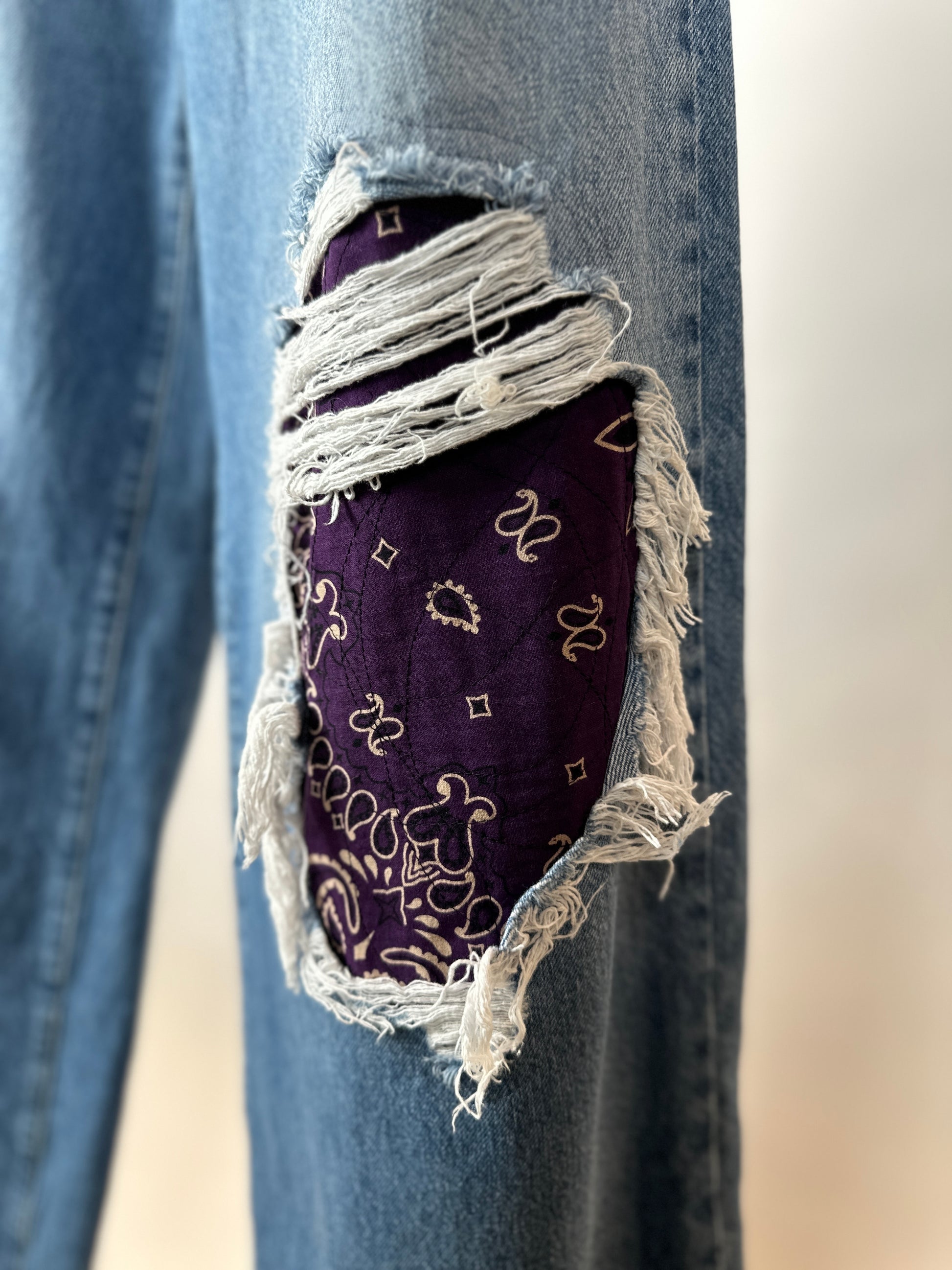 Step out in style with The Kacey, a pair of upcycled jeans with a playful twist. The distressed finish gives them a unique, edgy look, while the wide leg offers comfort and versatility. And don't forget the bandana patches at the knees, adding just the right touch of quirkiness to elevate your outfit.