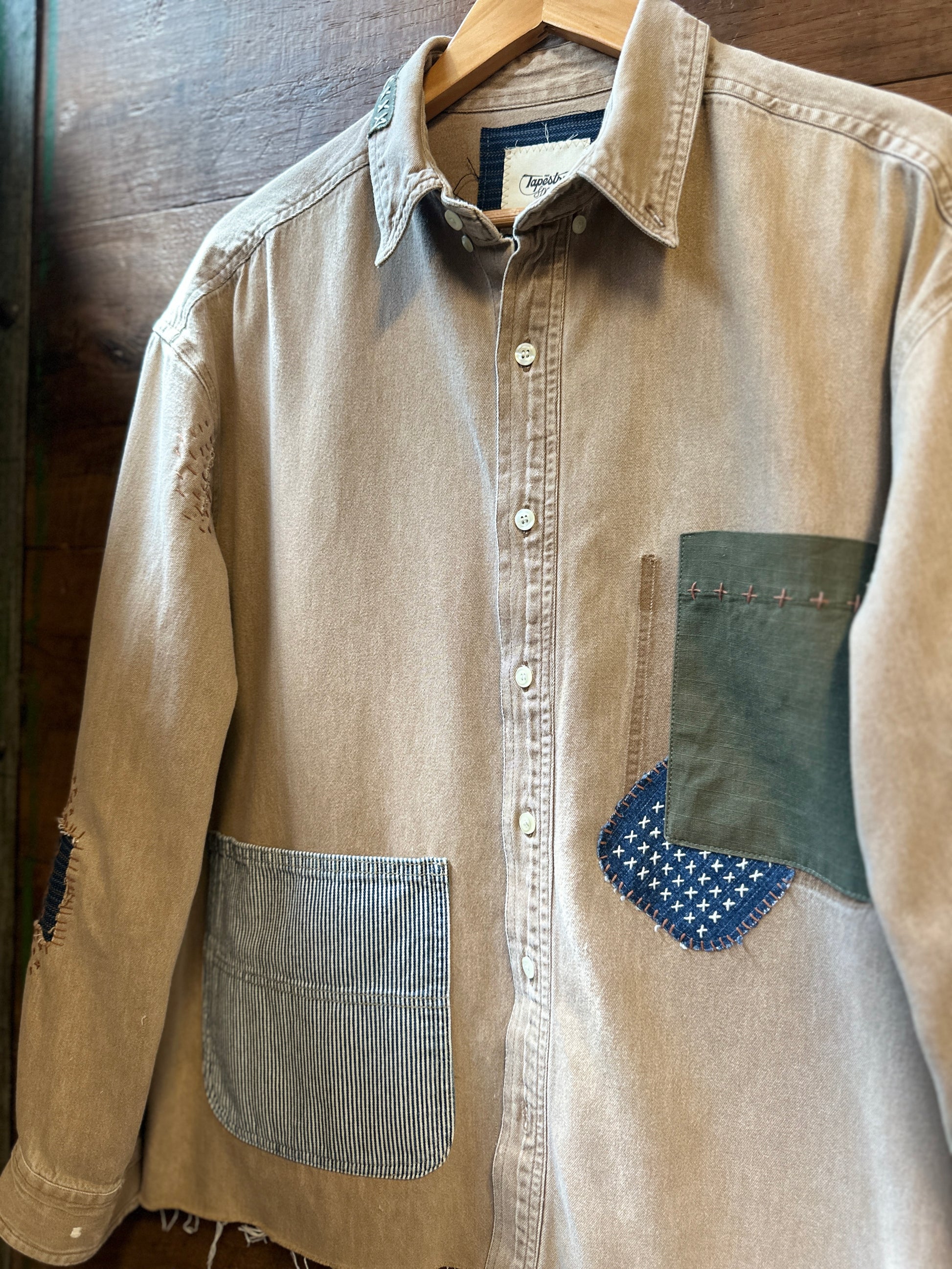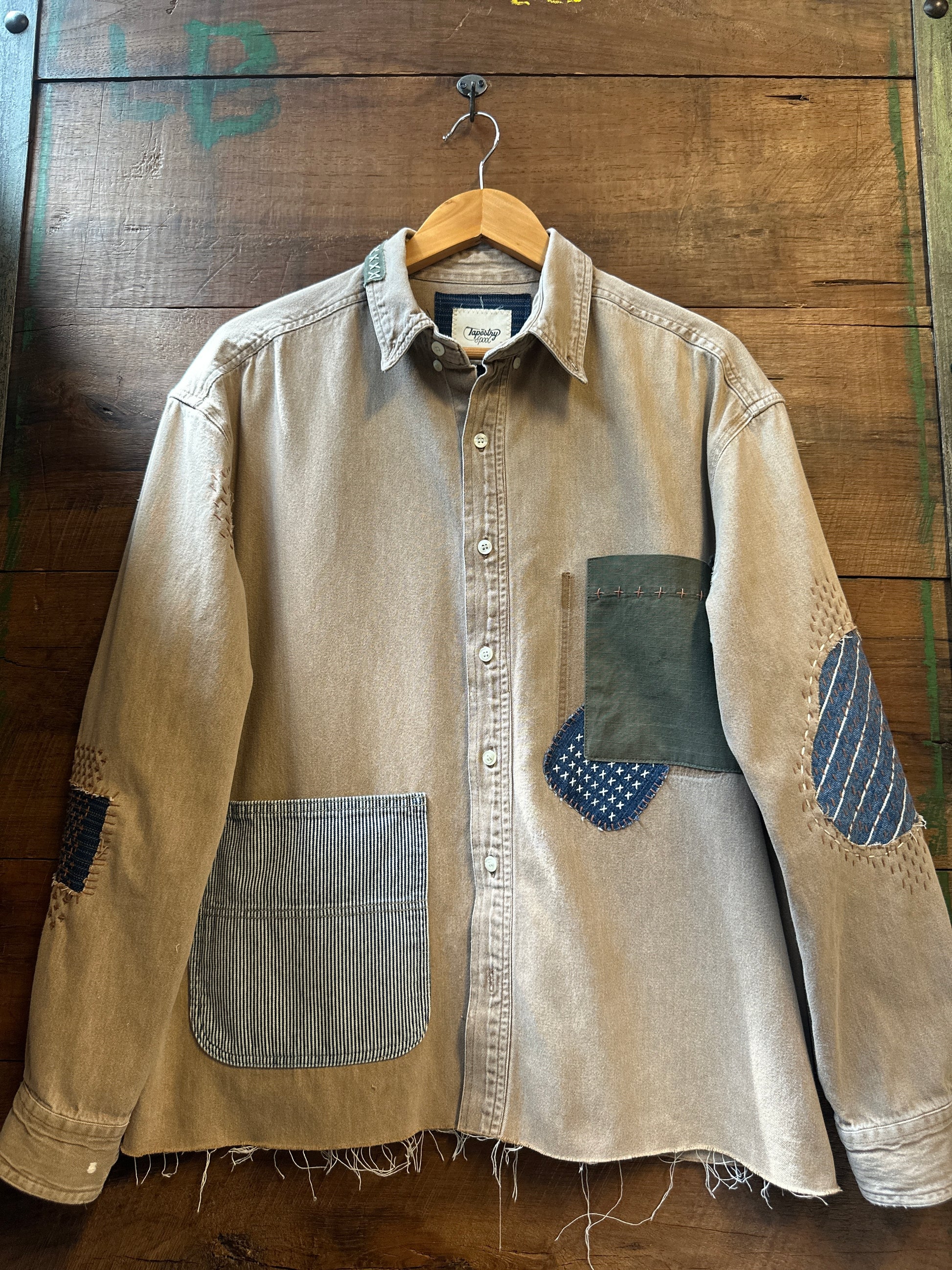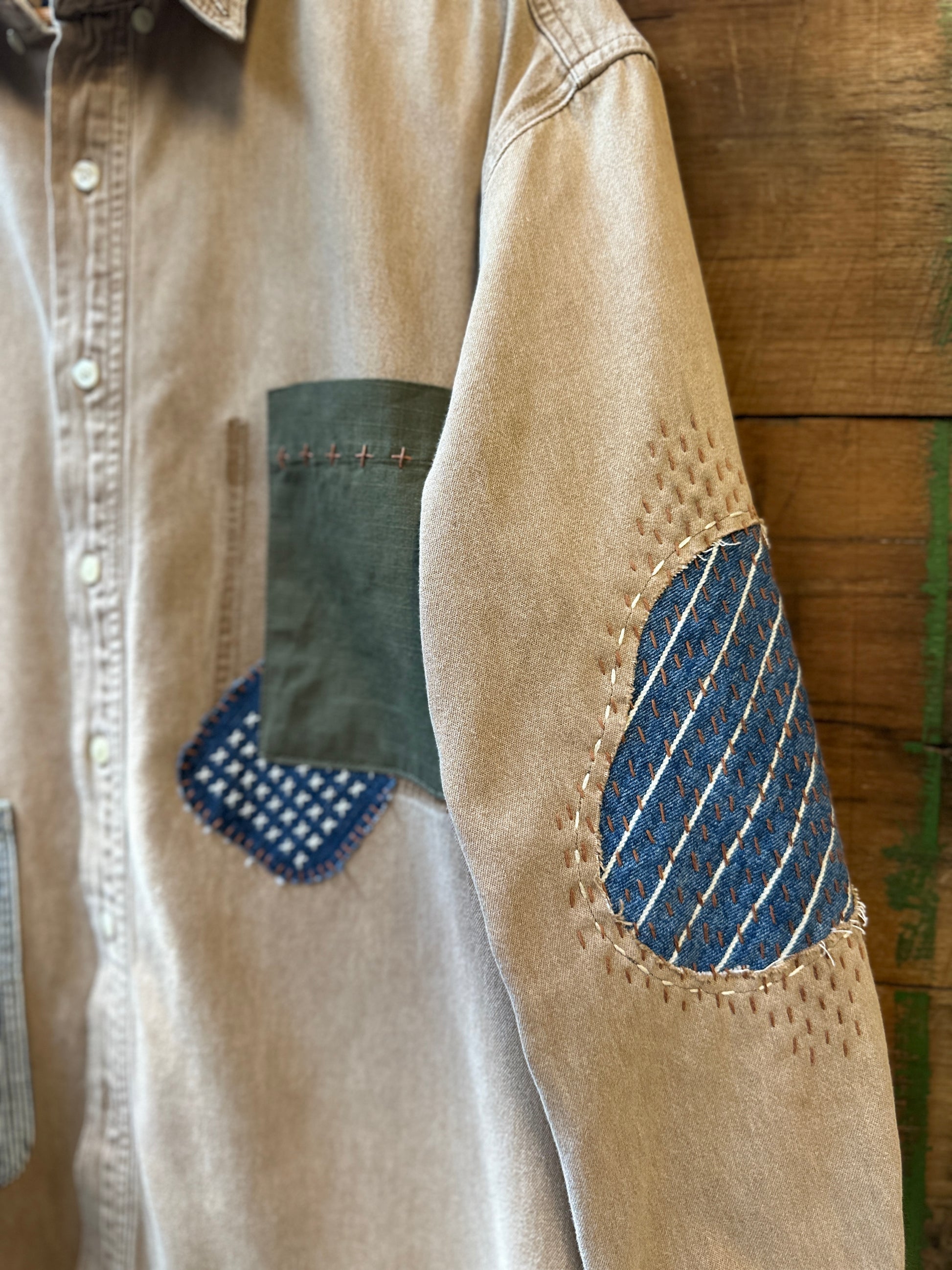 Meet The Keegan—a cool twist to your classic denim shirt. Crafted from upcycled tan denim shirt, this oversized piece features contrasting pockets and patches, along with eye-catching sashiko stitching done by hand. Perfect for layering or rocking solo, it adds personality and a dash of eco-friendly flair to any outfit.