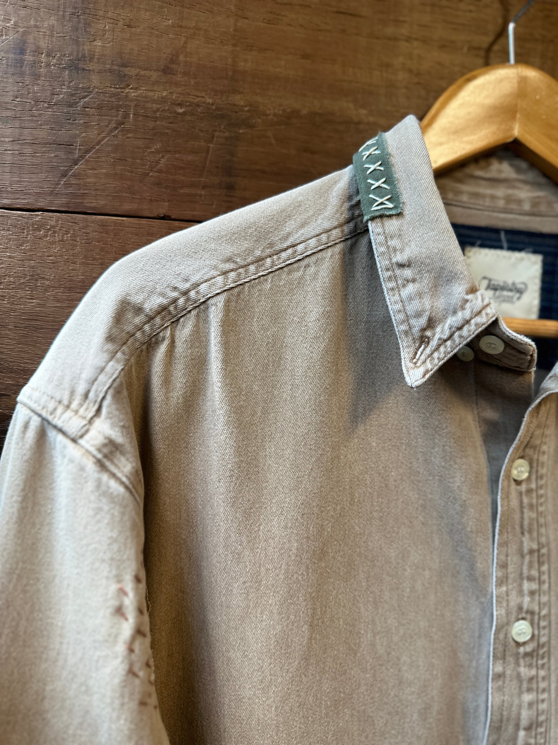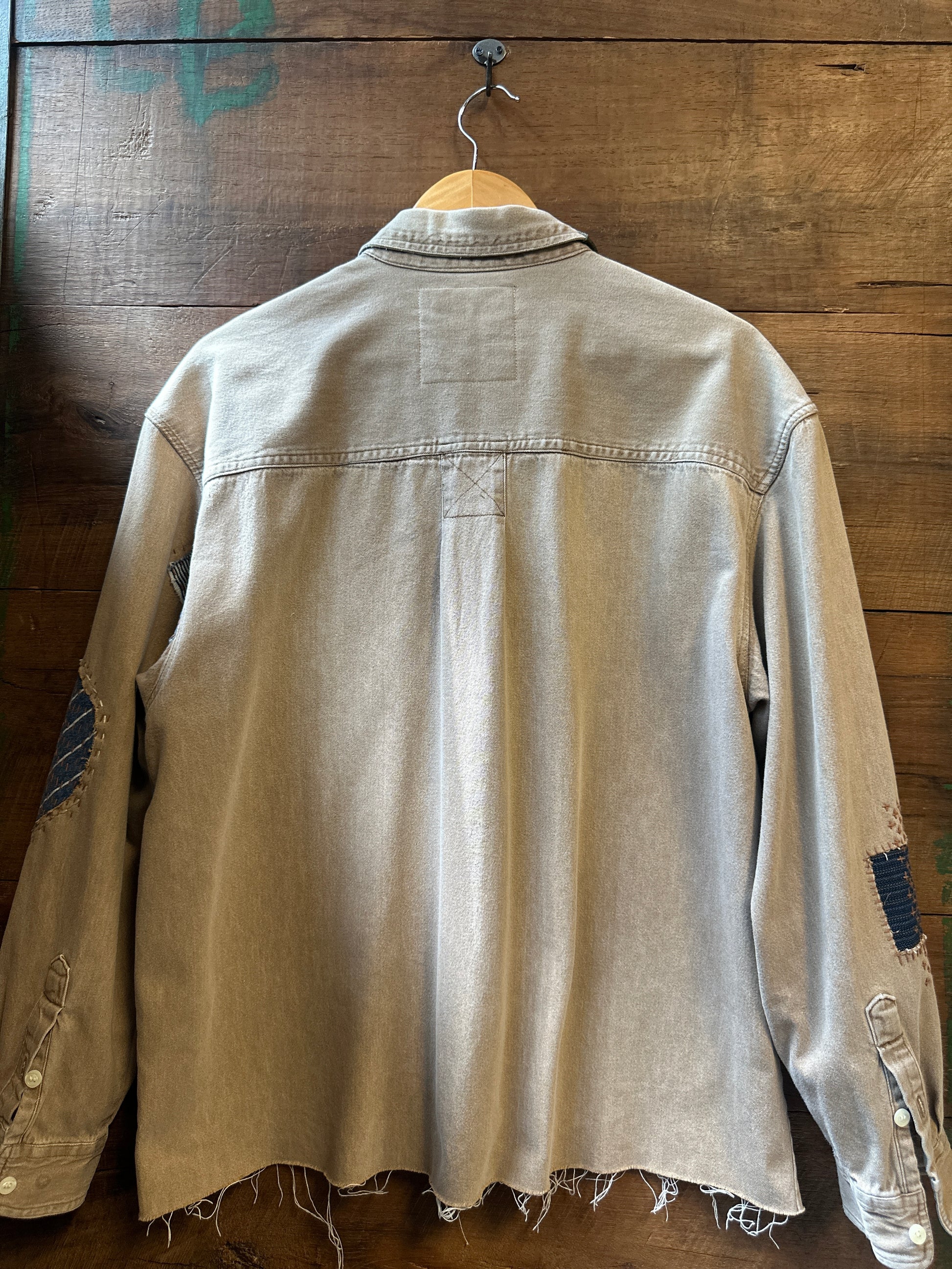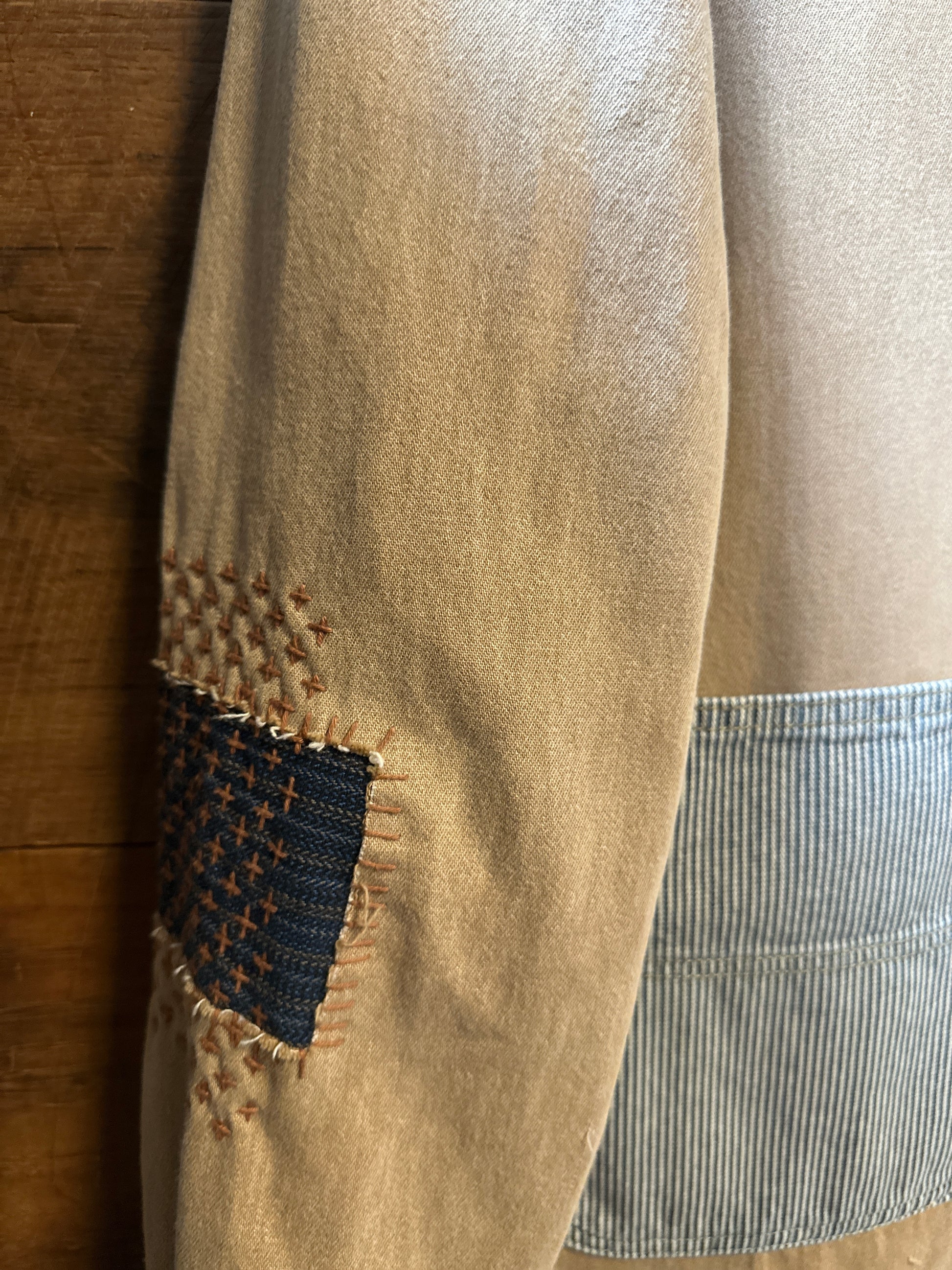 Meet The Keegan—a cool twist to your classic denim shirt. Crafted from upcycled tan denim shirt, this oversized piece features contrasting pockets and patches, along with eye-catching sashiko stitching done by hand. Perfect for layering or rocking solo, it adds personality and a dash of eco-friendly flair to any outfit.