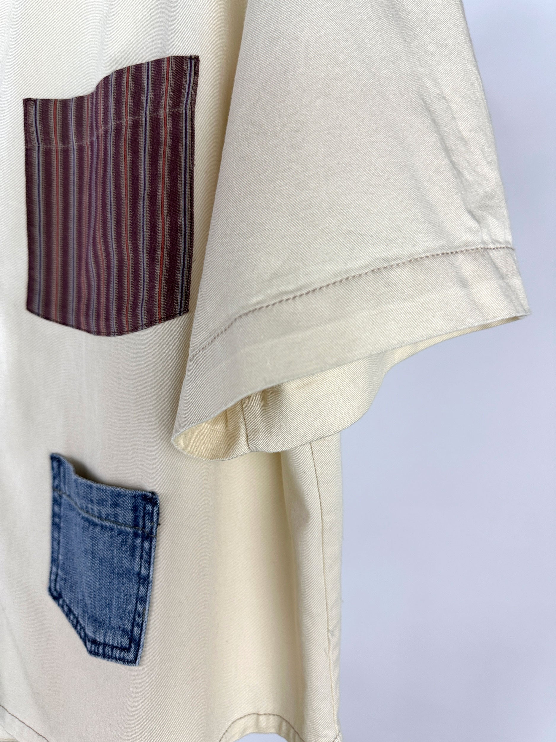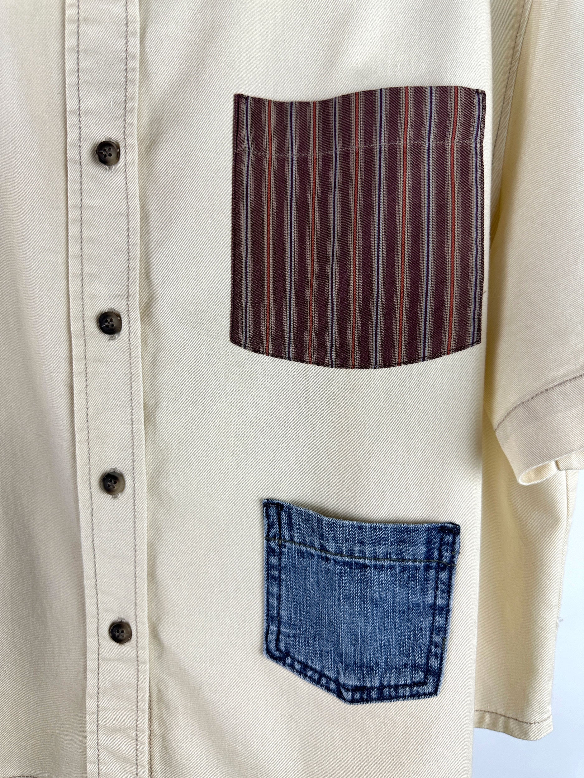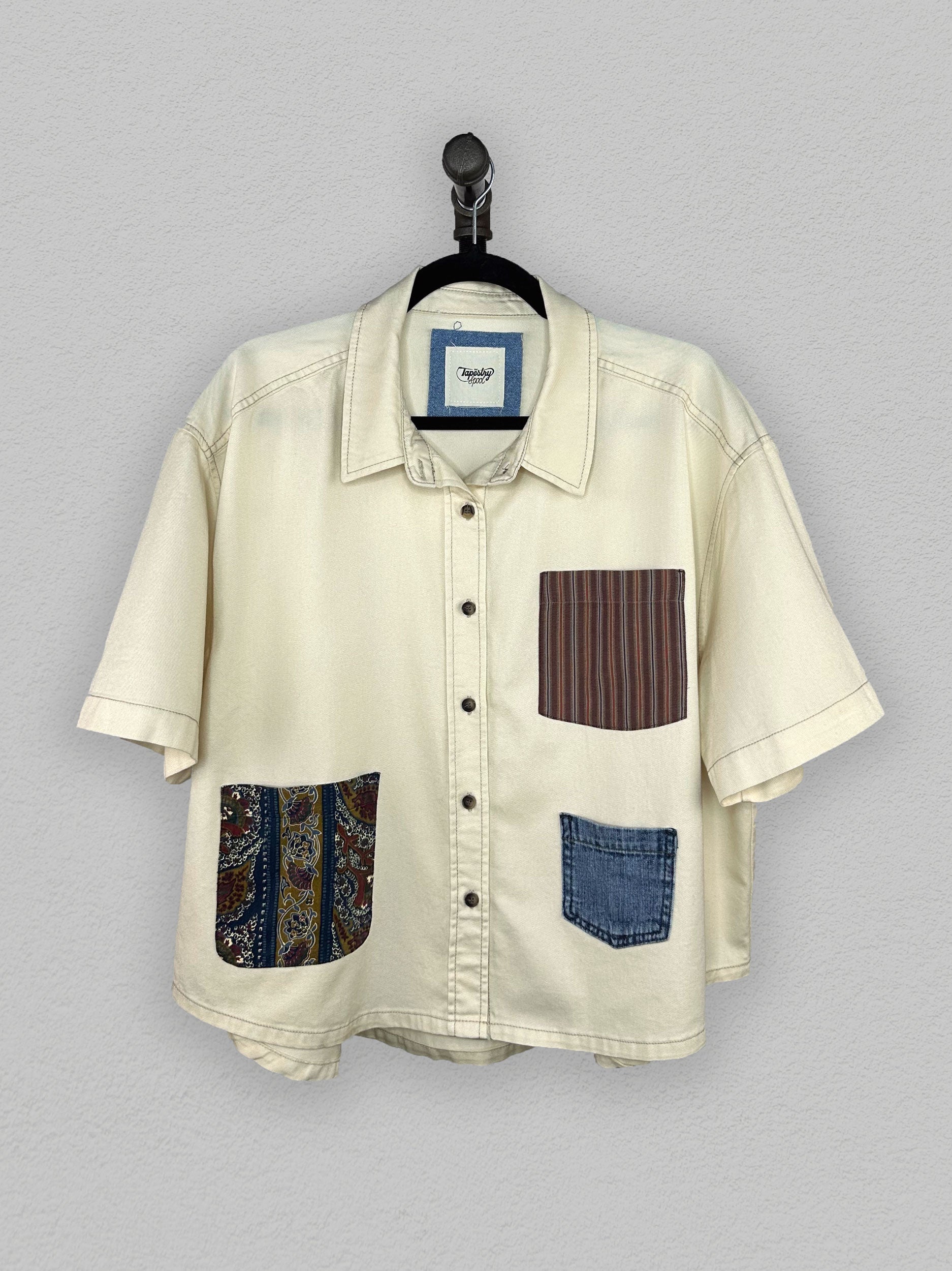 The Kira: A shirt with a twist. Made from upcycled material, this woven shirt features unique pocket details and short sleeves..
