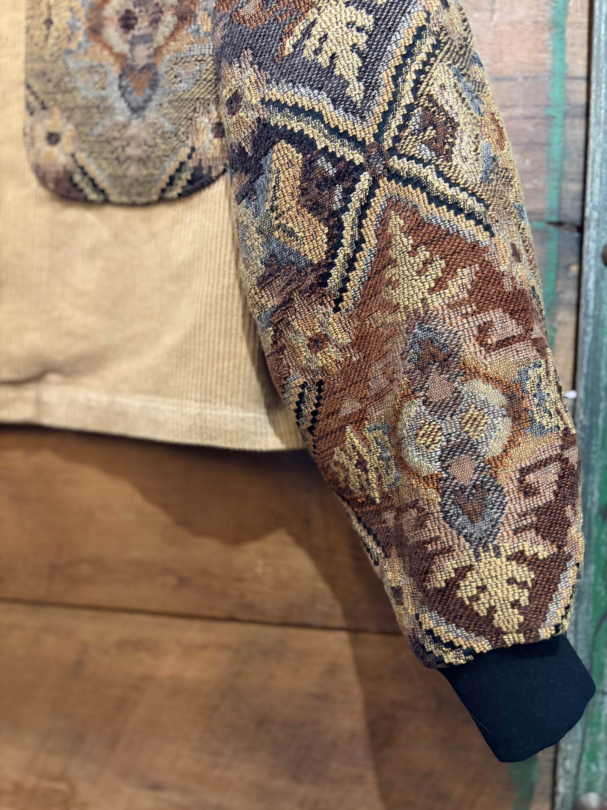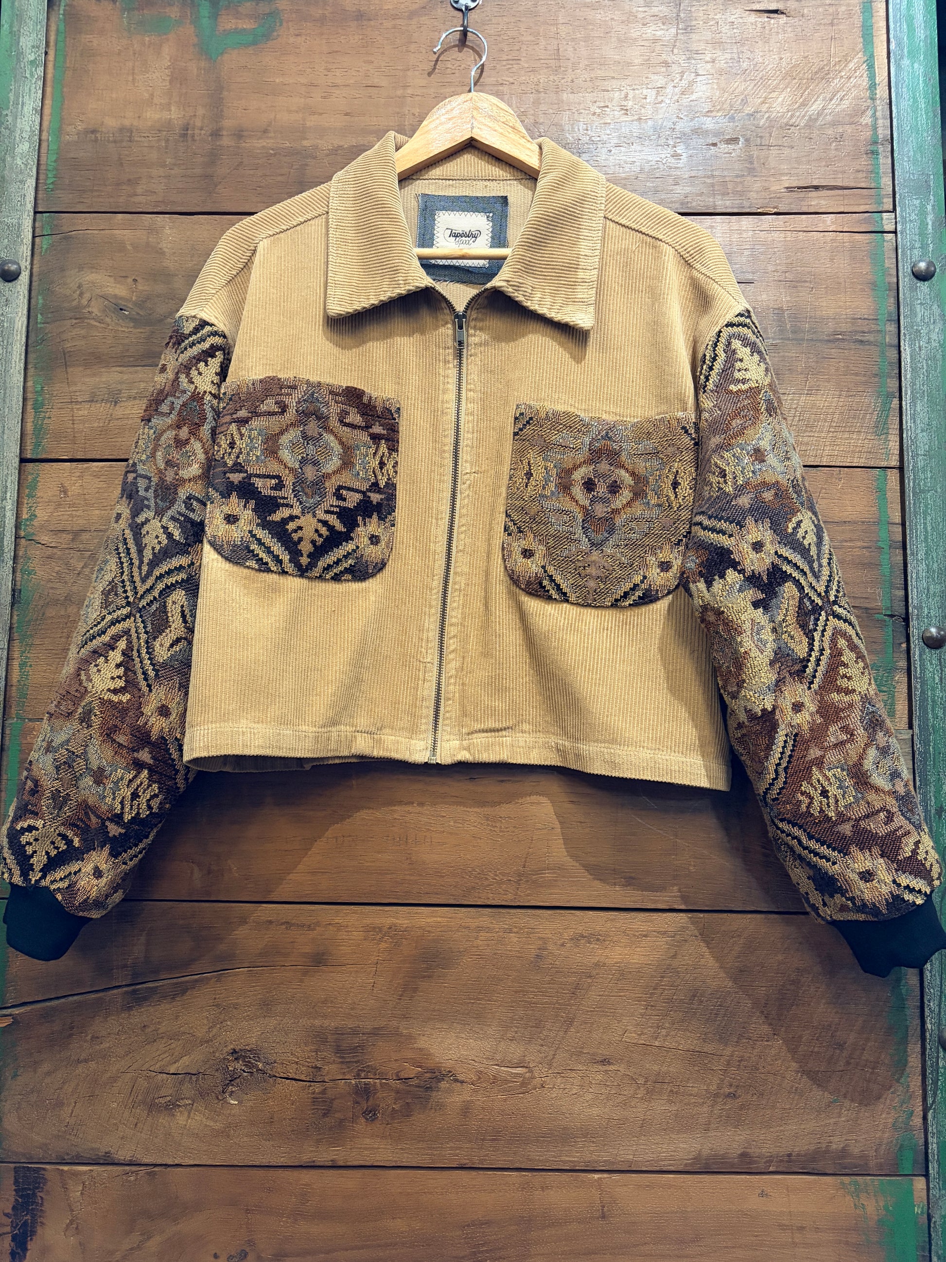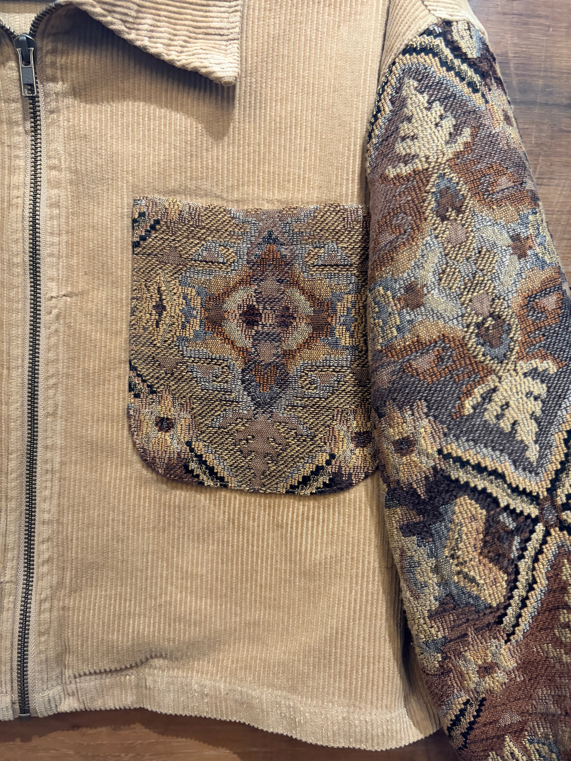 The Lenny is a one-of-a-kind upcycled corduroy jacket that blends vintage charm with artisan craftsmanship. Featuring a front zipper closure and a slightly cropped silhouette, this piece showcases vintage tapestry fabric on the sleeves and pockets for unexpected visual interest. Finished with cozy knit cuffs that add comfort and texture, it's the perfect layering piece for anyone who values sustainable style and unique details.