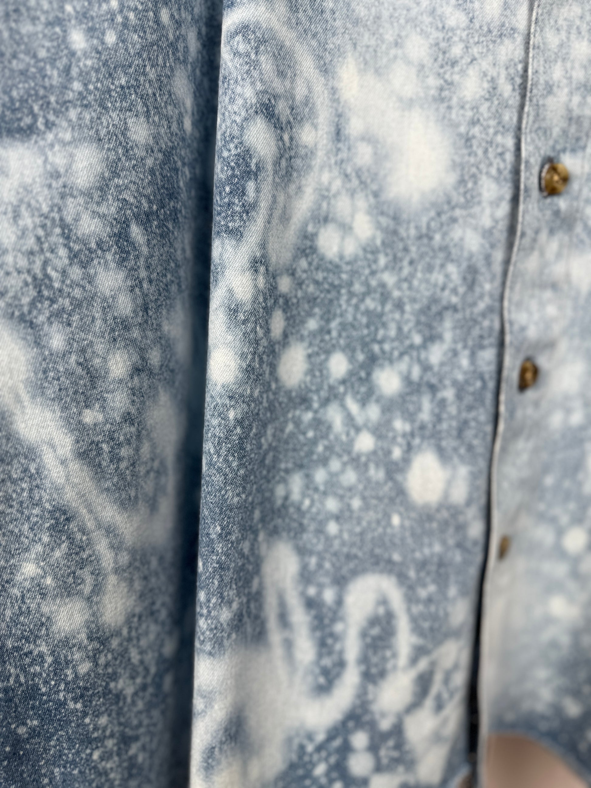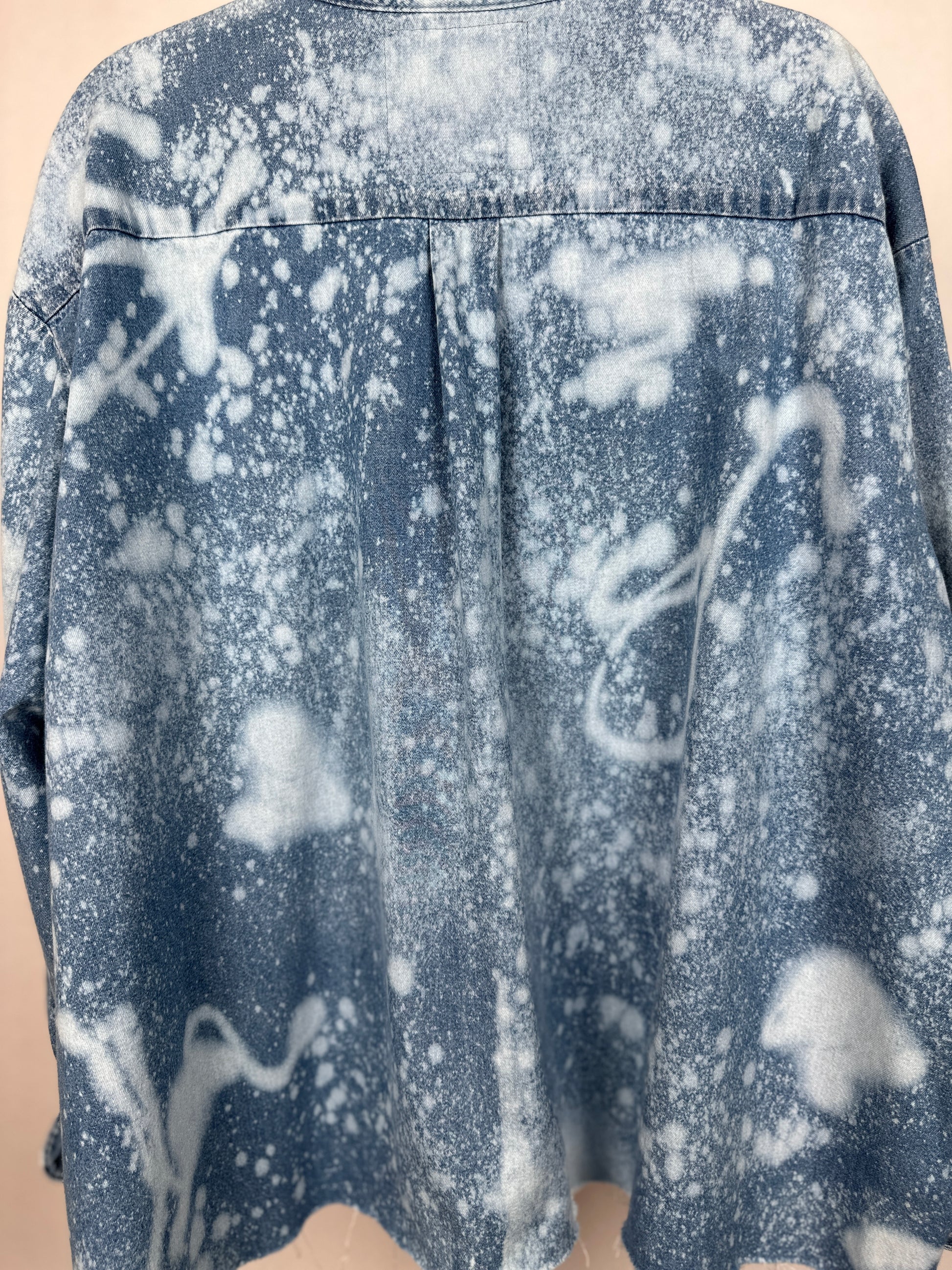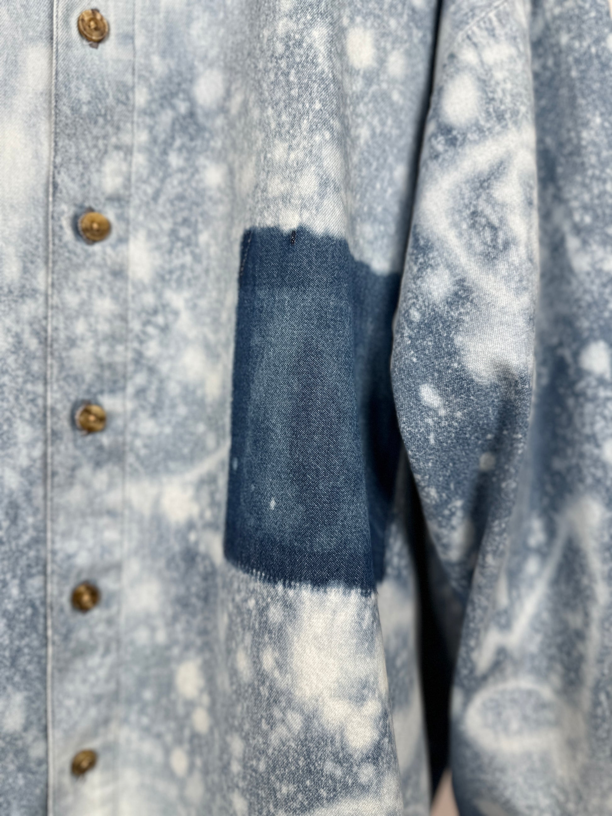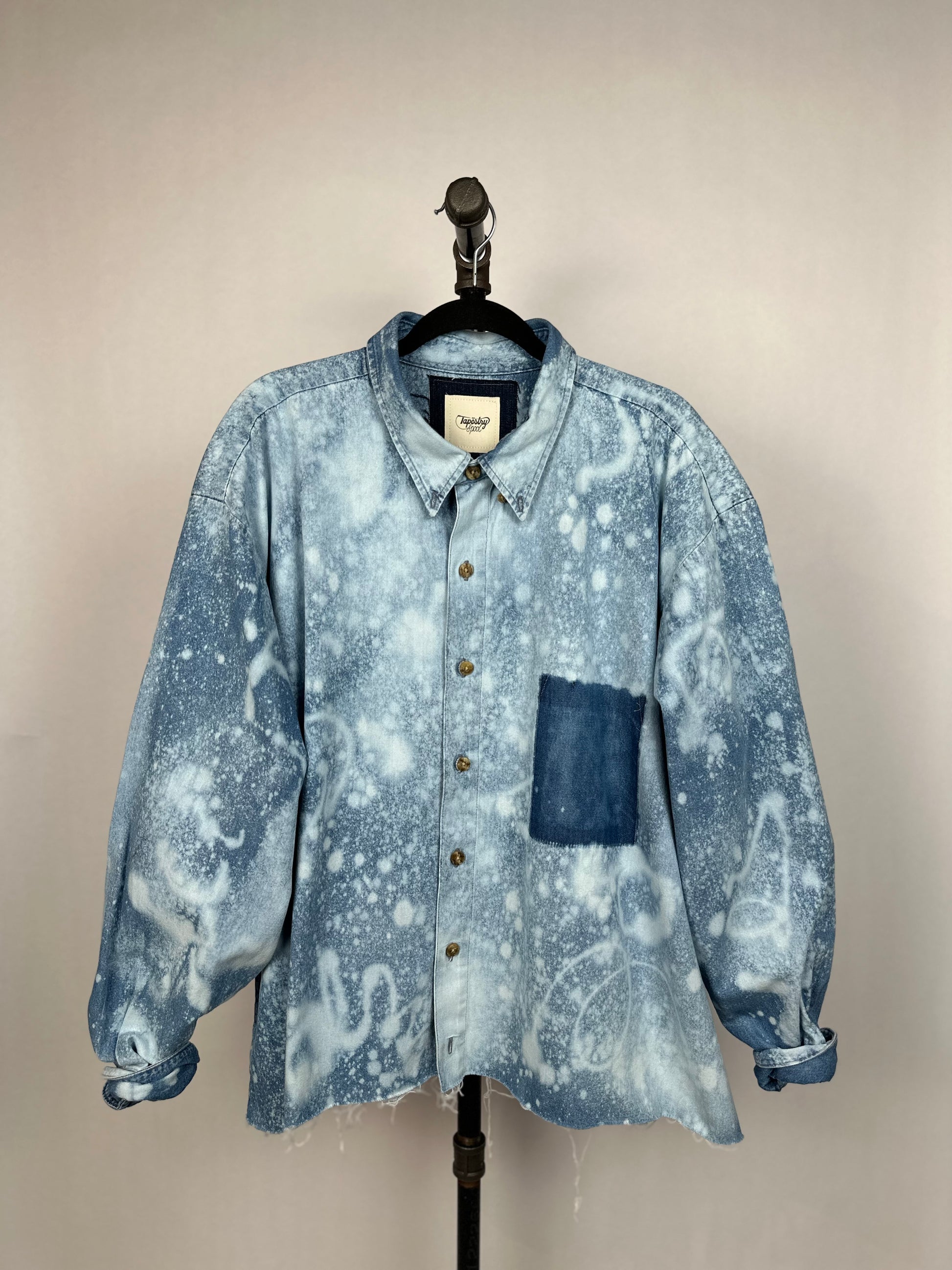 Introducing The Leona, the eco-friendly and effortlessly cool addition to your wardrobe. Made from upcycled denim and featuring an oversized fit, this shirt is perfect for the fashion-conscious individual who also cares about the environment. The bleached detailing adds a unique touch to this already one-of-a-kind piece. Upgrade your style with The Leona!"