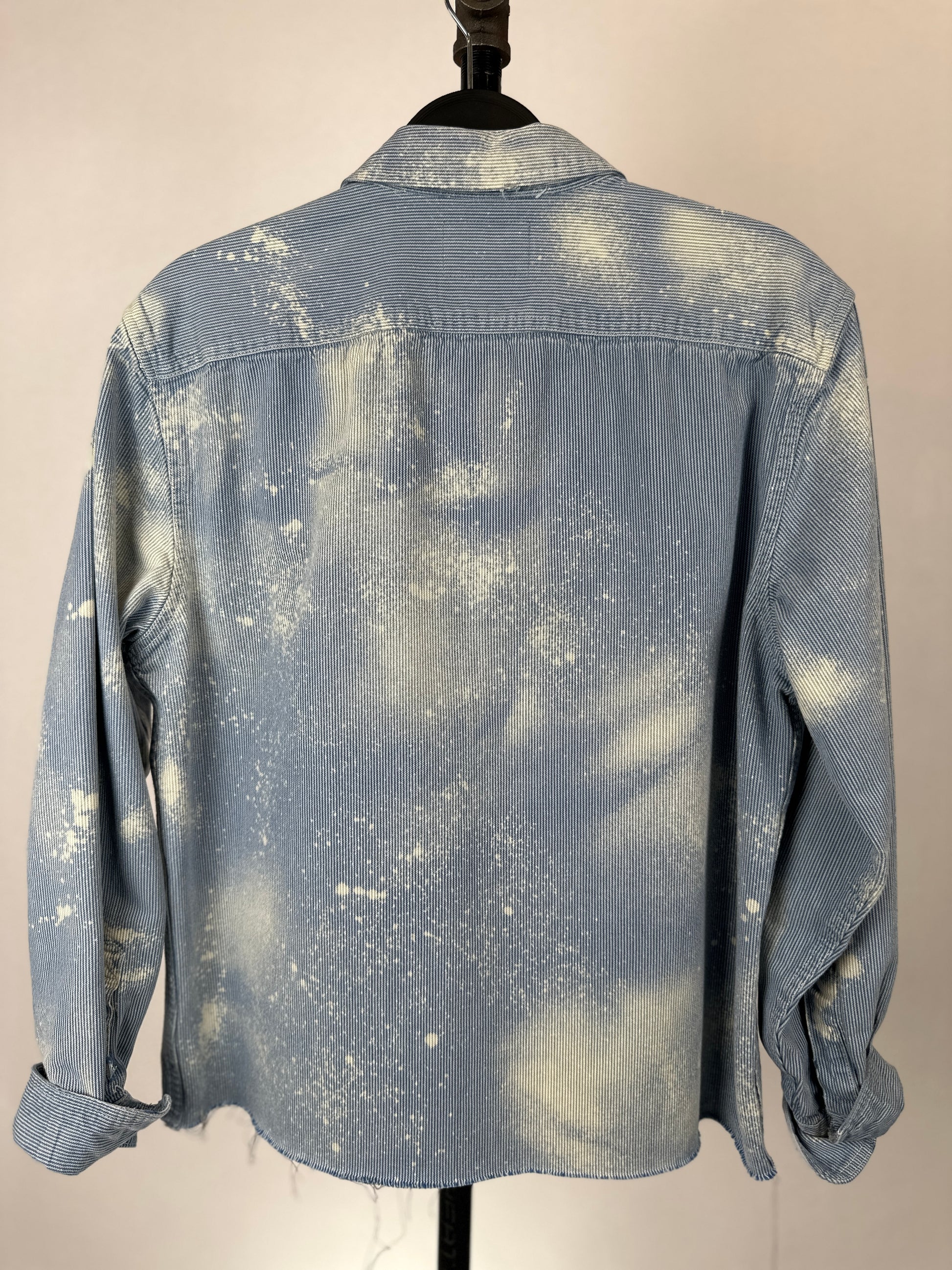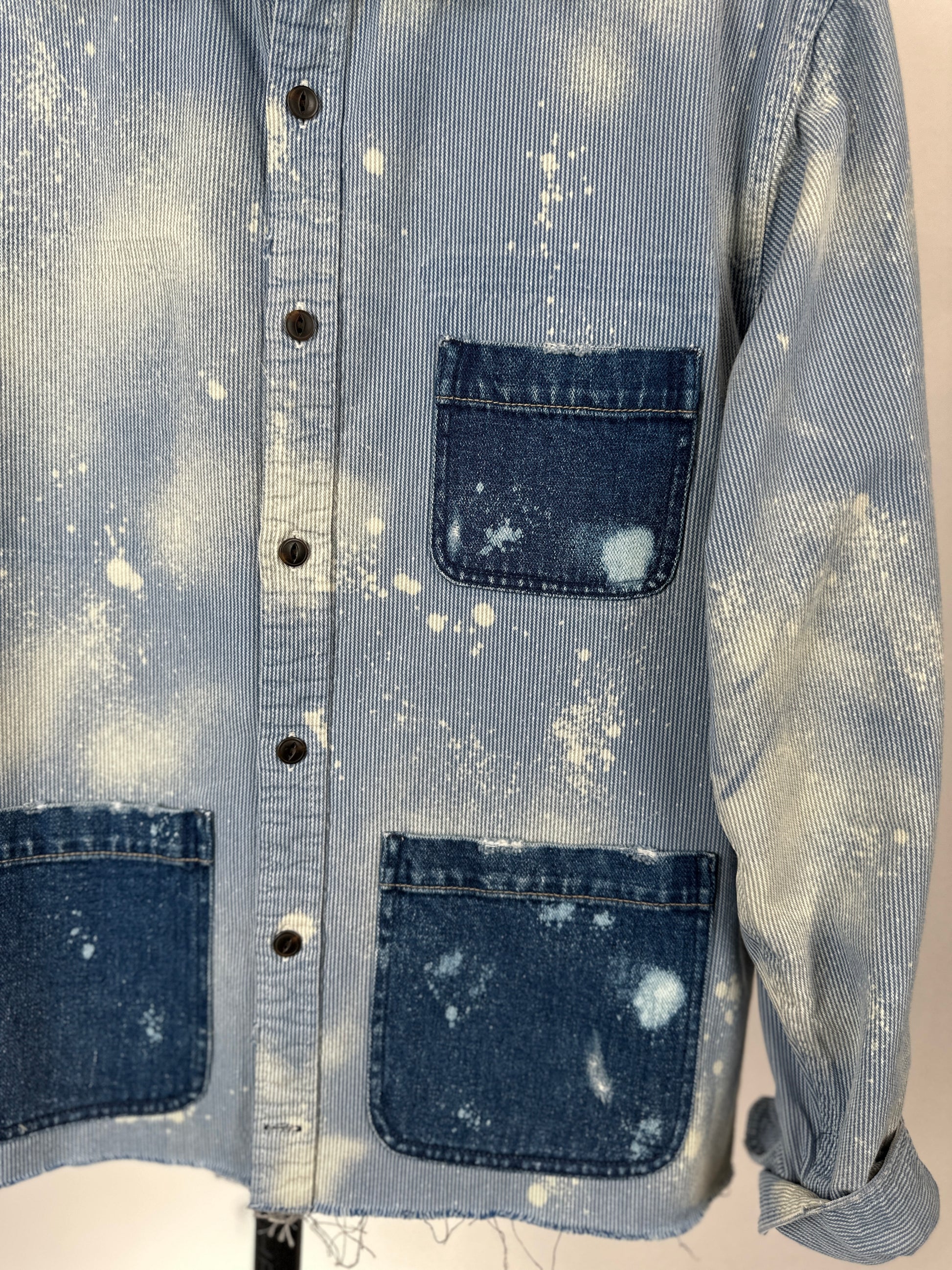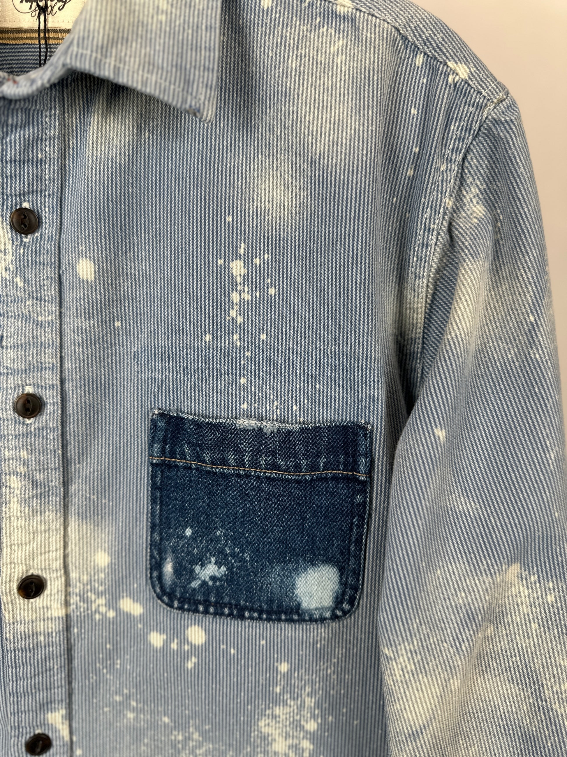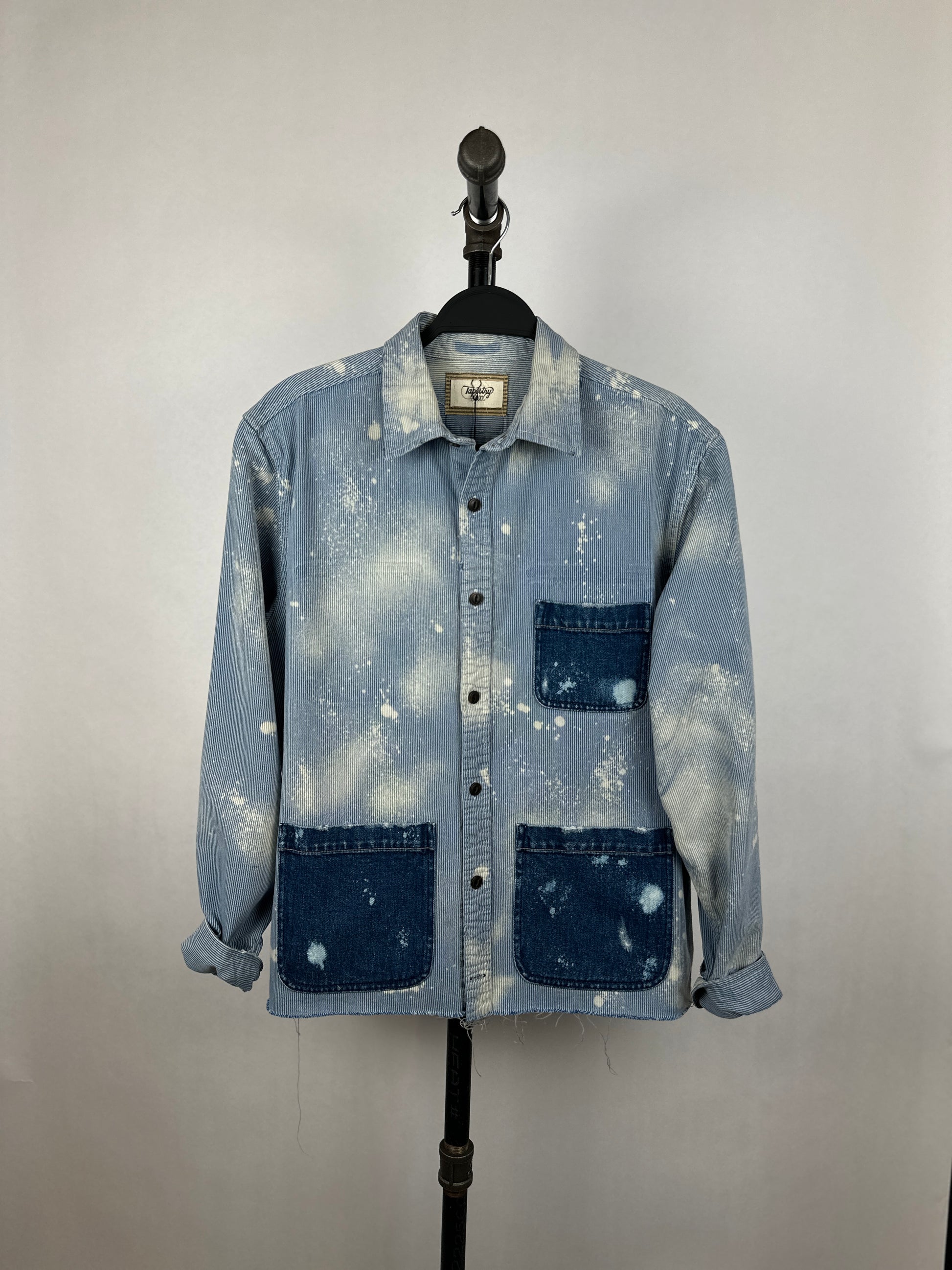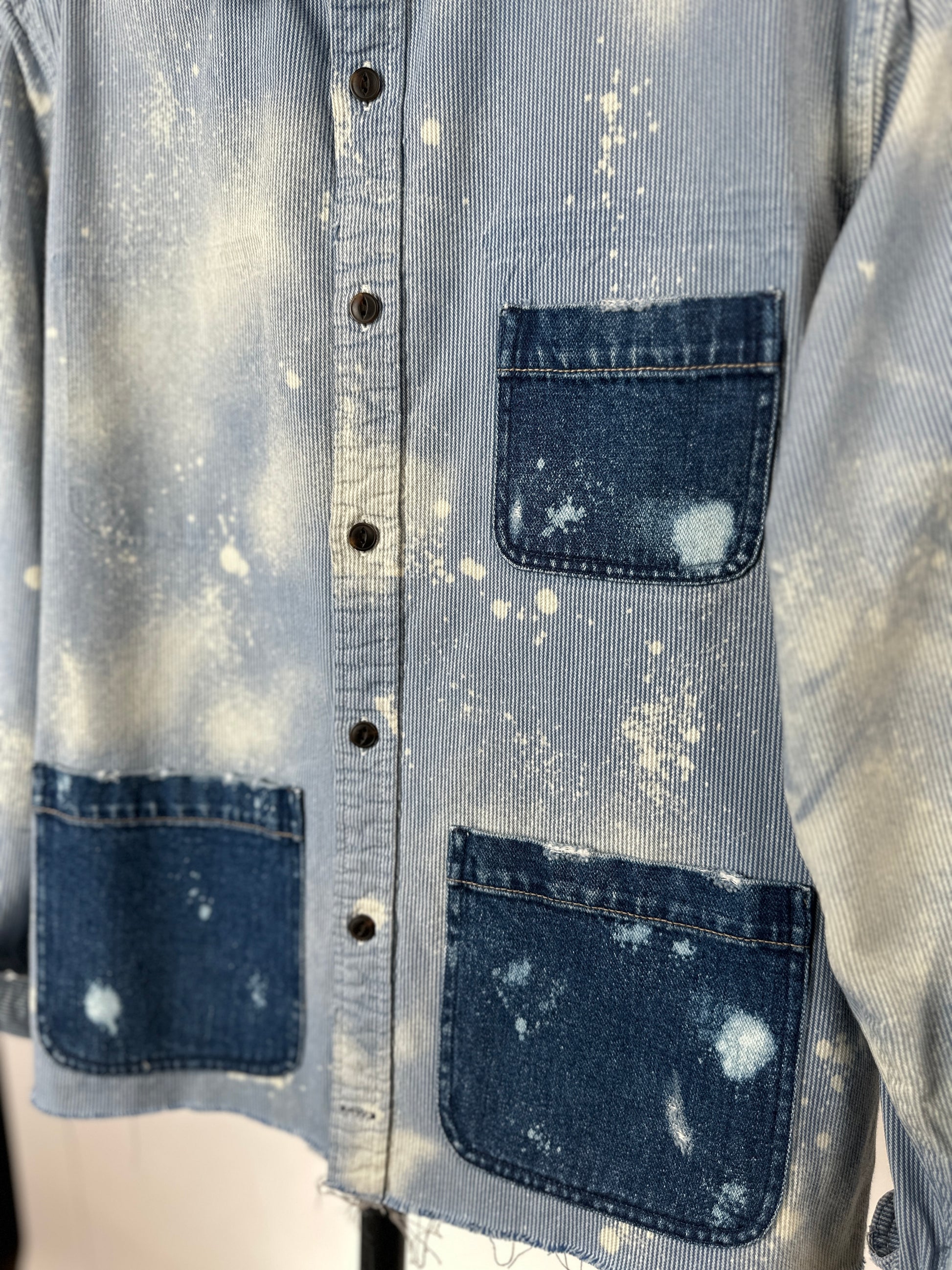 Rock the ultimate denim-on-denim look with The Levi! Our upcycled denim shacket features bleached detail for a one-of-a-kind look. With patch pockets in varying sizes and a relaxed fit, you'll have both style and functionality. Say hello to your new favorite statement piece.