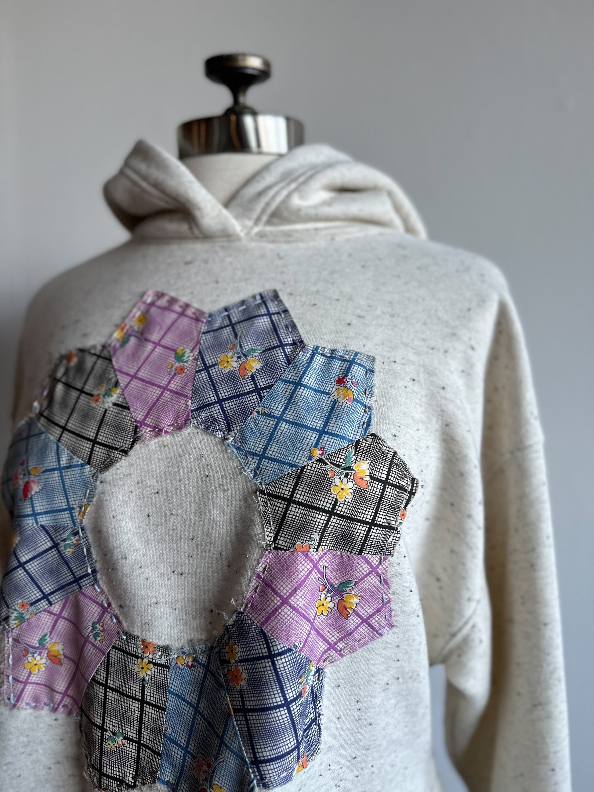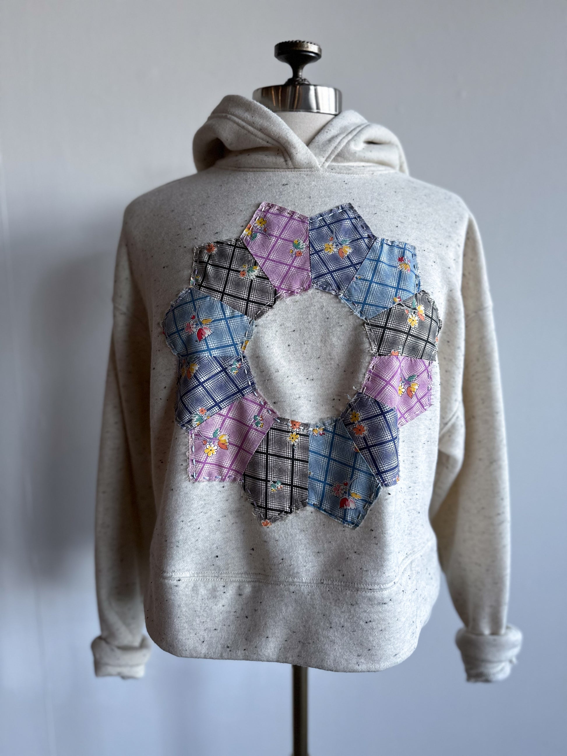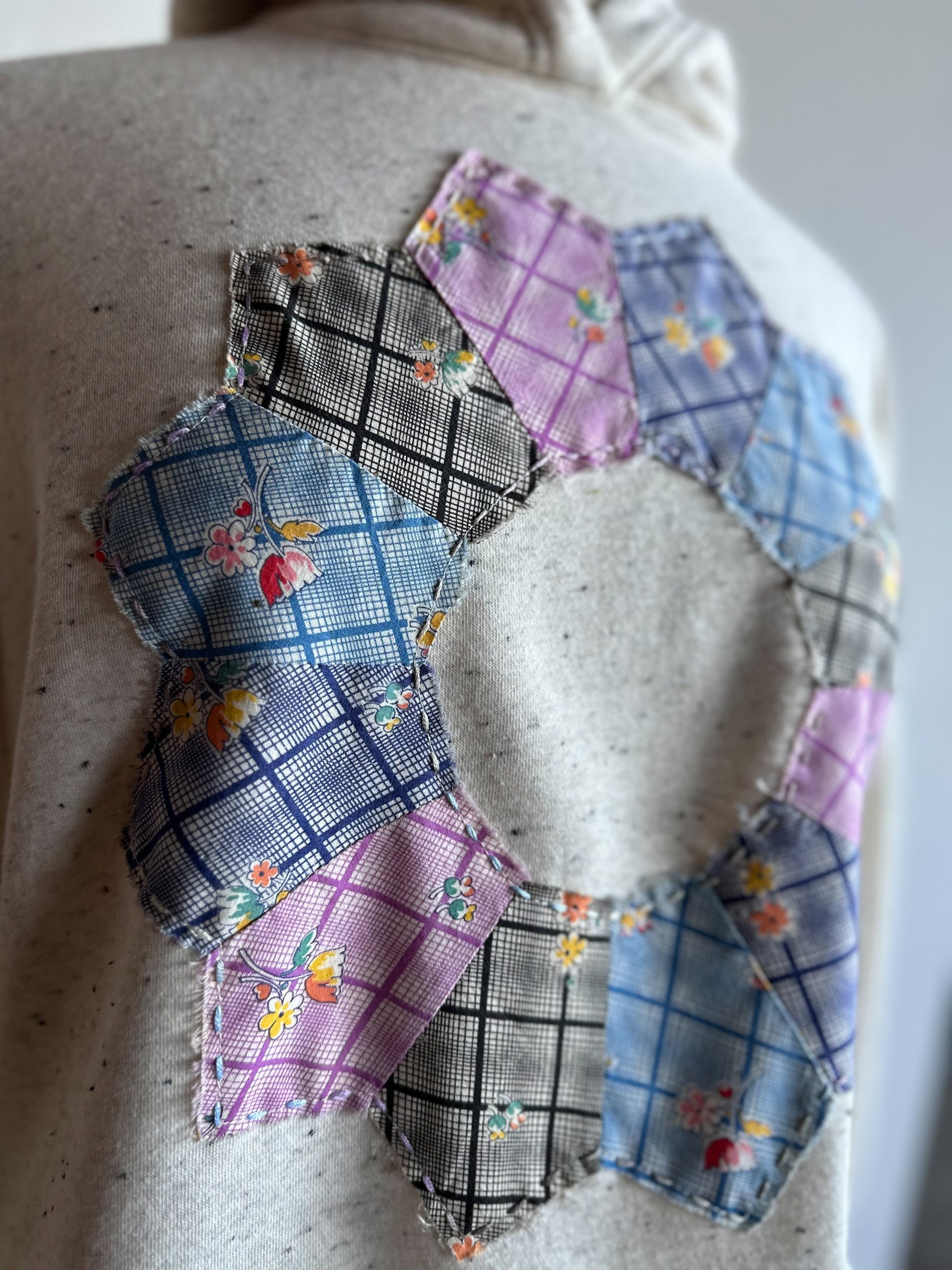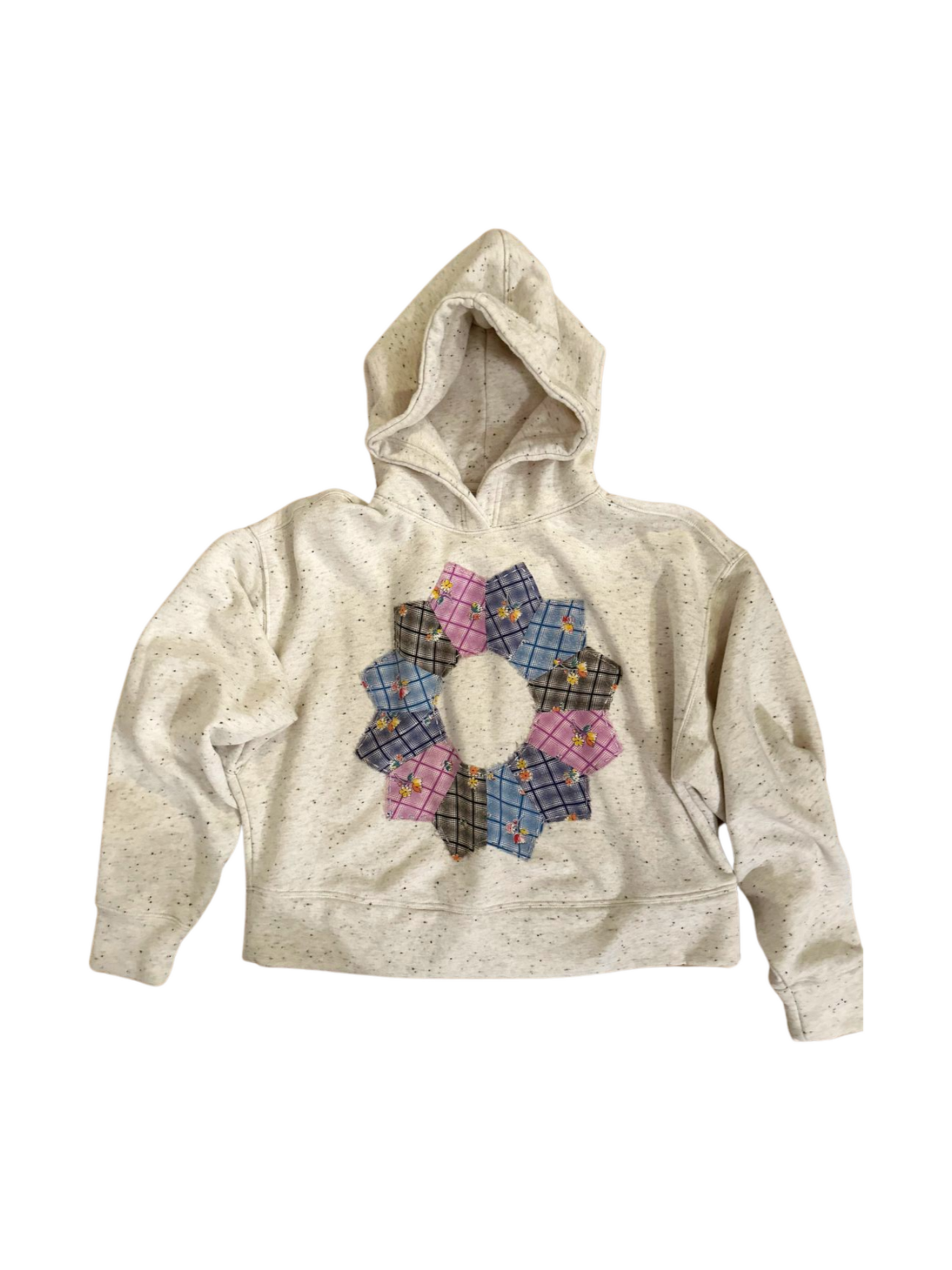 Introducing The Lucy, featuring a unique quilt block and charming embroidery details. Slightly cropped, relaxed fit in a cream speckled sweatshirt knit.