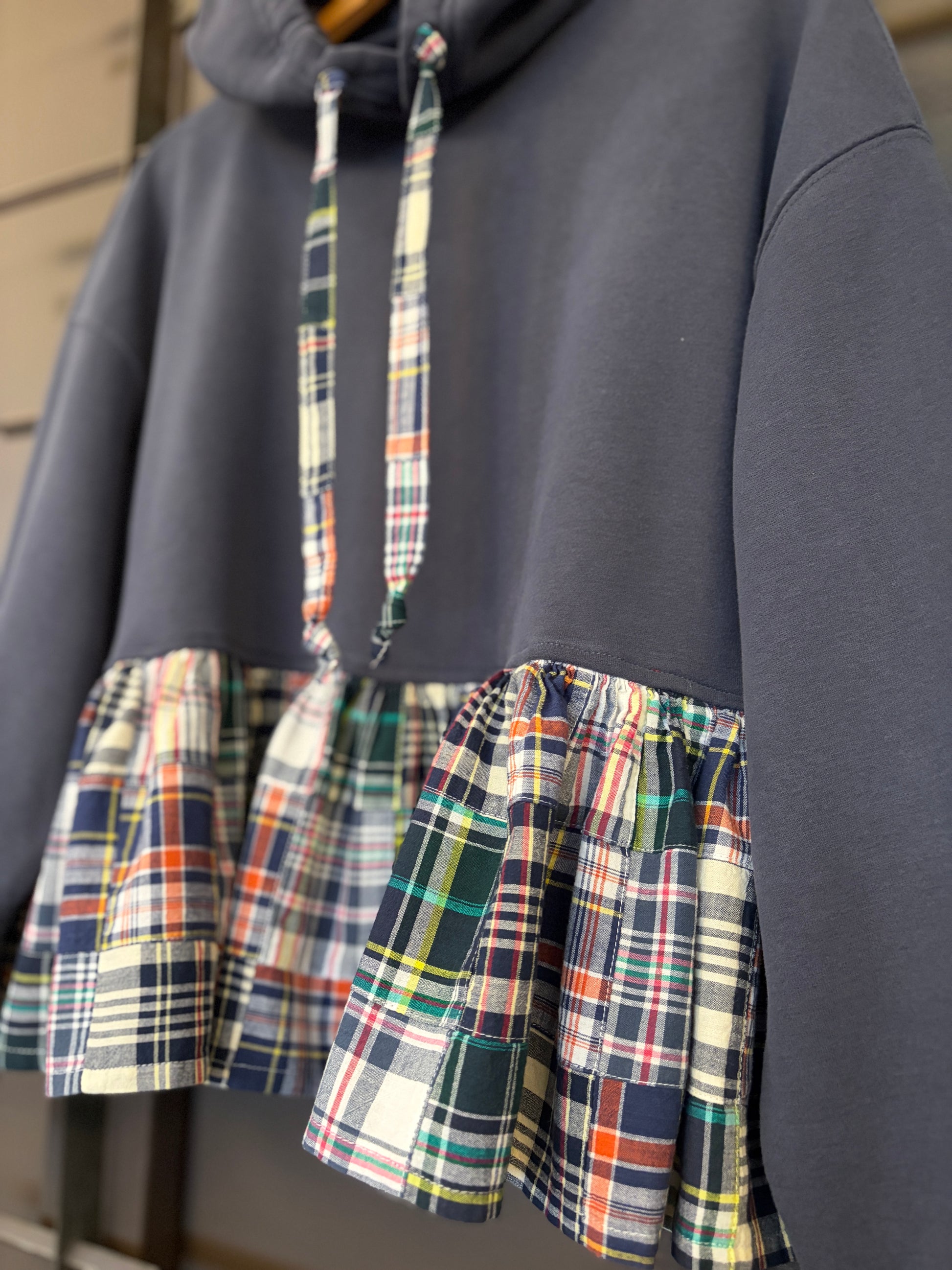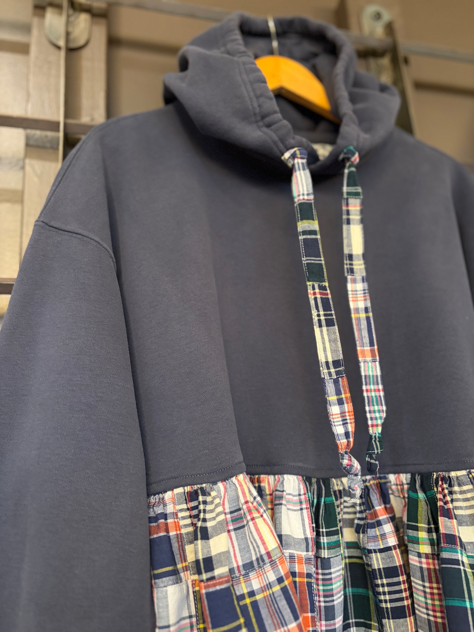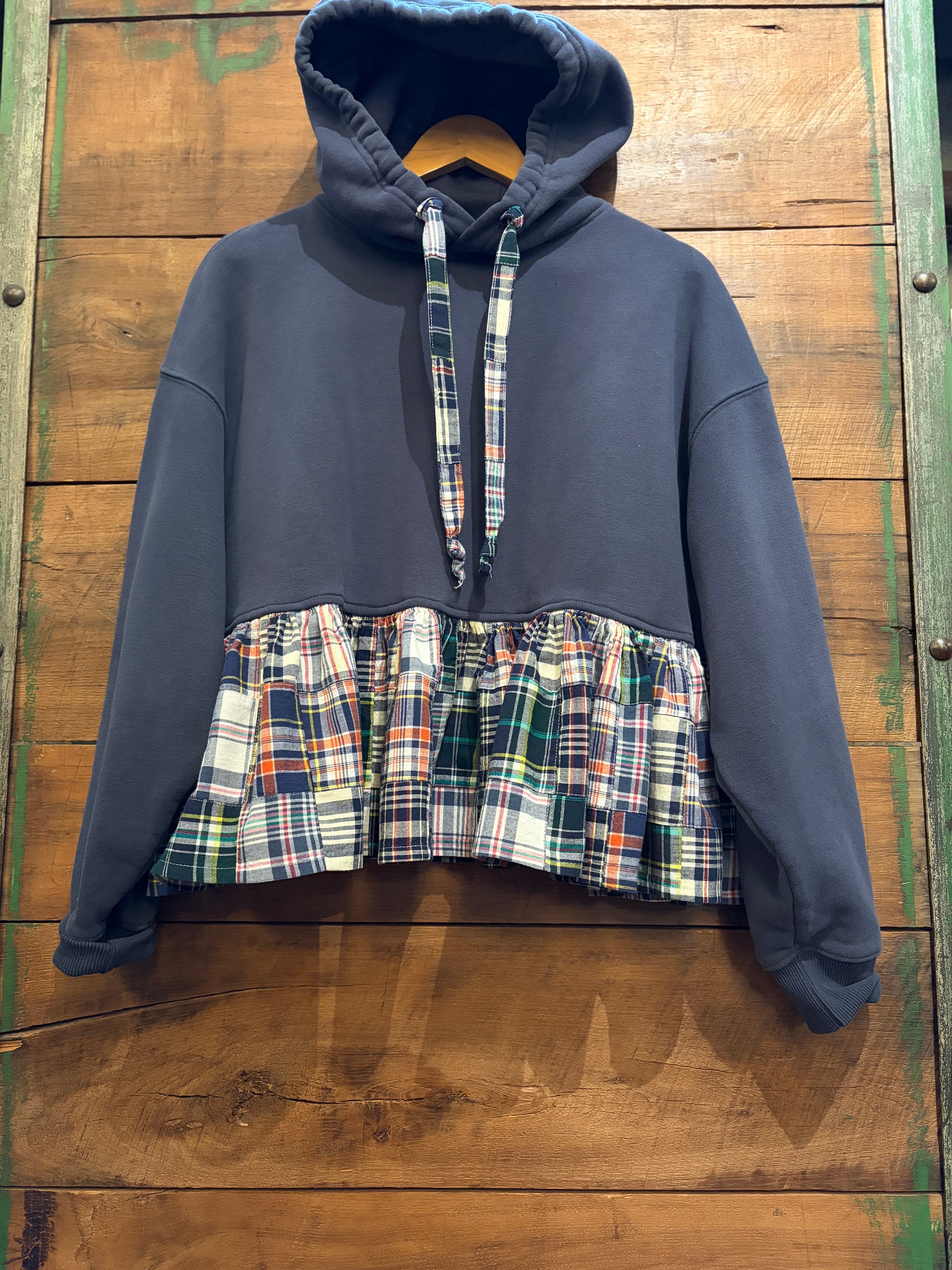 The Madras is a bold statement piece that reimagines vintage style through sustainable design. This upcycled hoodie features a patchwork madras plaid gathered skirt that creates dynamic movement and visual interest. The cropped silhouette offers a modern, flattering fit, while the contrasting hoodie tie adds an unexpected detail that ties the design together. Perfect for those who value individuality and eco-conscious fashion, this piece blends playful pattern mixing with thoughtful construction. A conversation starter that works as hard as it does on style.